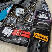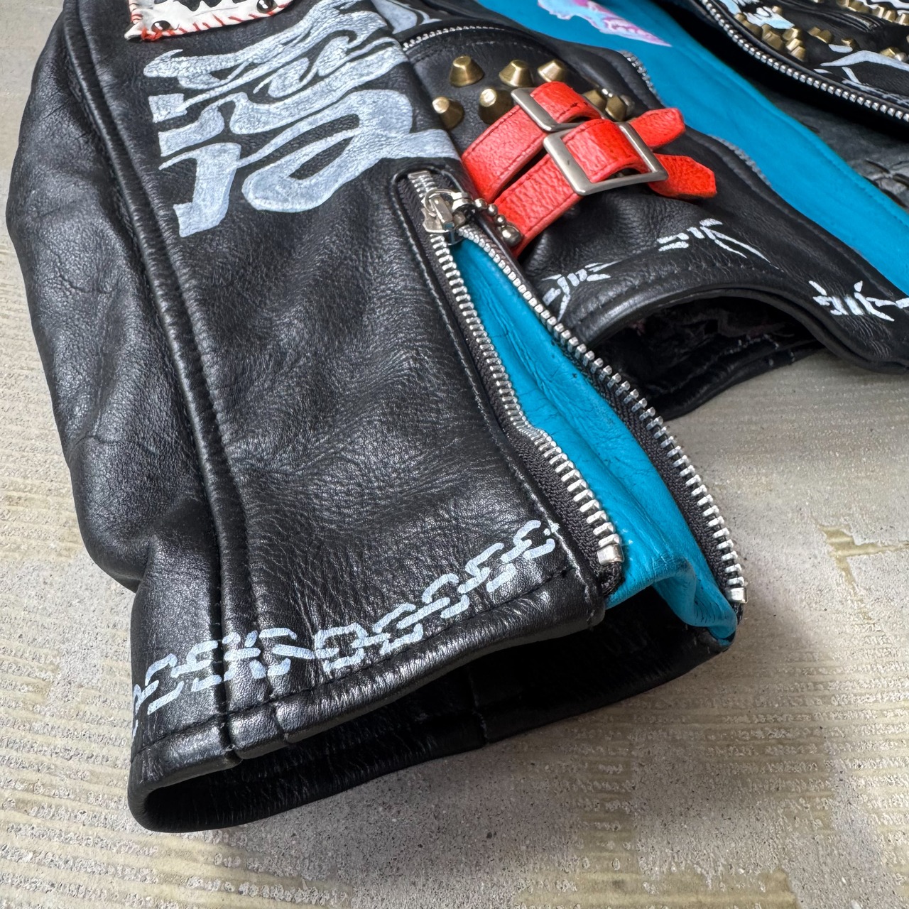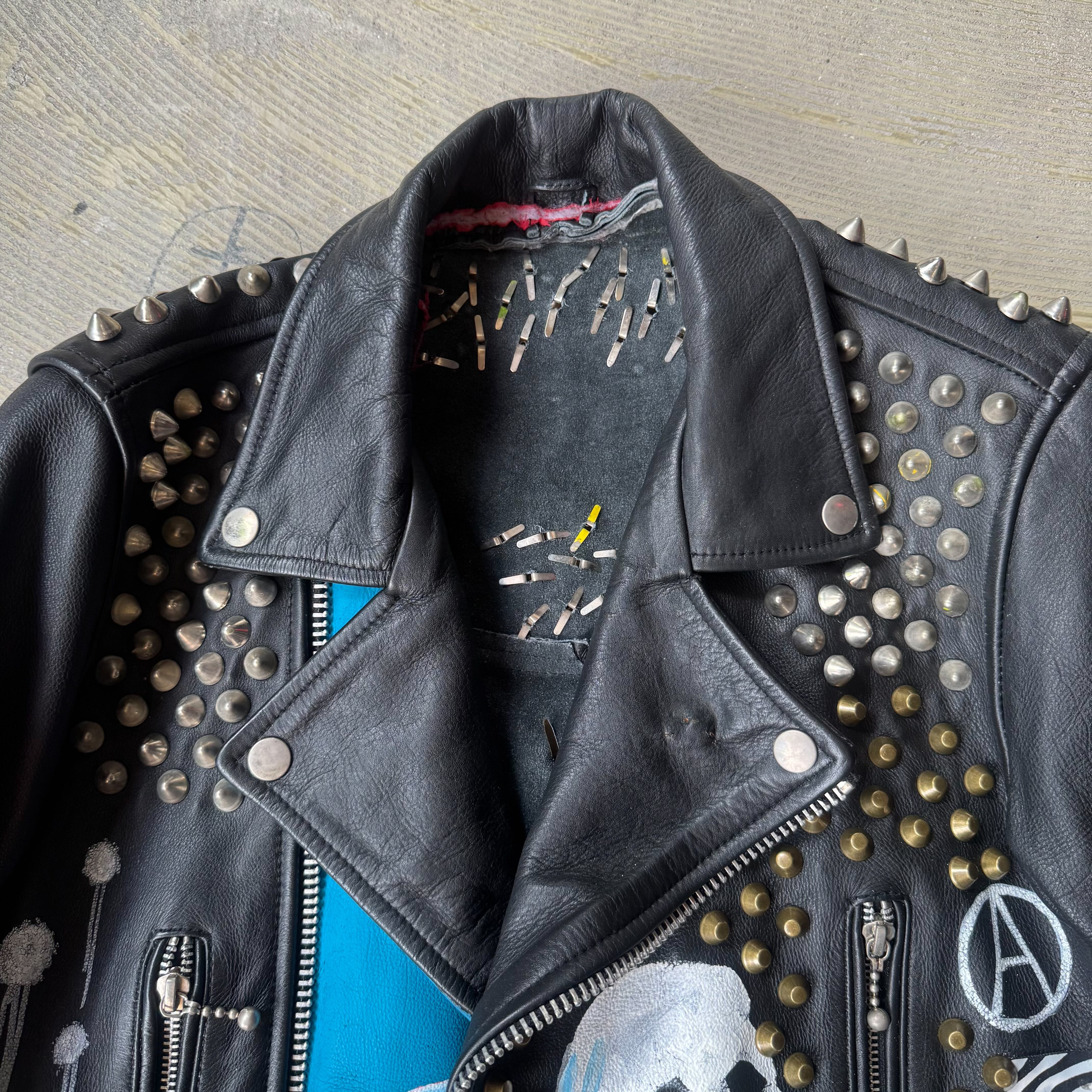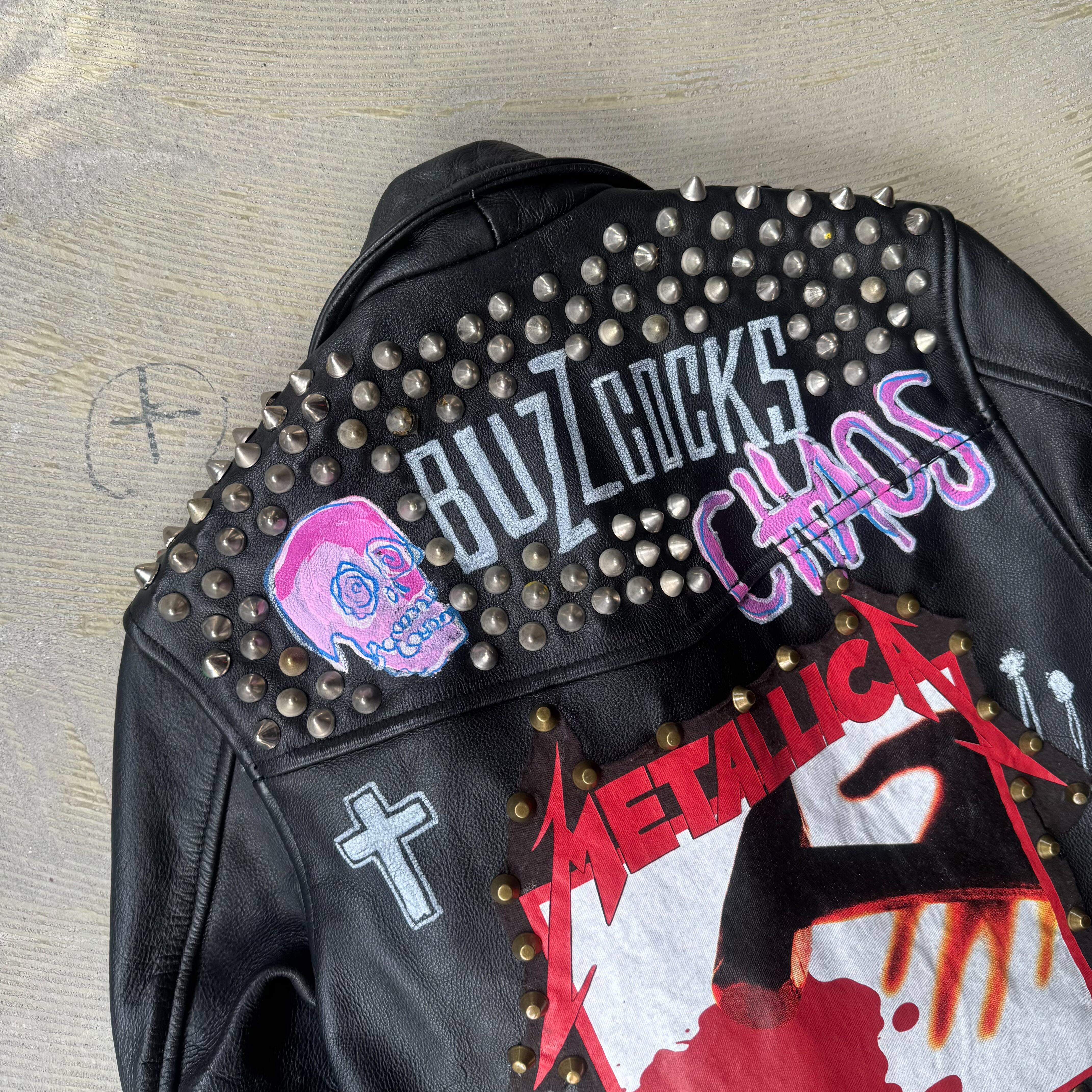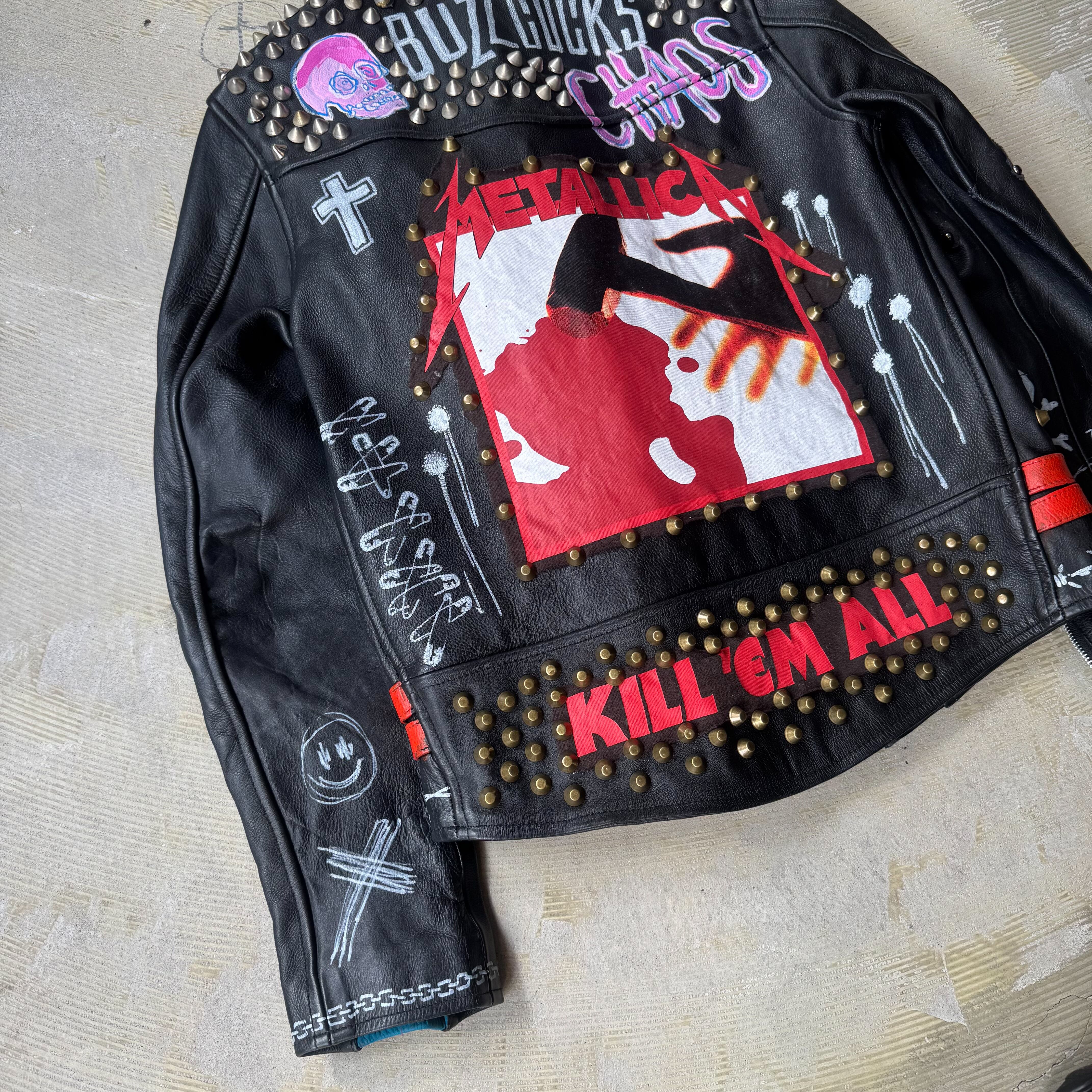 全面や背面にはスタッズが打ち込まれ、フロントと袖にはスカルやパッチが施され