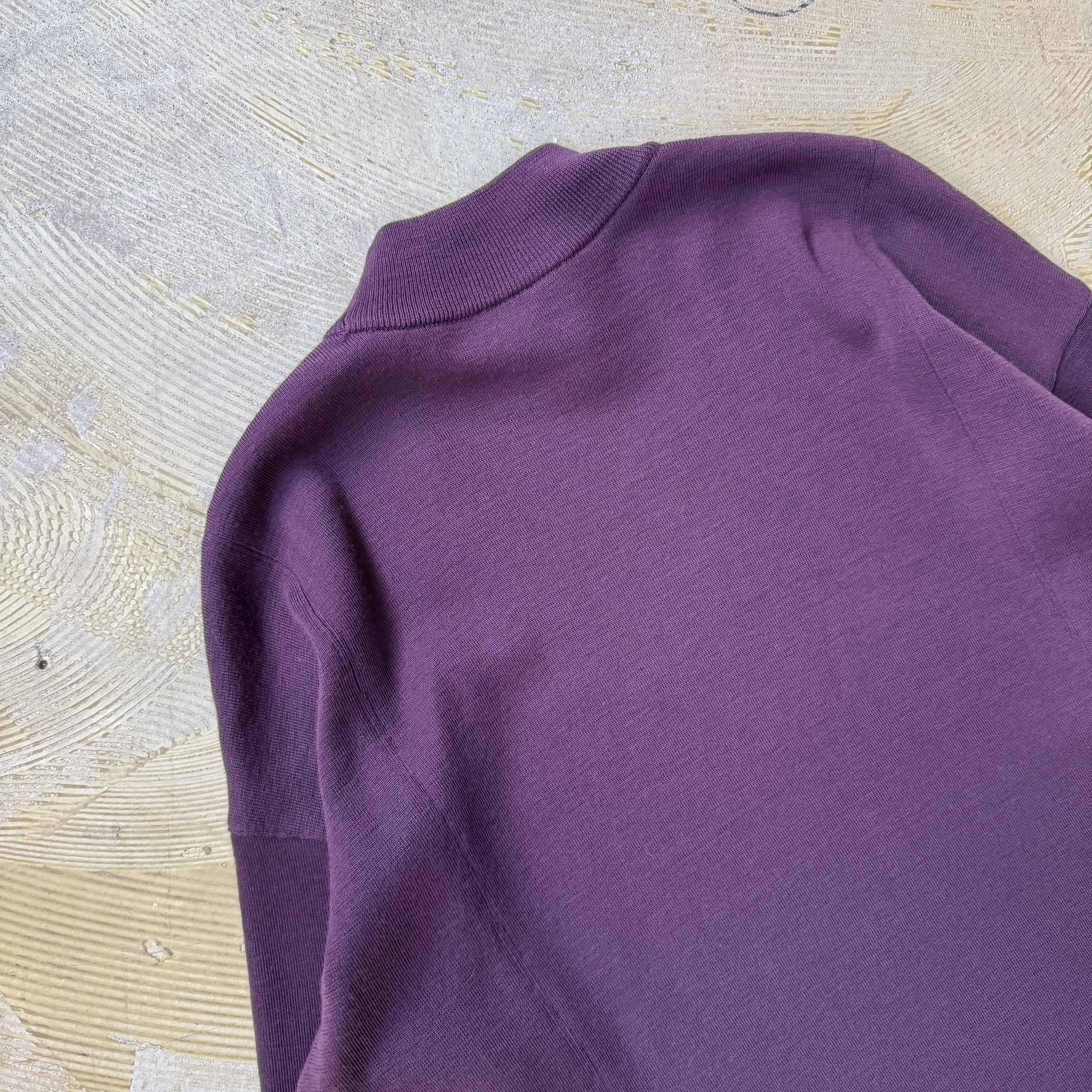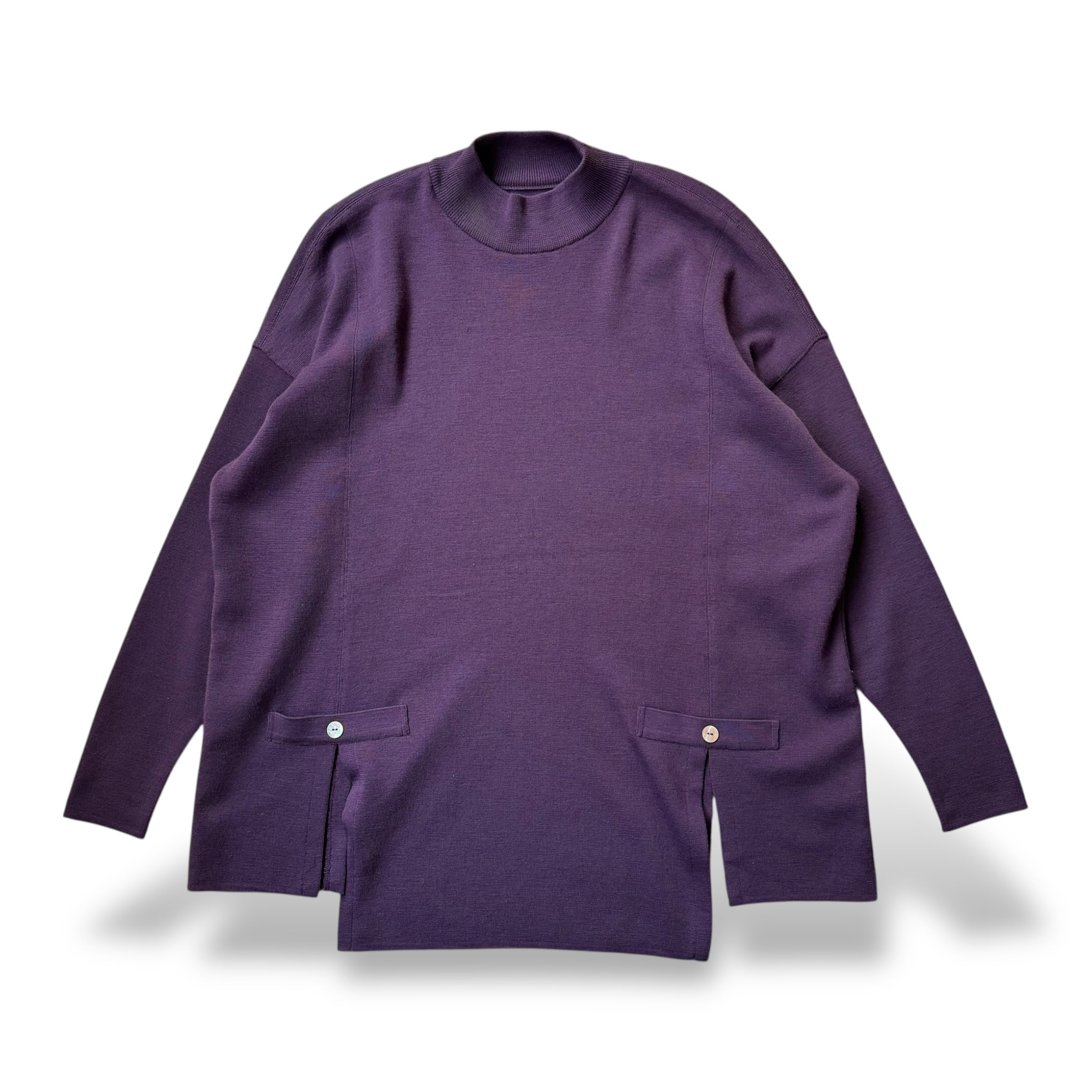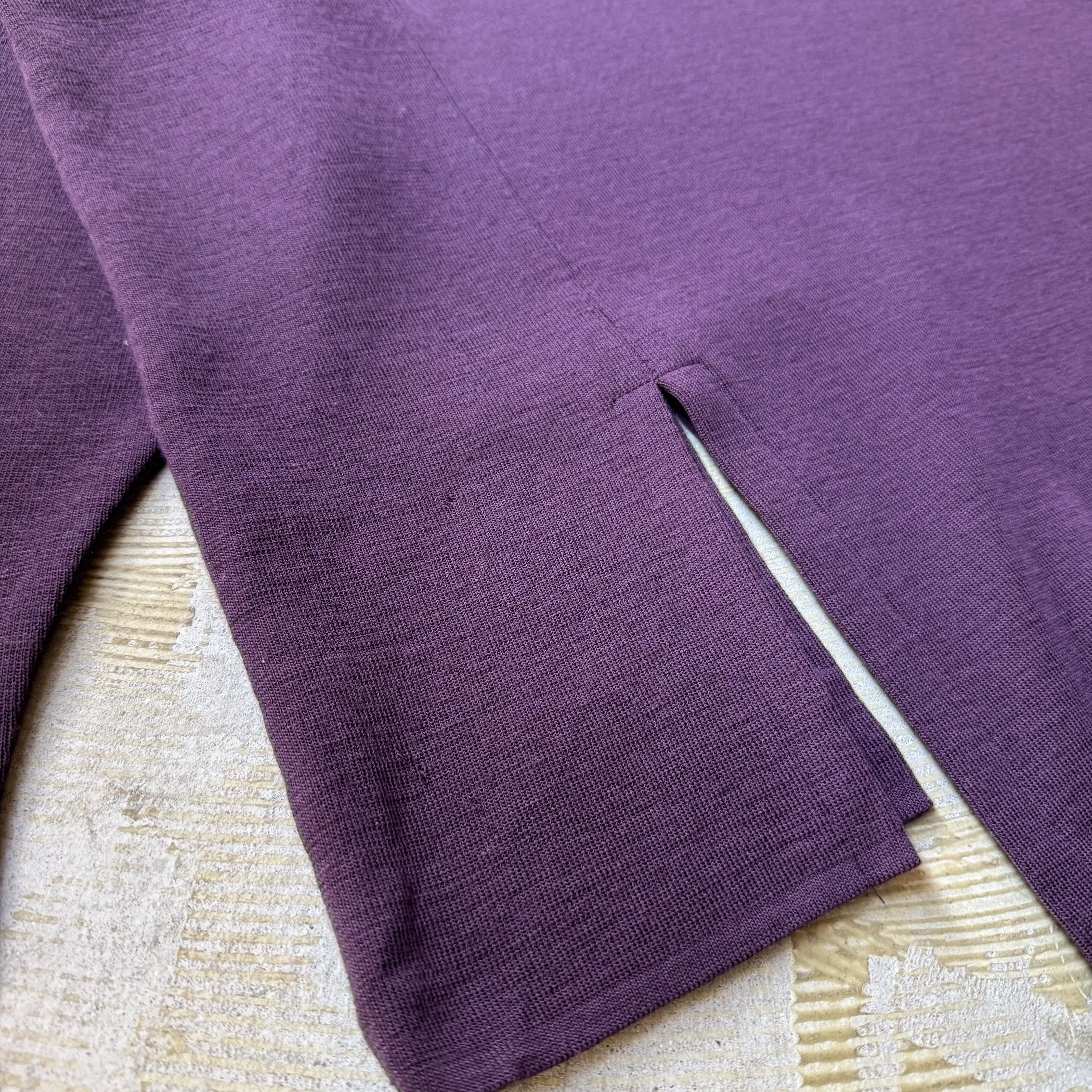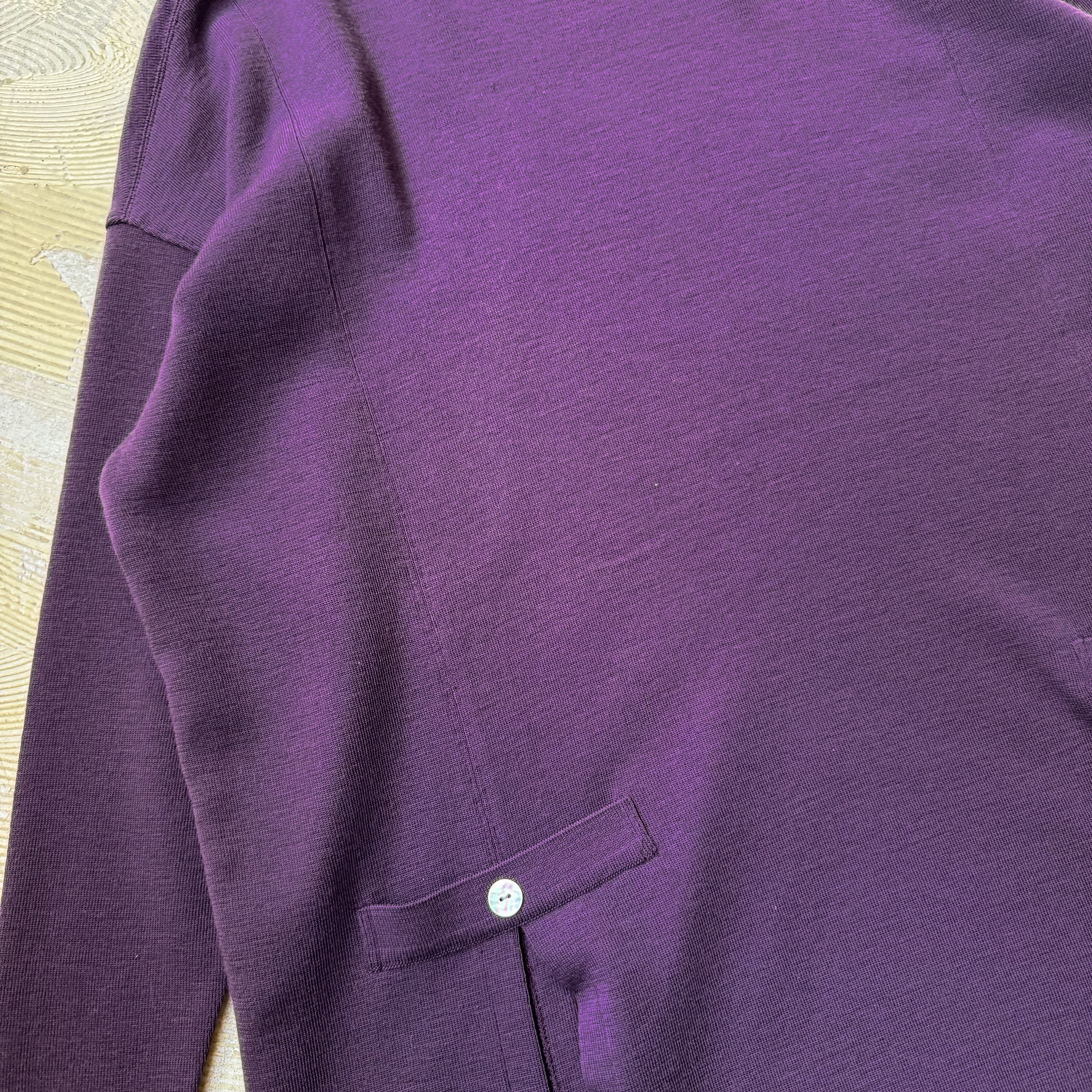・深いパープルのボディに、左右のボタン付きフェイクポケット。