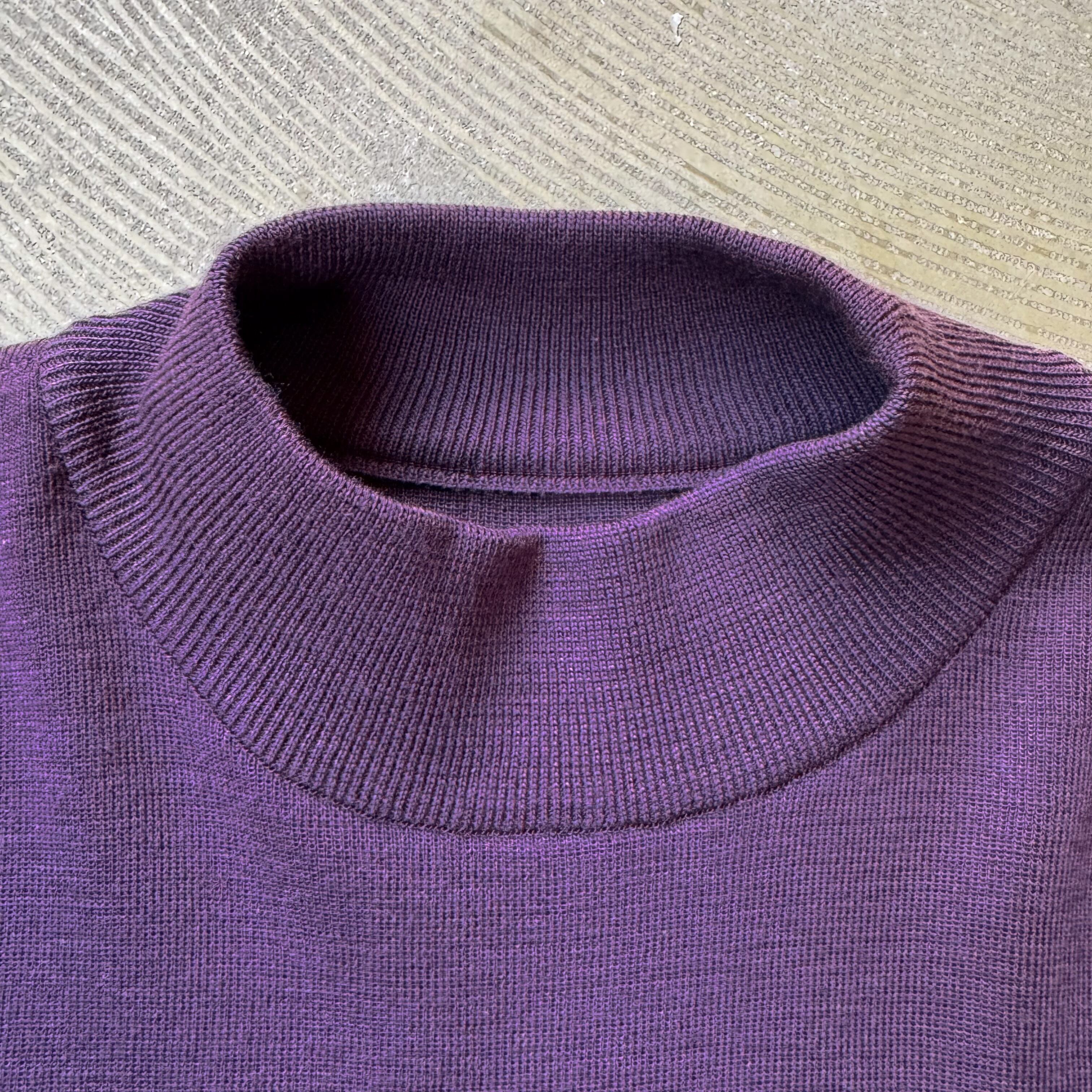 ハイネックに近いラウンドネックが、首元に静けさと品を添える設計。
