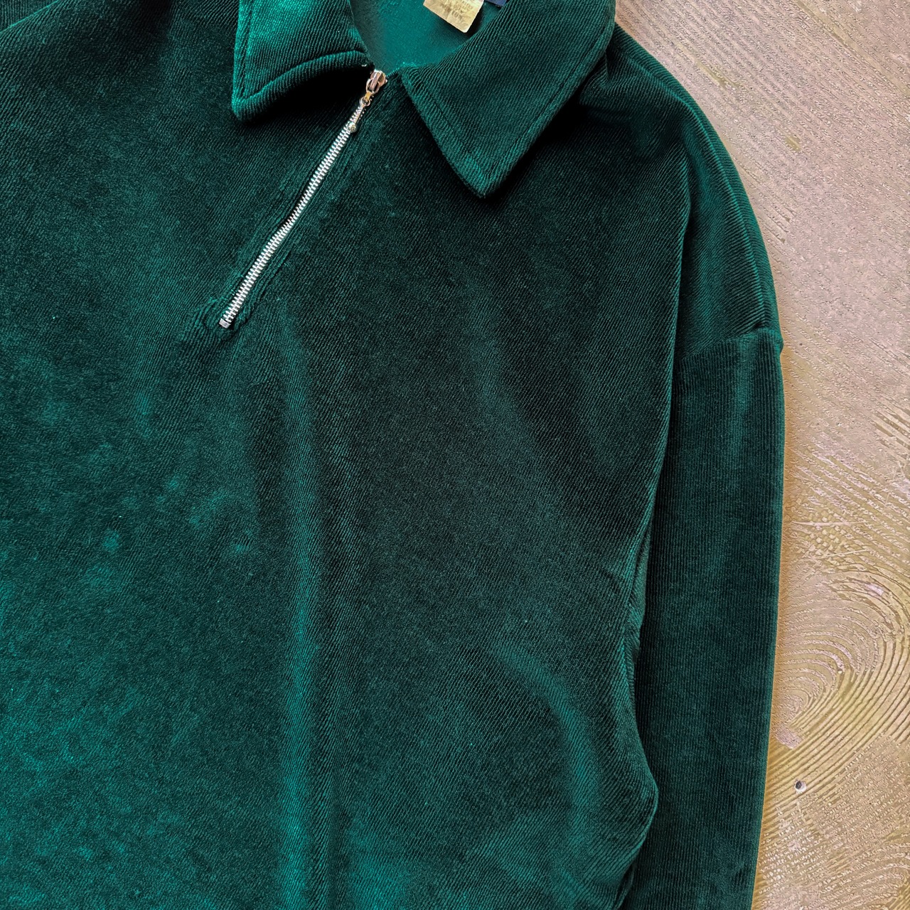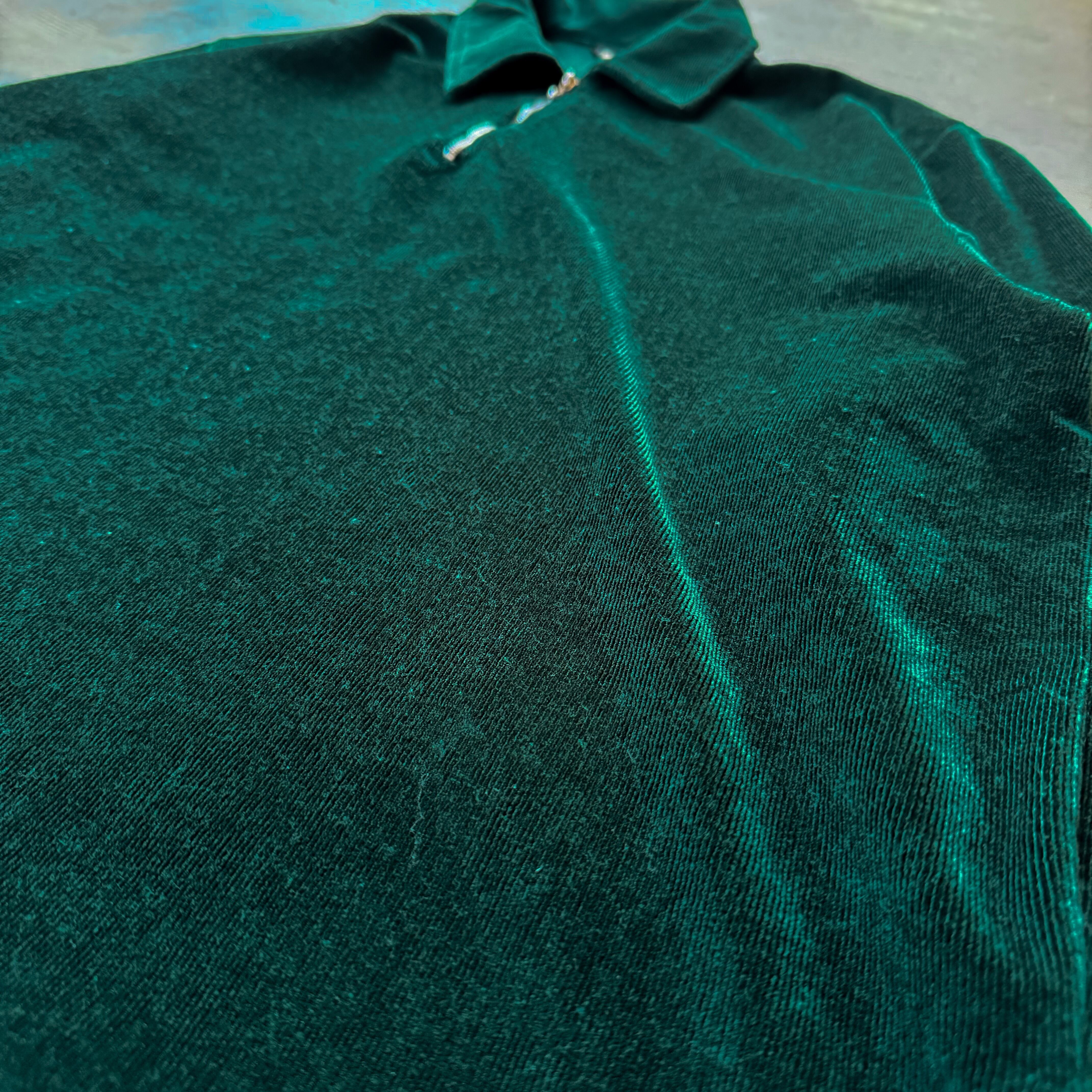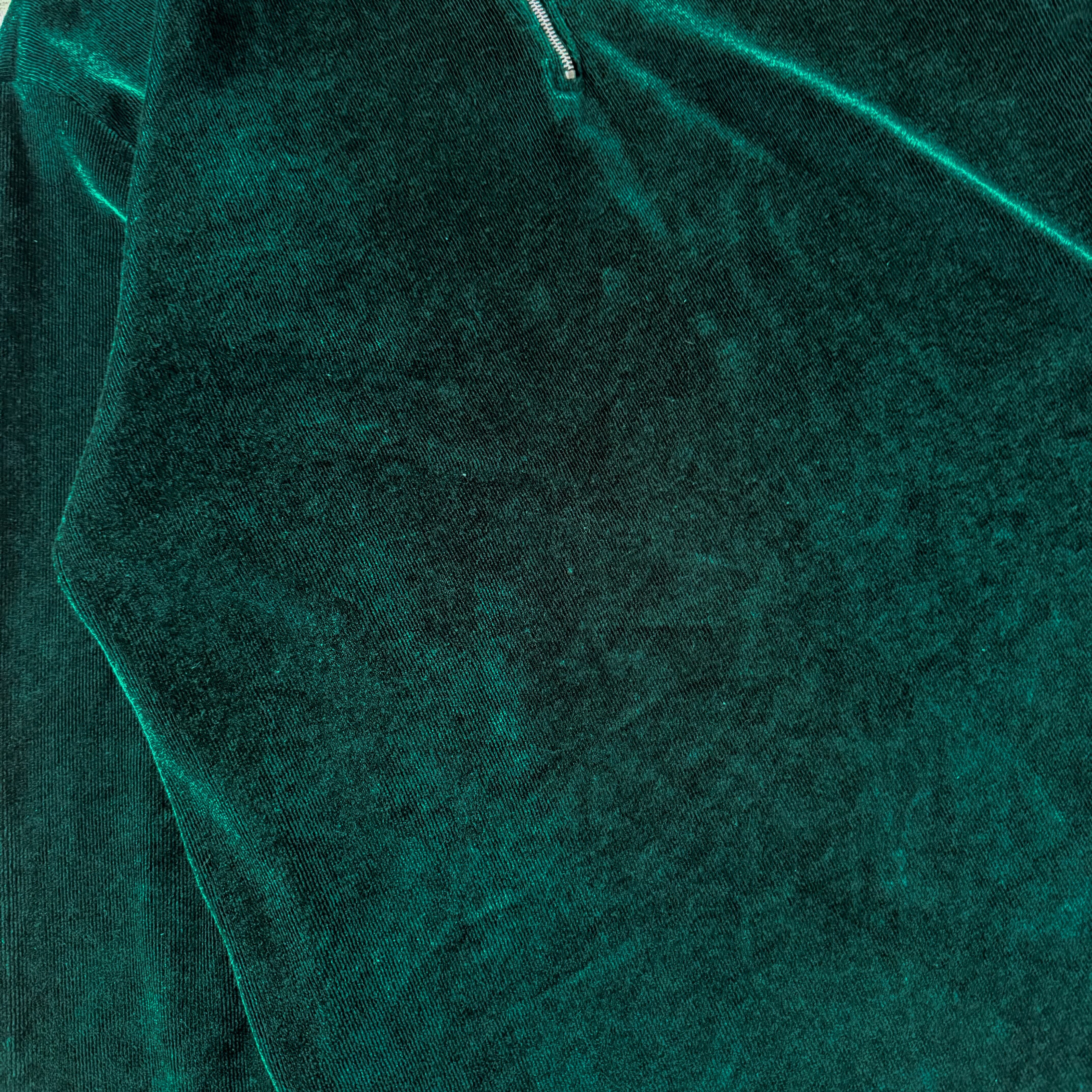 ・深いグリーンのベロア素材に、クラシックな襟とハーフジップ。