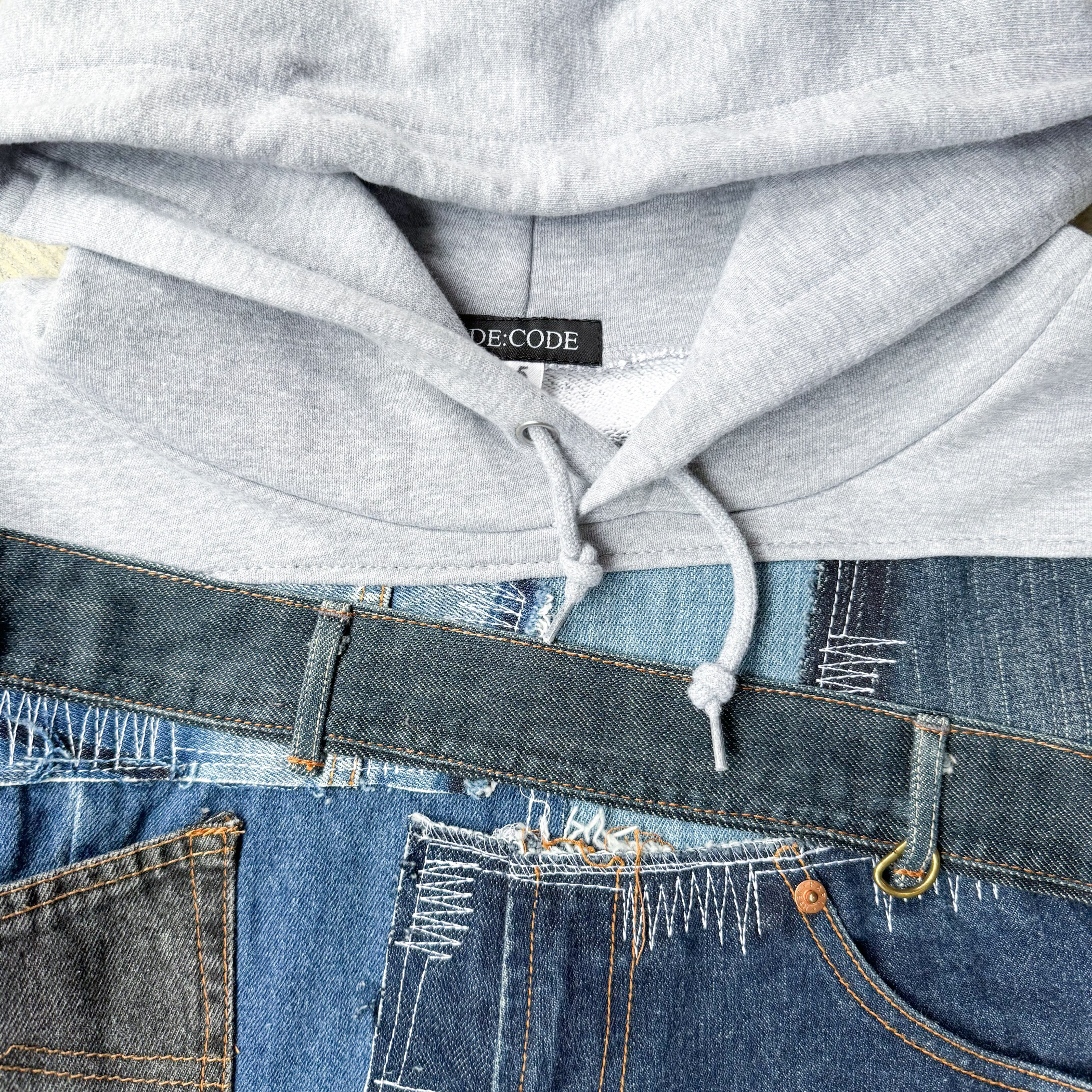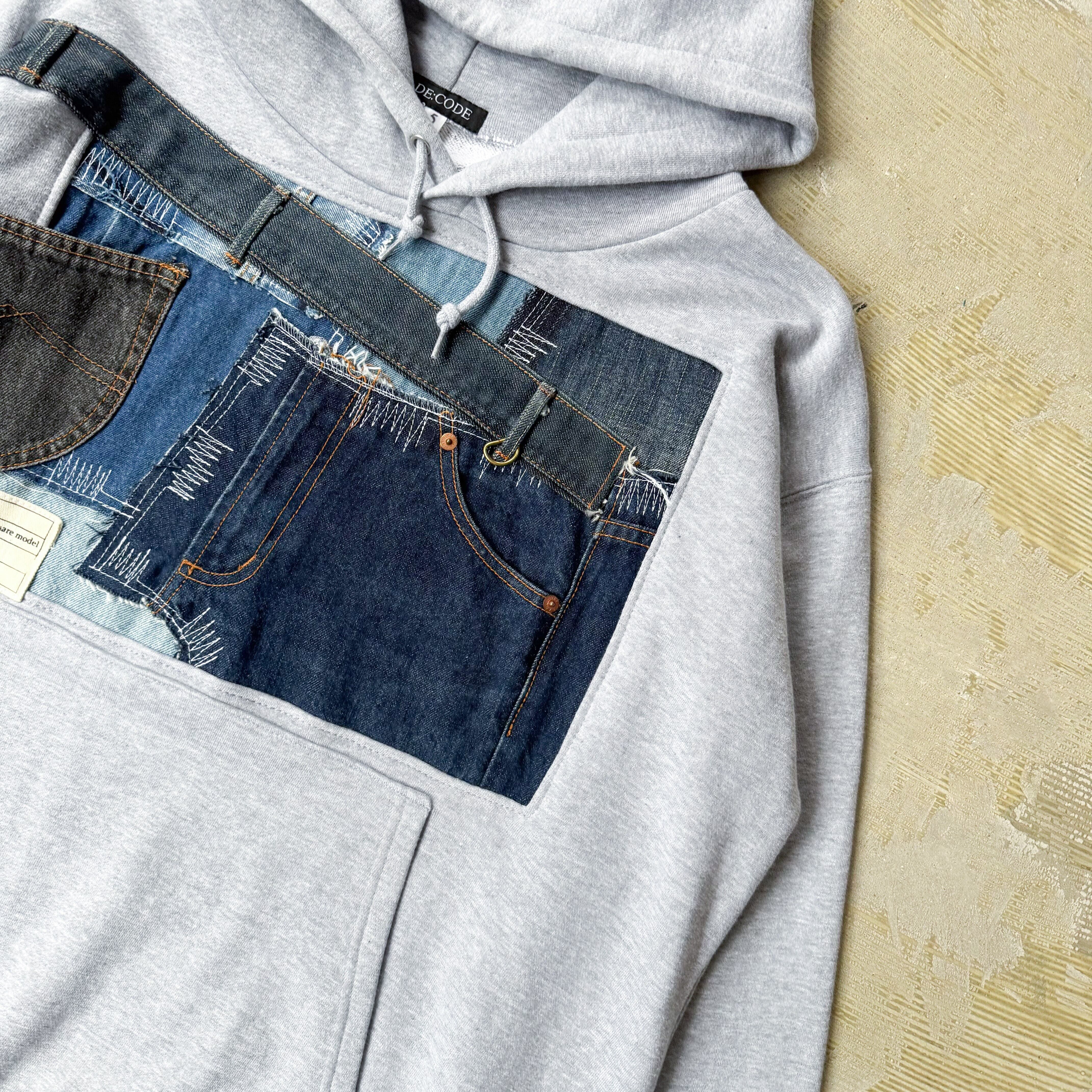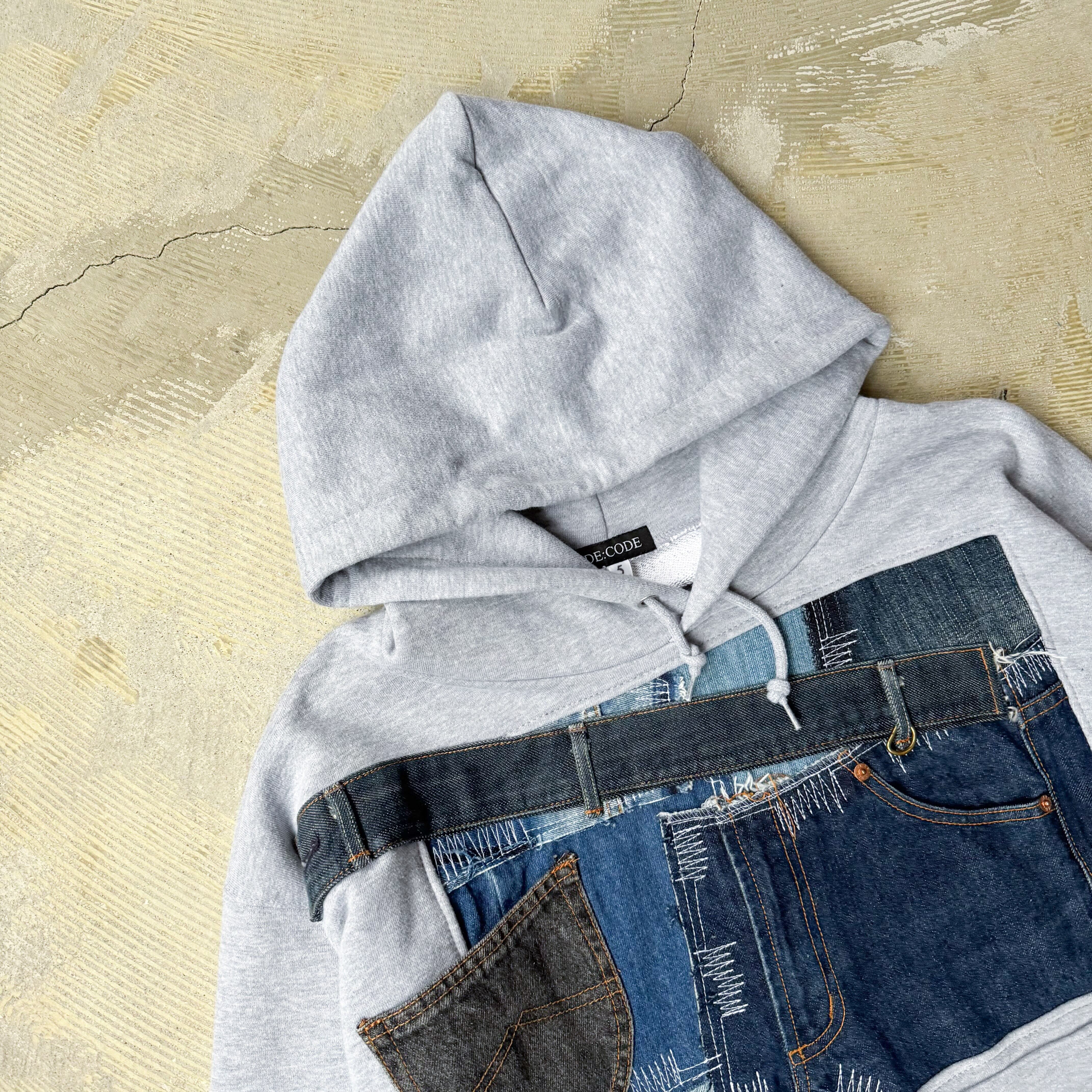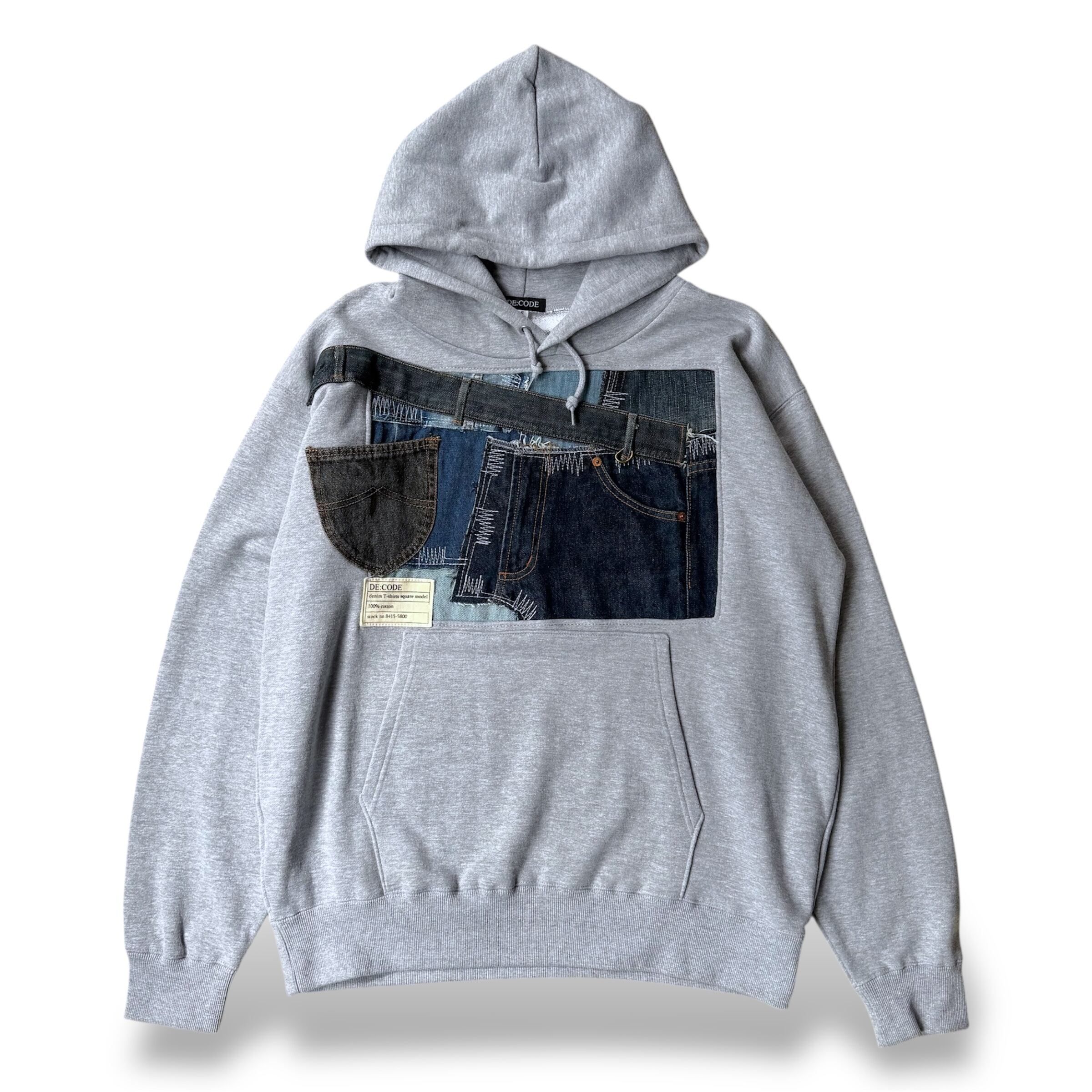 【DE:CODE】DENIM PATCHWORK DESIGN SWEAT HOODIE / GRAY / デニム パッチワーク リメイク スウェット フーディ パーカー