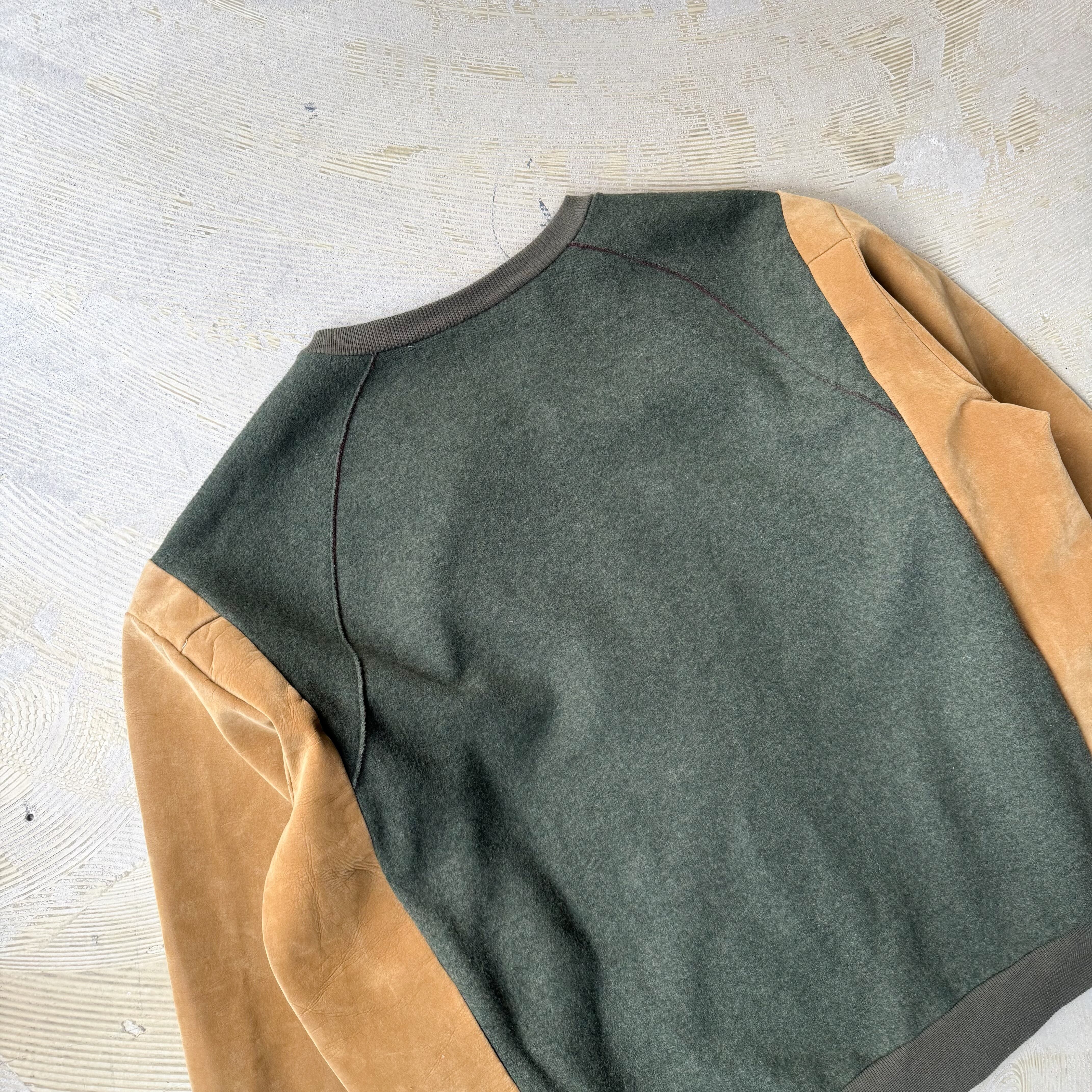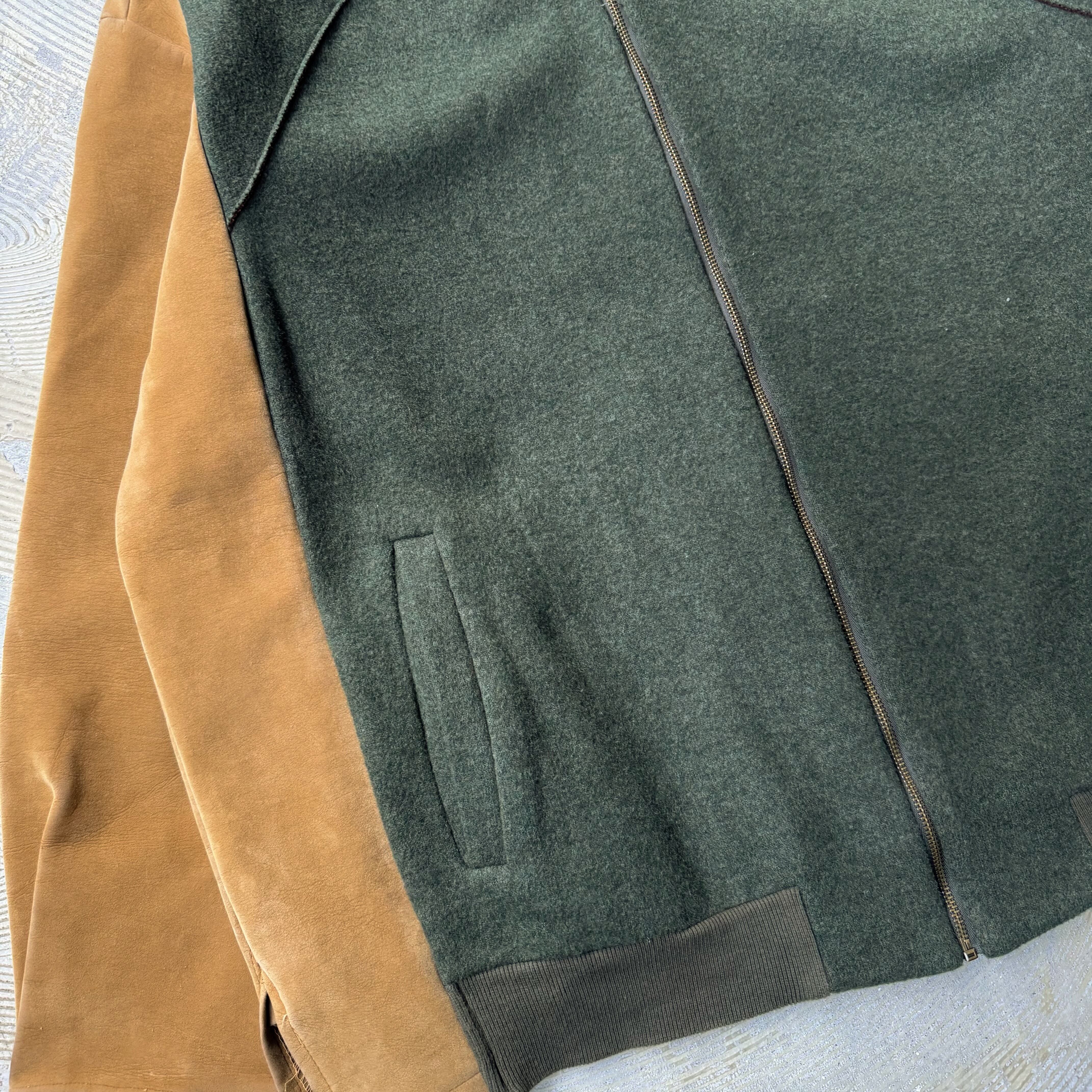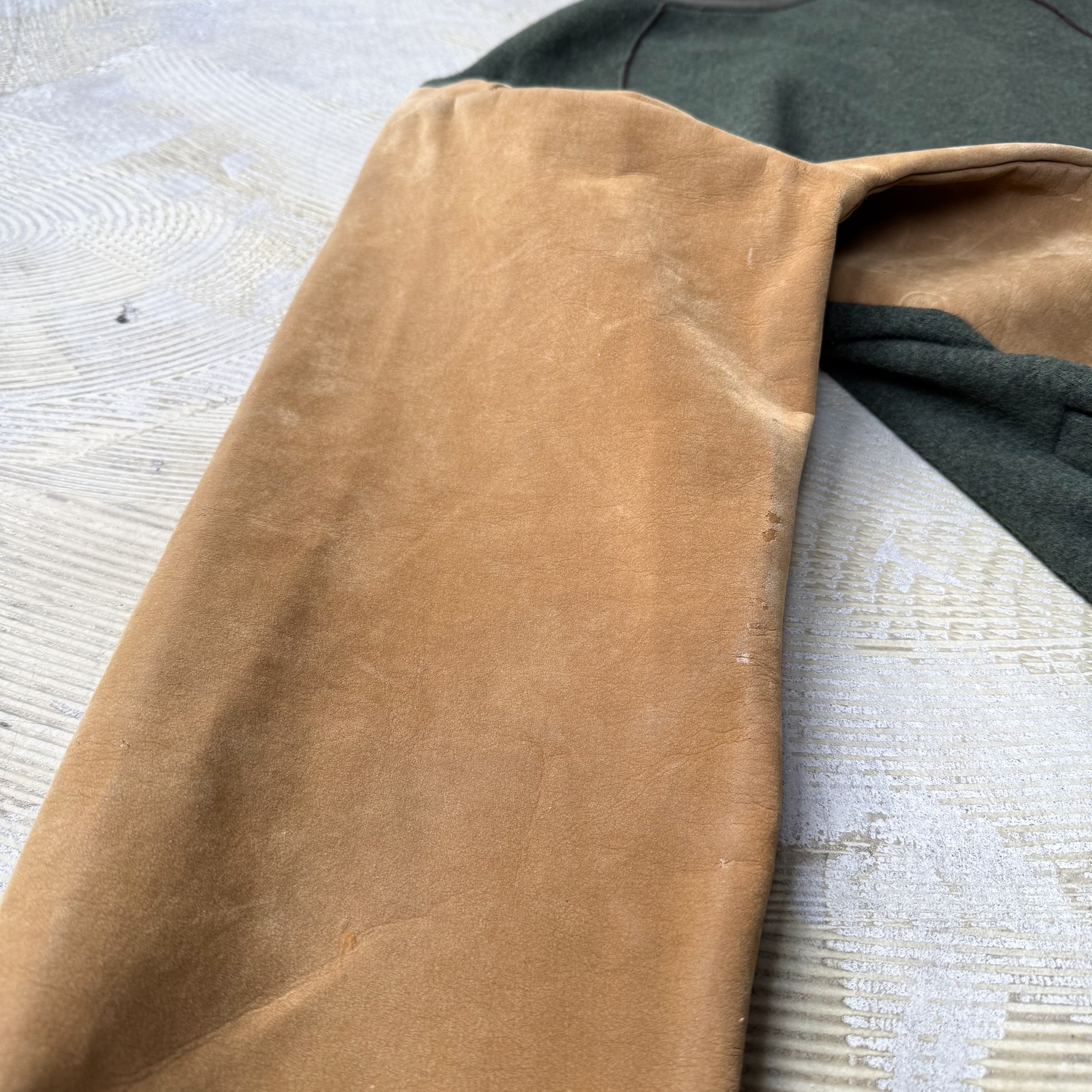 ・ダークグリーンのウールボディに、キャメルカラーのスウェード調スリーブ。