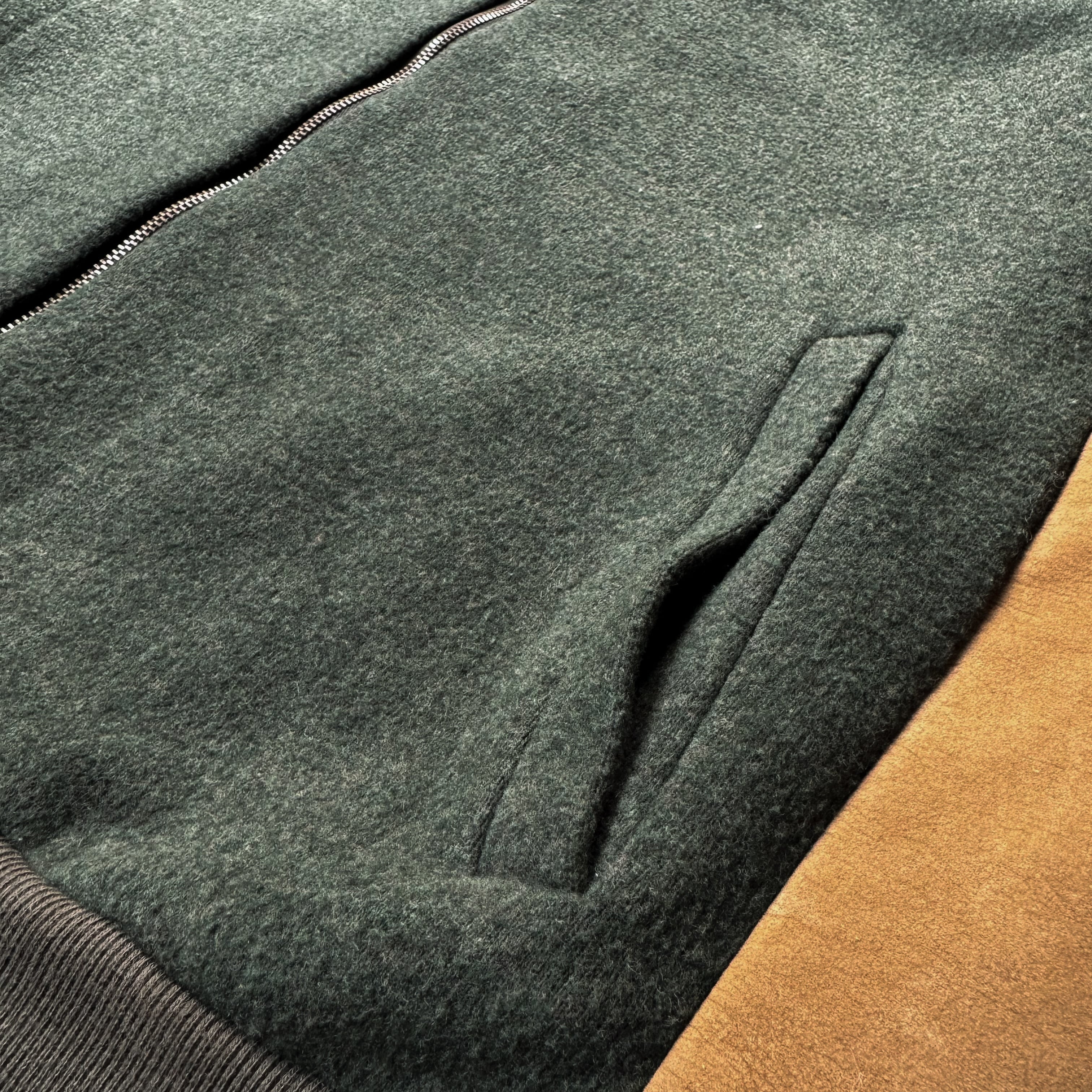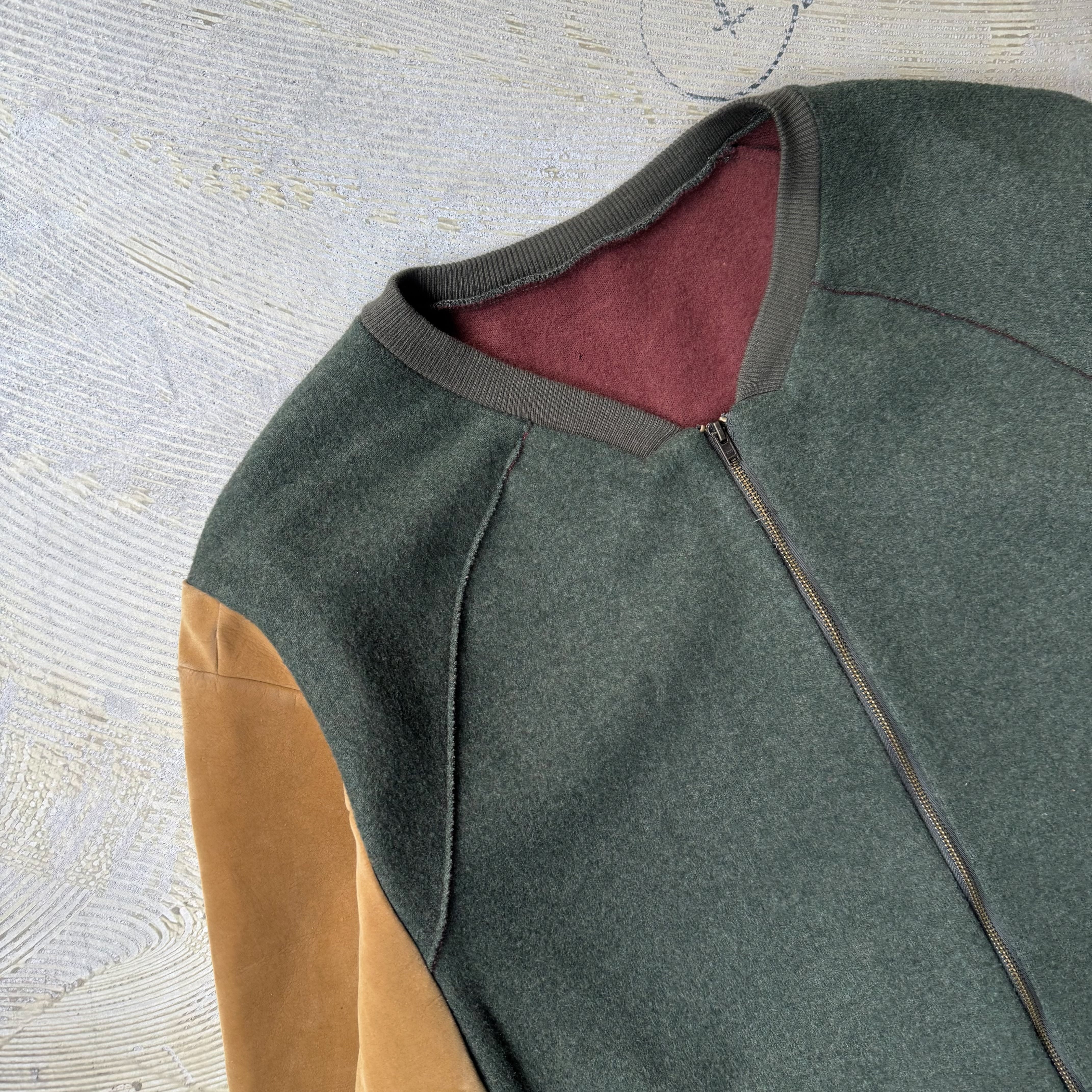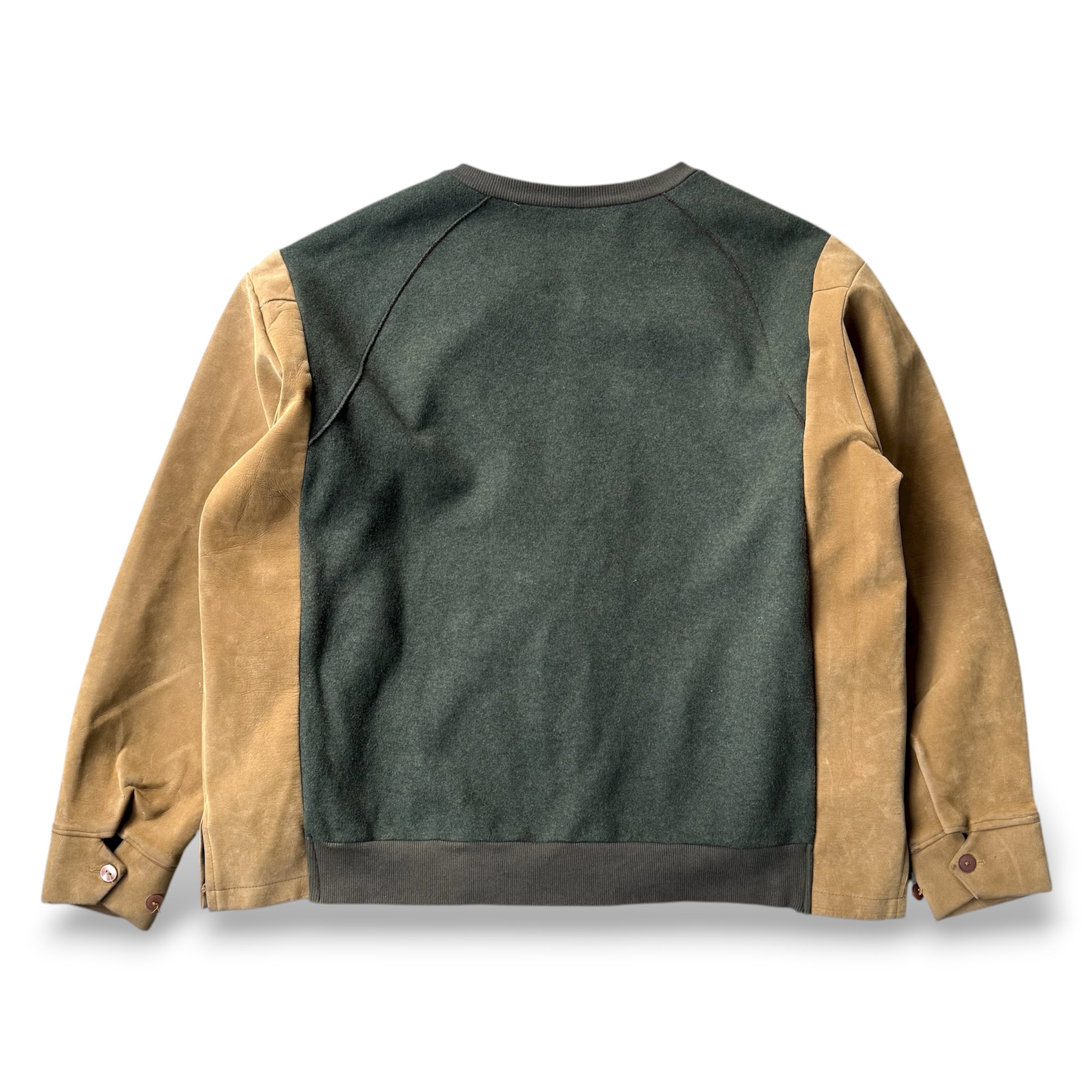 ・ダークグリーンのウールボディに、キャメルカラーのスウェード調スリーブ。
