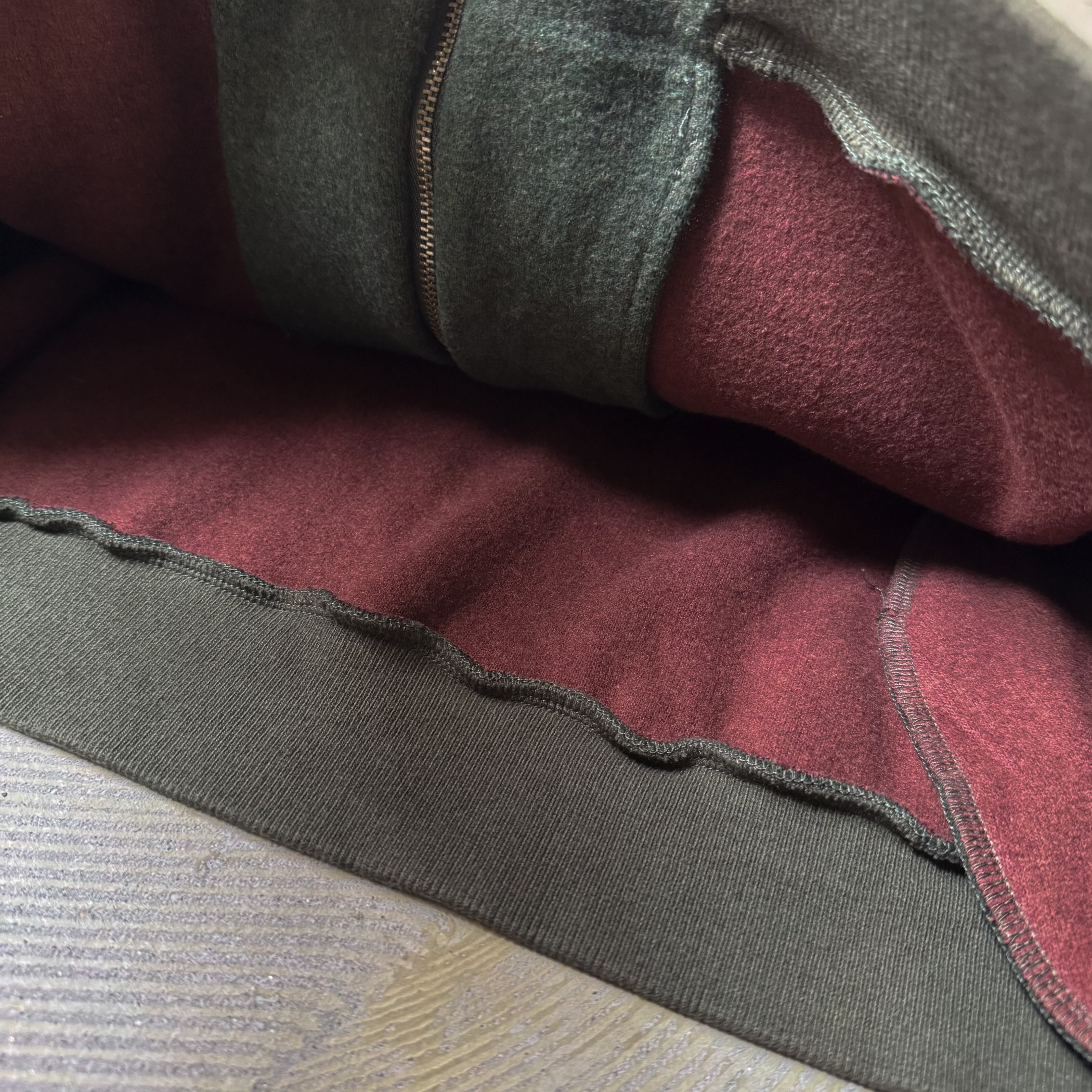 裏地はバーガンディ系で、内側にも色彩の余白がある構成。