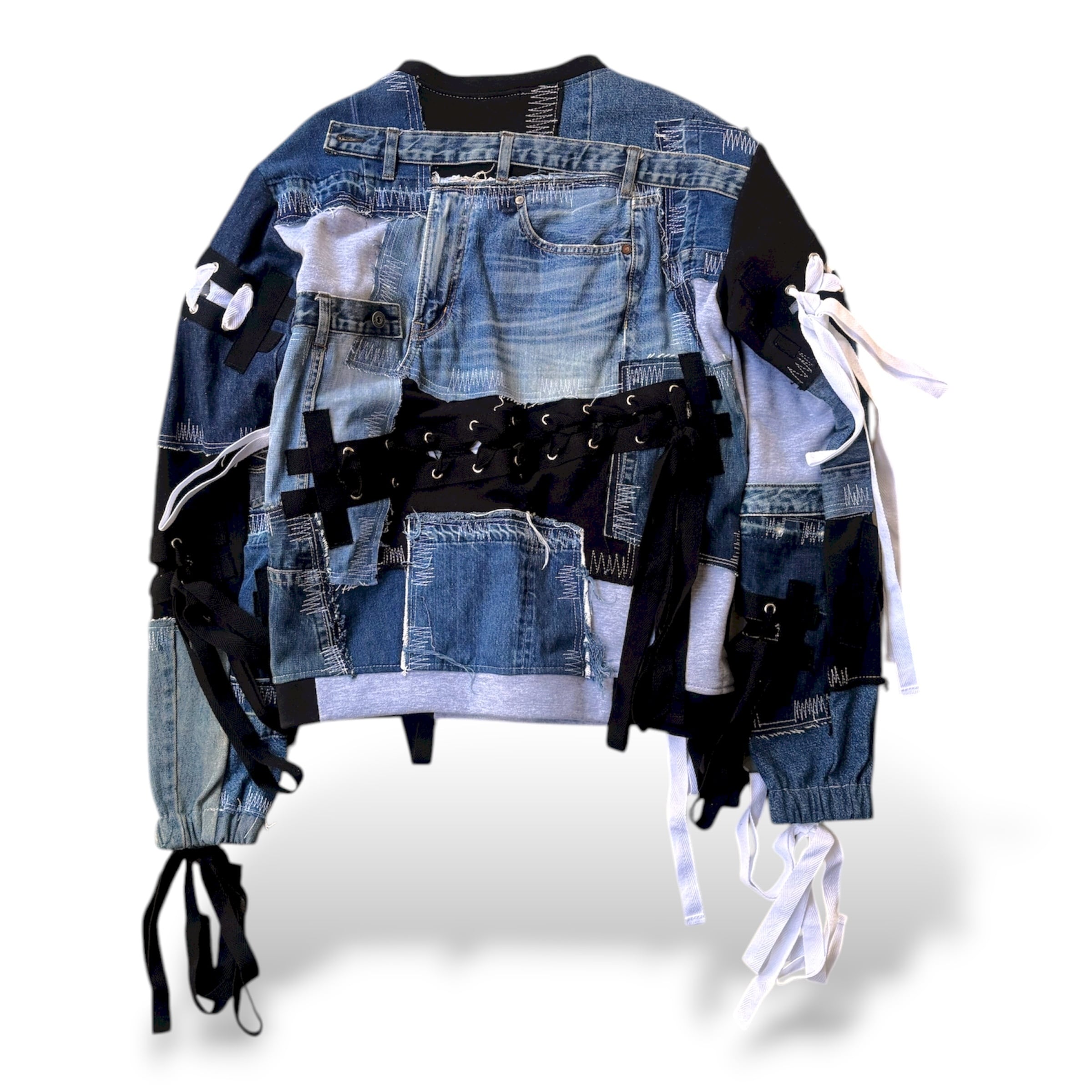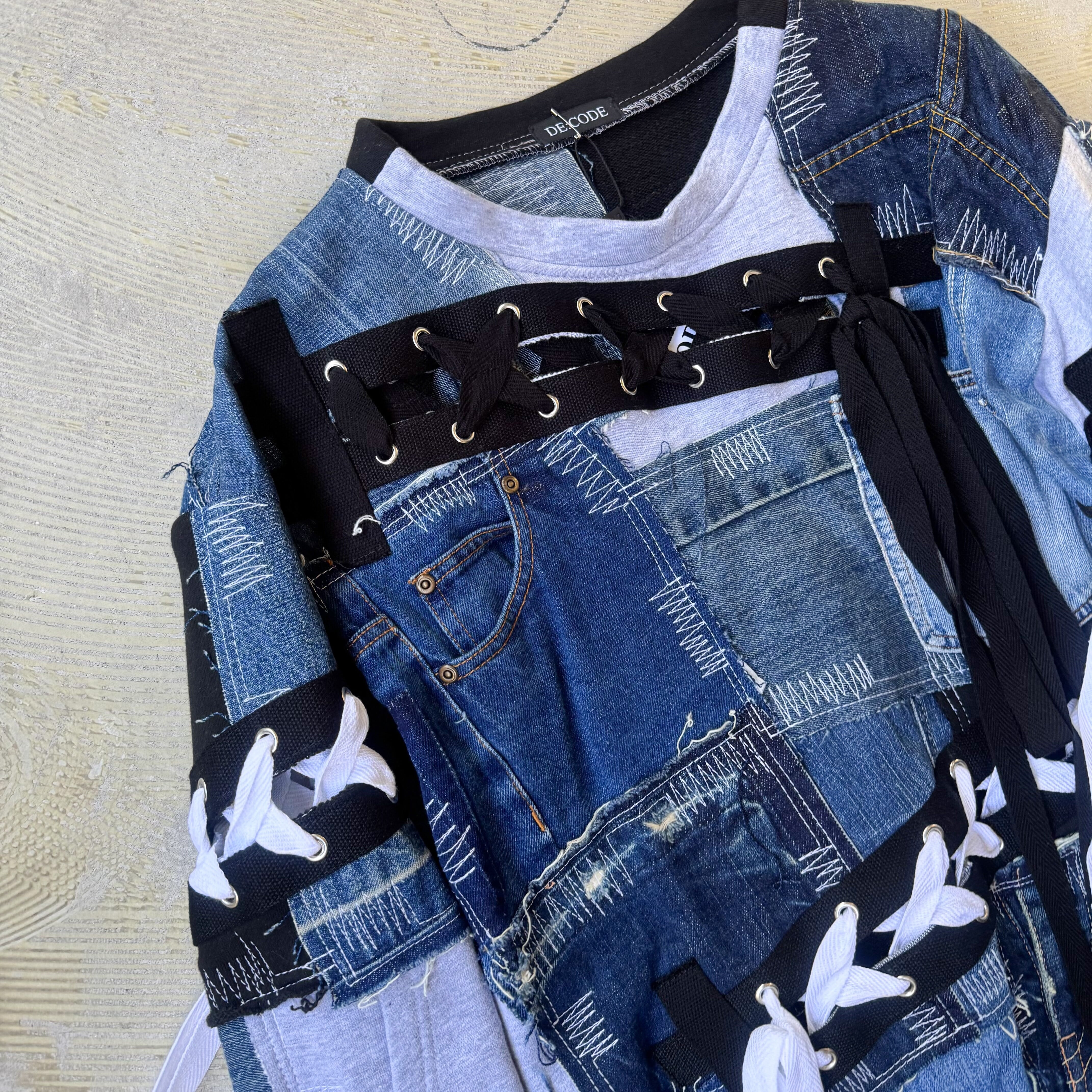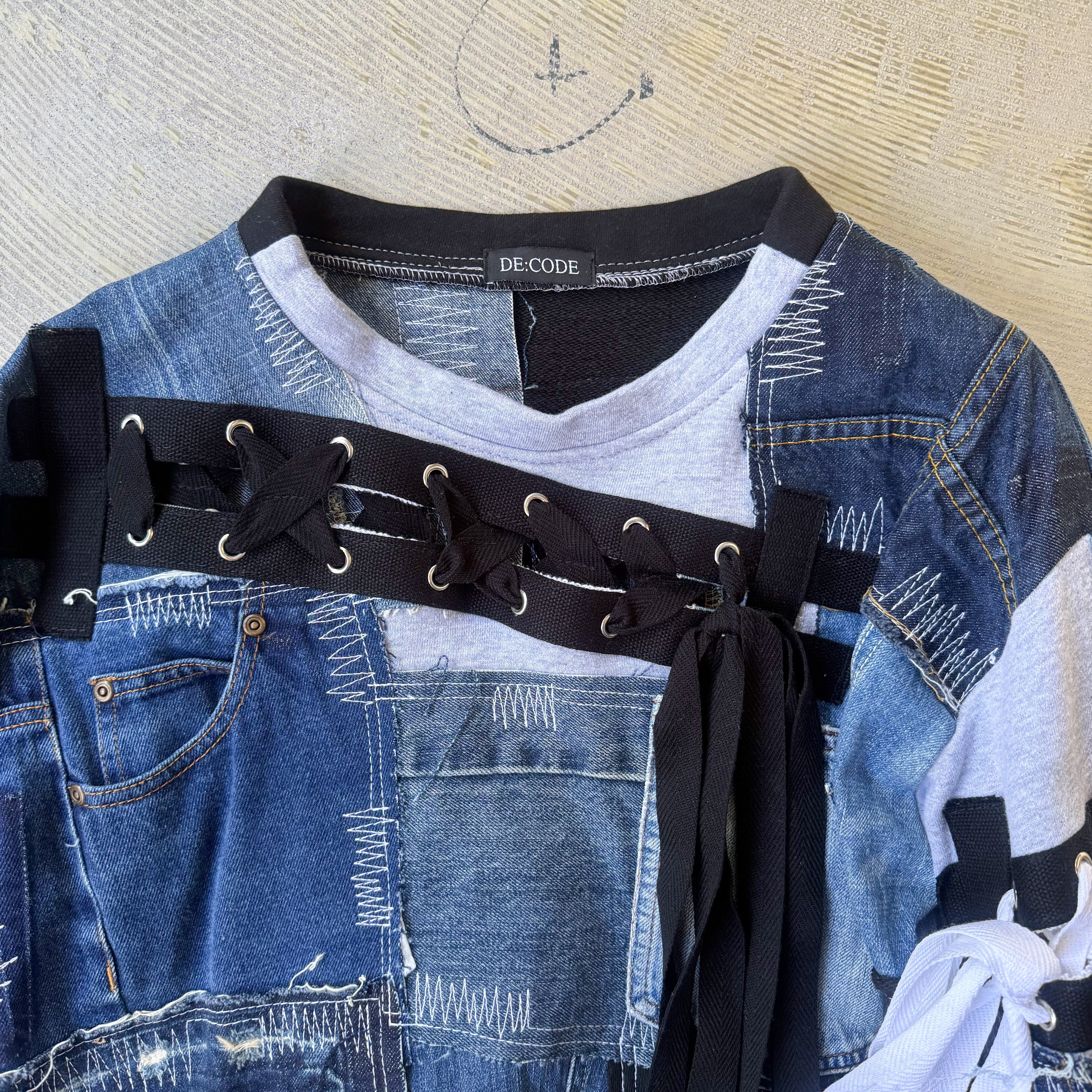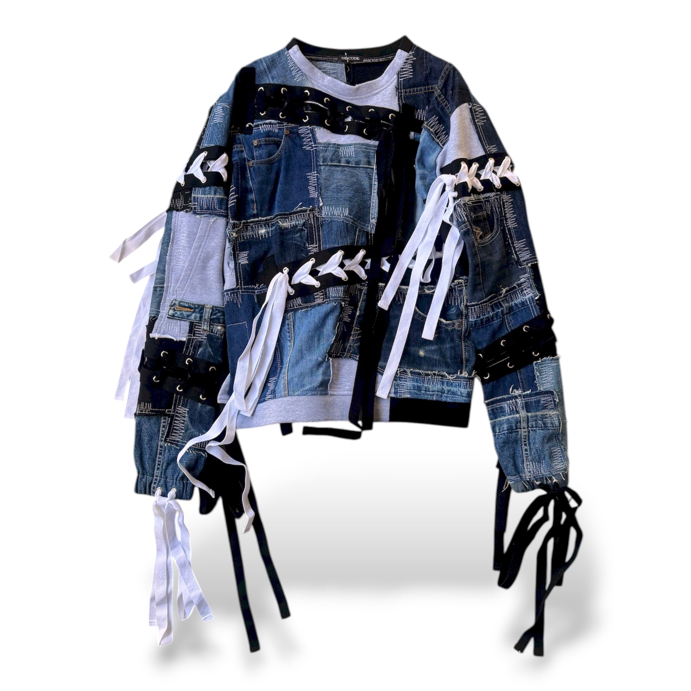 【DE:CODE】DENIM PATCHWORK DESIGN LACE UP SWEAT / デニム パッチワーク リメイク レースアップ スウェット