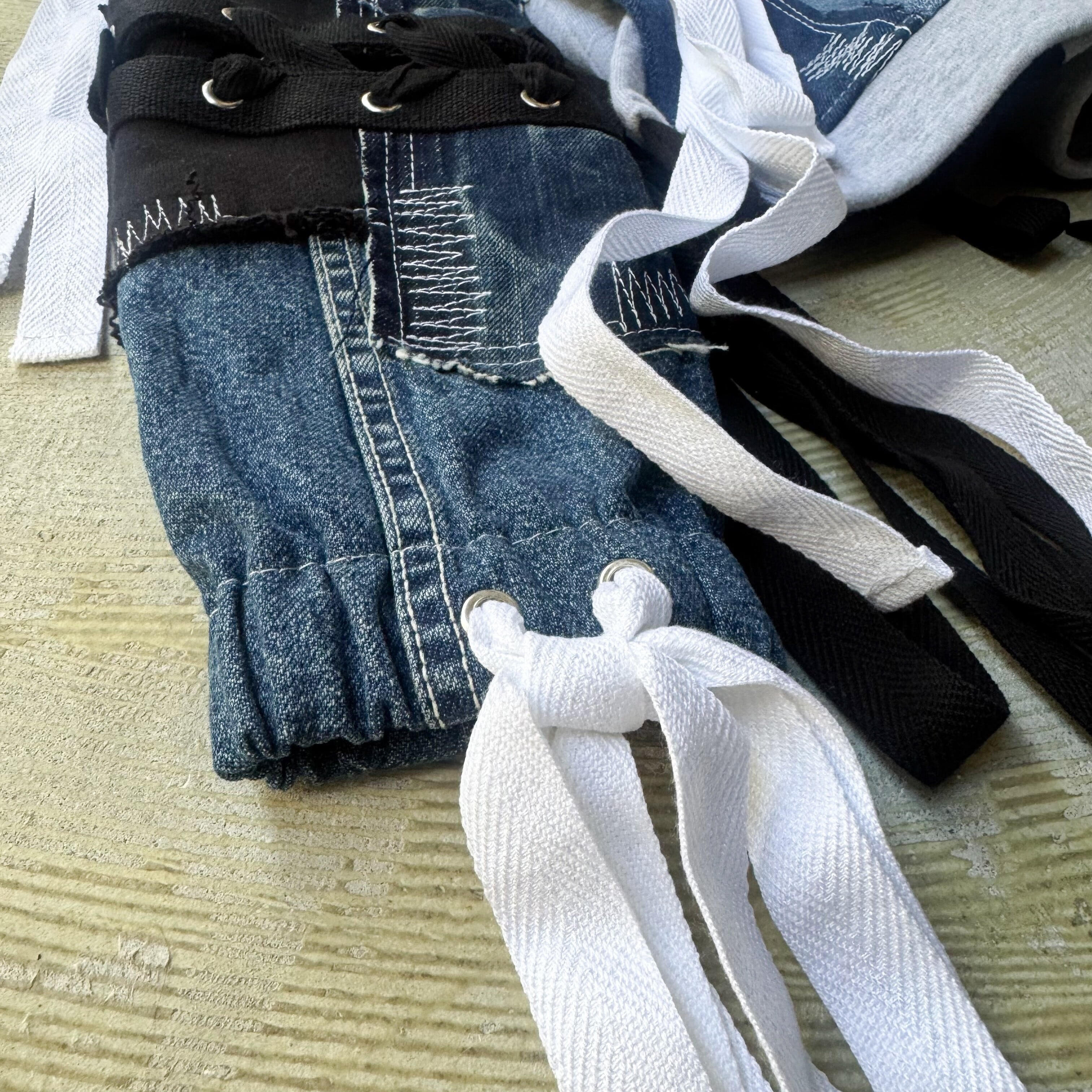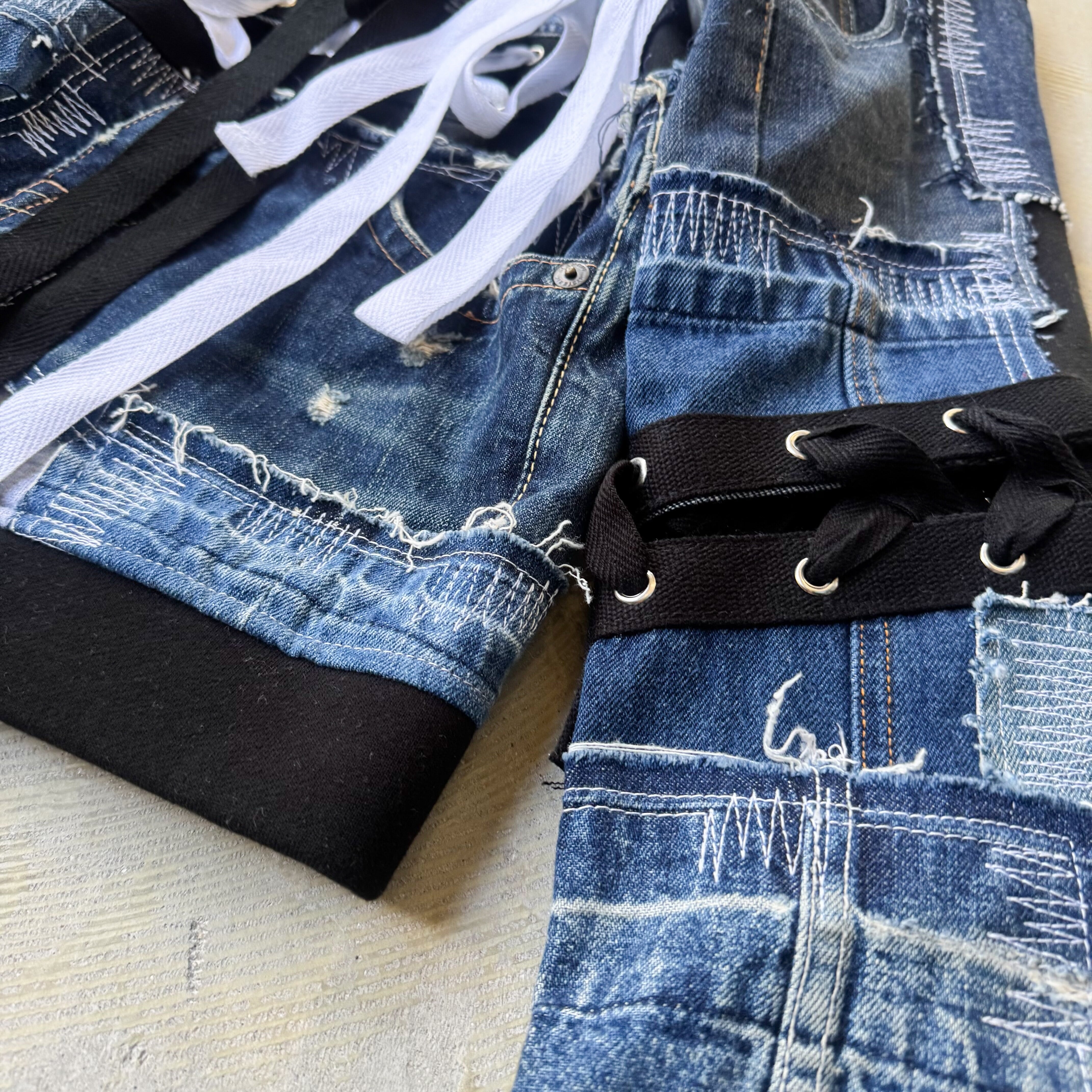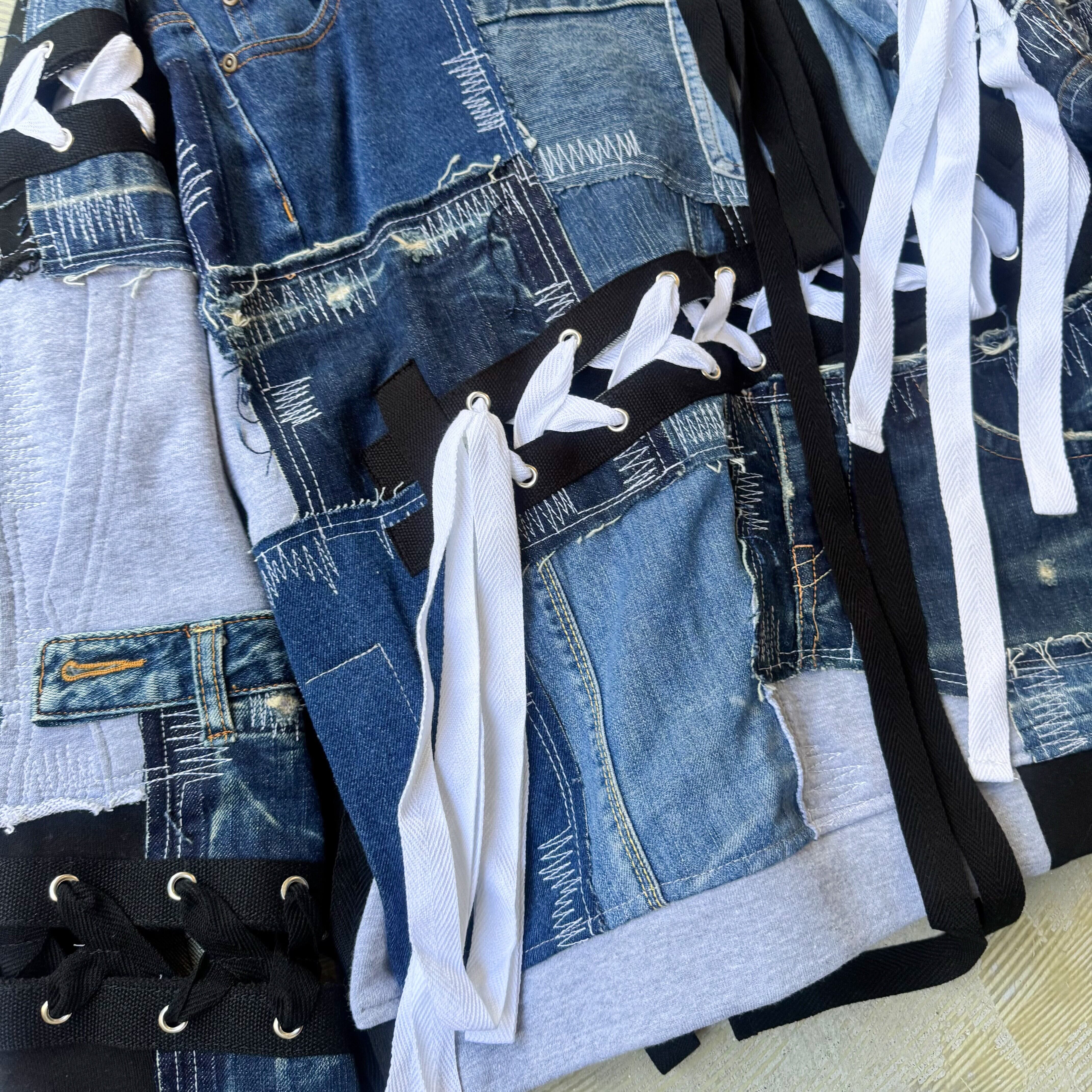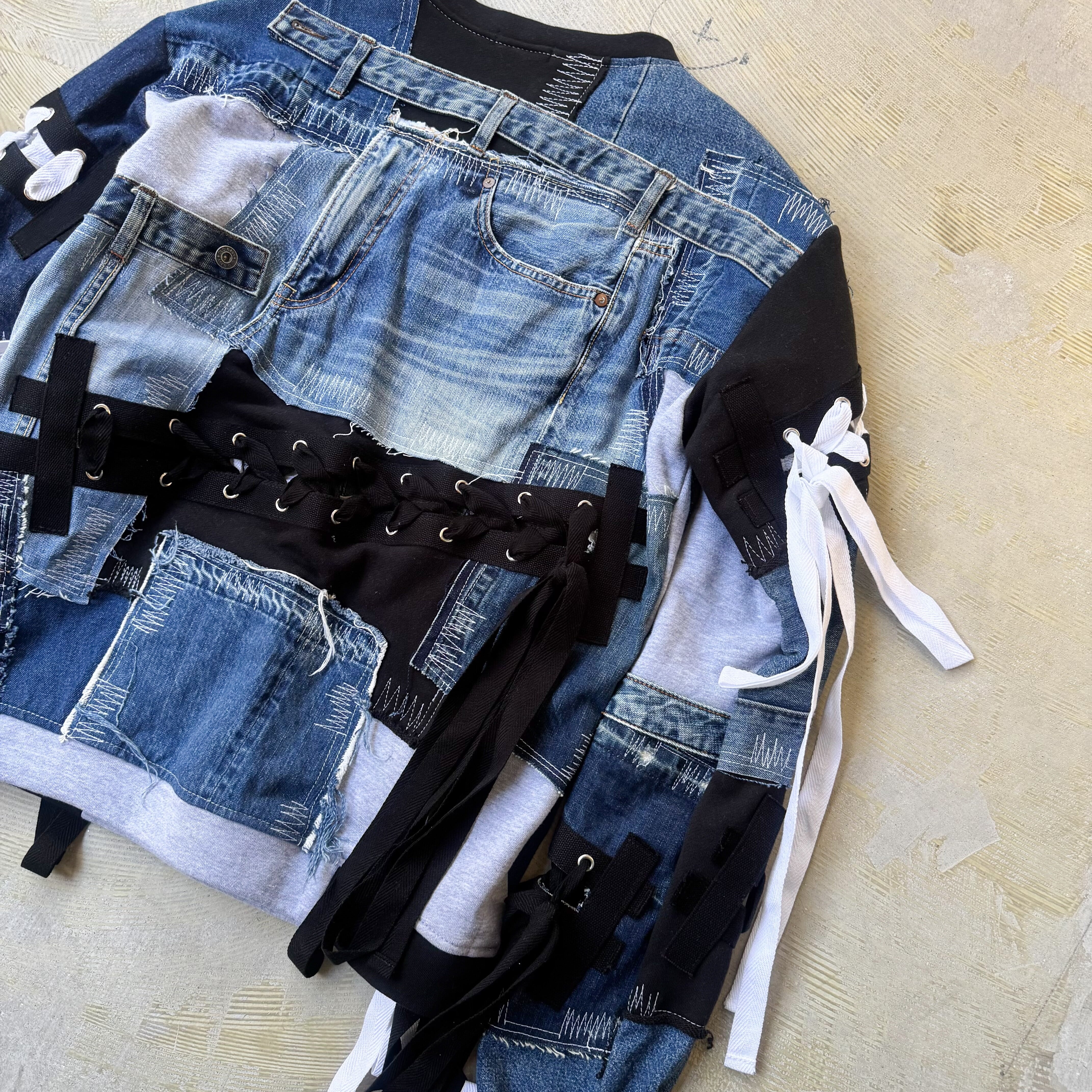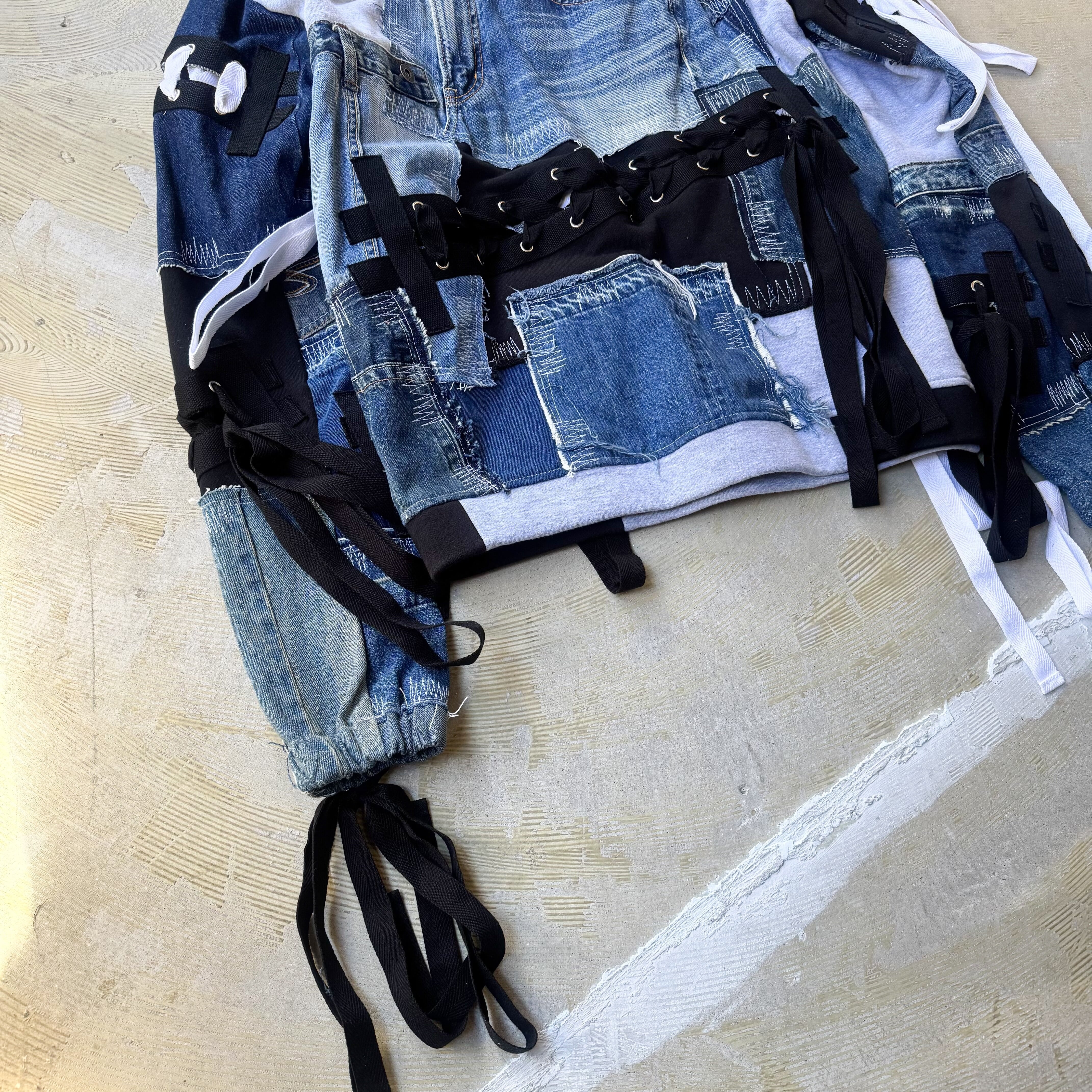 【DE:CODE】DENIM PATCHWORK DESIGN LACE UP SWEAT / デニム パッチワーク リメイク レースアップ スウェット