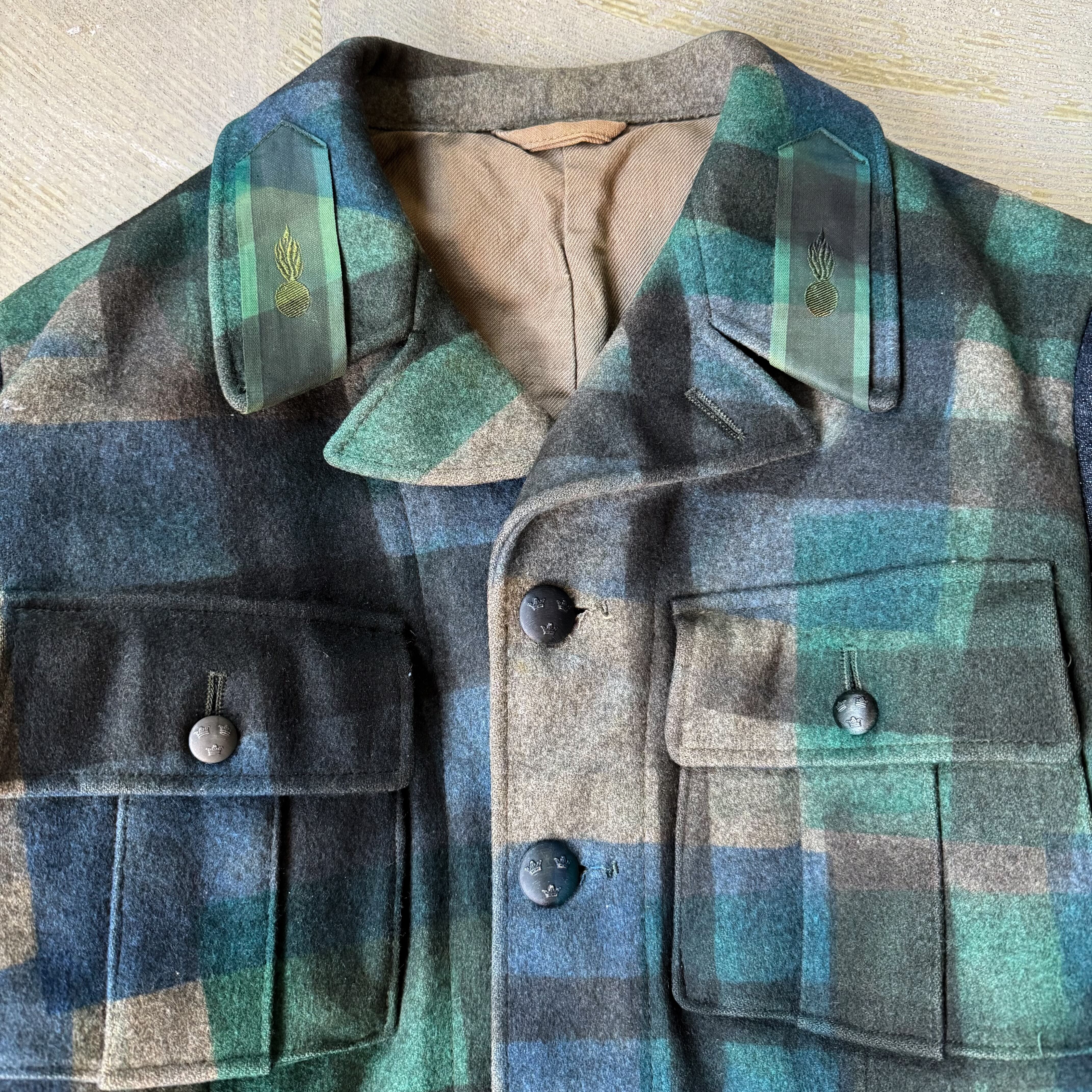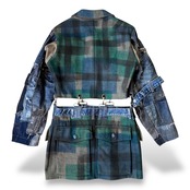 チェック柄に染め直すことで“軍服の記憶に都市のリズムを重ねる”設計。