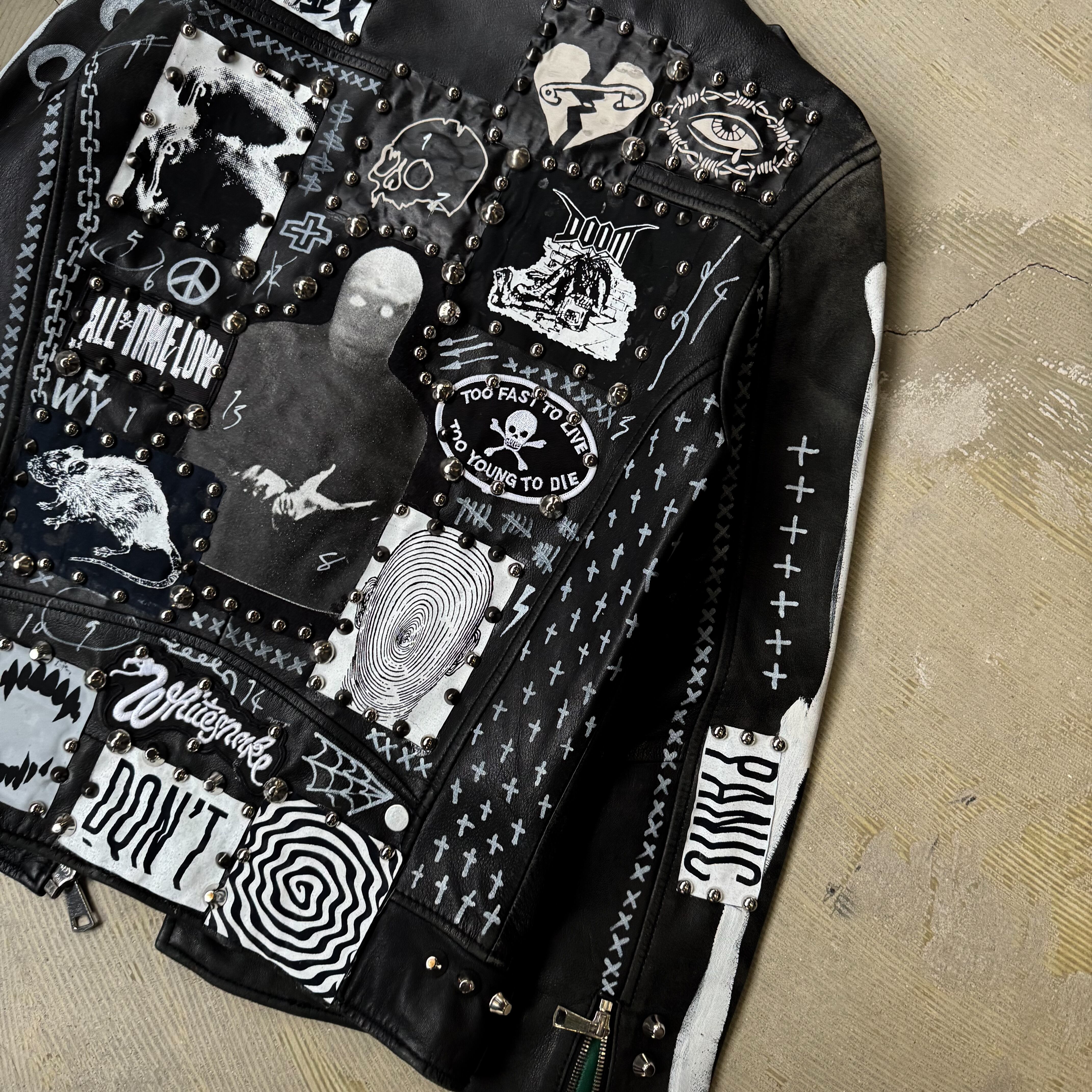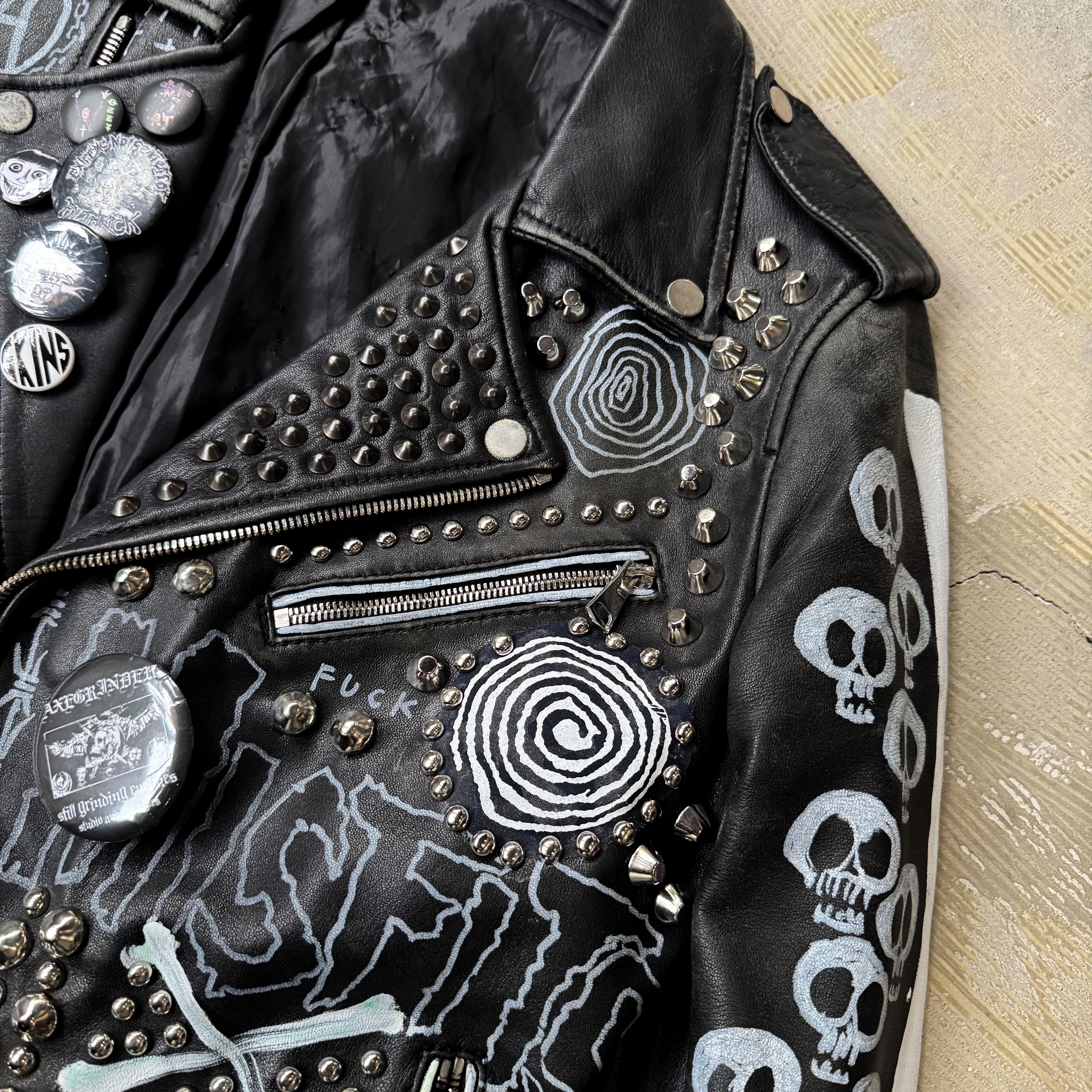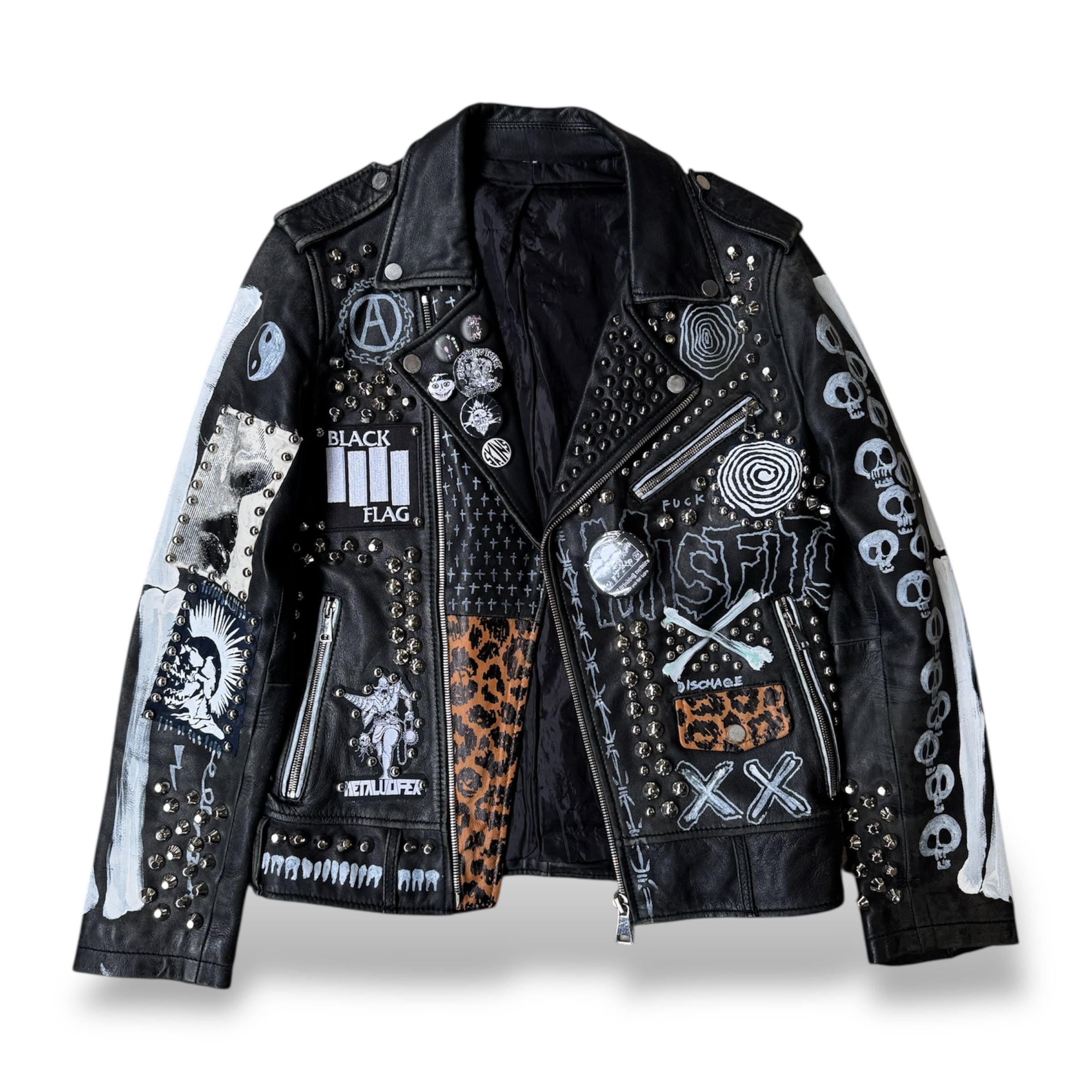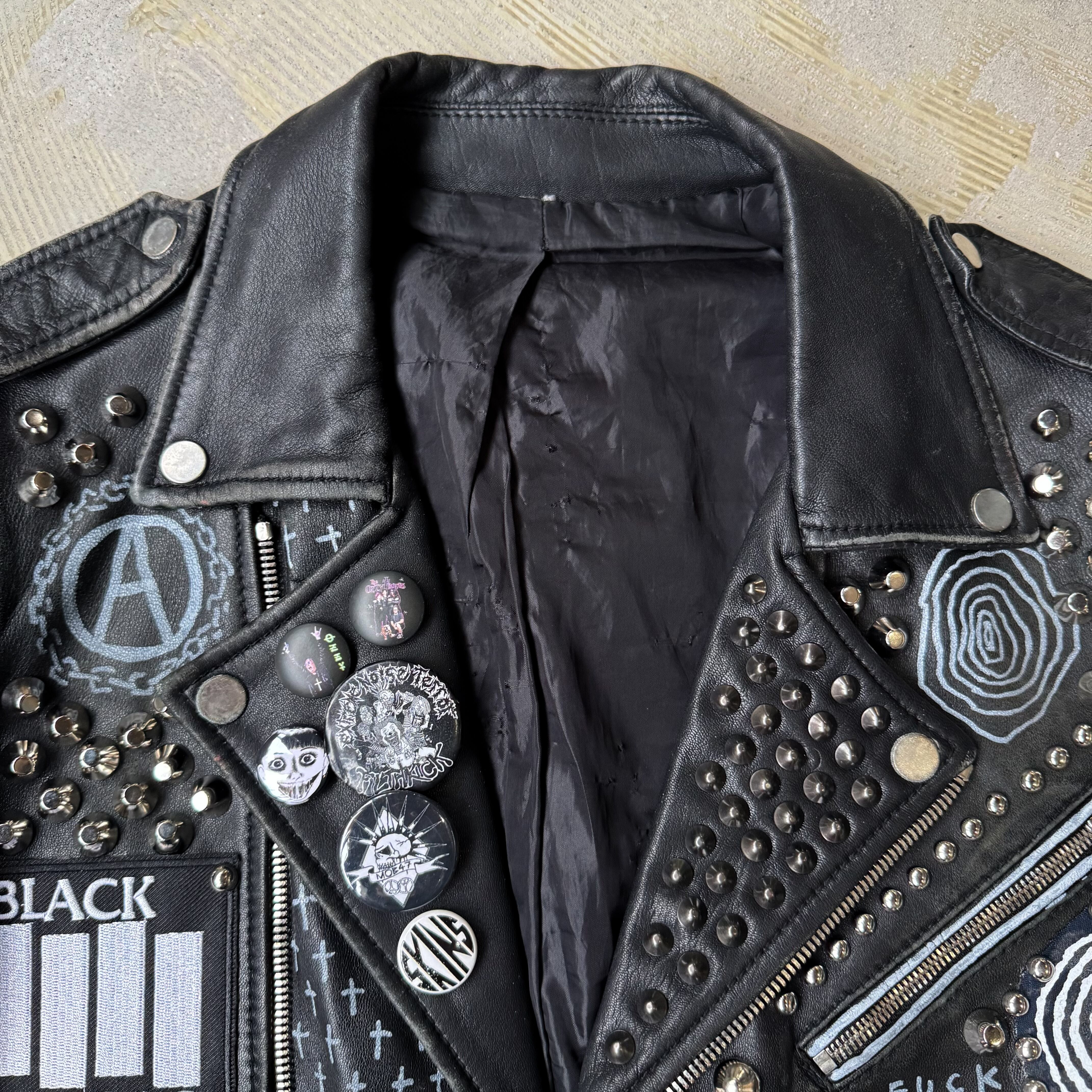 ・ブラックレザーのボディに、スタッズ、缶バッヂ、ペイント、パッチ。