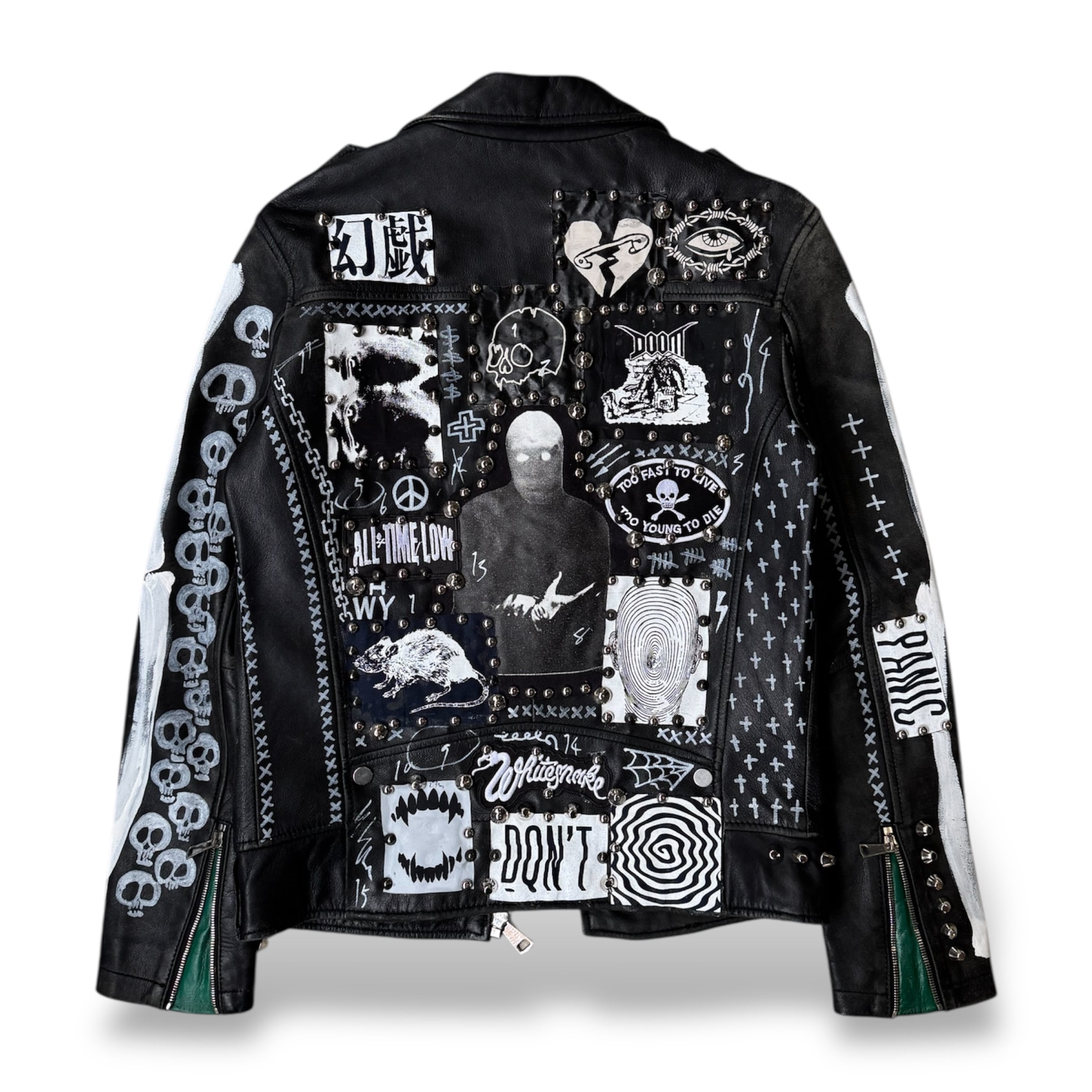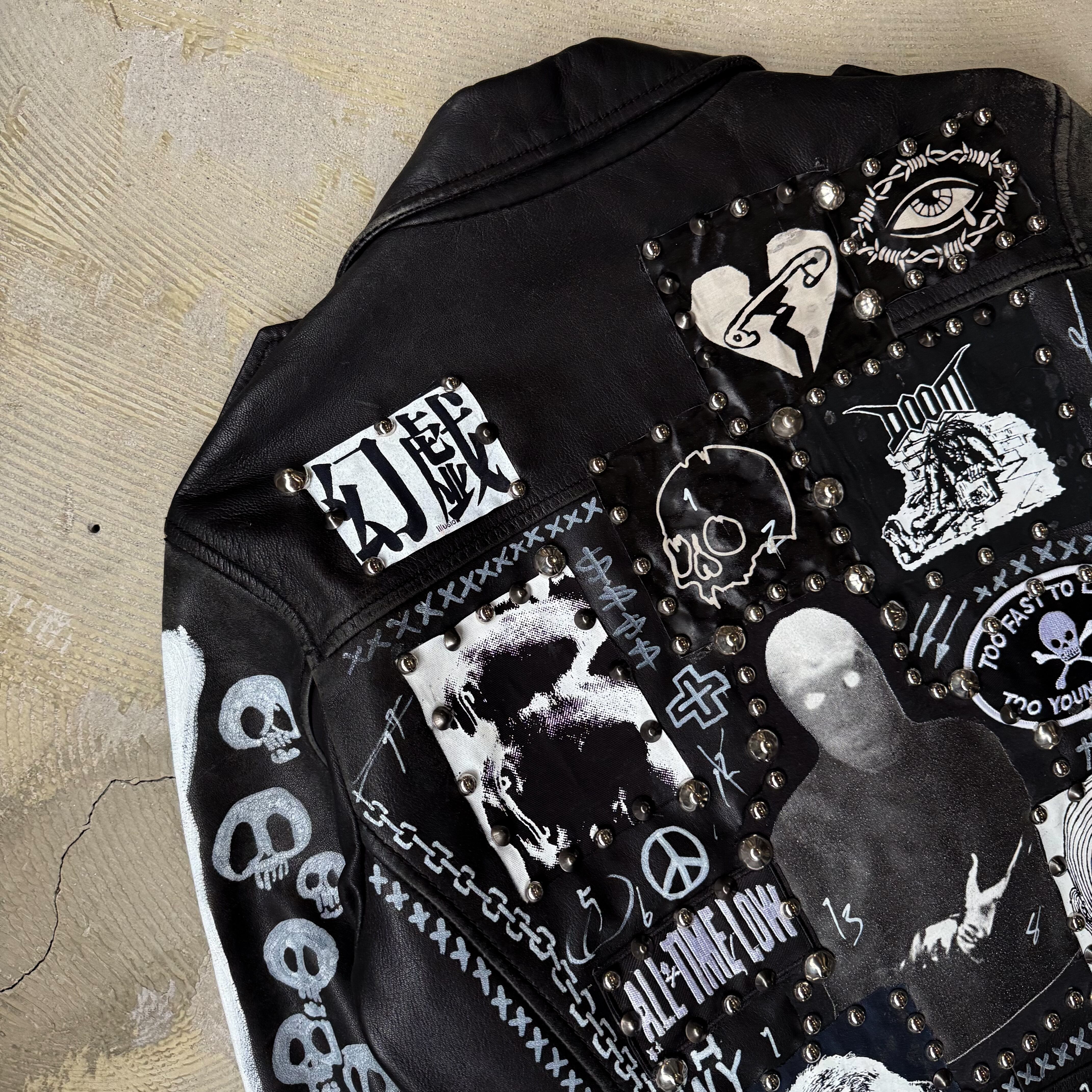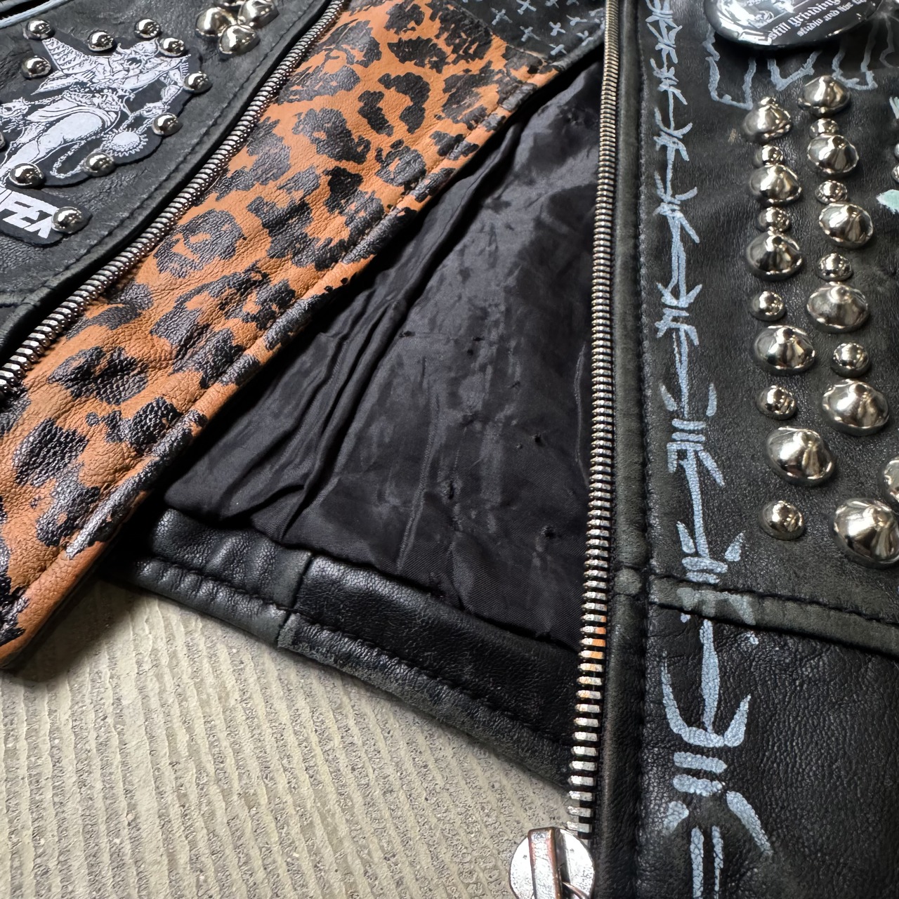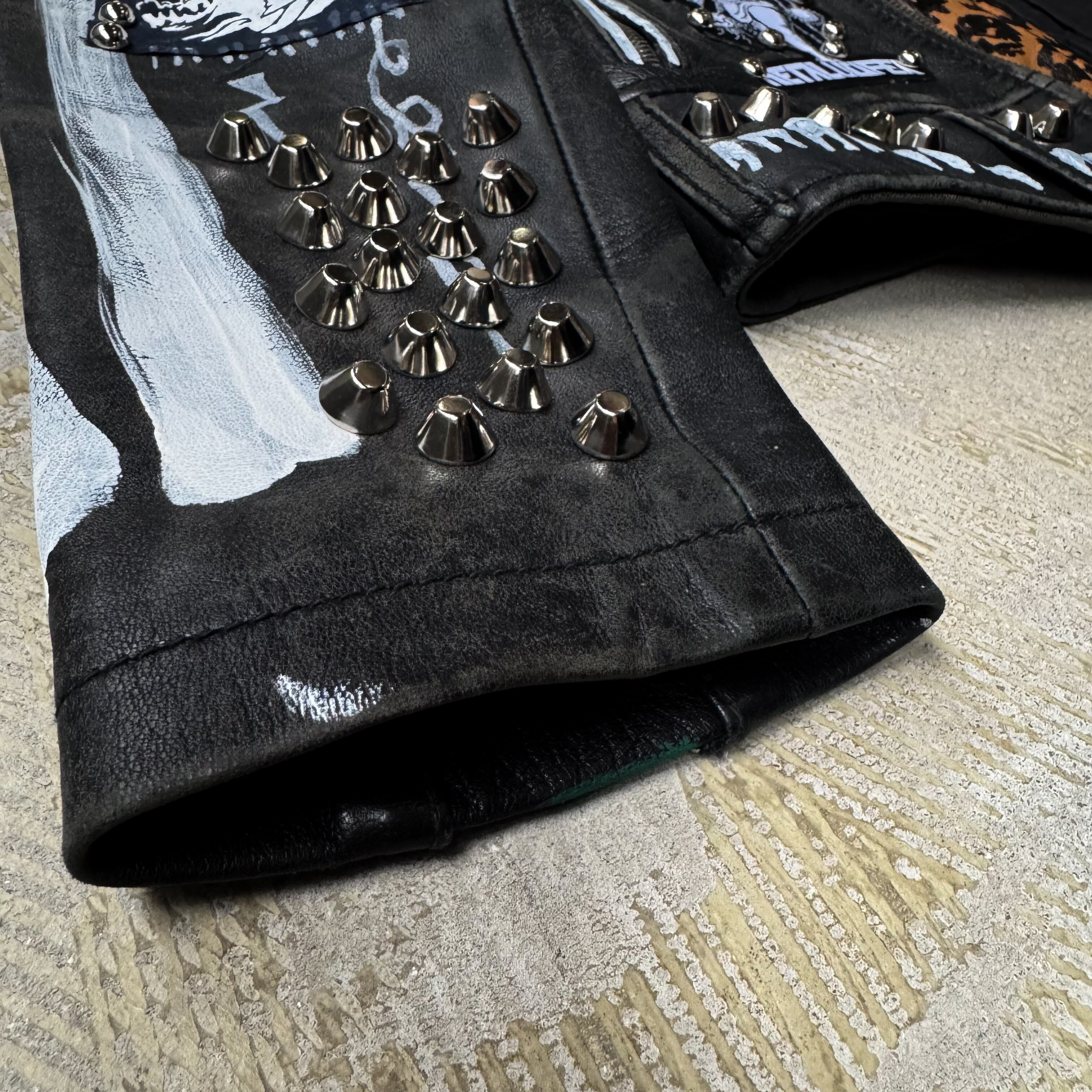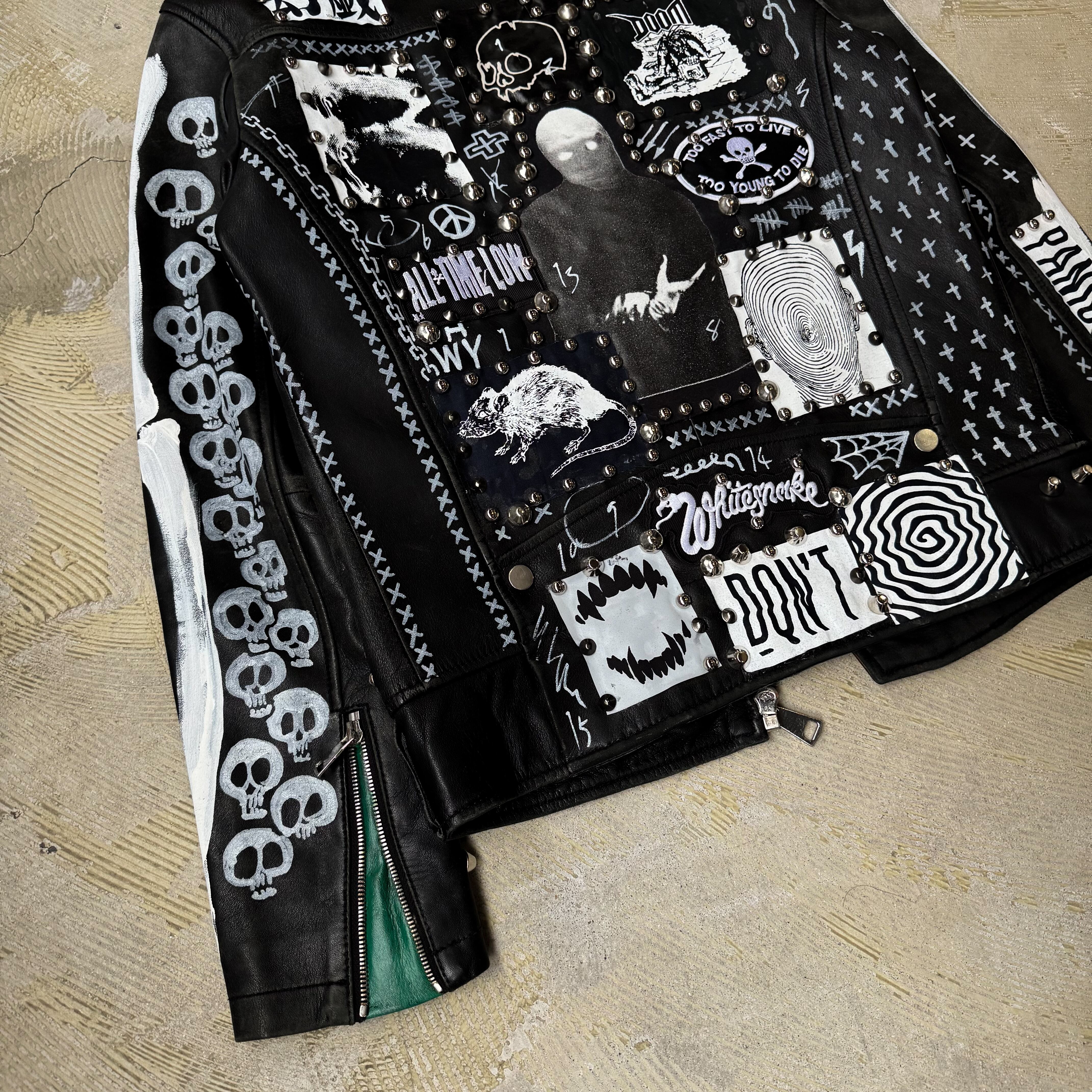 ・ブラックレザーのボディに、スタッズ、缶バッヂ、ペイント、パッチ。