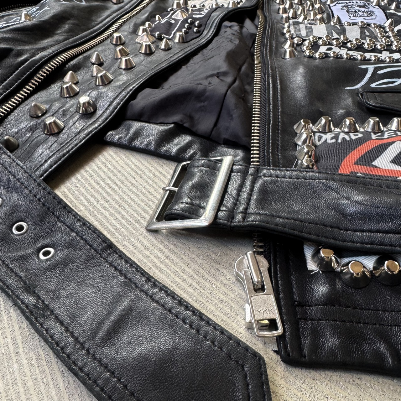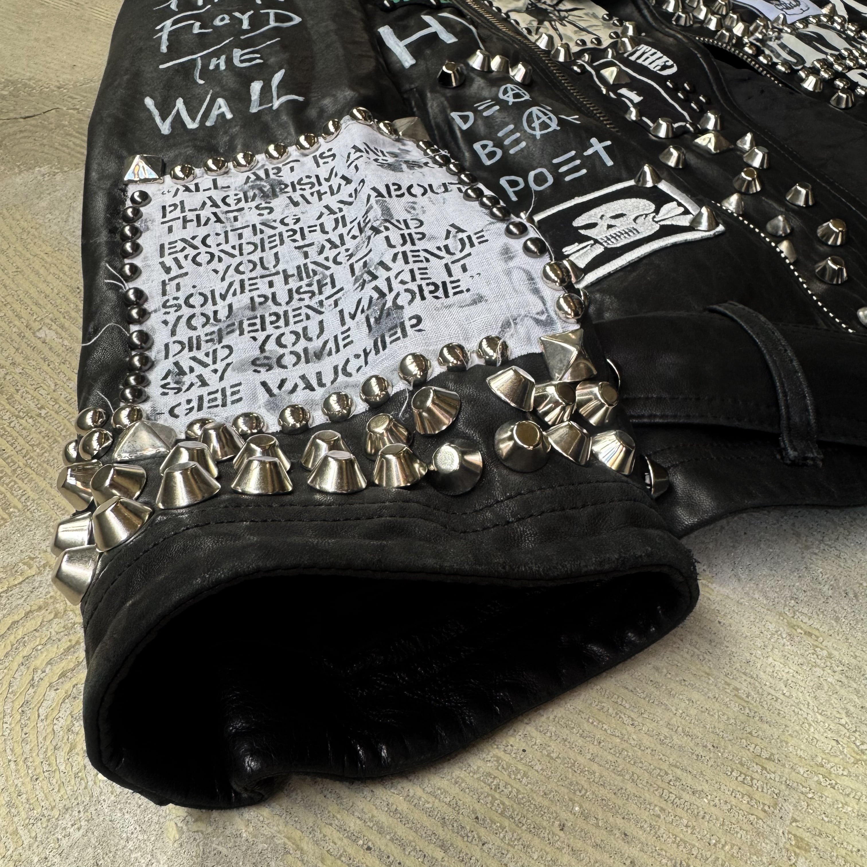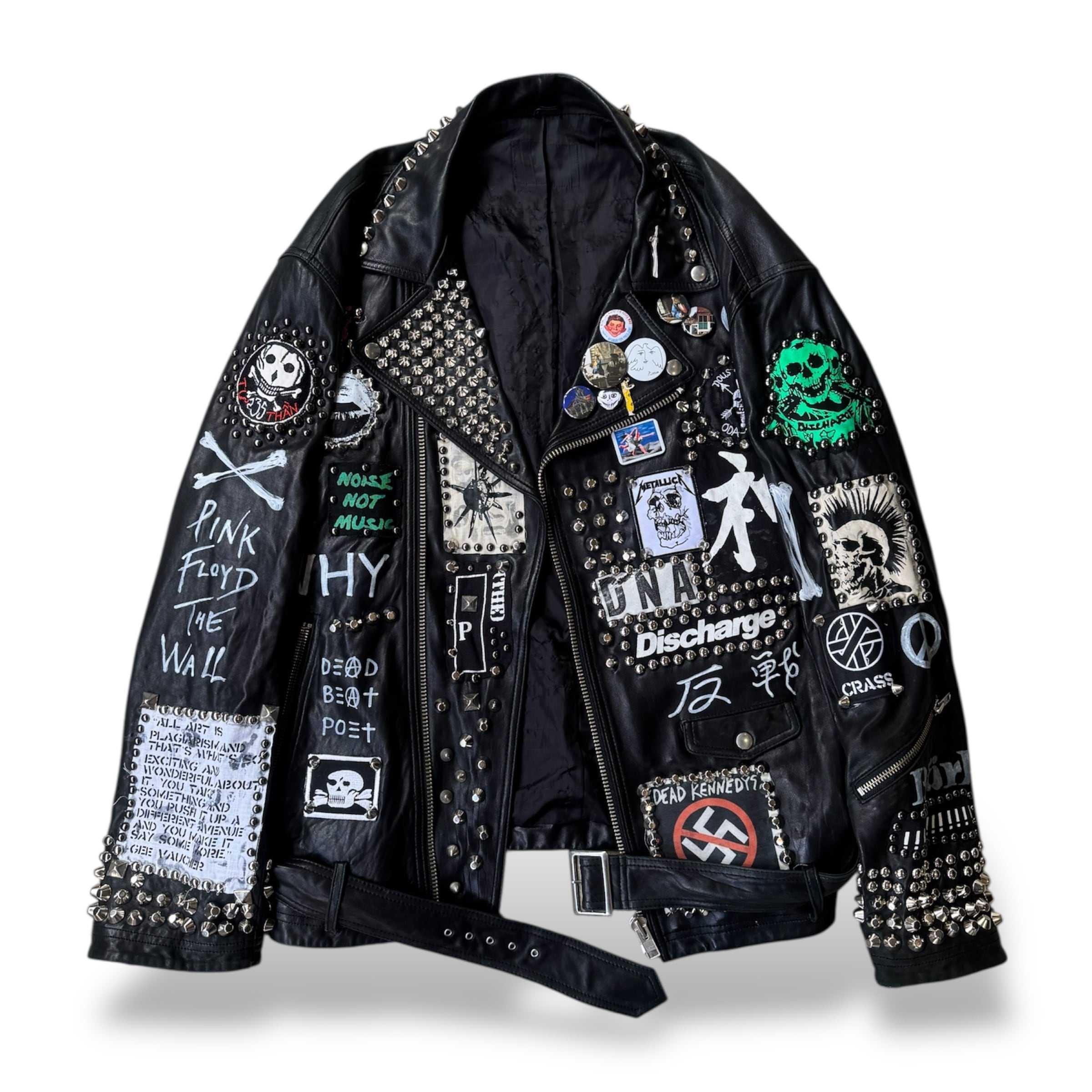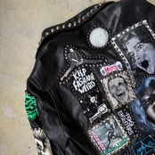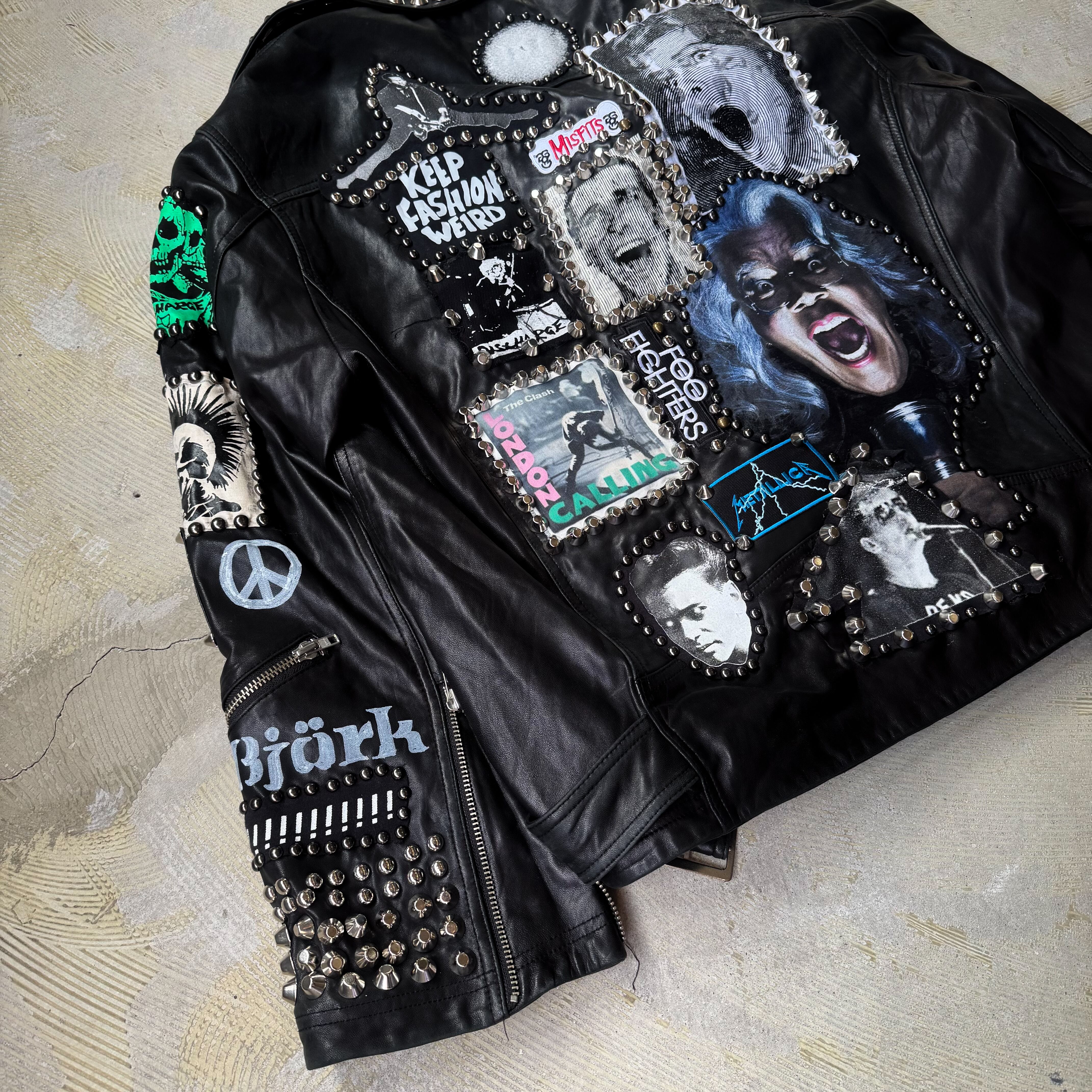 ・ブラックレザーのボディに、スタッズ、缶バッヂ、ペイント、パッチ。