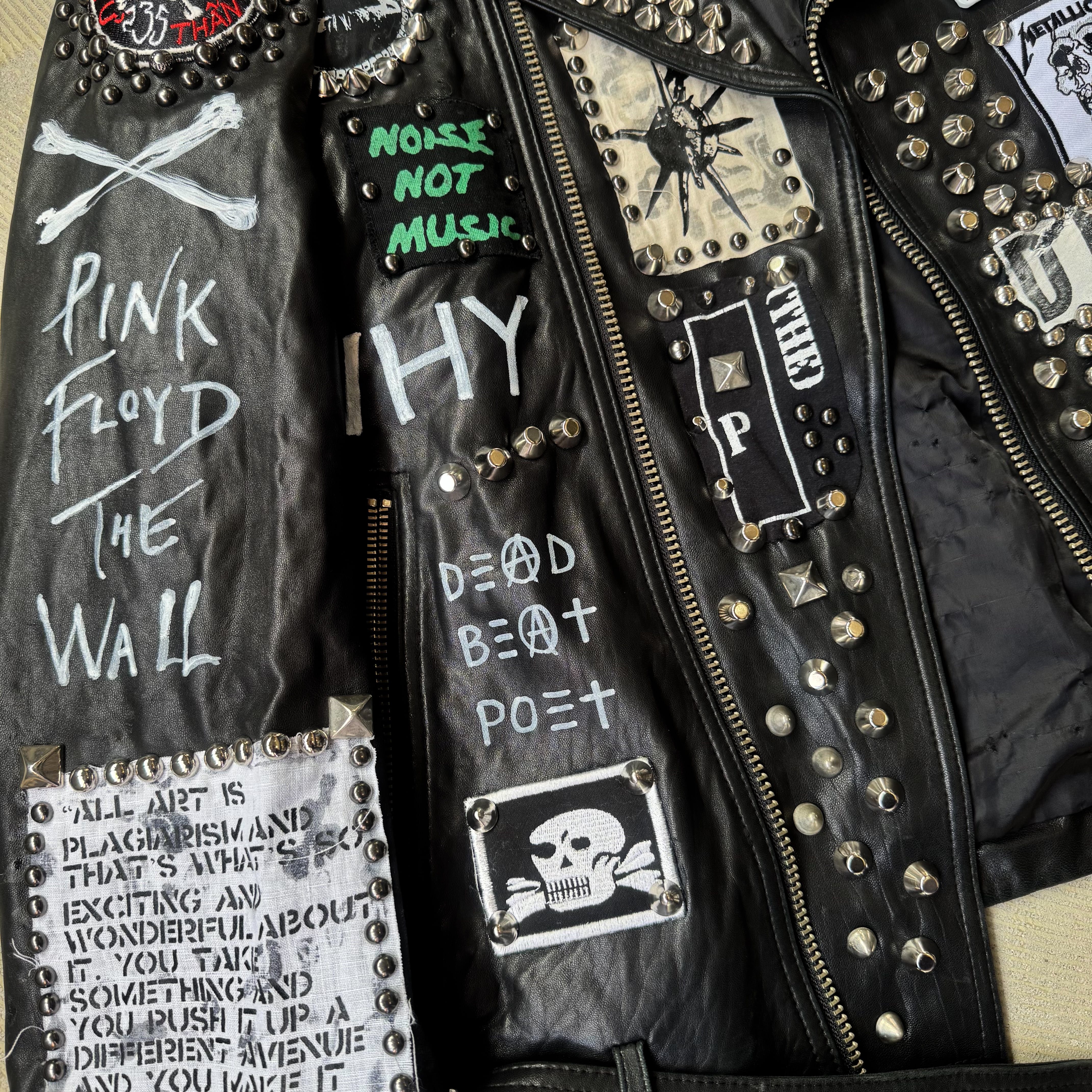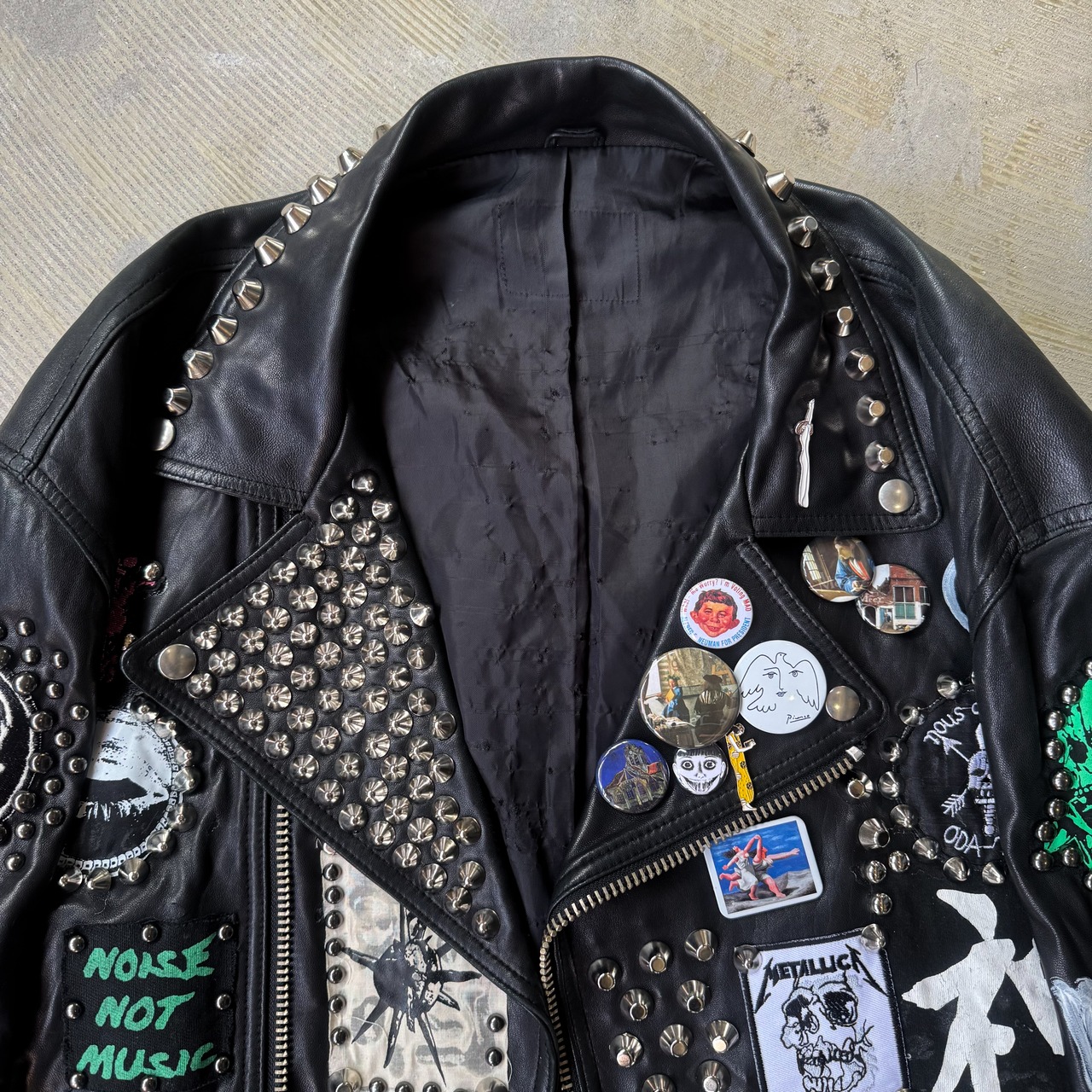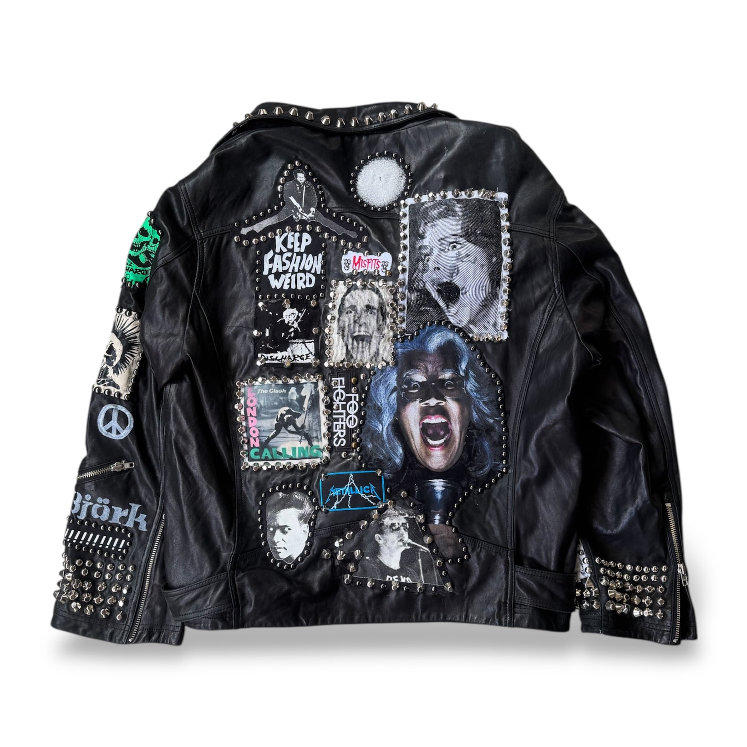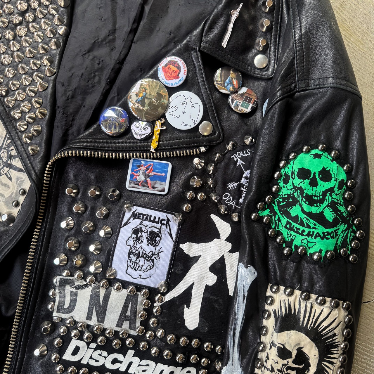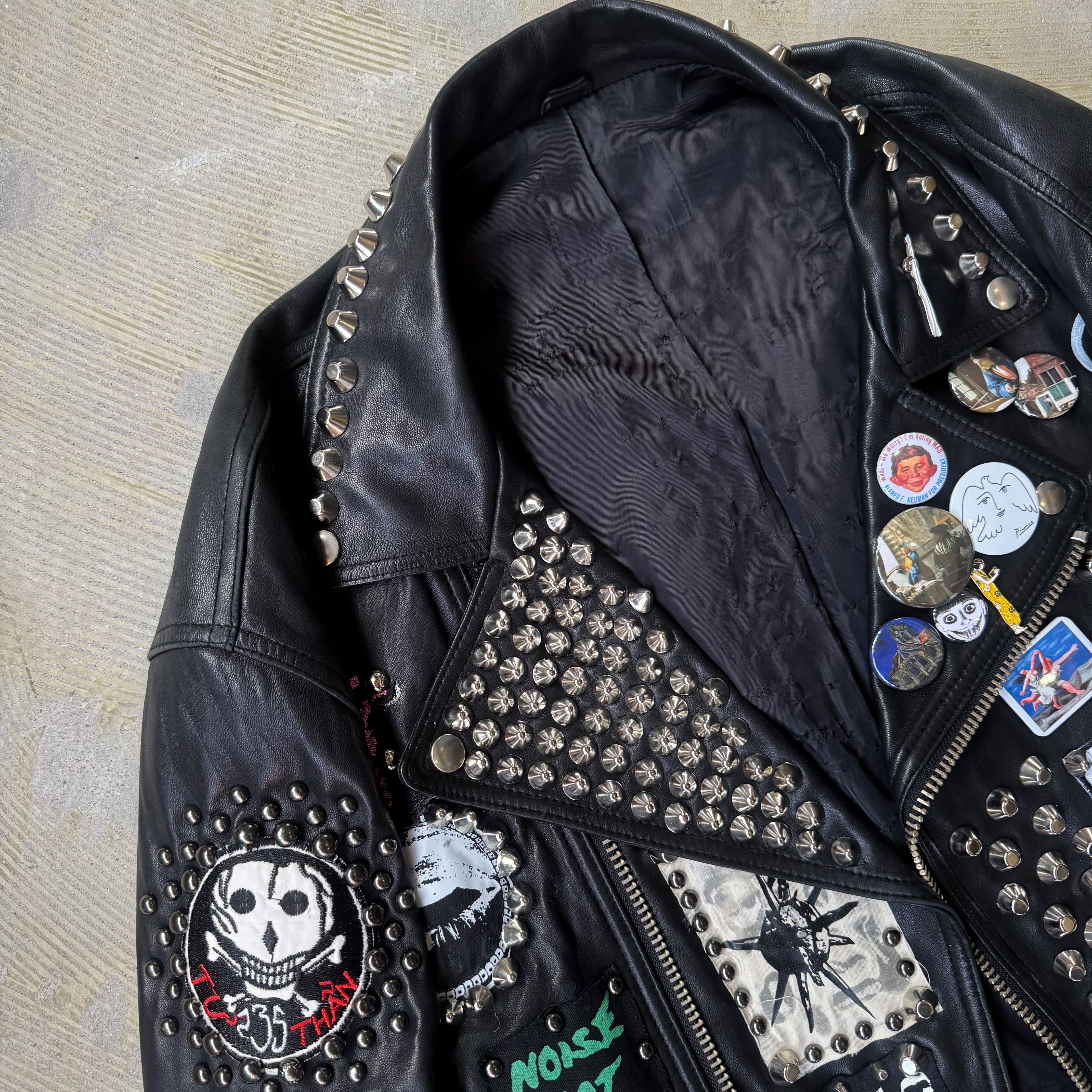 ・ブラックレザーのボディに、スタッズ、缶バッヂ、ペイント、パッチ。