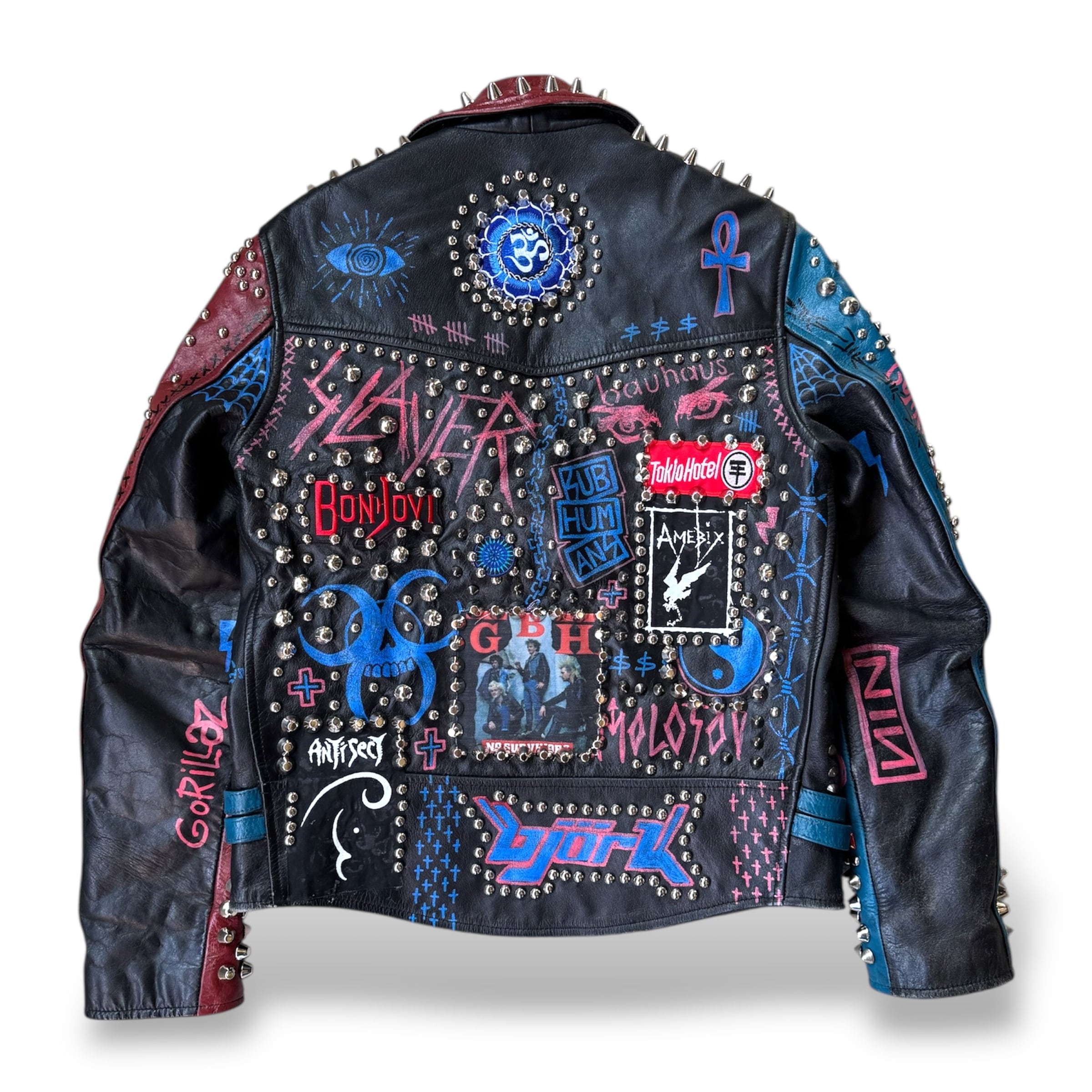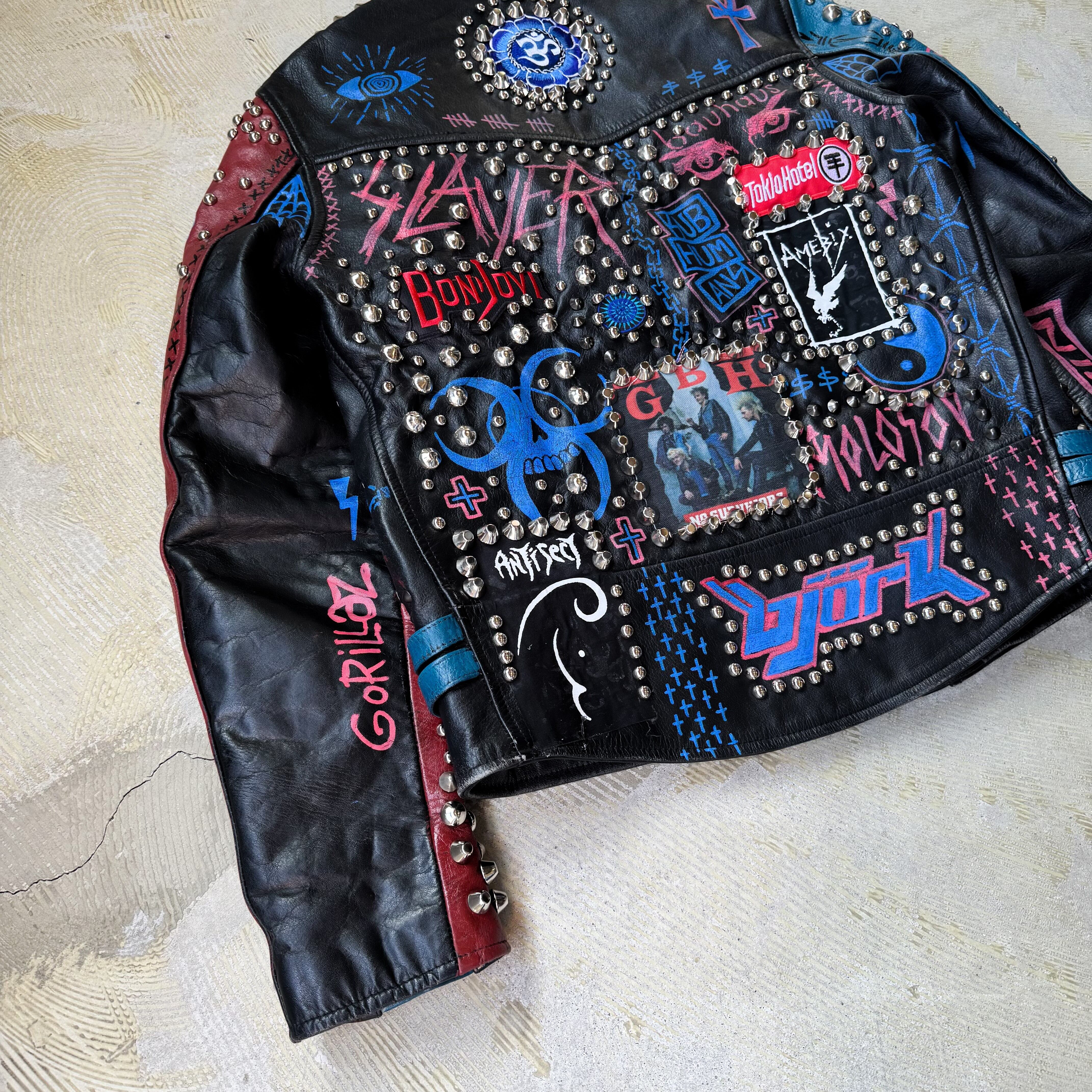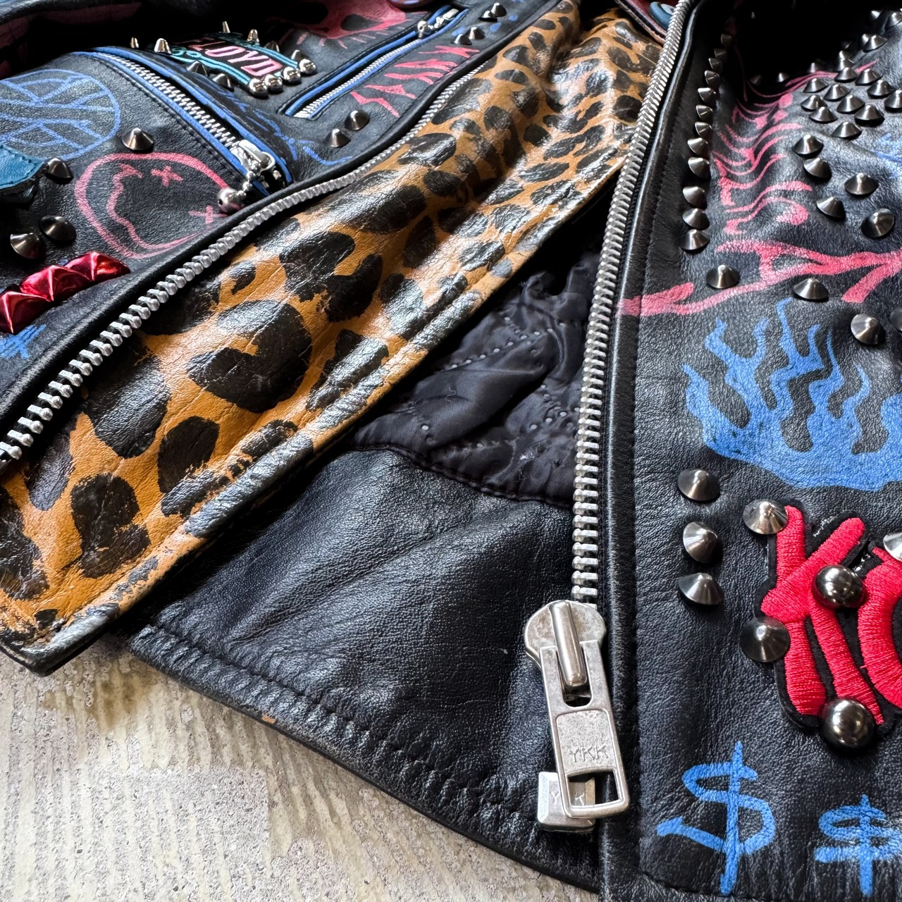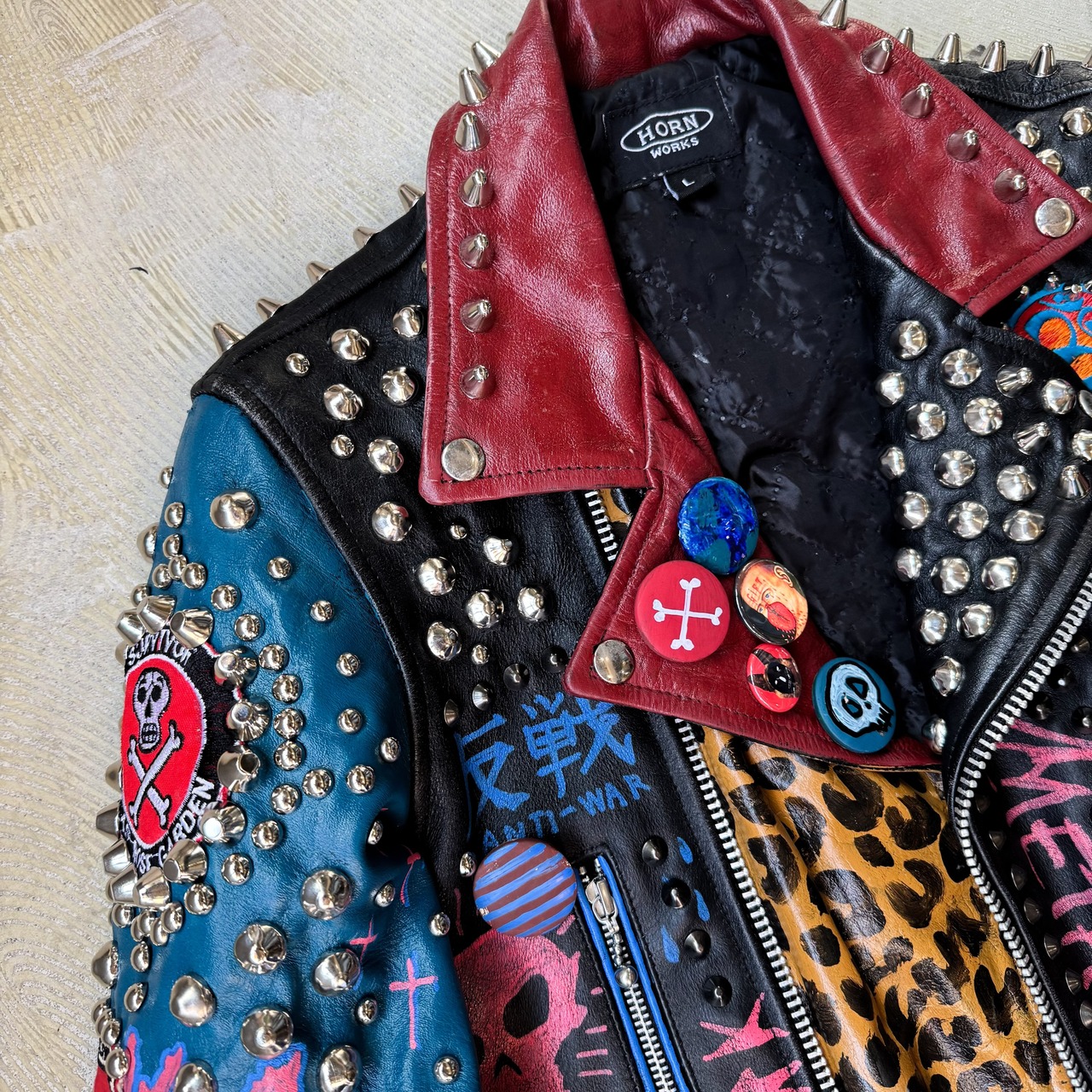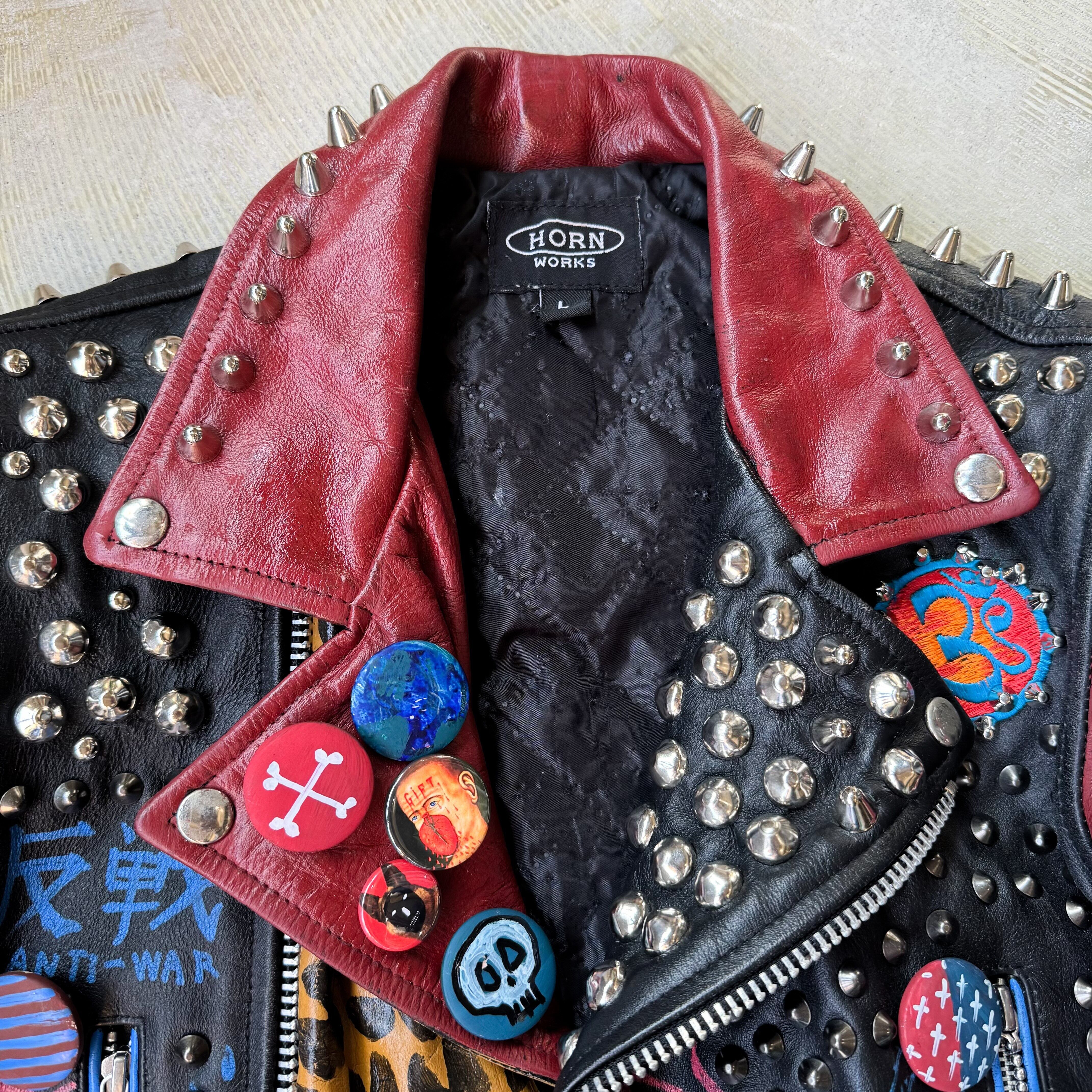 スタッズ、パッチ、ペイント、すべて手作業でカスタムされたレザーライダースジャケット。