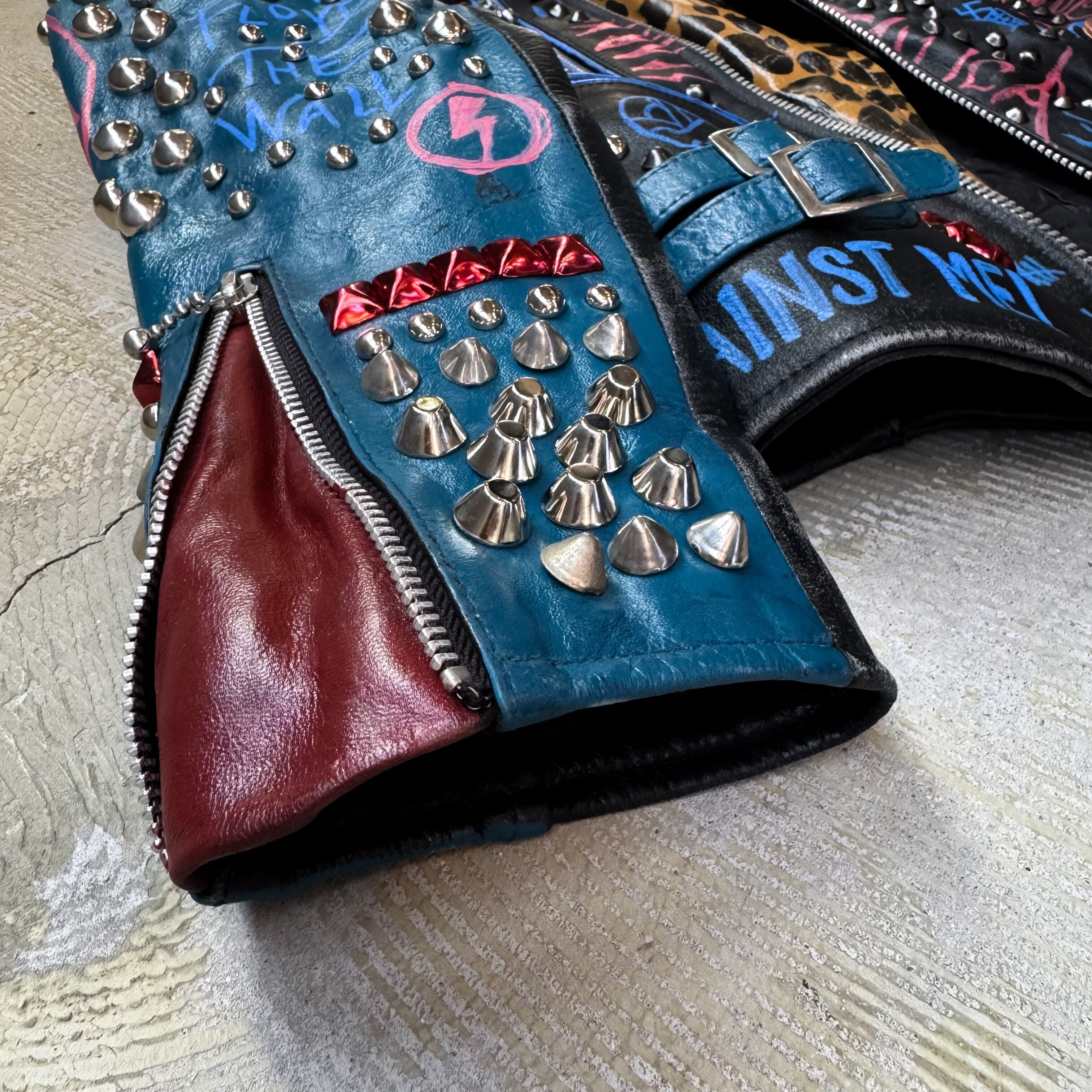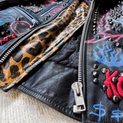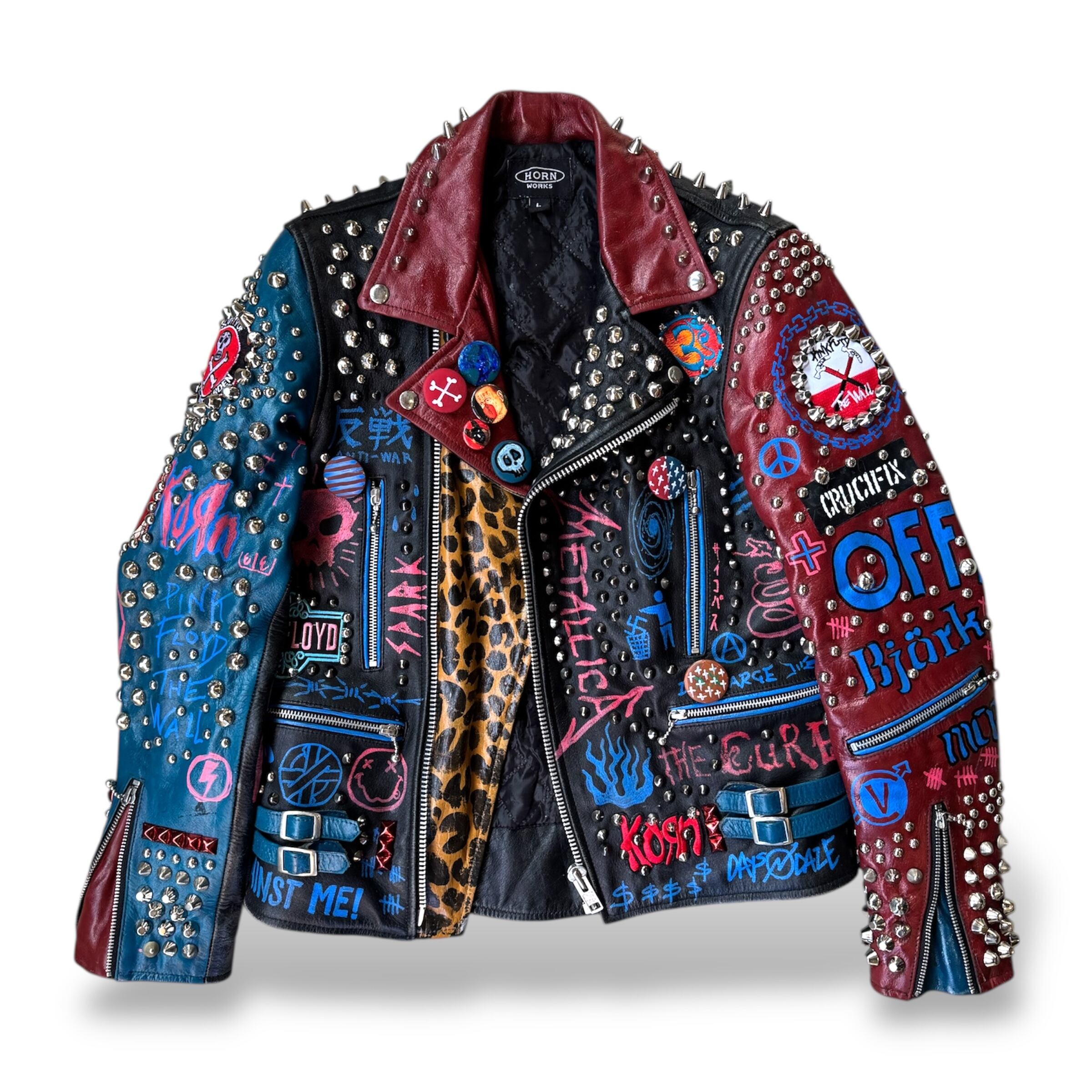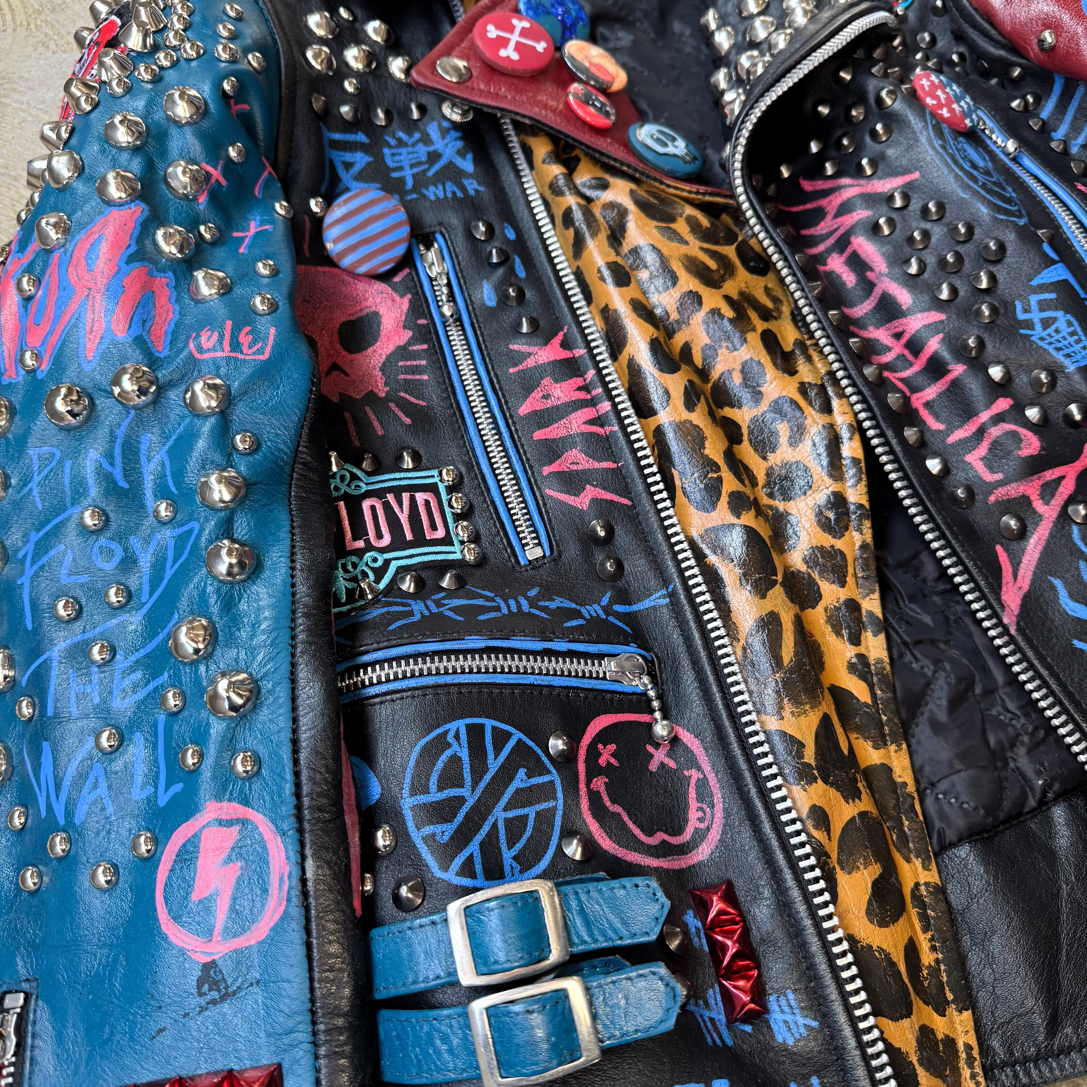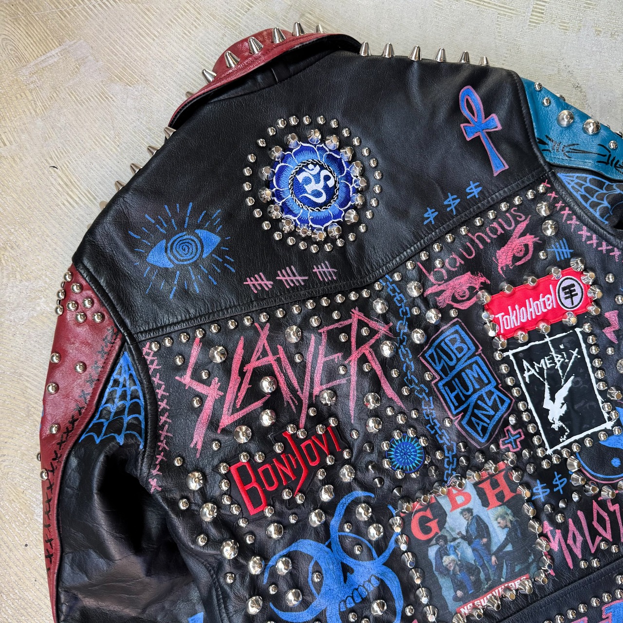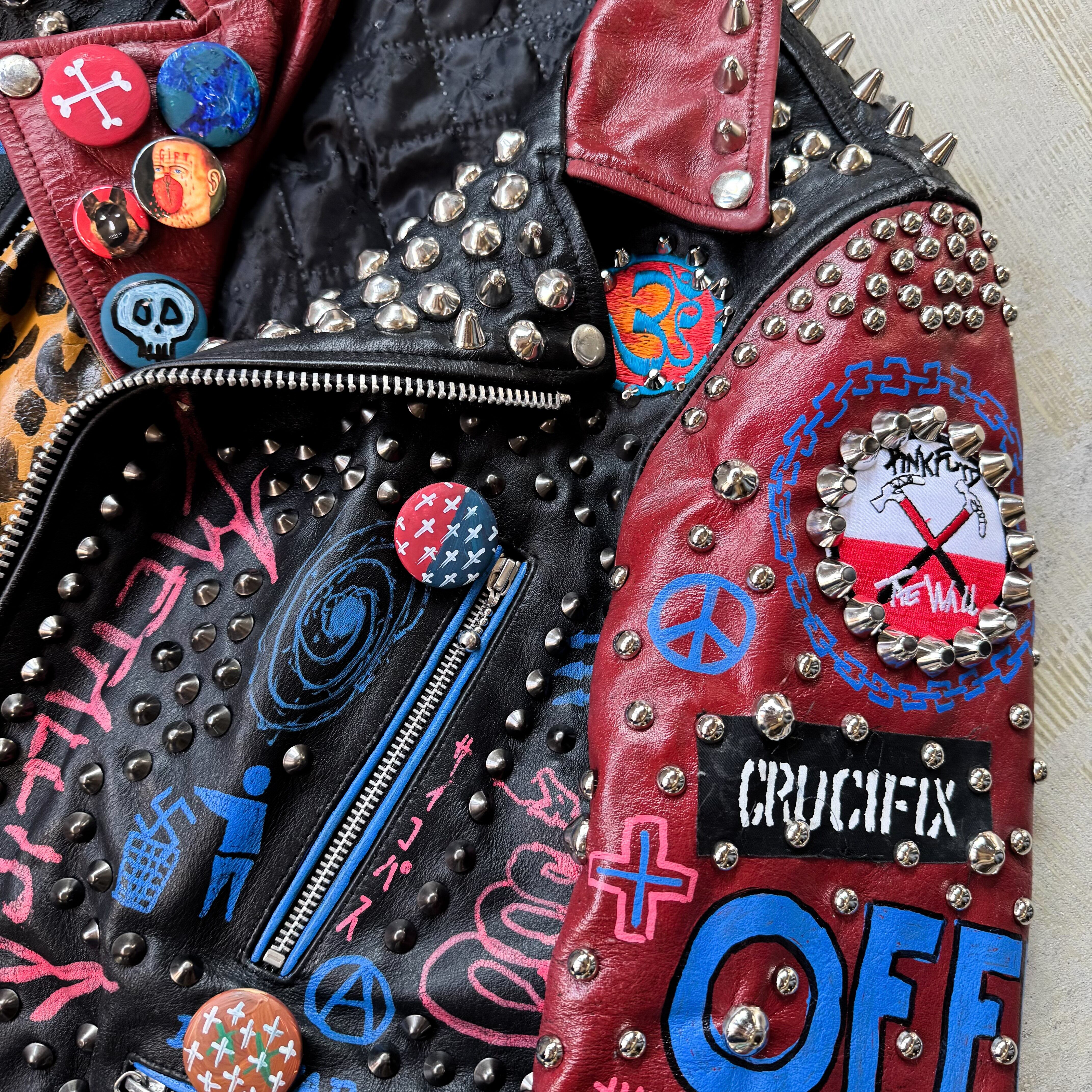 スタッズ、パッチ、ペイント、すべて手作業でカスタムされたレザーライダースジャケット。