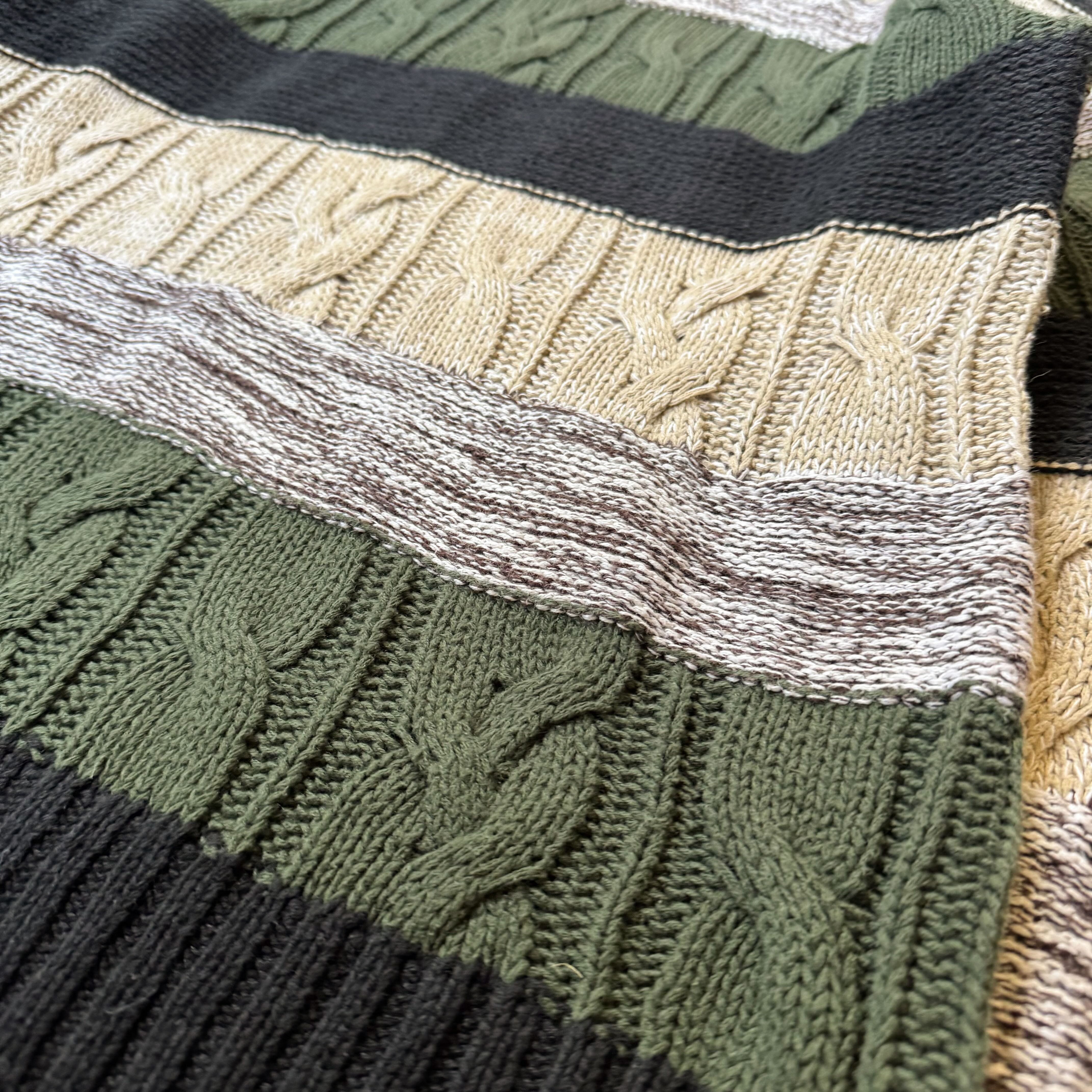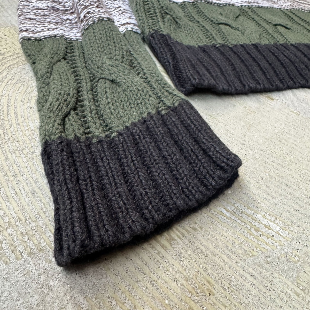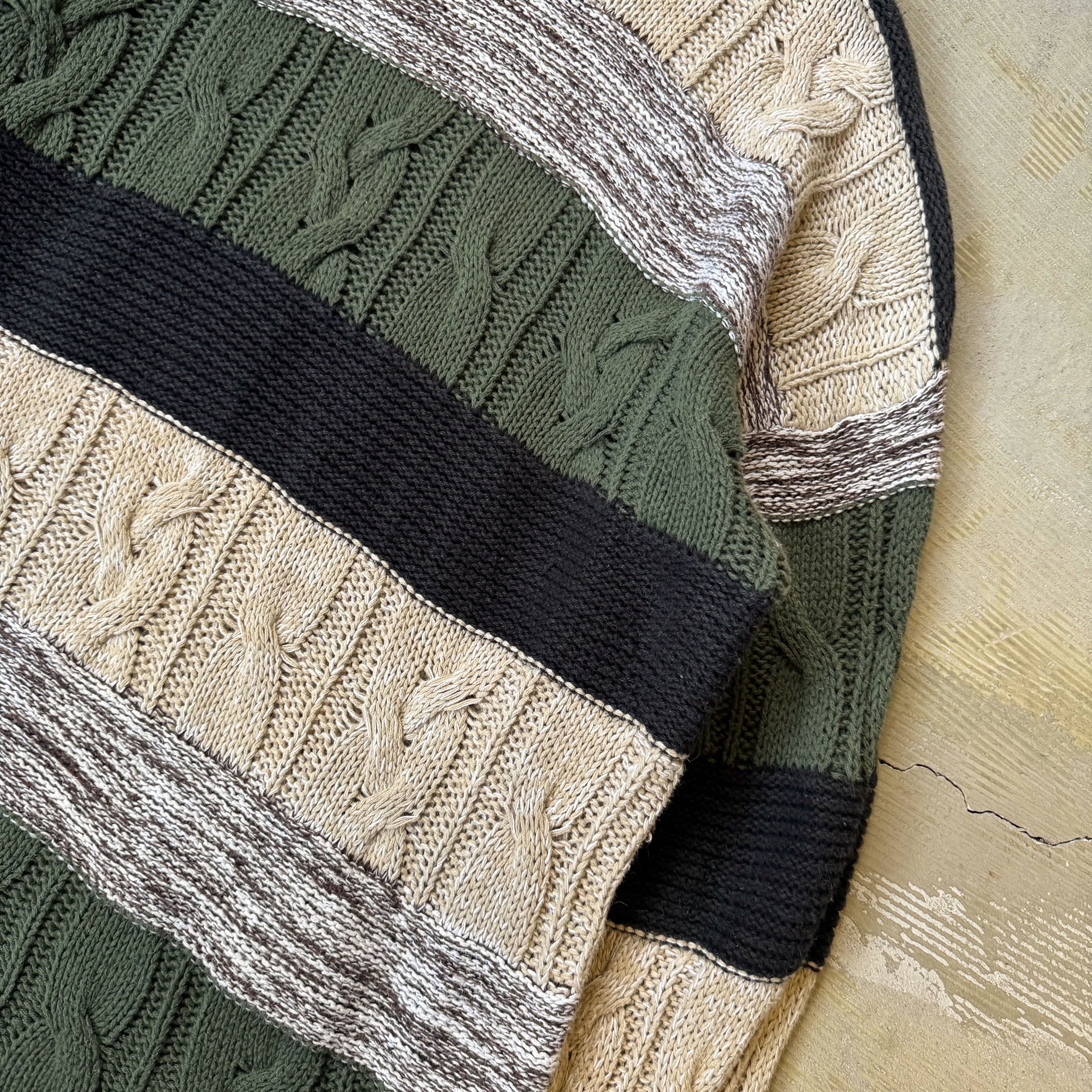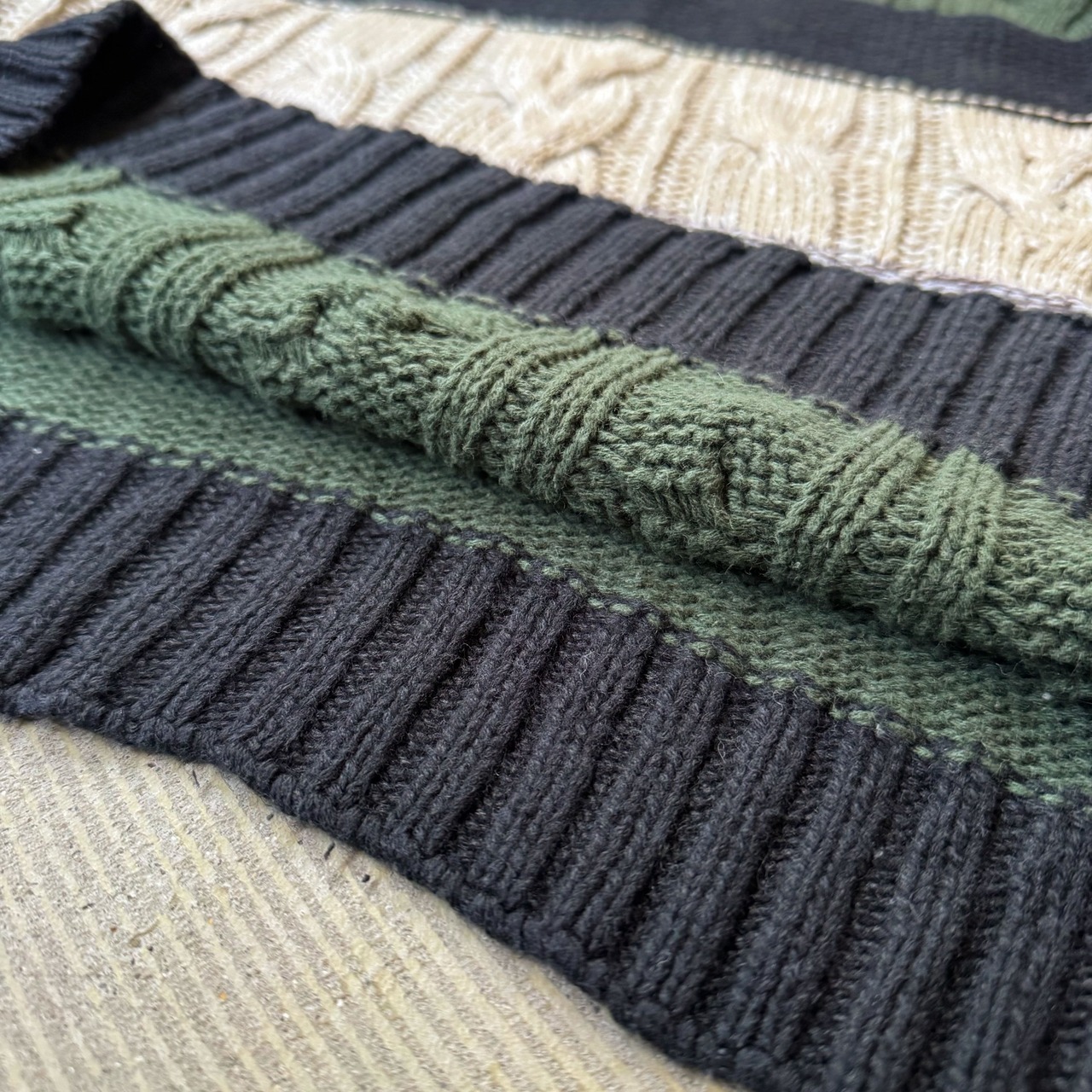 ・ケーブル編みをベースに、クリーム・ダークグリーン・ブラック・杢グレーの