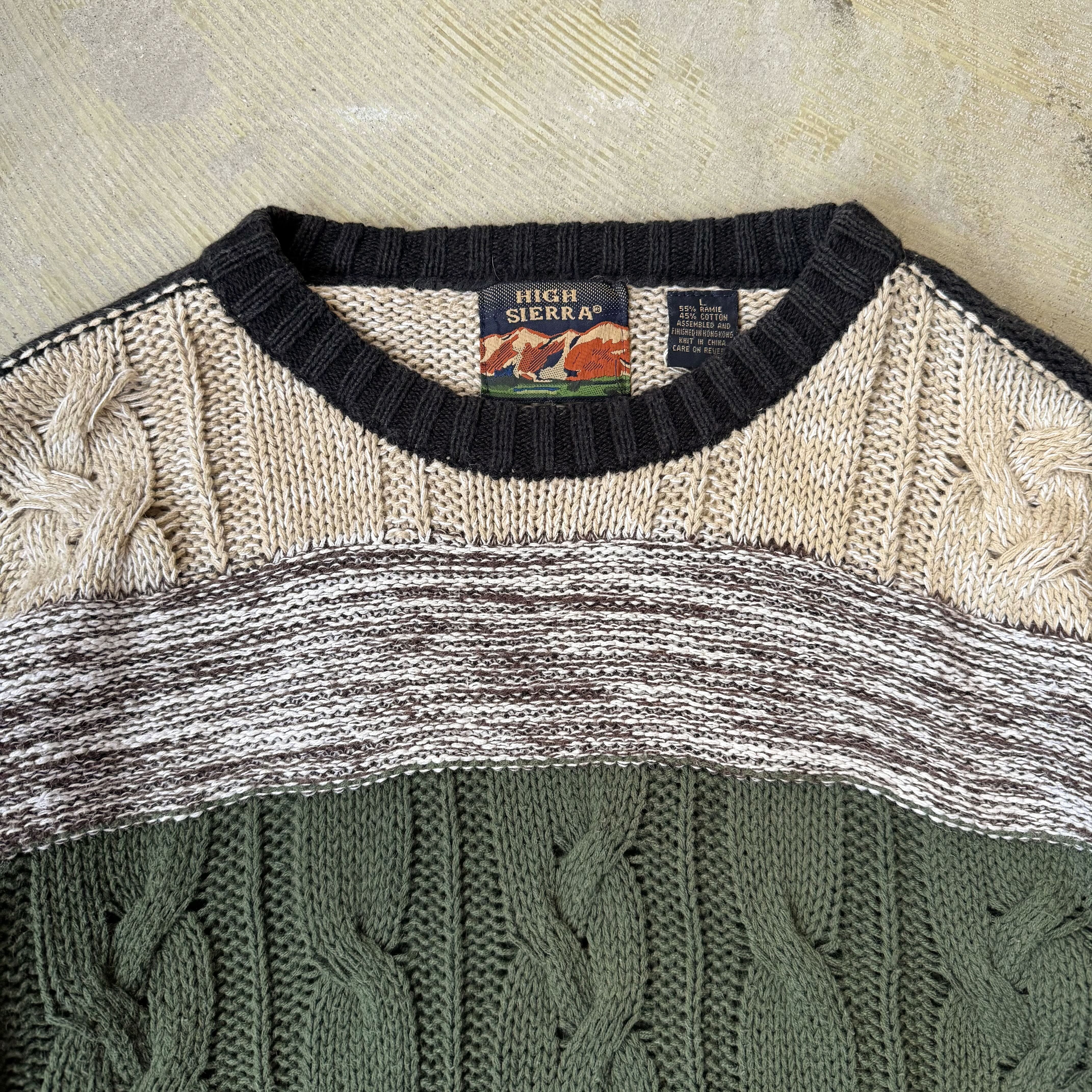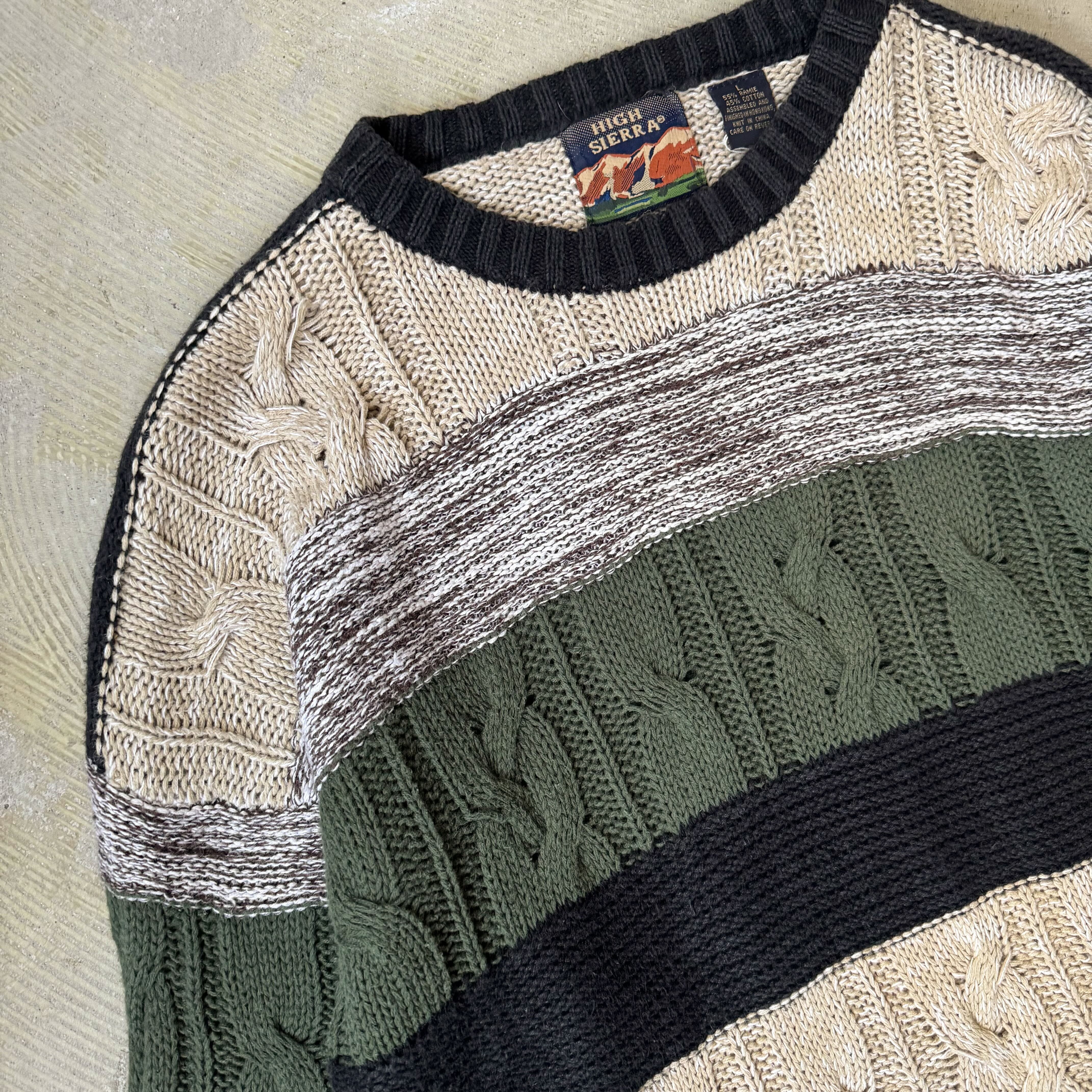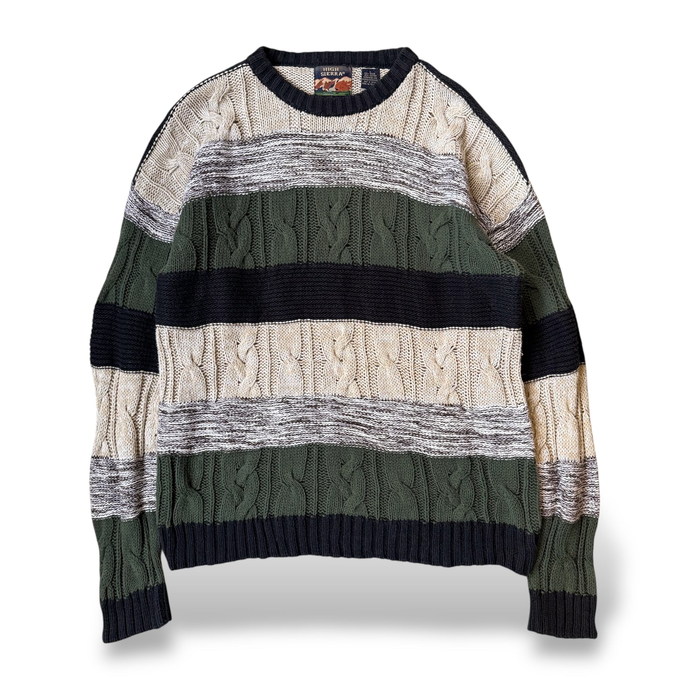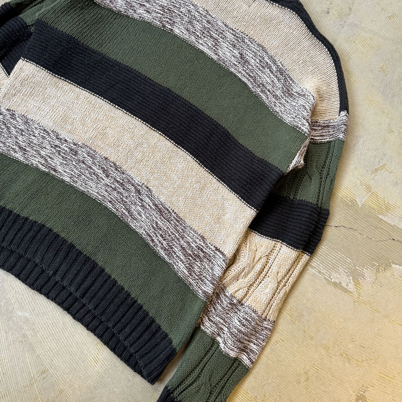 ・ケーブル編みをベースに、クリーム・ダークグリーン・ブラック・杢グレーの