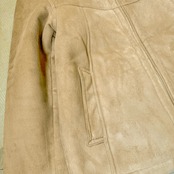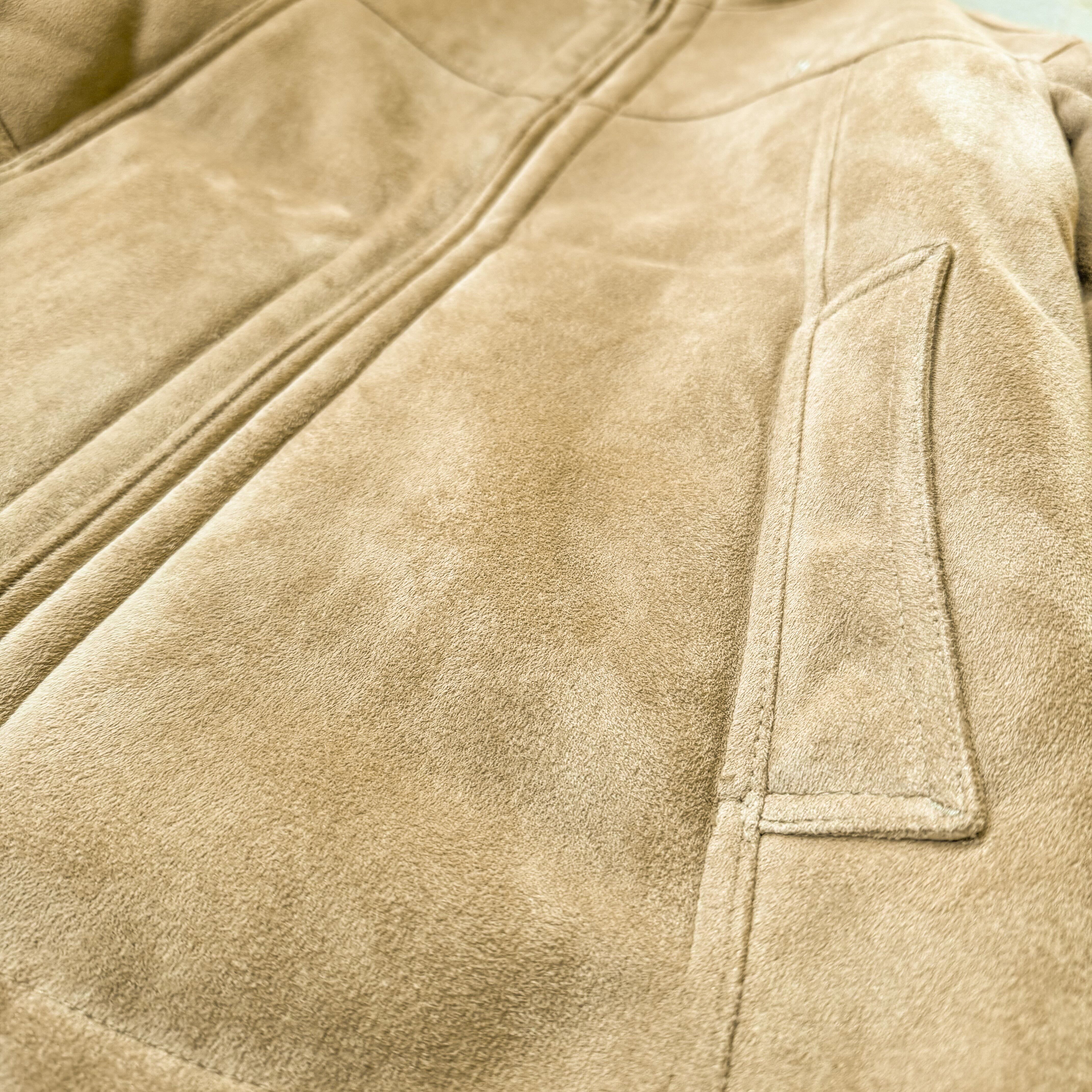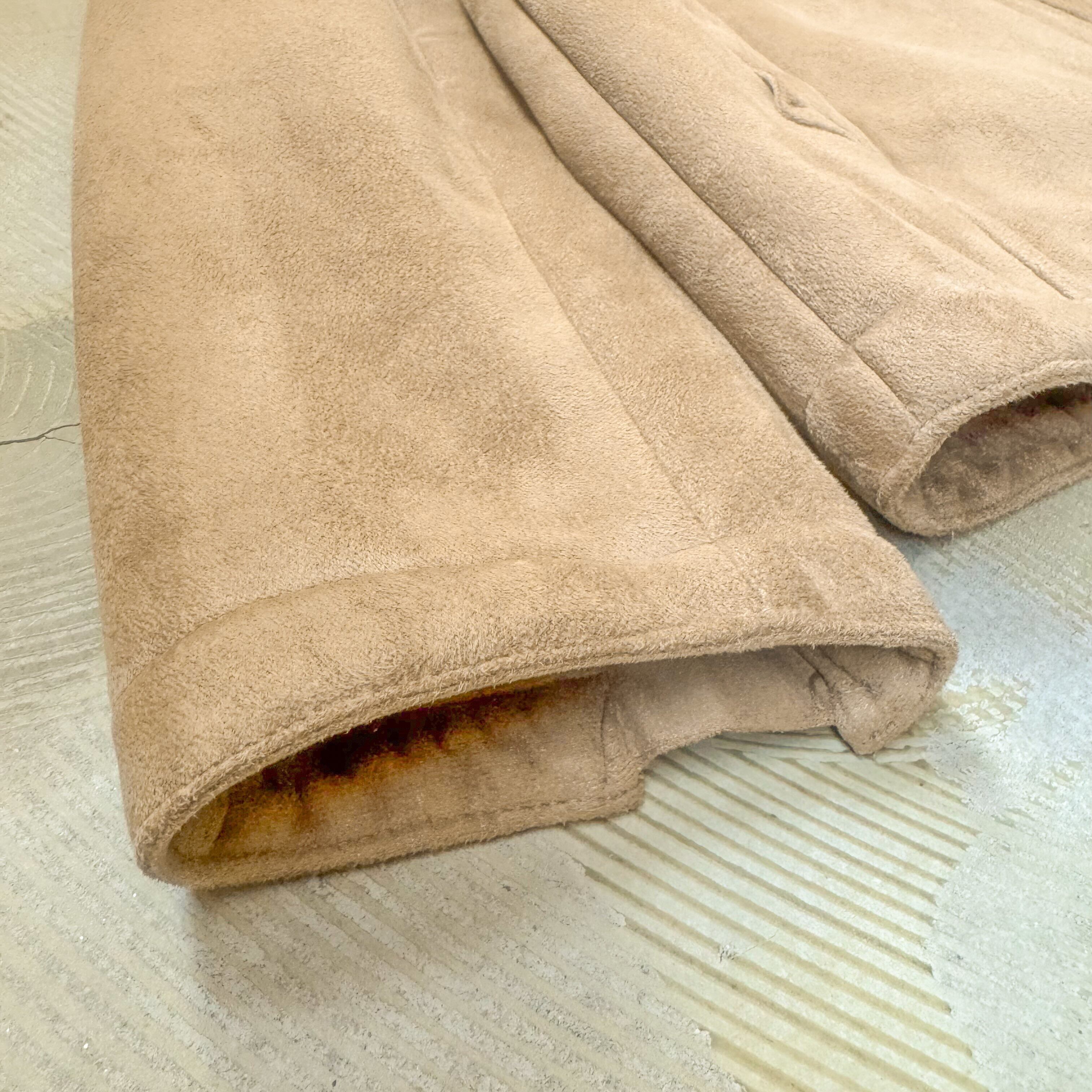 タンカラーのスエード調ボディに、襟元はライトトーンのフェイクファーを採用し