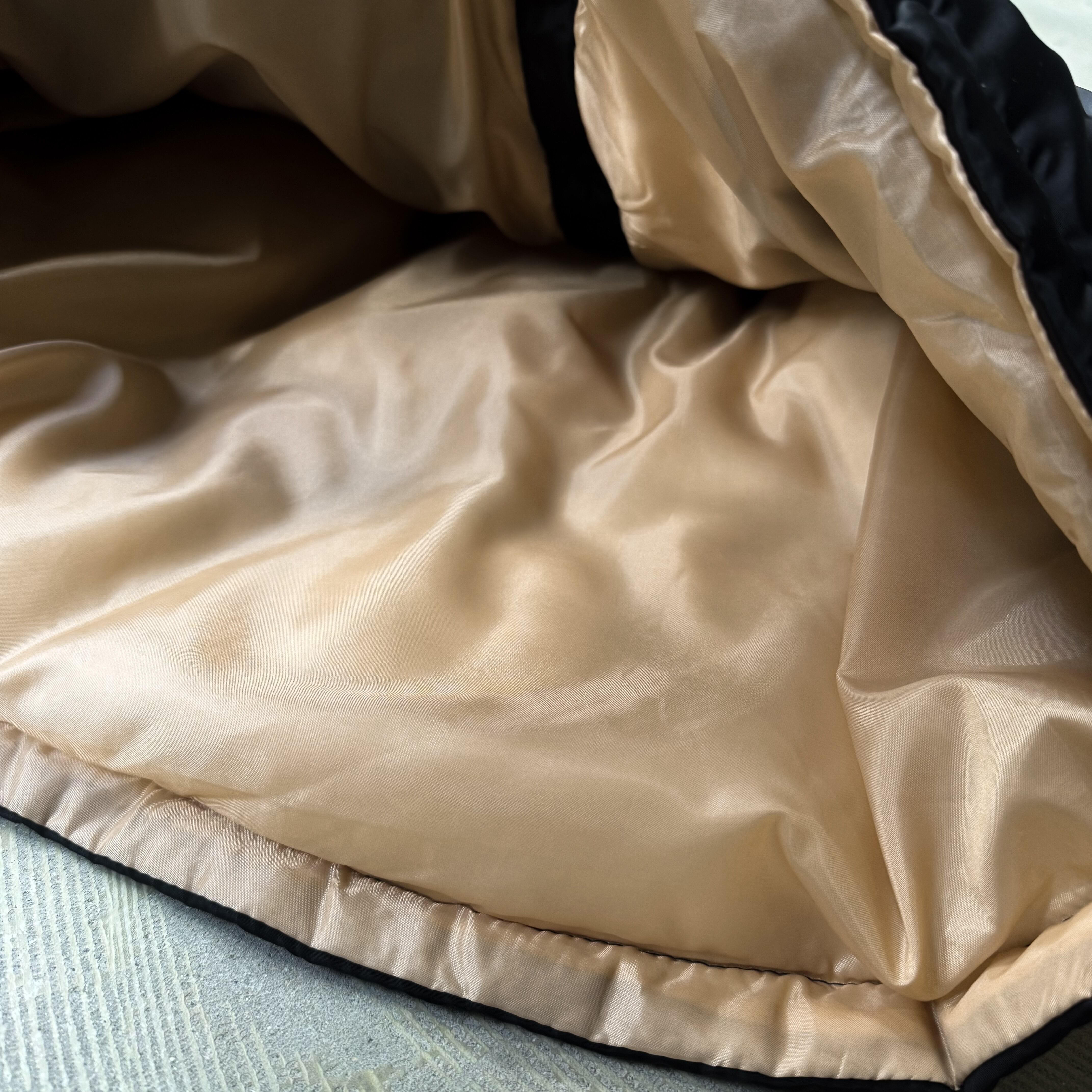 フードとベージュのライニングが覗き、モノトーンにニュアンスを添える配色設計。