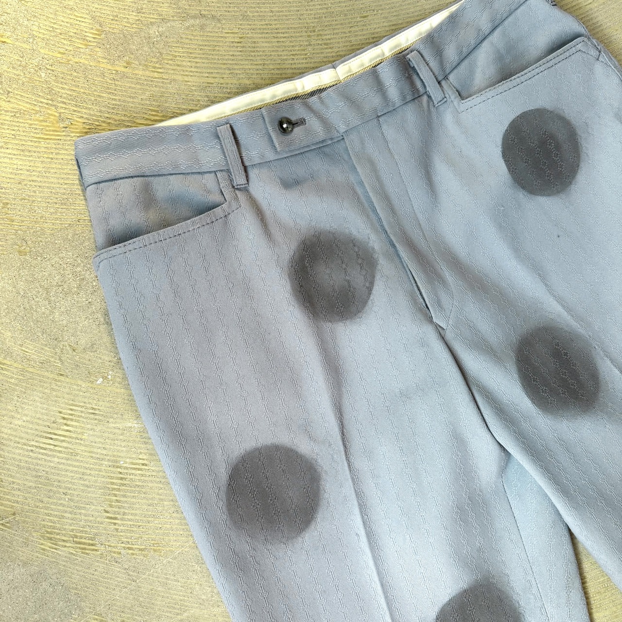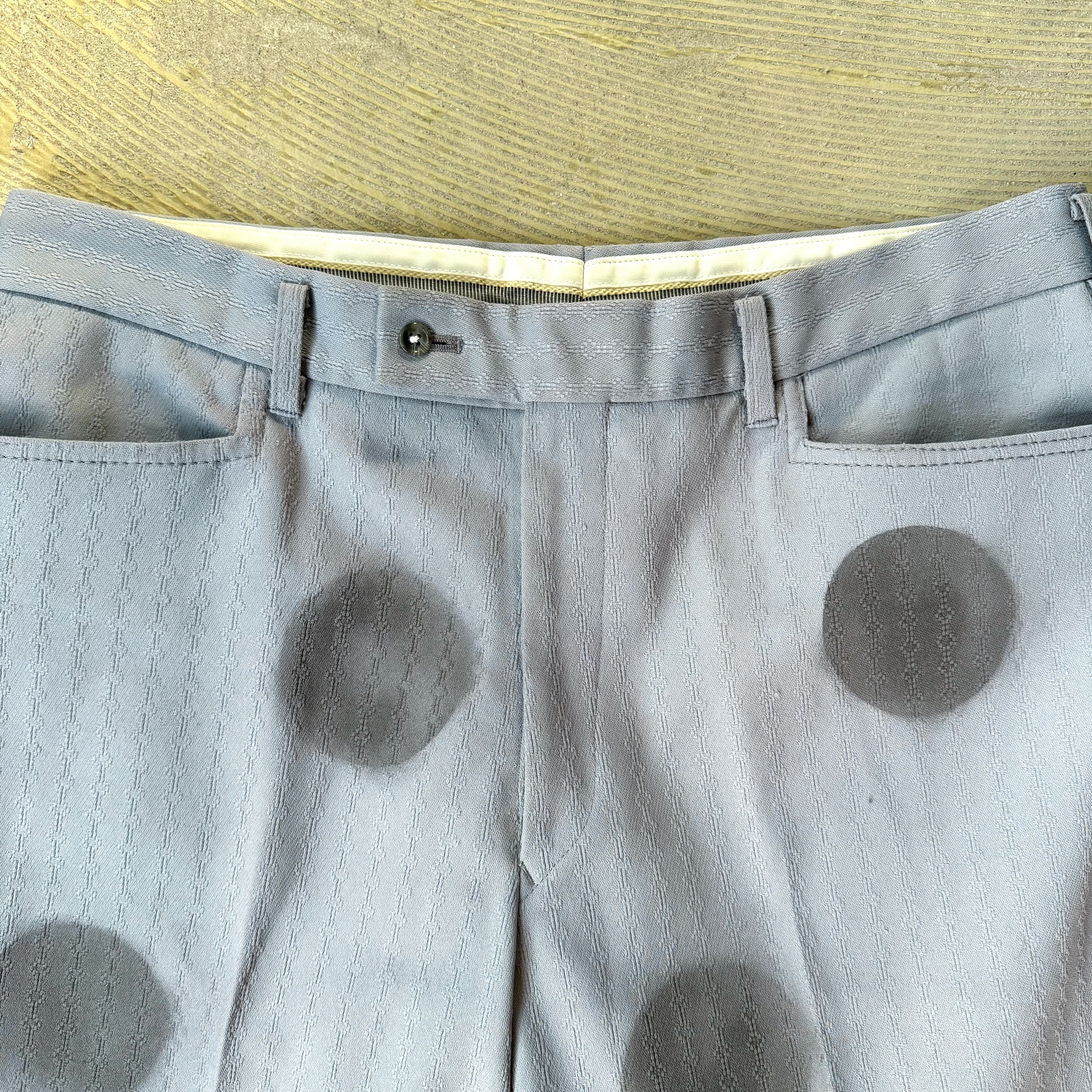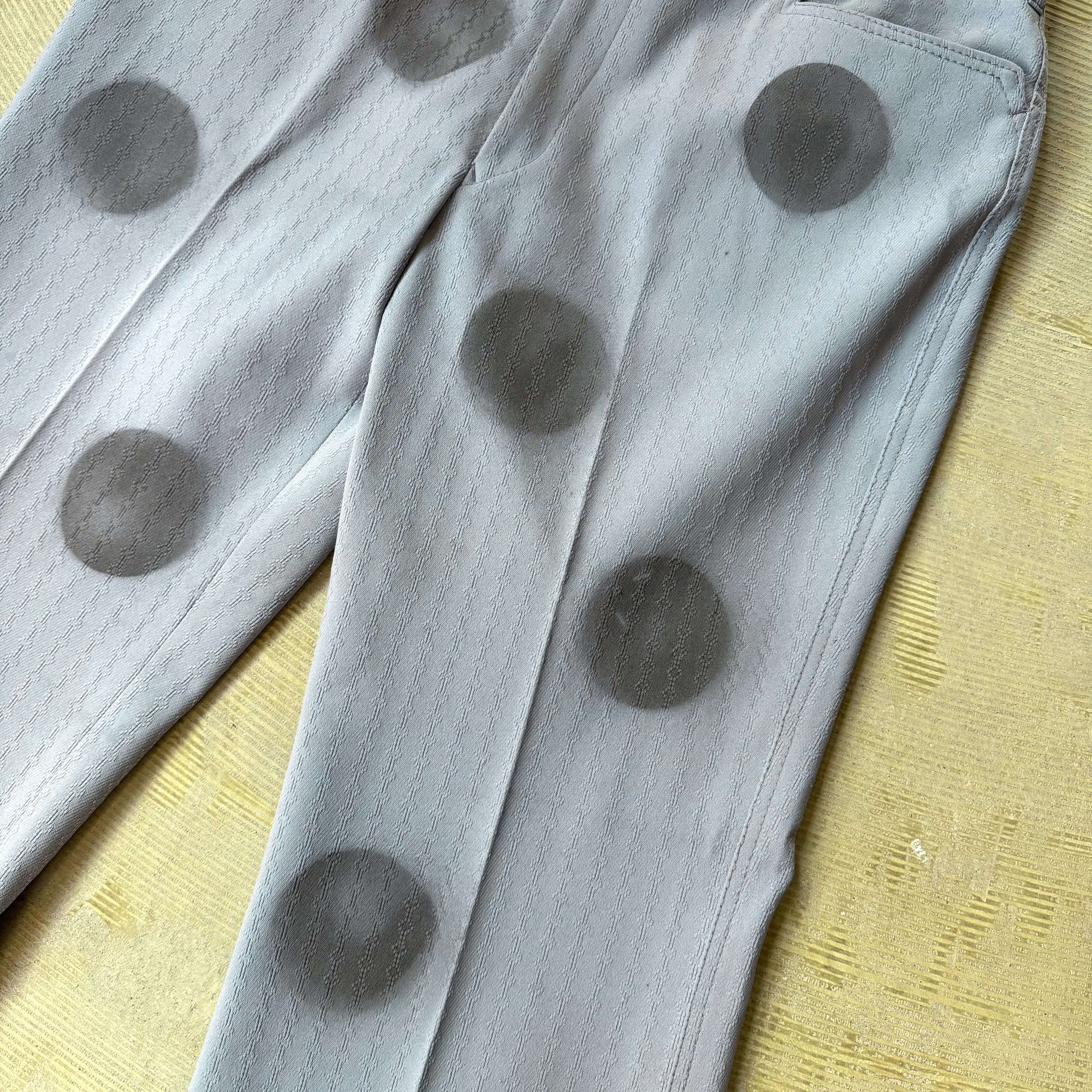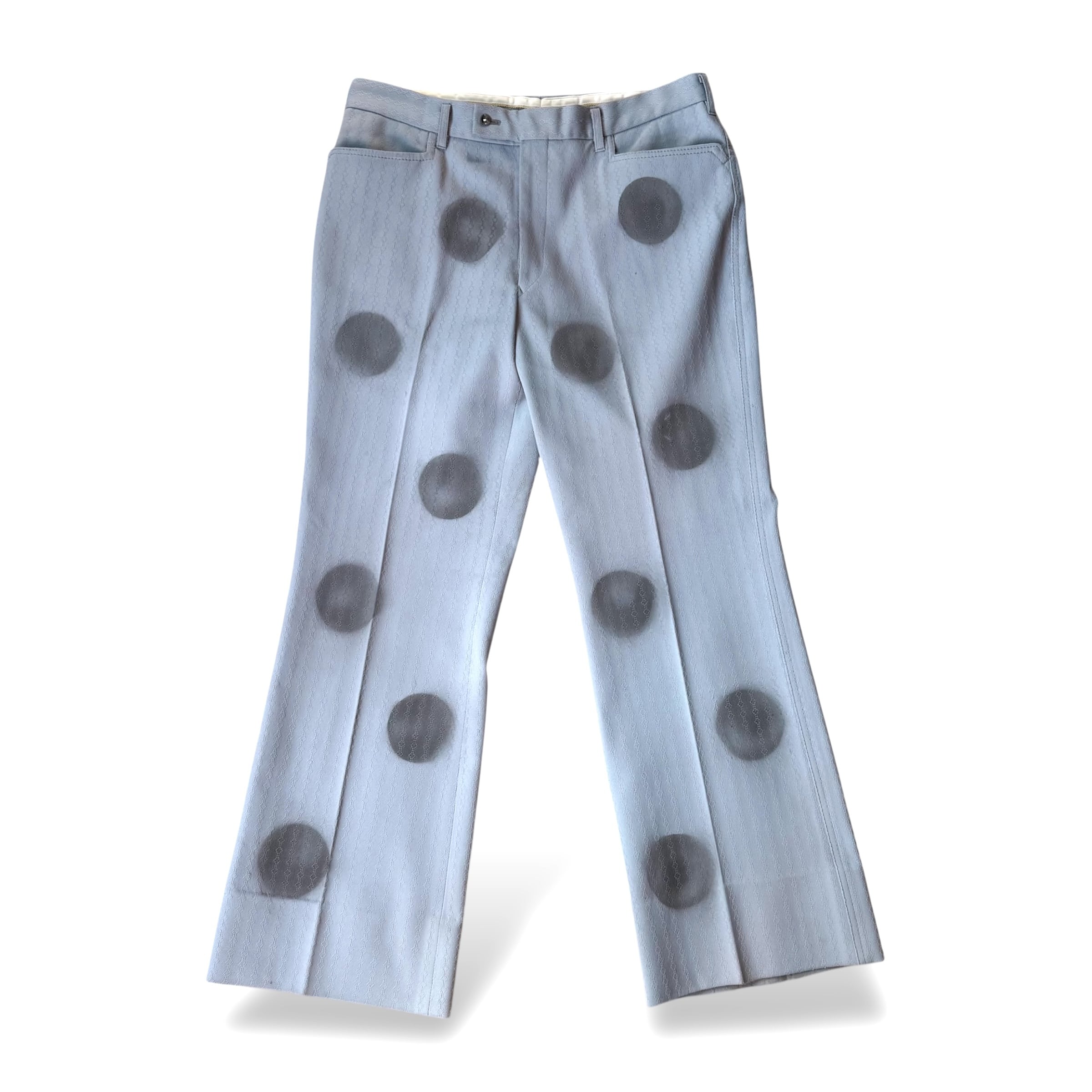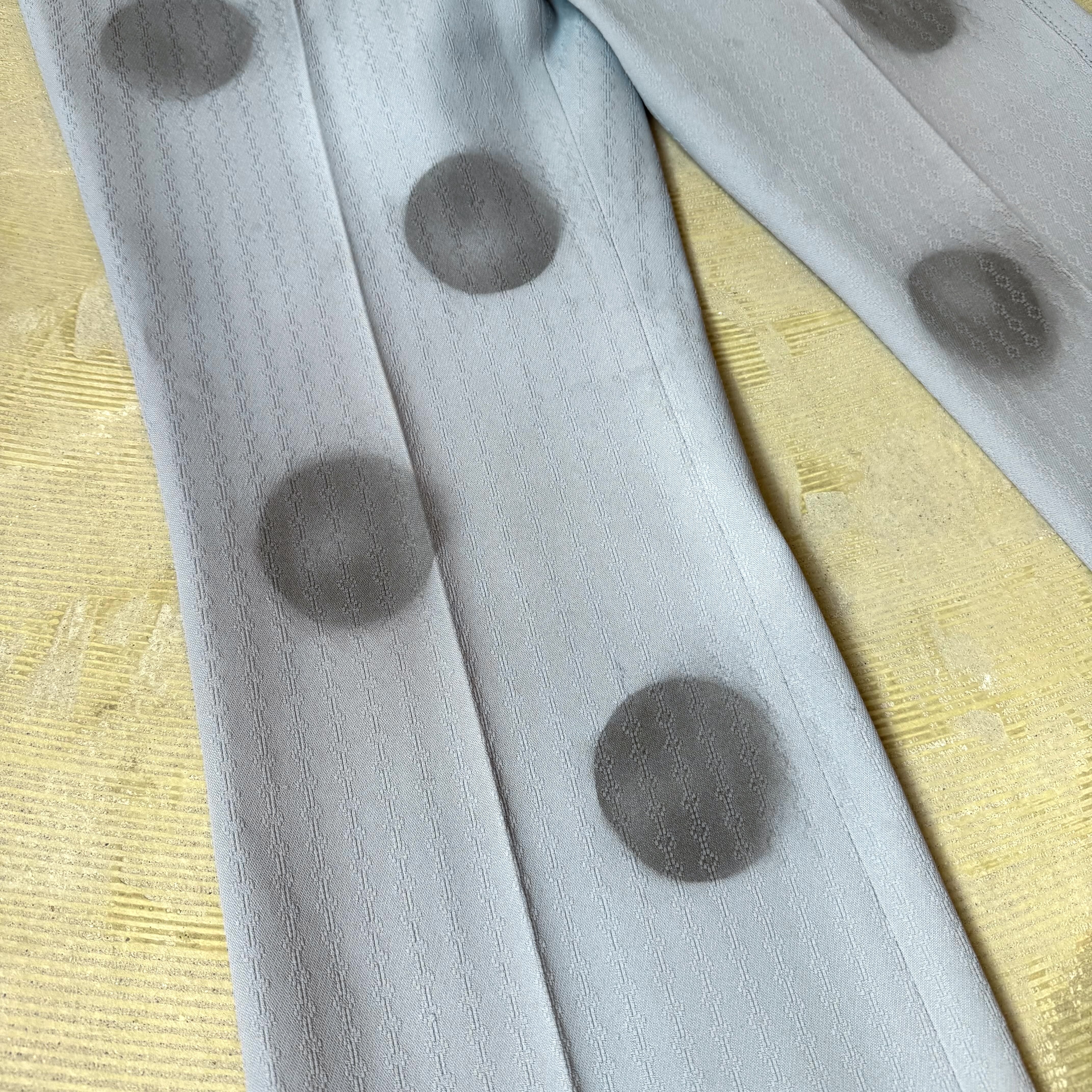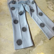 ライトブルーのスラックスに、ブラックの円が縦に並ぶステンシルプリント。