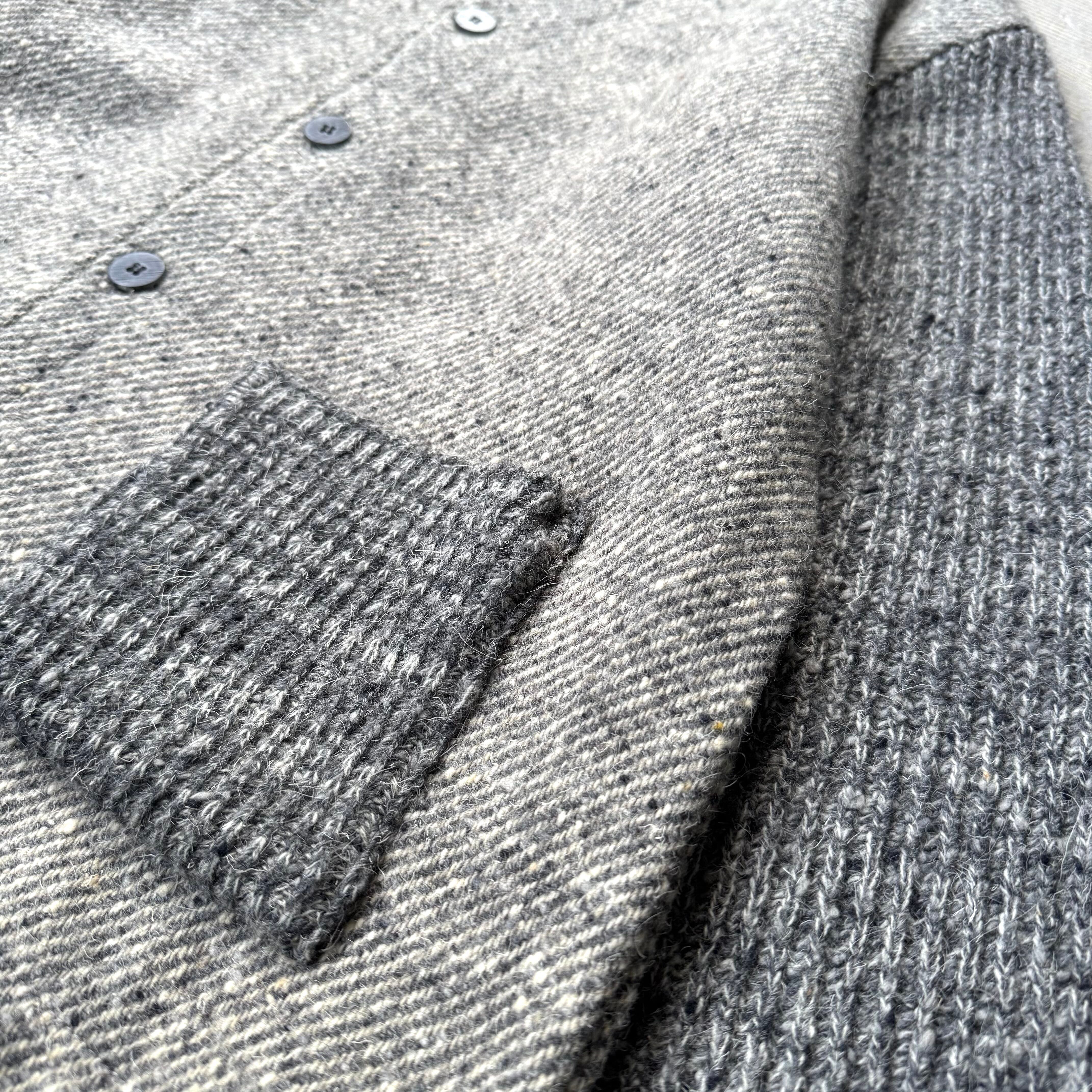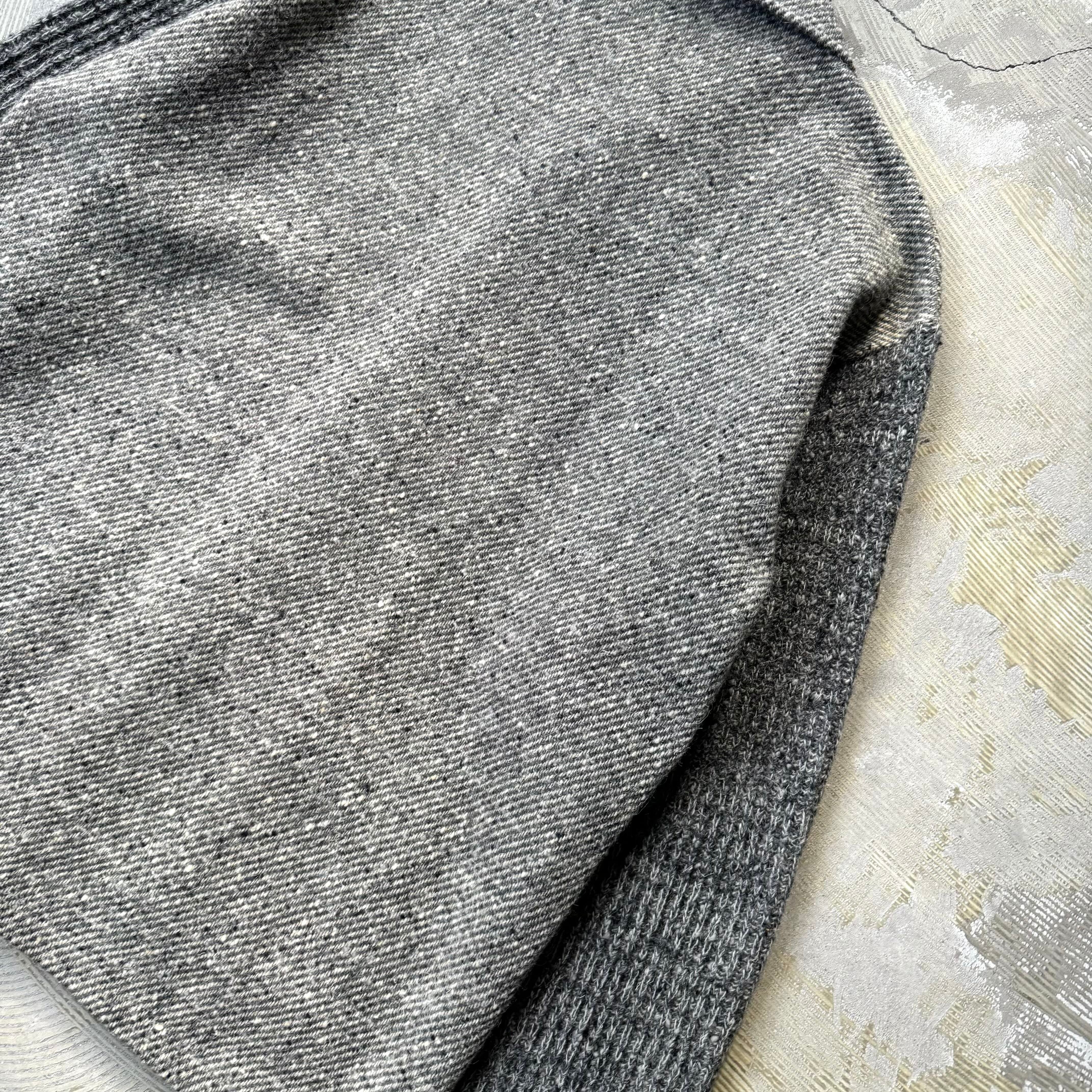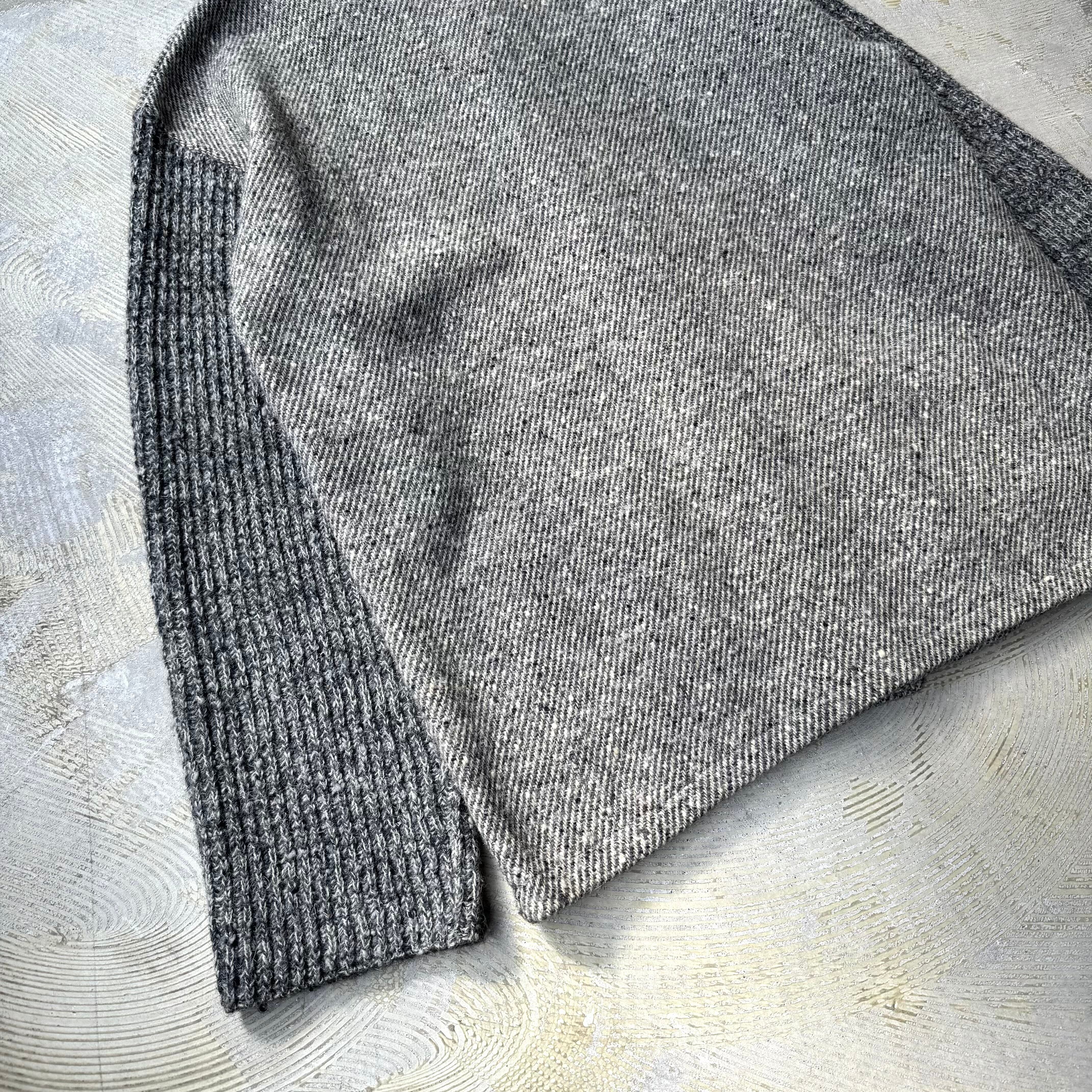 杢調グレーのウールボディに、袖とポケットはリブ編みのダークグレーで切り替えて