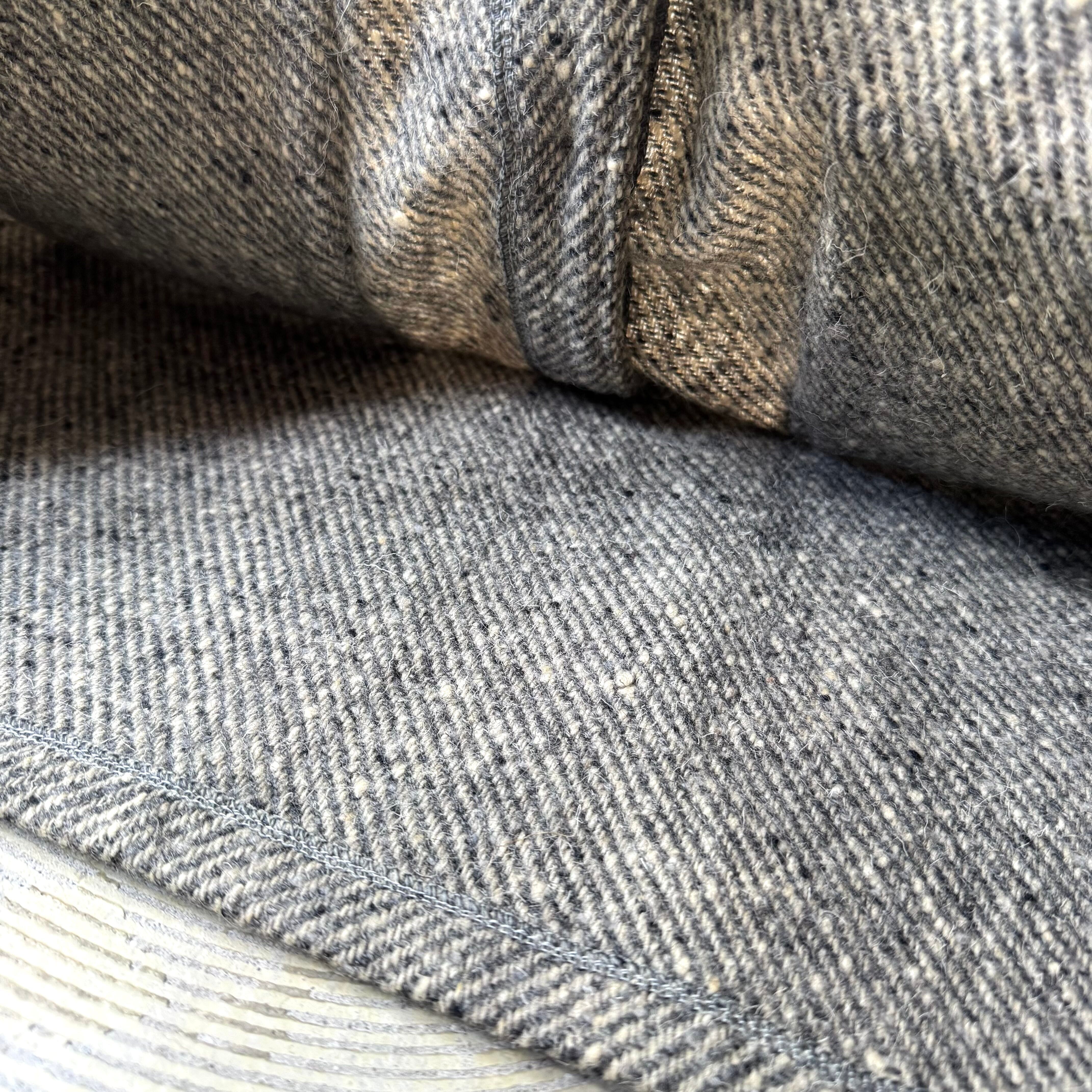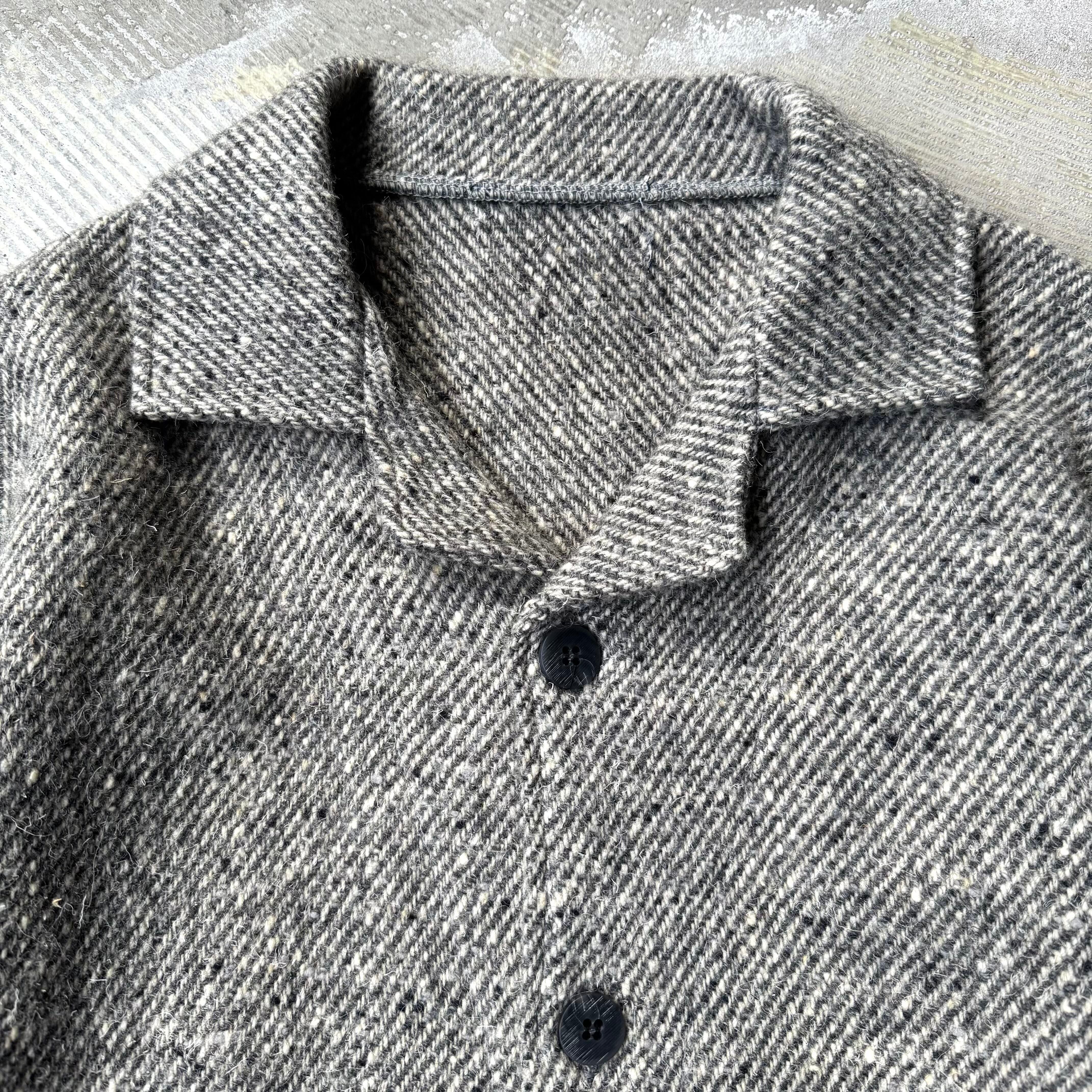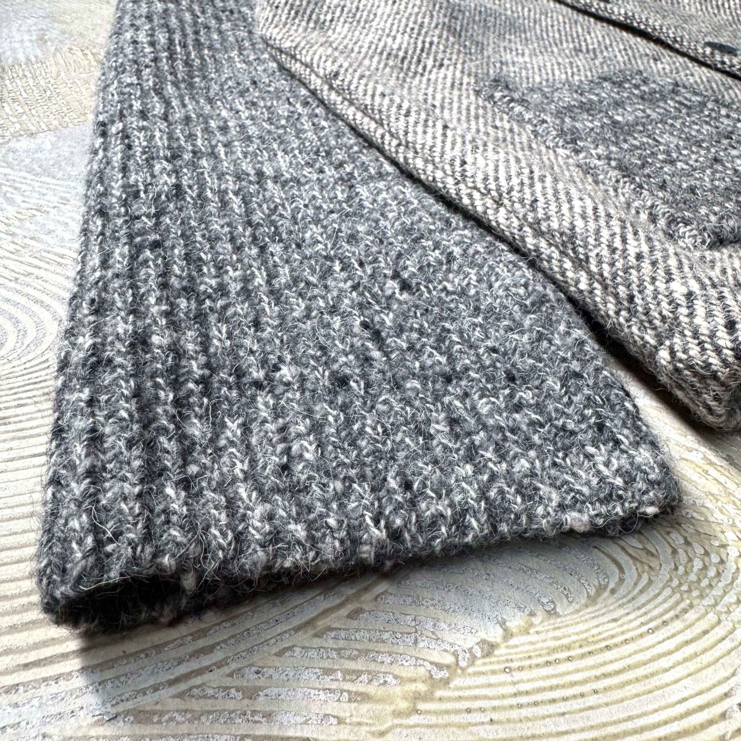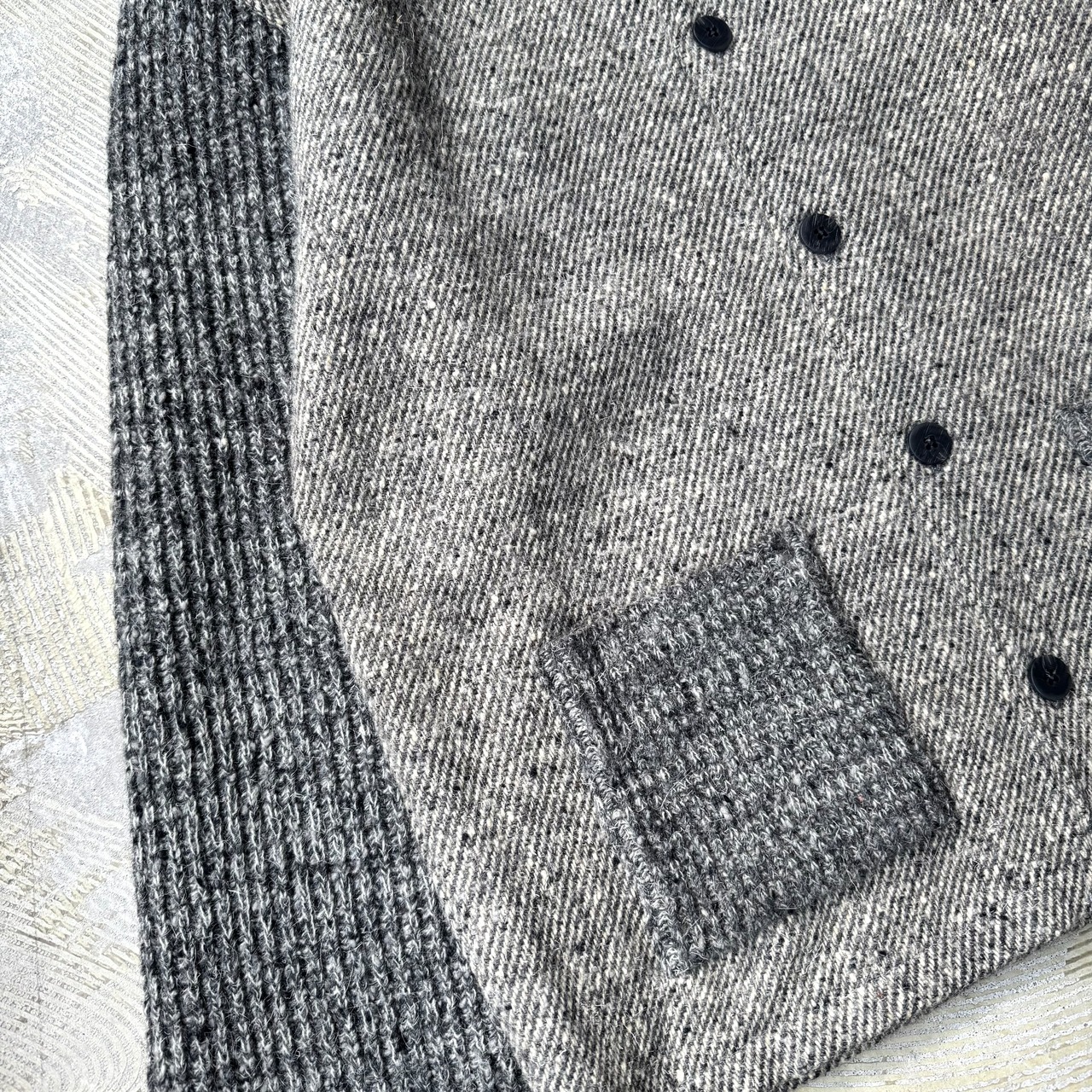 杢調グレーのウールボディに、袖とポケットはリブ編みのダークグレーで切り替えて