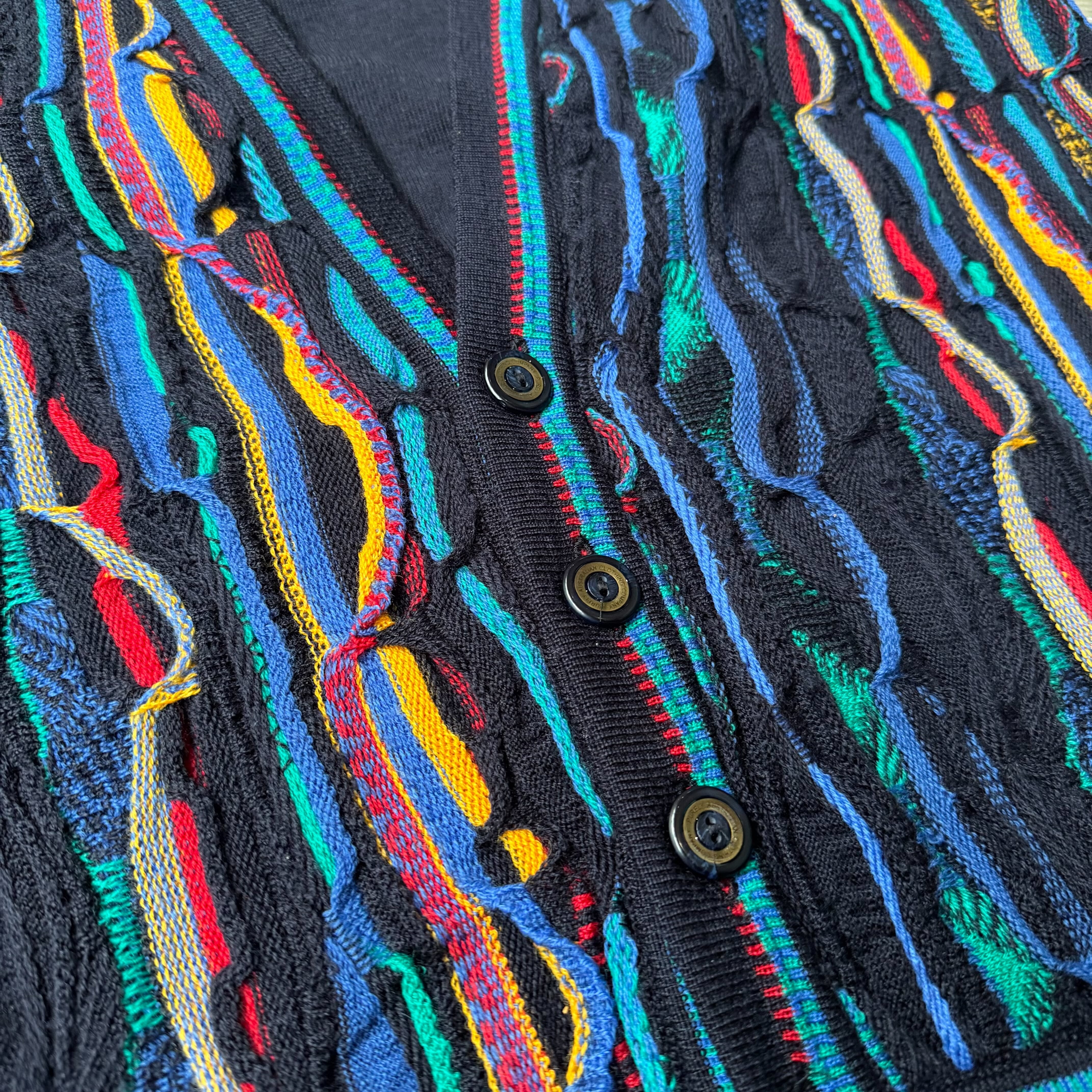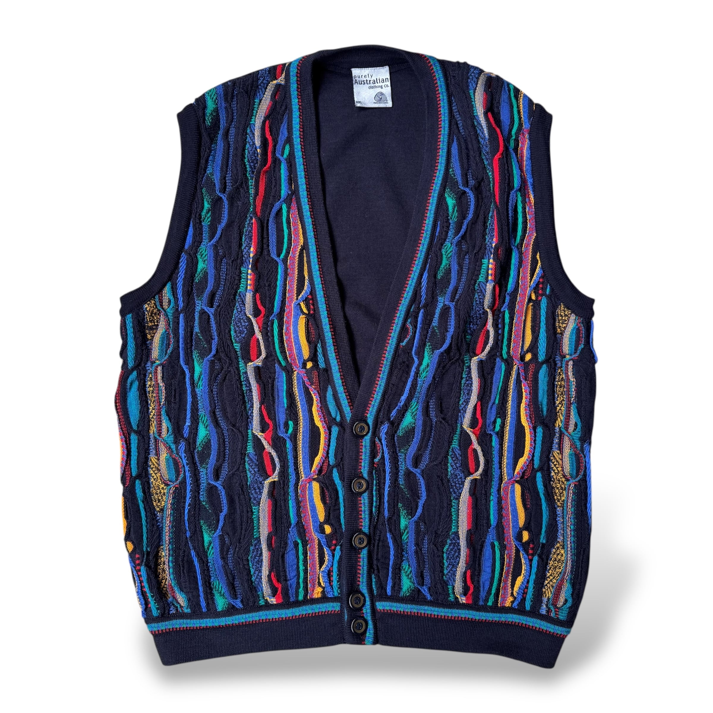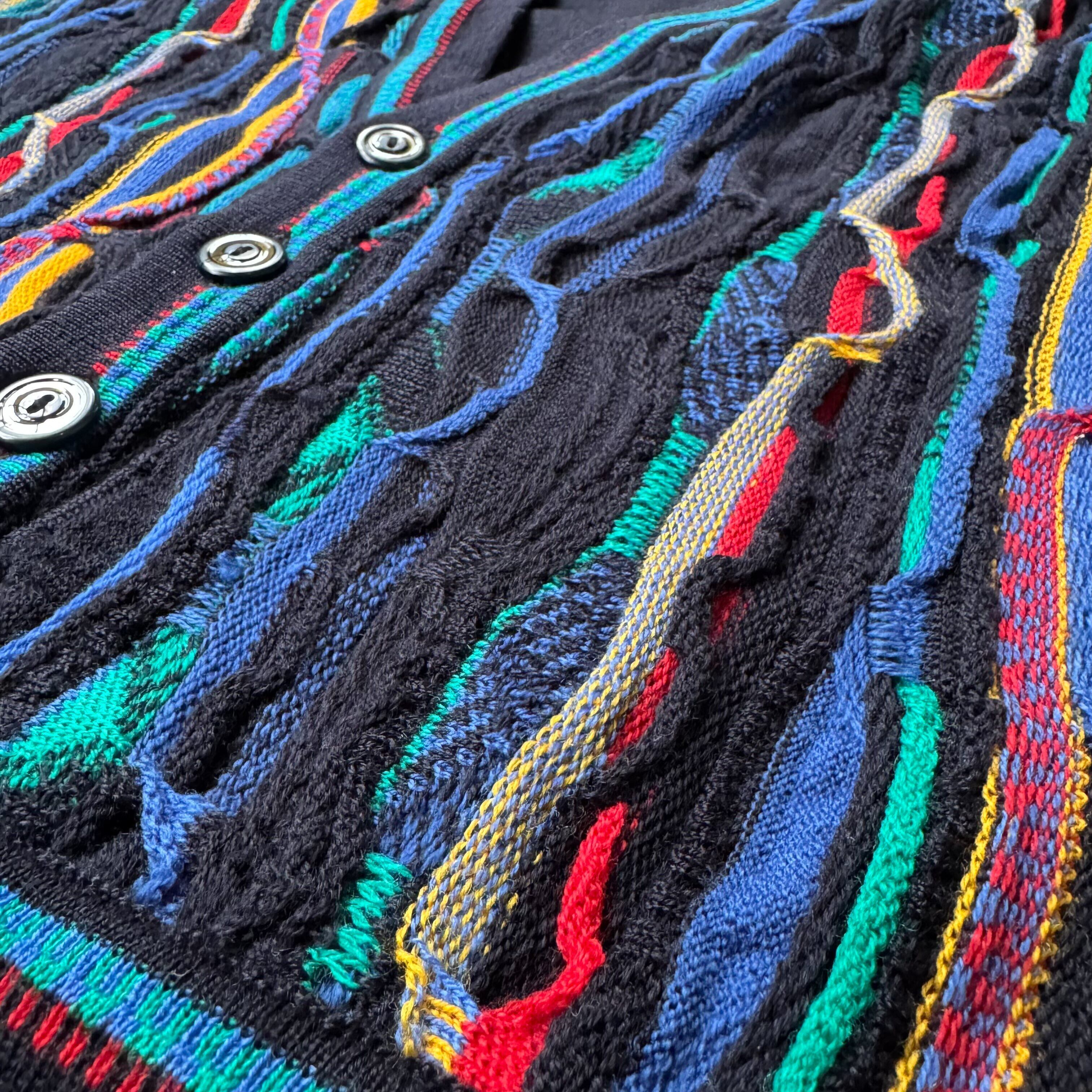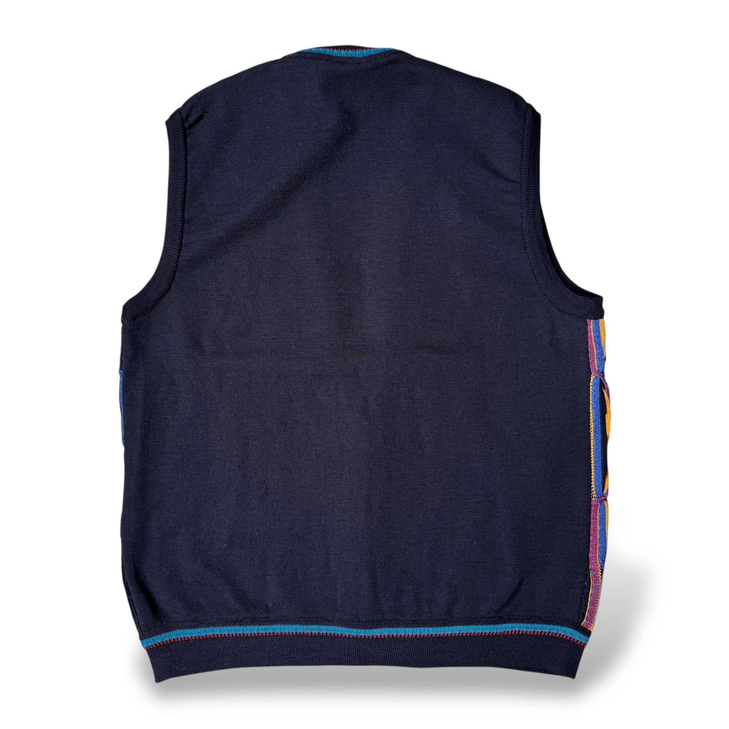 多色の糸が立体的にうねり、縦方向に流れる“3D編み”が存在感を放つヴィンテージベスト。