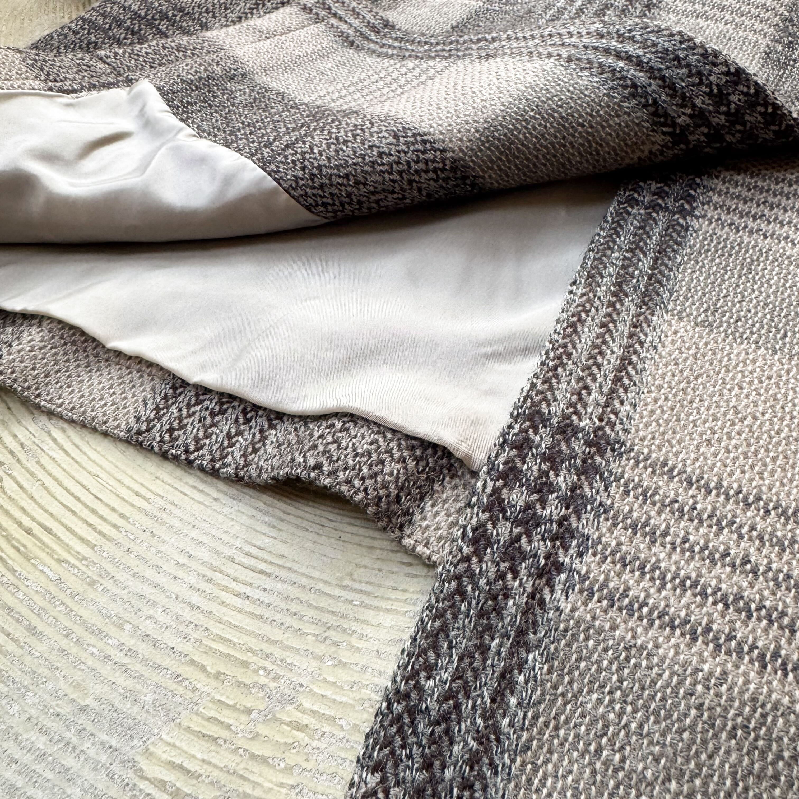 ラペル、ポケット、袖口に配された切り替えが、伝統にノイズを加え