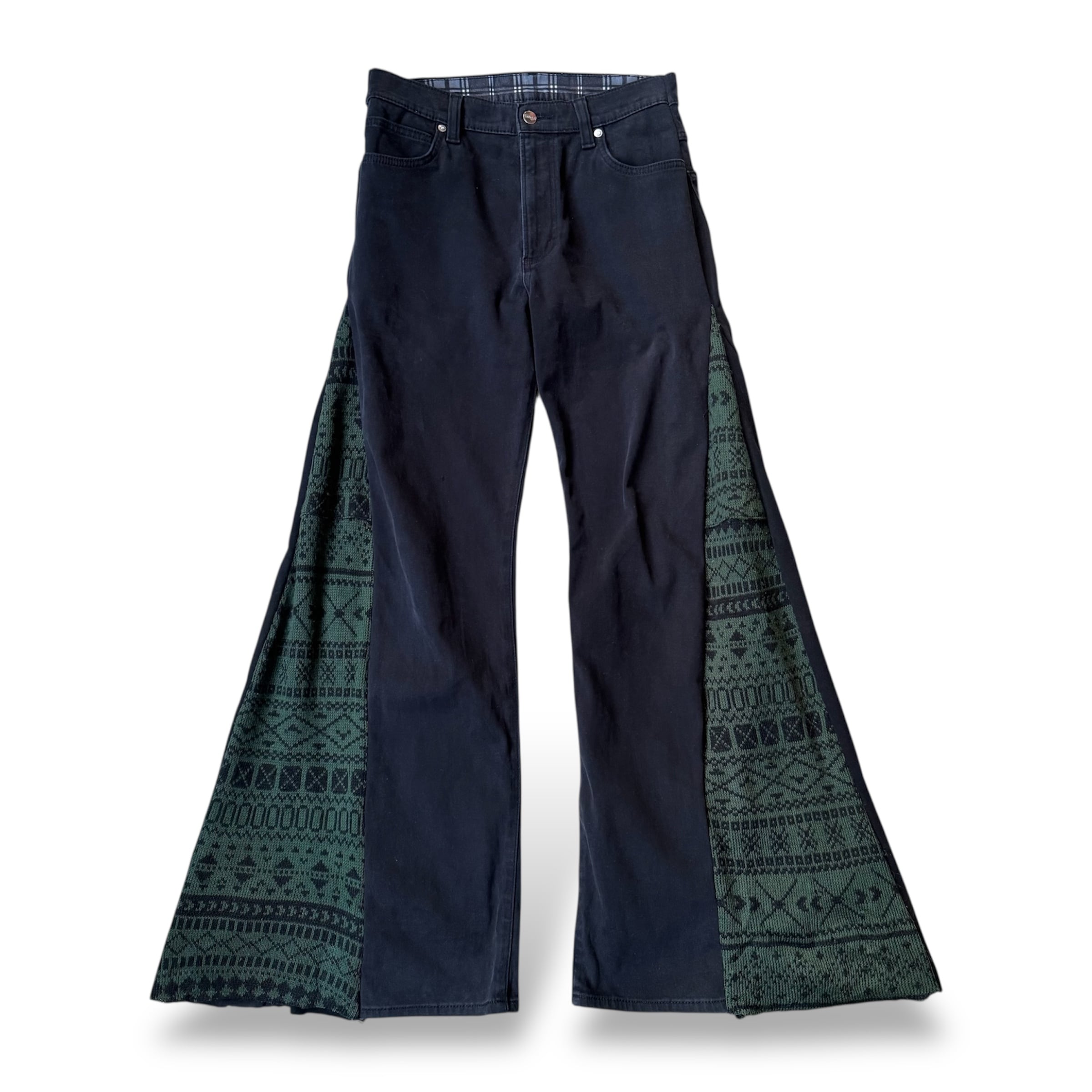 ・ブラックデニムのベルボトム構成に、両脚サイドへ縦に走る