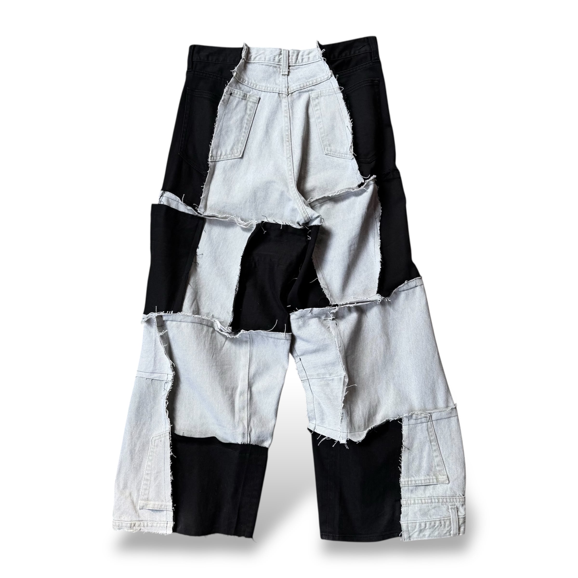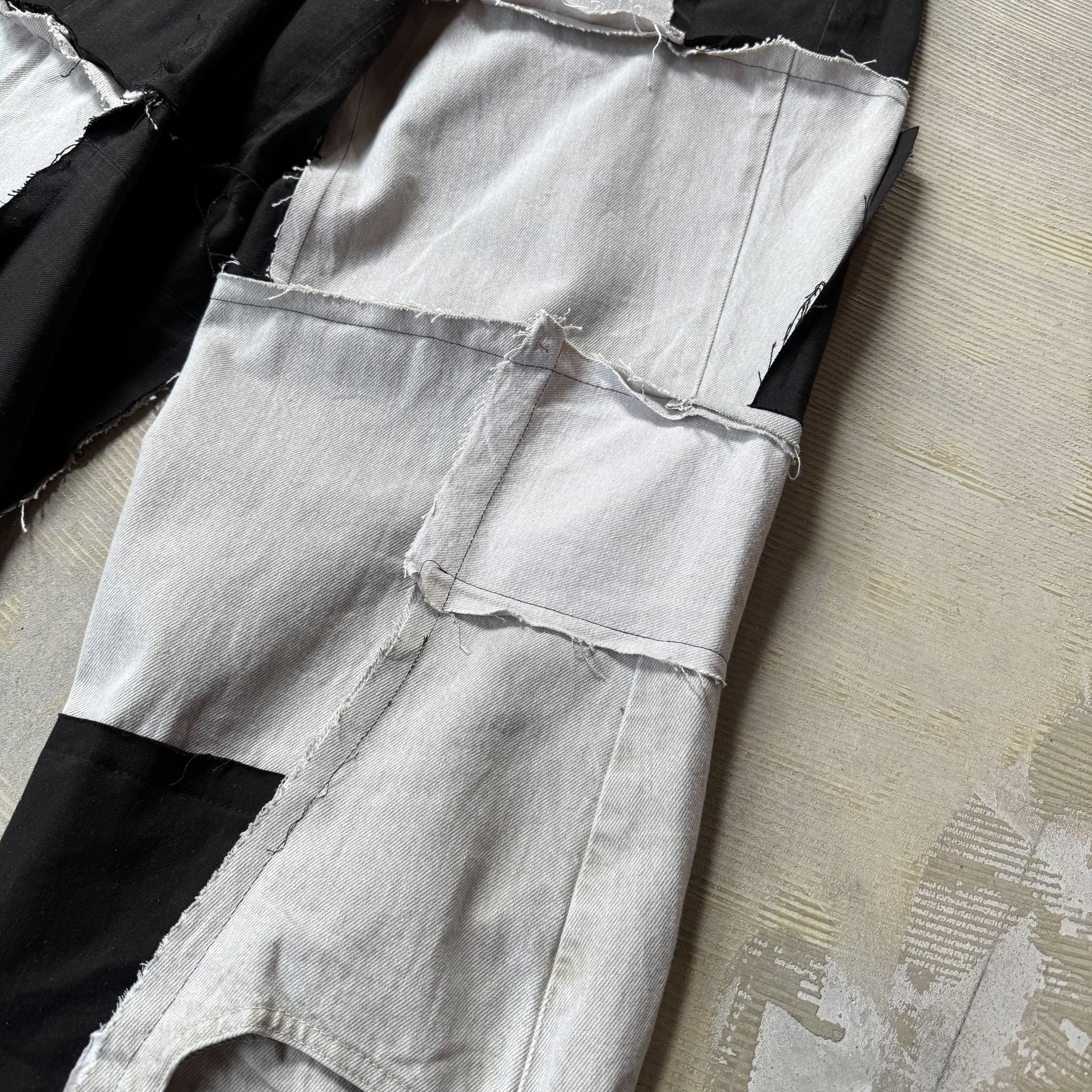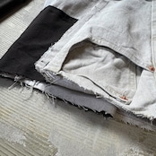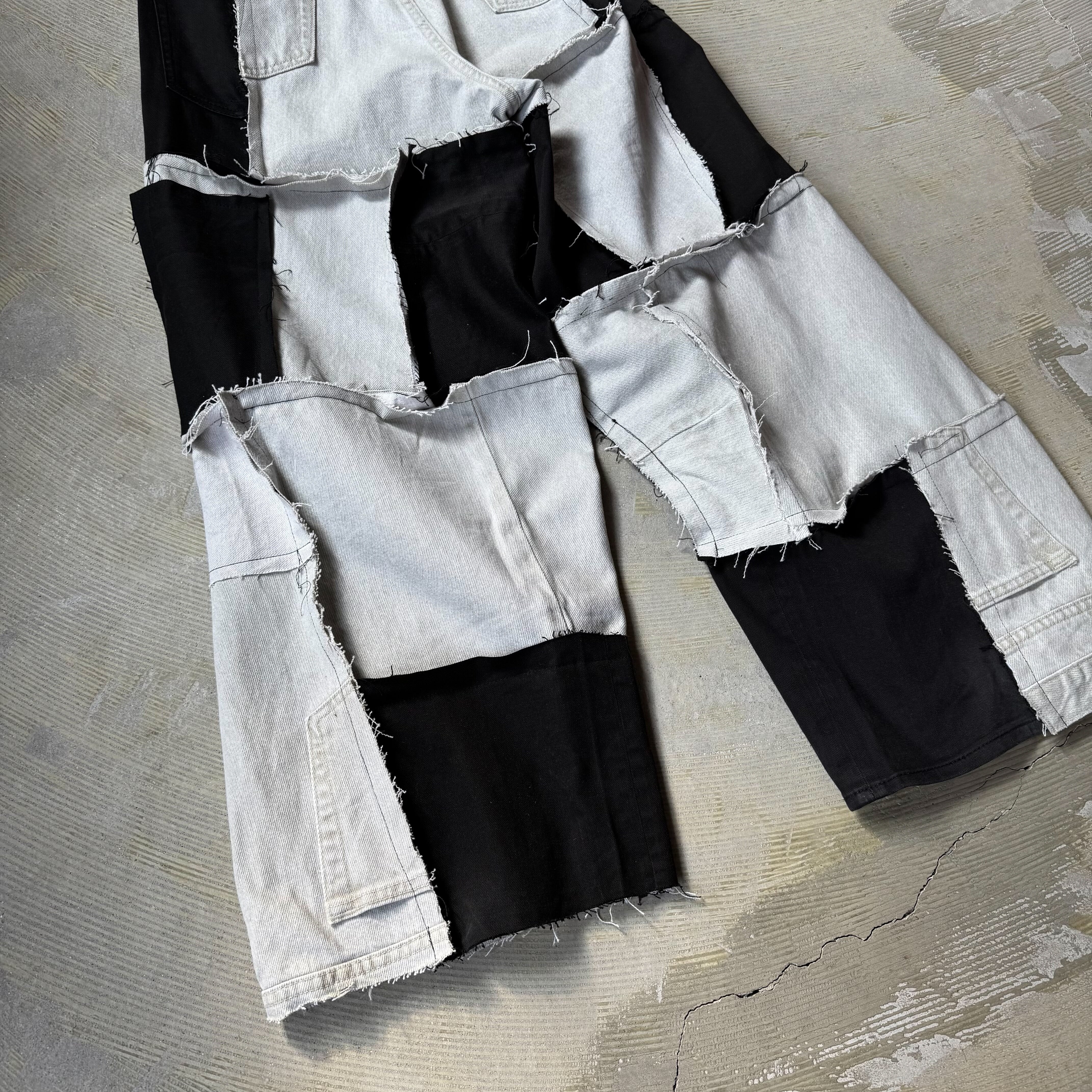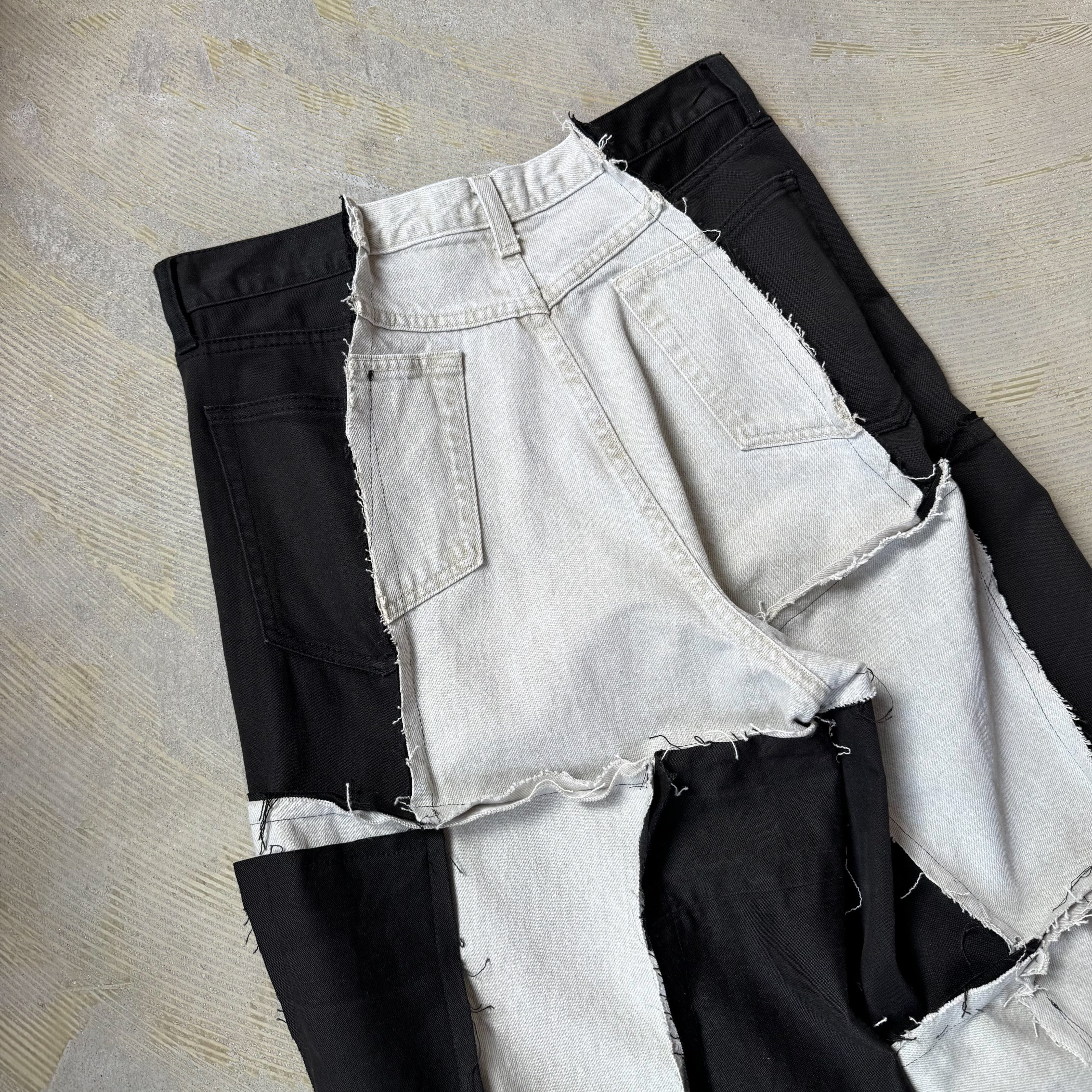 ・ブラックとホワイトグレーの濃淡の異なるデニムを、矩形で切り出し、縫い合わせ