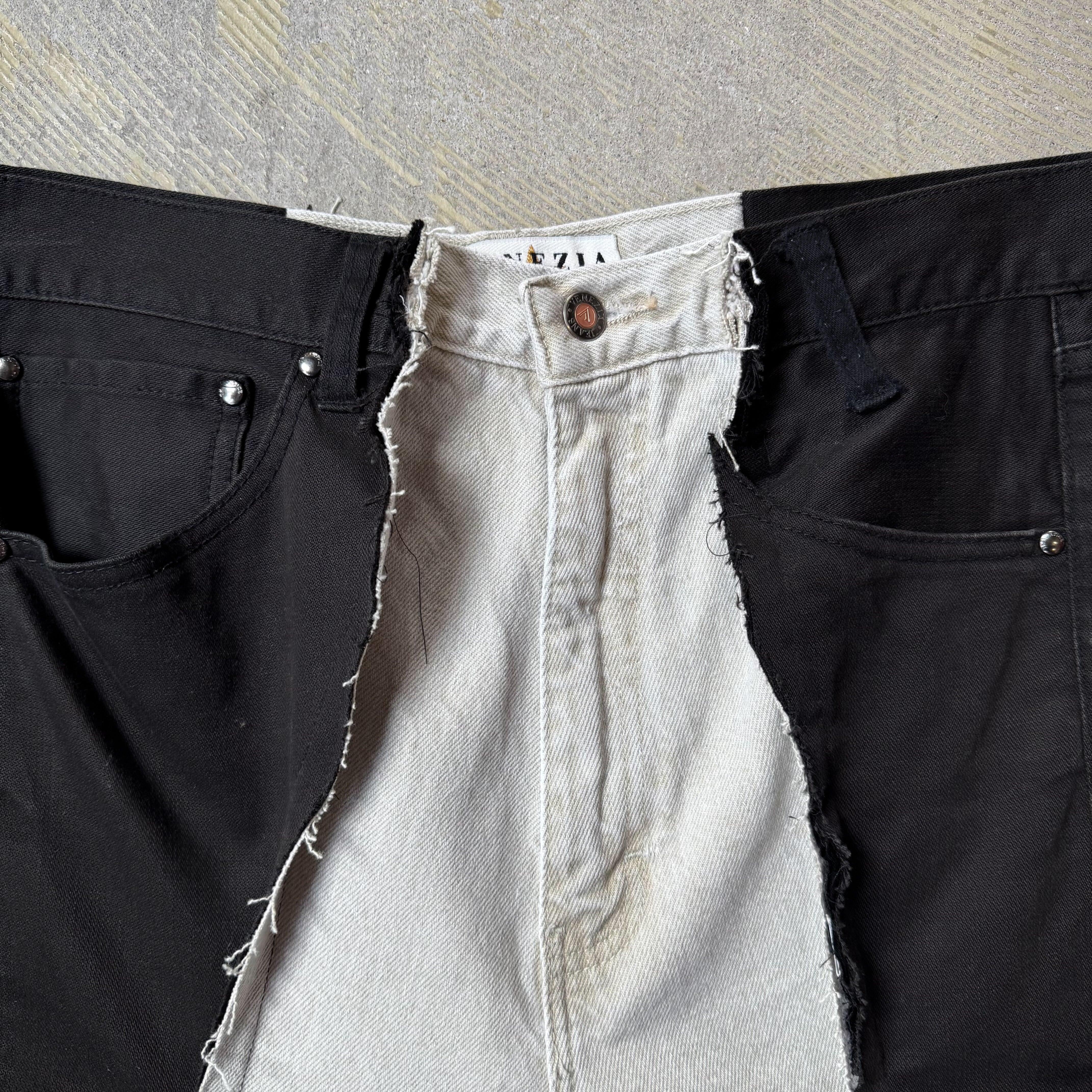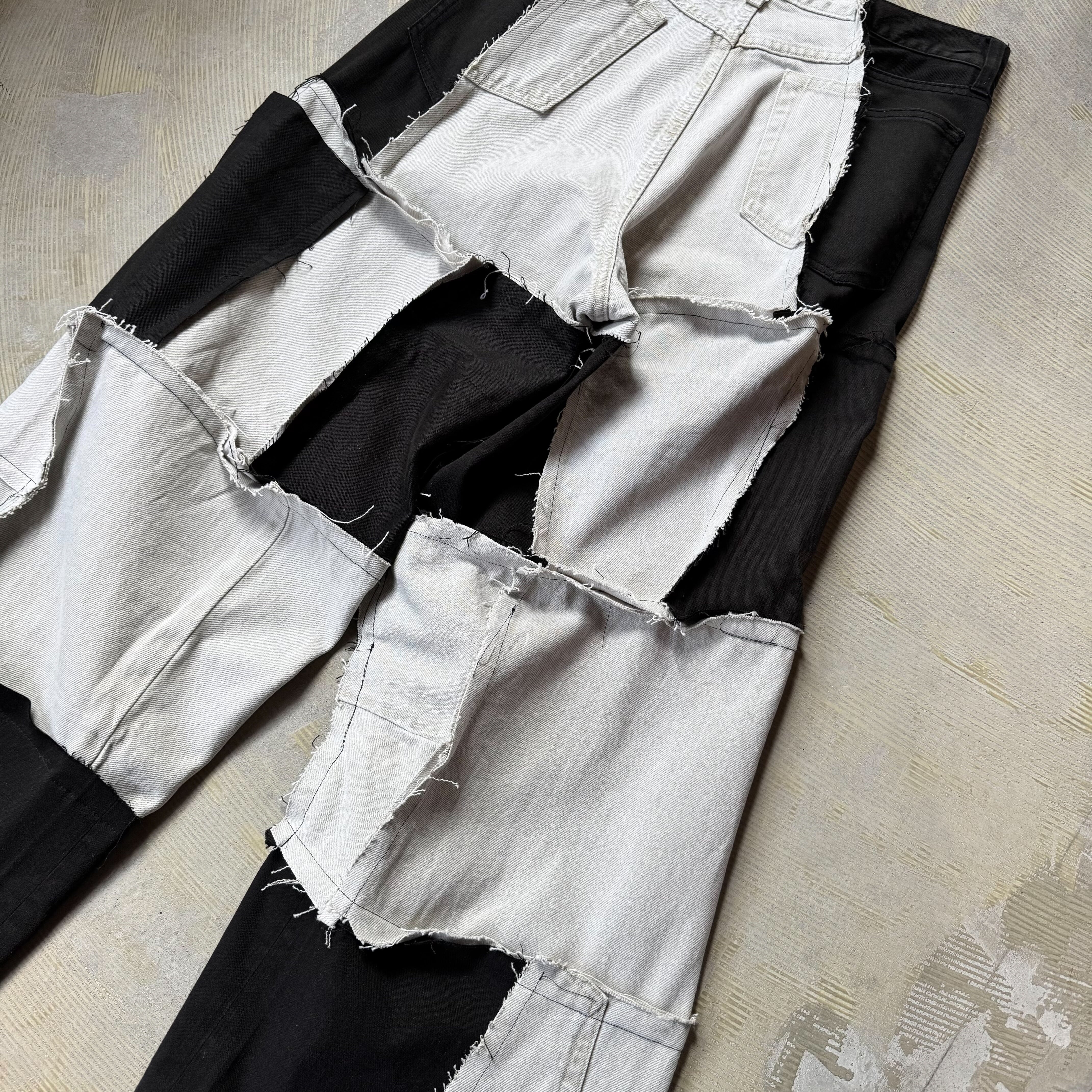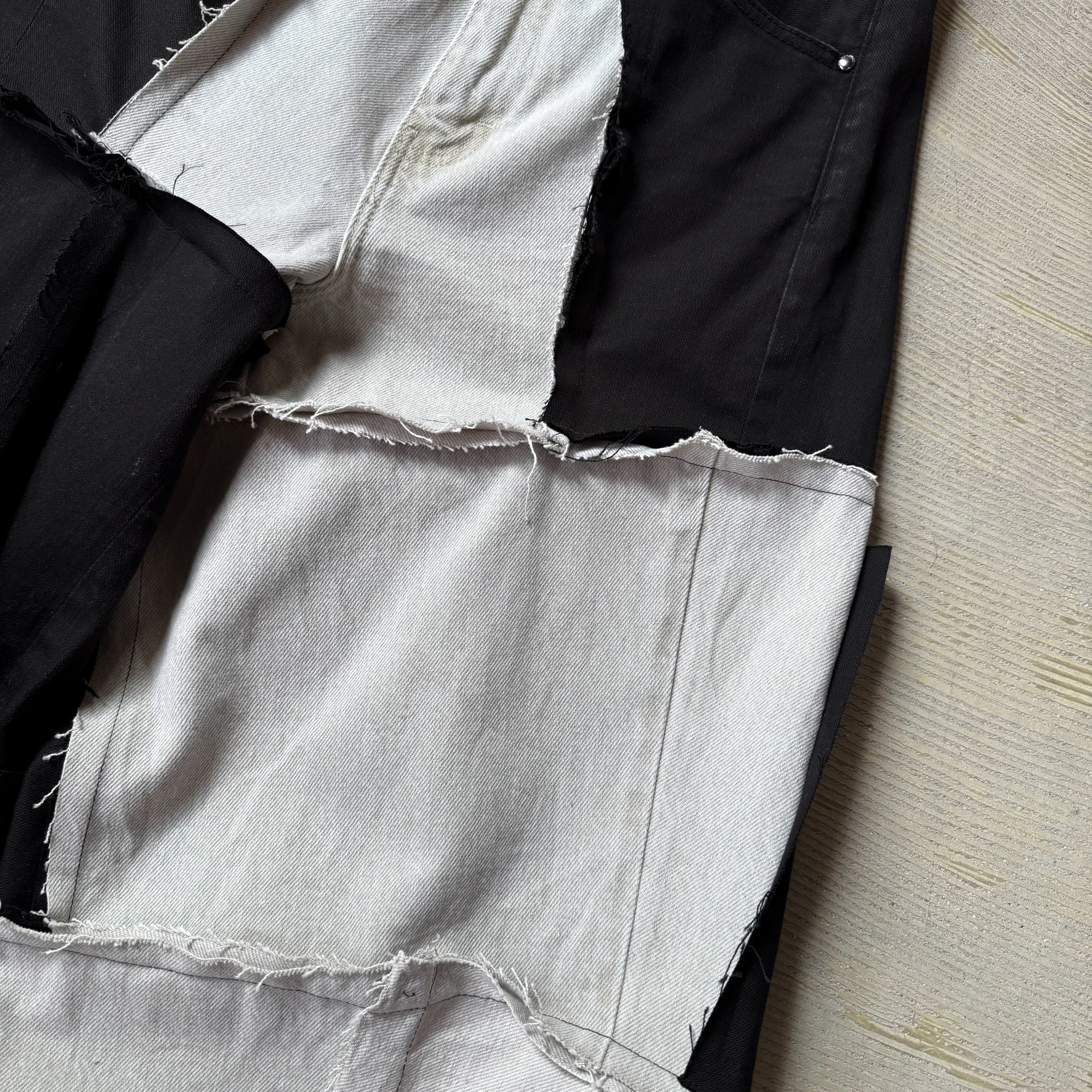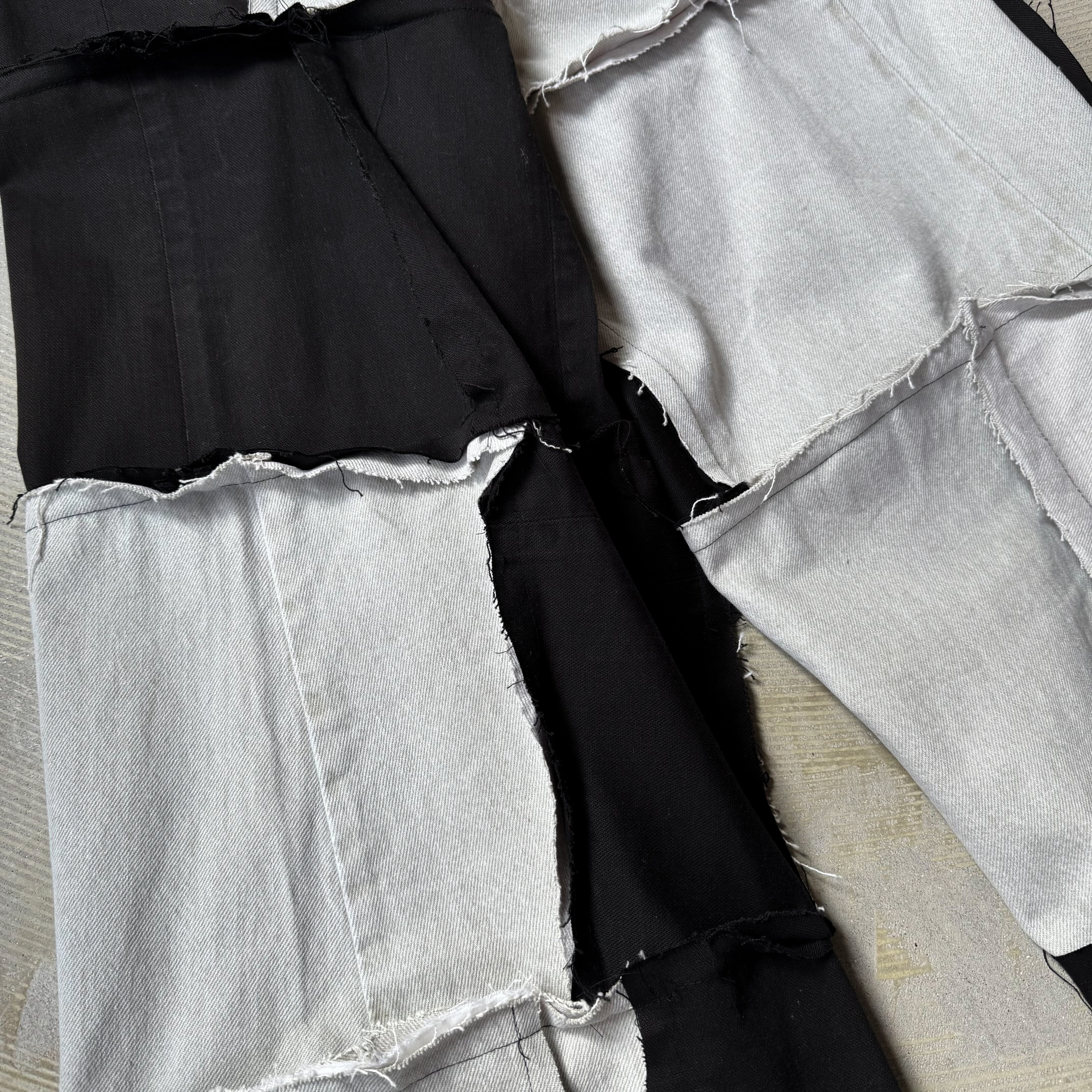 ・ブラックとホワイトグレーの濃淡の異なるデニムを、矩形で切り出し、縫い合わせ