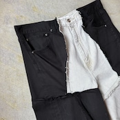 縫製はあえてラフに、断ち切りのような縫い目とほつれが、構造の“未完成”を演出するパンツ。