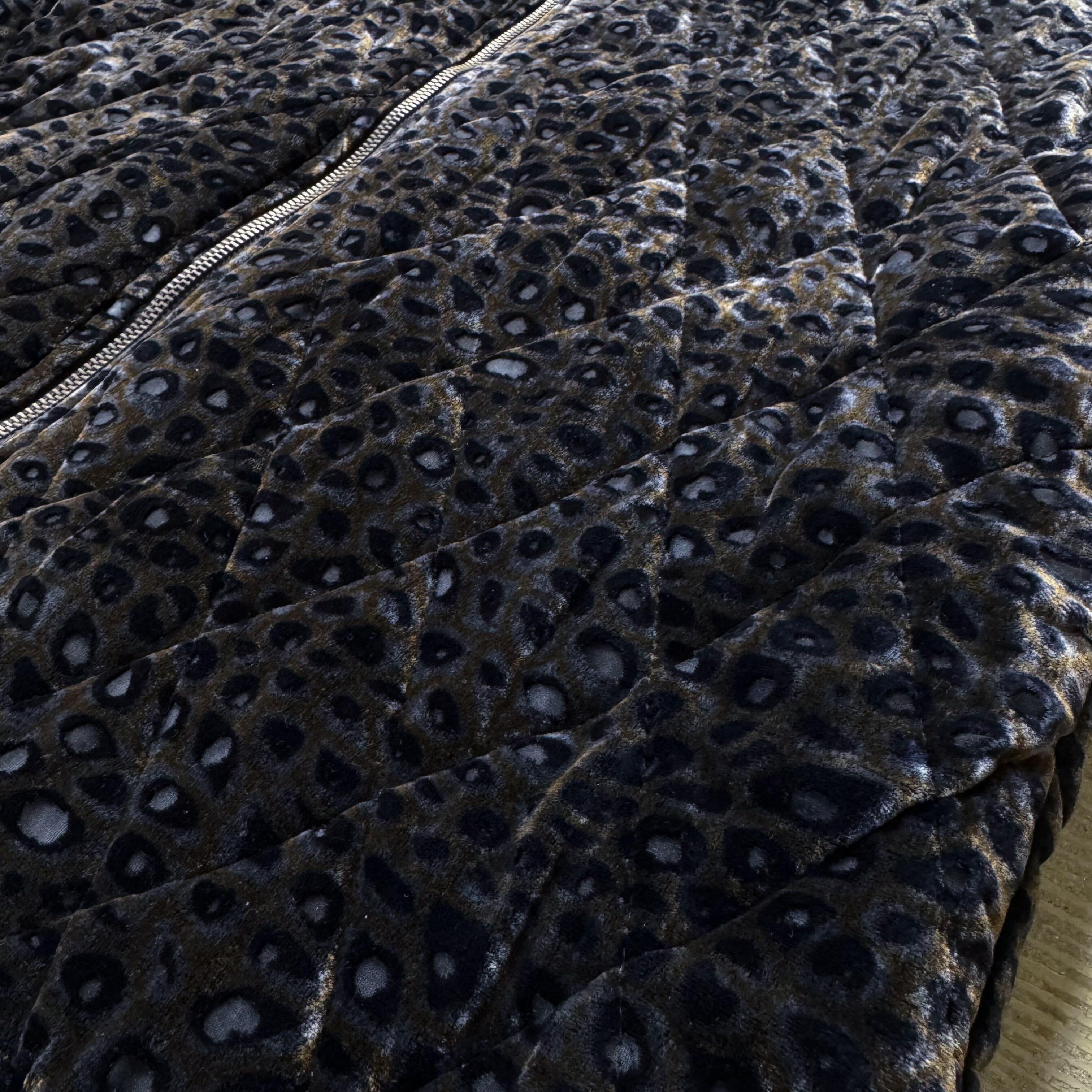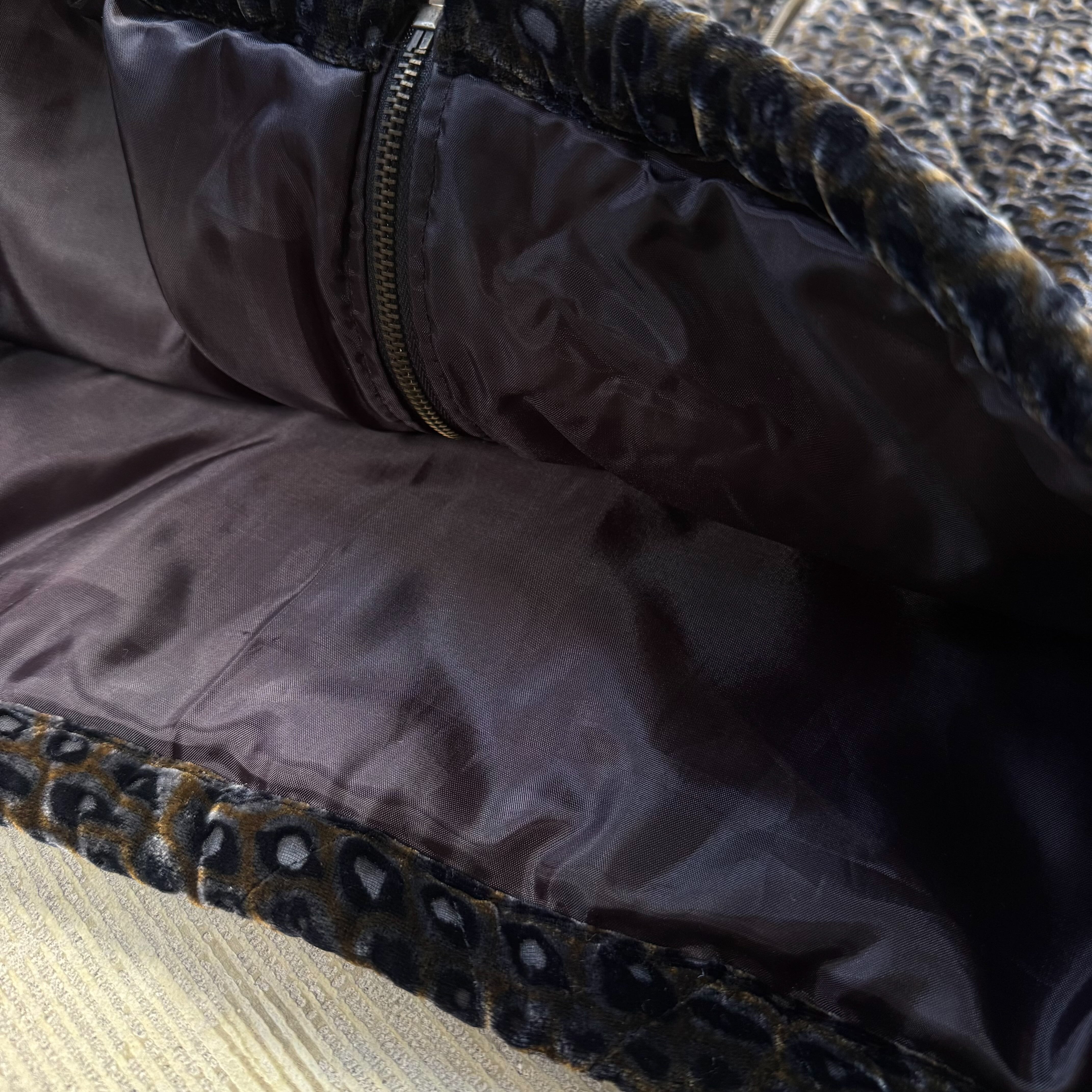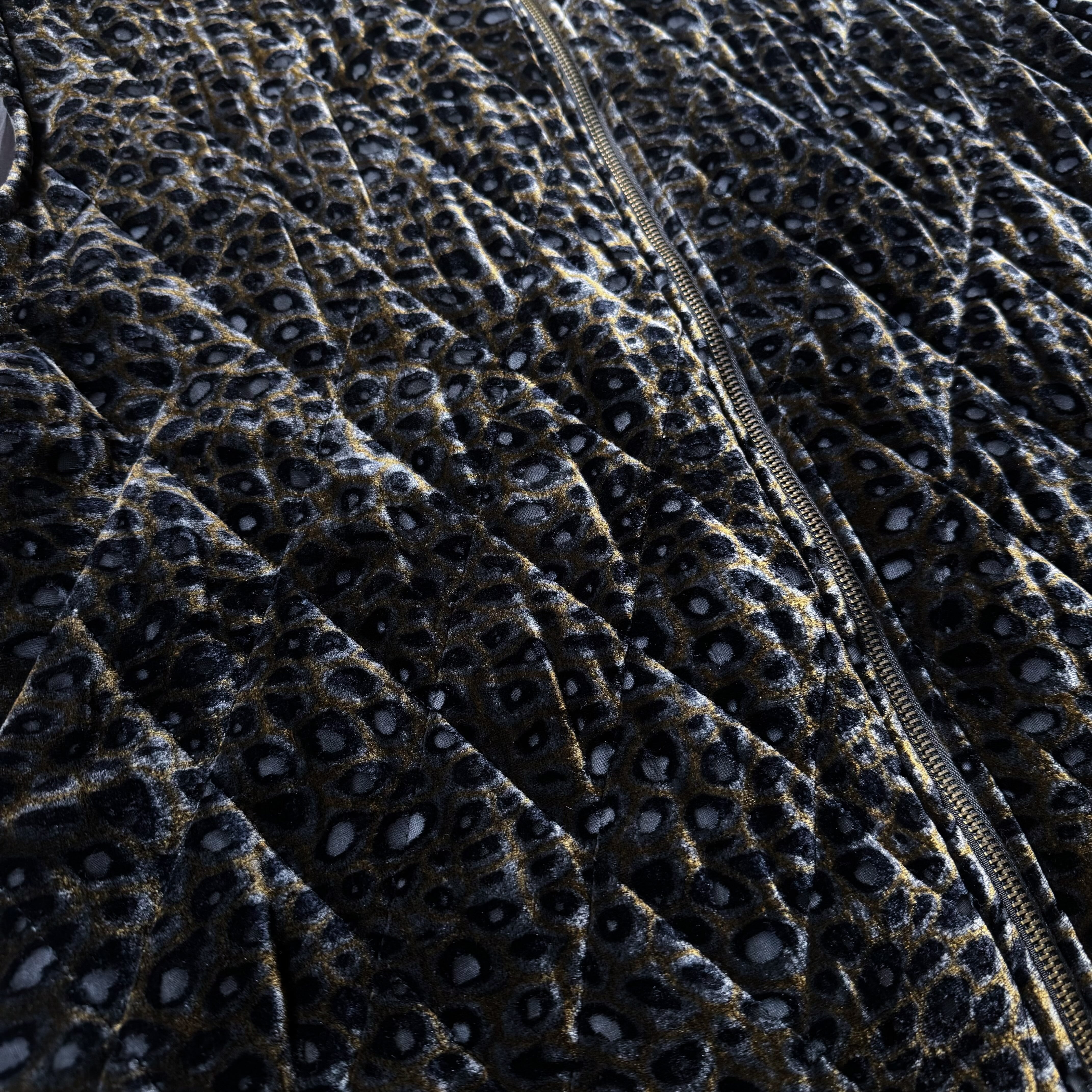 ・ブラウンベースに浮かぶレオパード柄が光の角度で表情を変える、ベロア調の艶と凹凸と