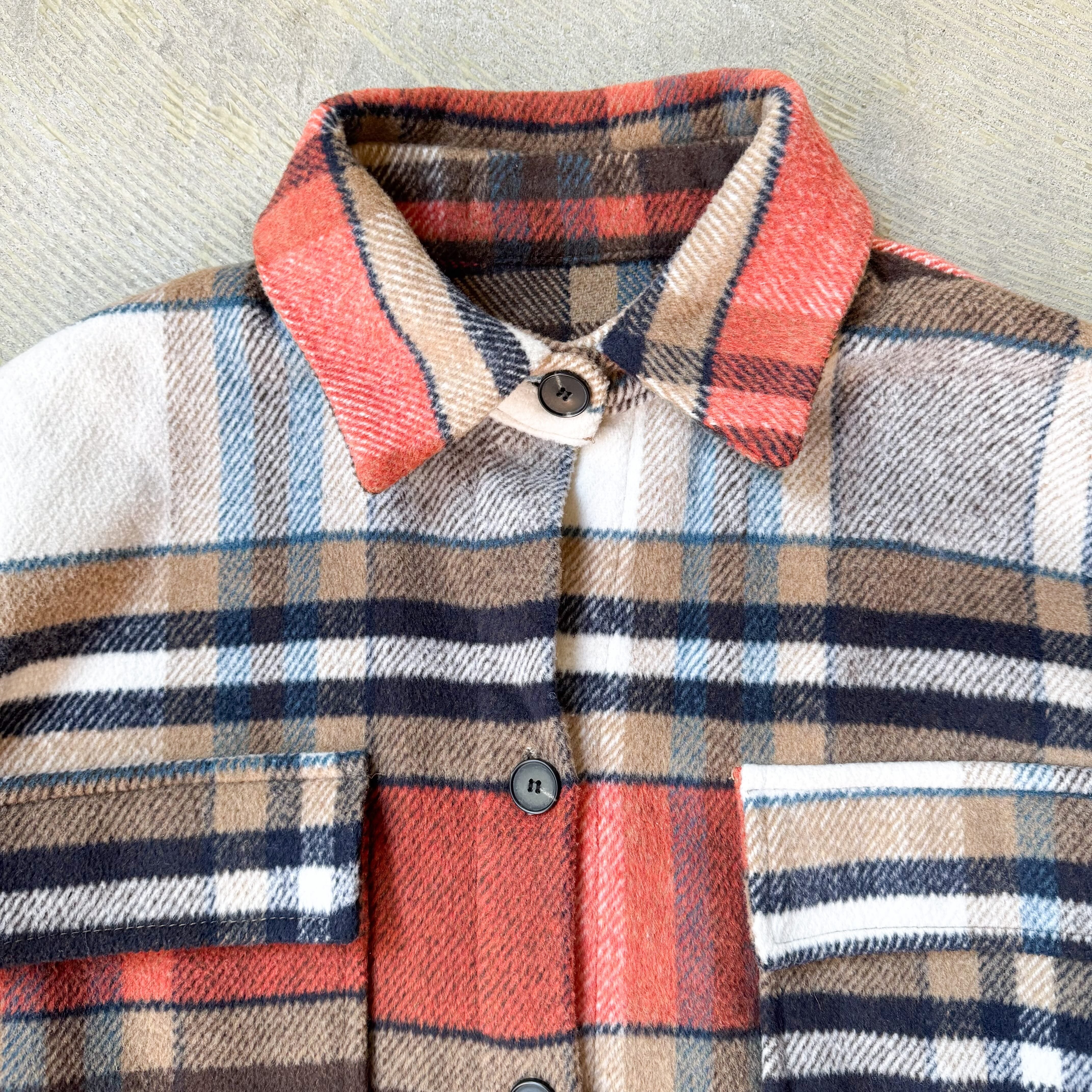 厚手のネル素材が、シャツの構造にジャケットの重さを与え、