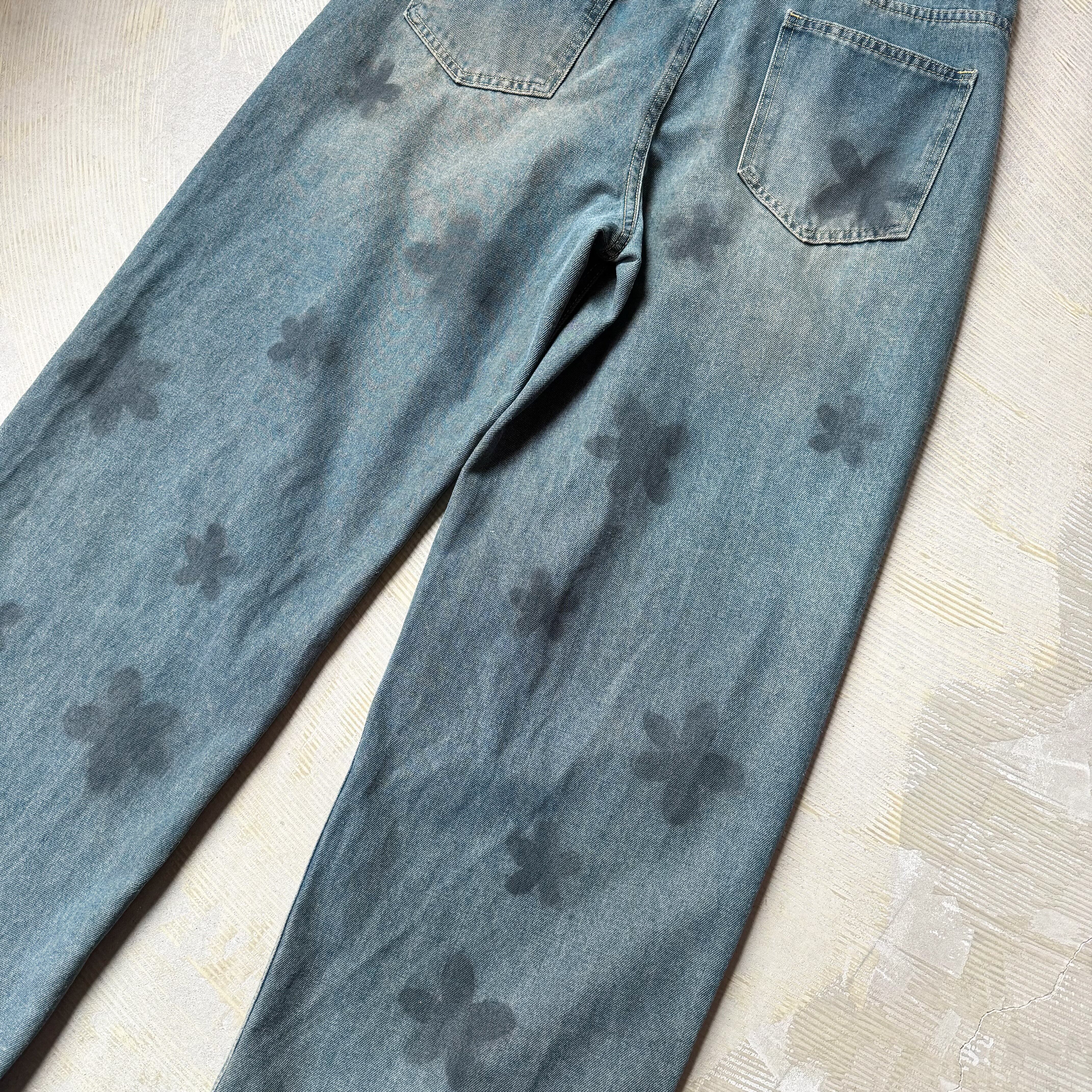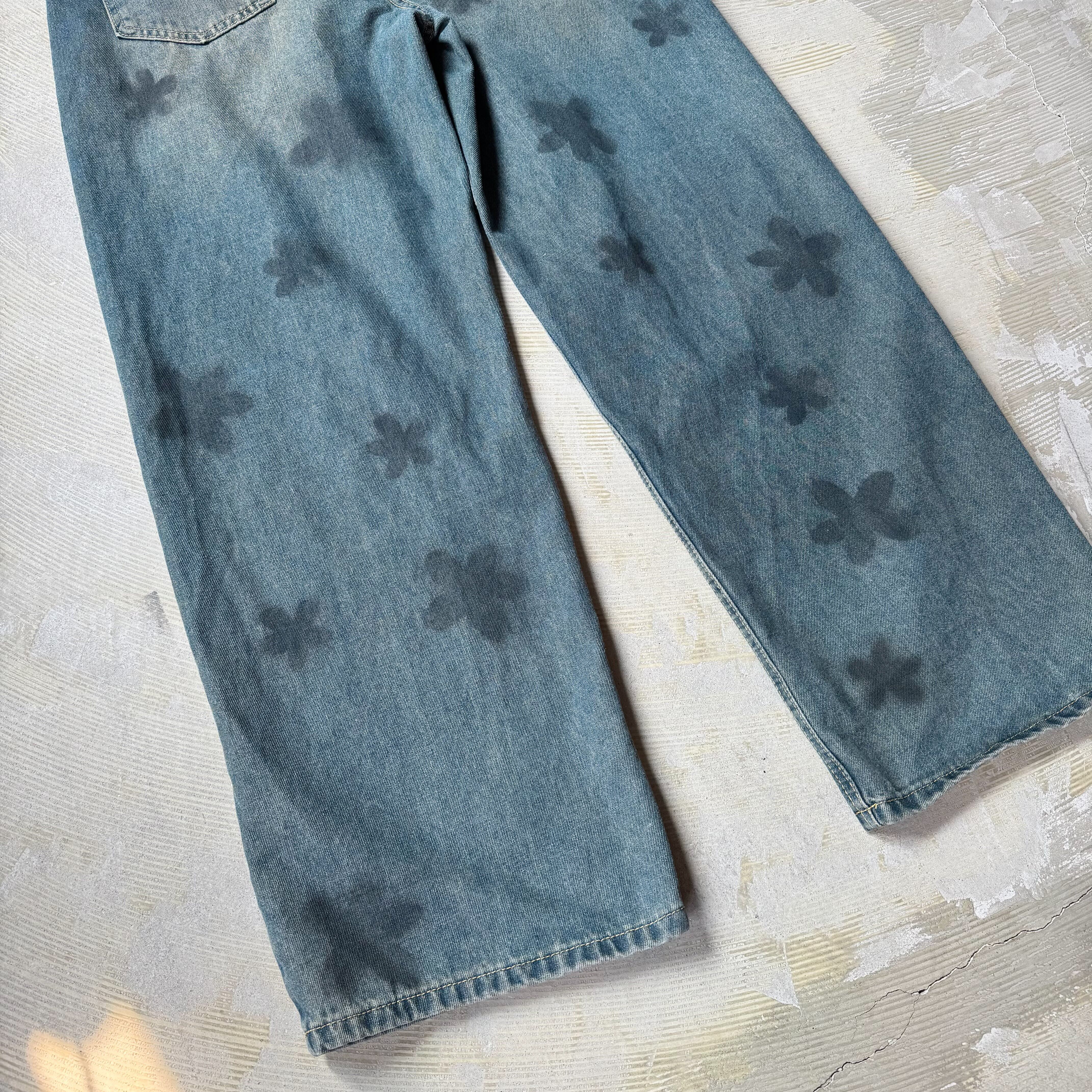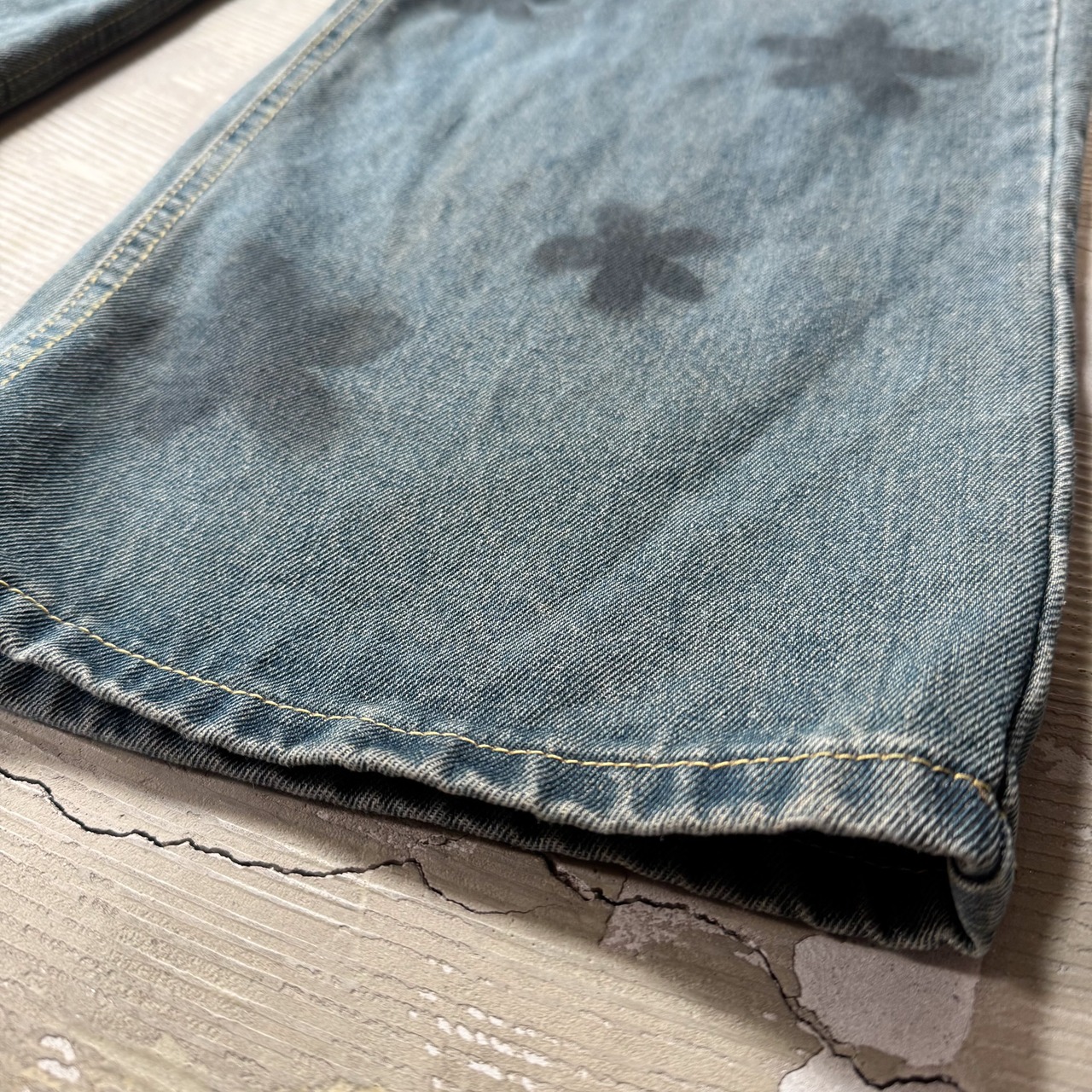 FLOWER STENCIL ART WIDE SILHOUETTE DENIM PANTS / 花 フラワー ステンシル ワイド デニム パンツ