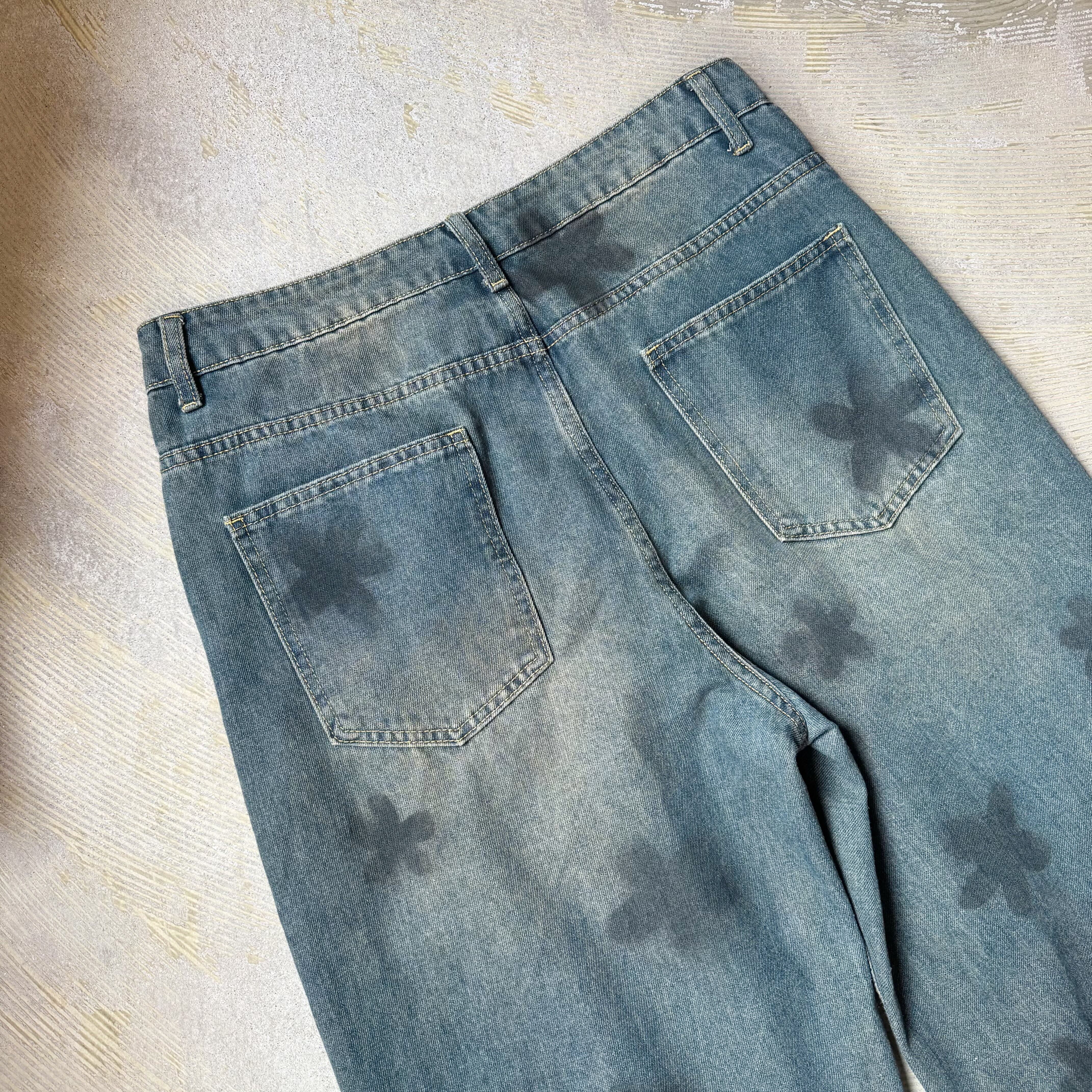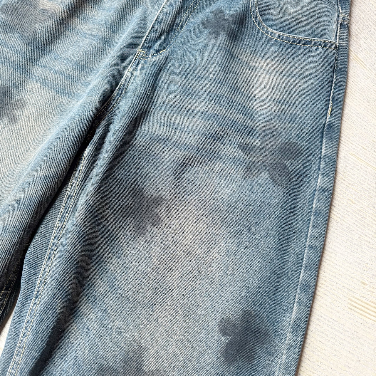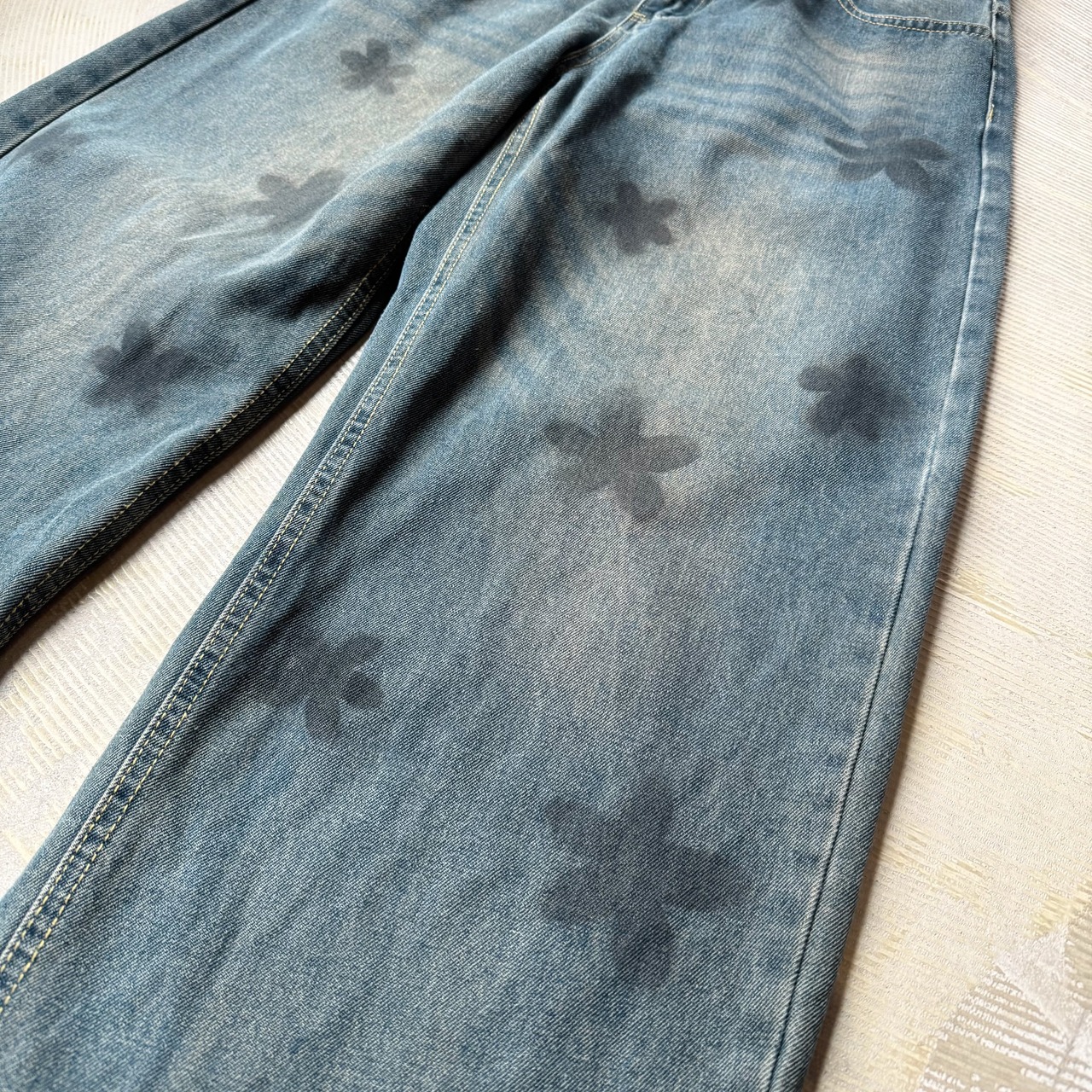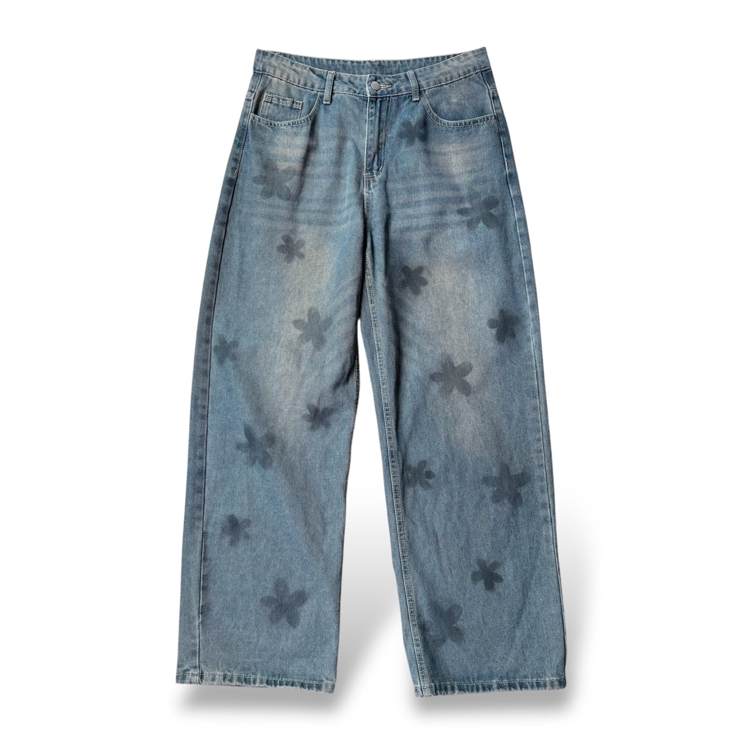 FLOWER STENCIL ART WIDE SILHOUETTE DENIM PANTS / 花 フラワー ステンシル ワイド デニム パンツ