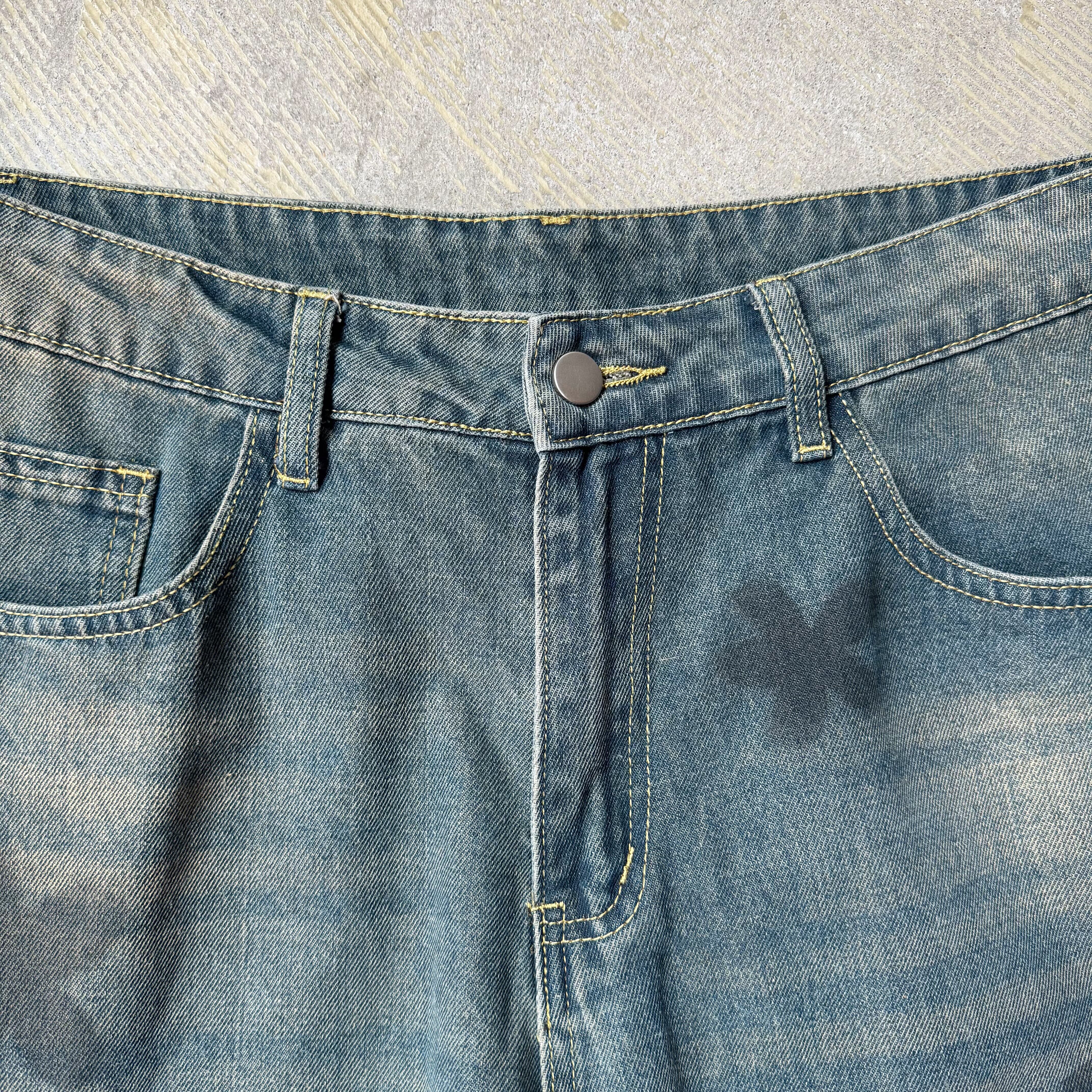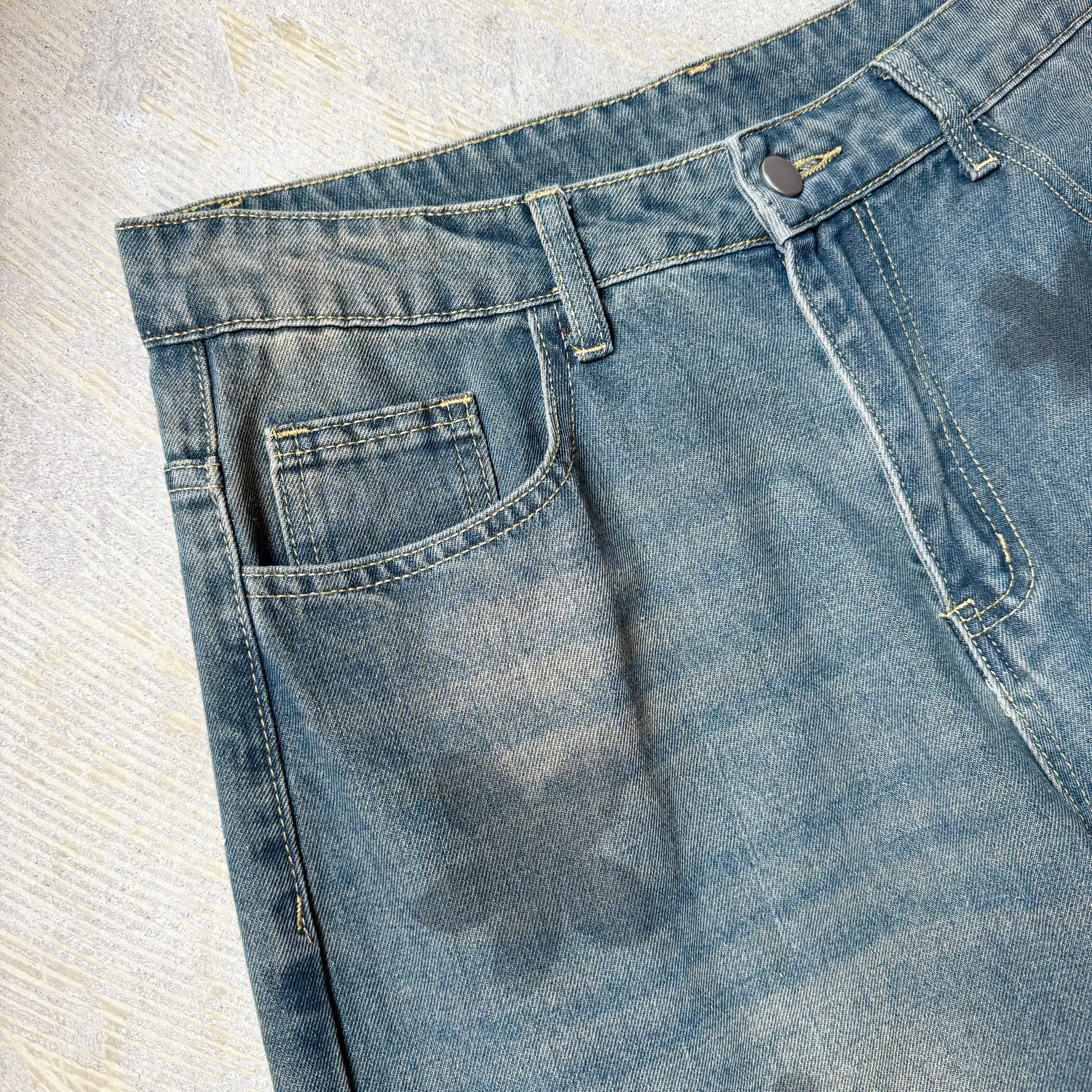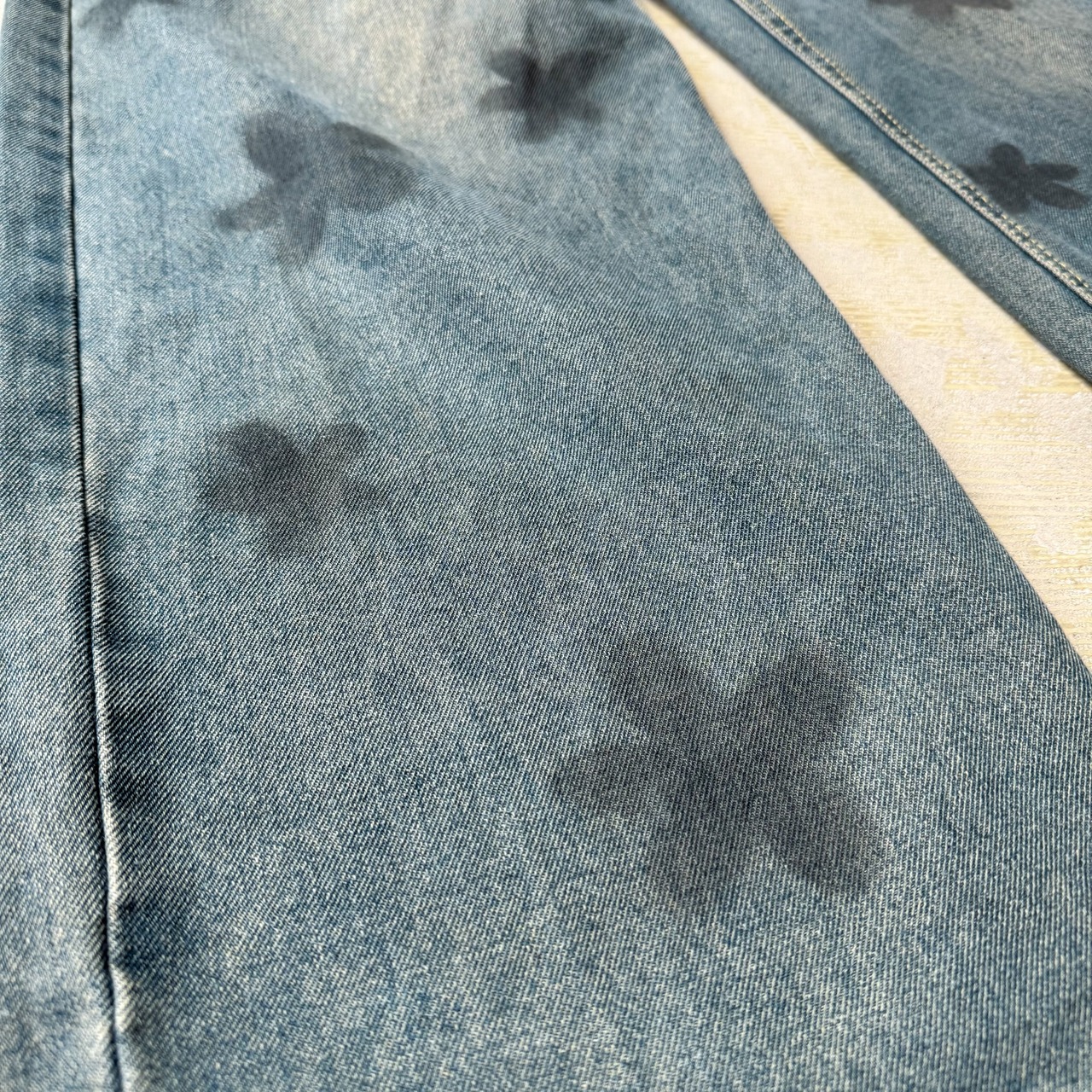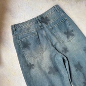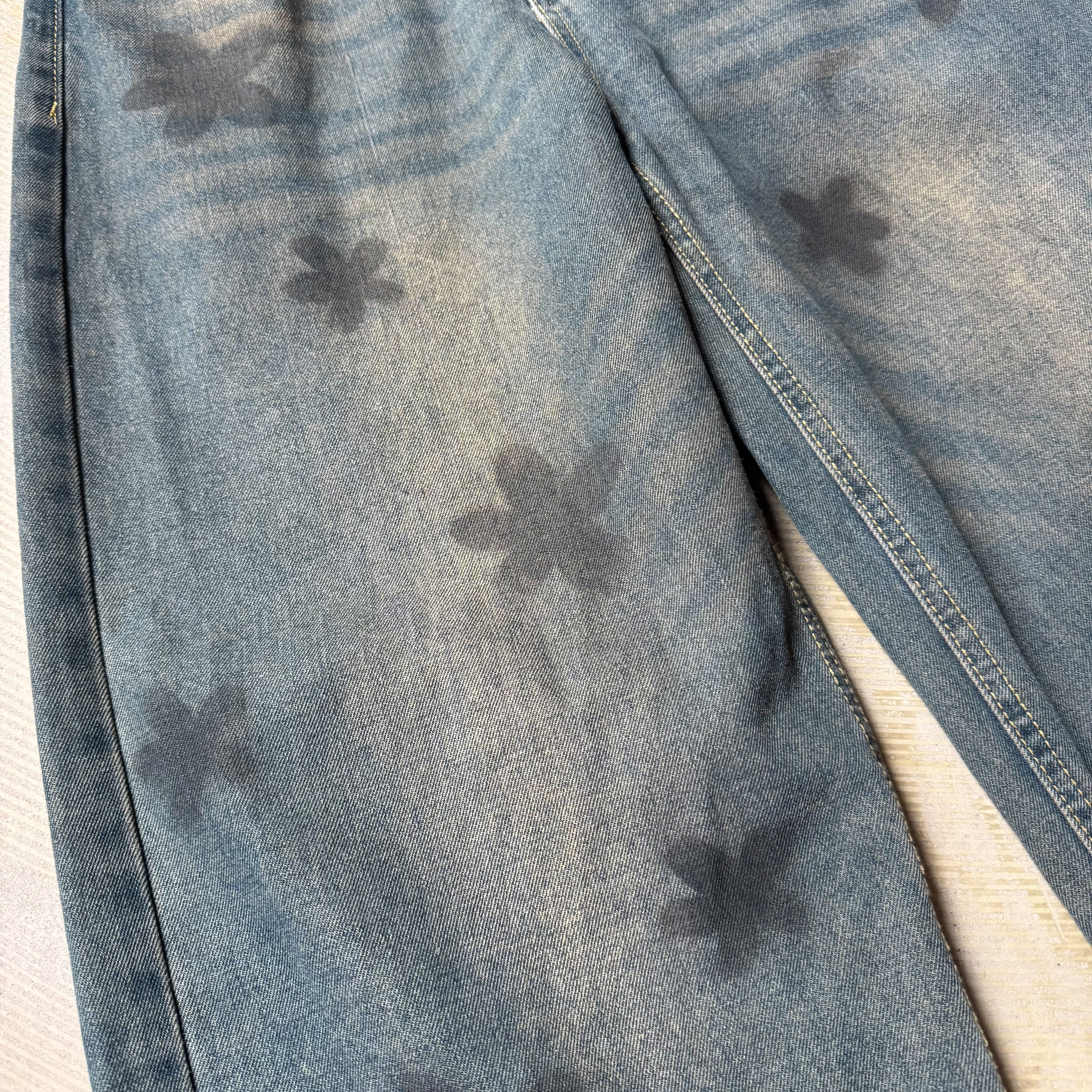 濃淡のある花柄ステンシルが間隔を持って配置されることで、視線にリズムを生むデニムパンツ。