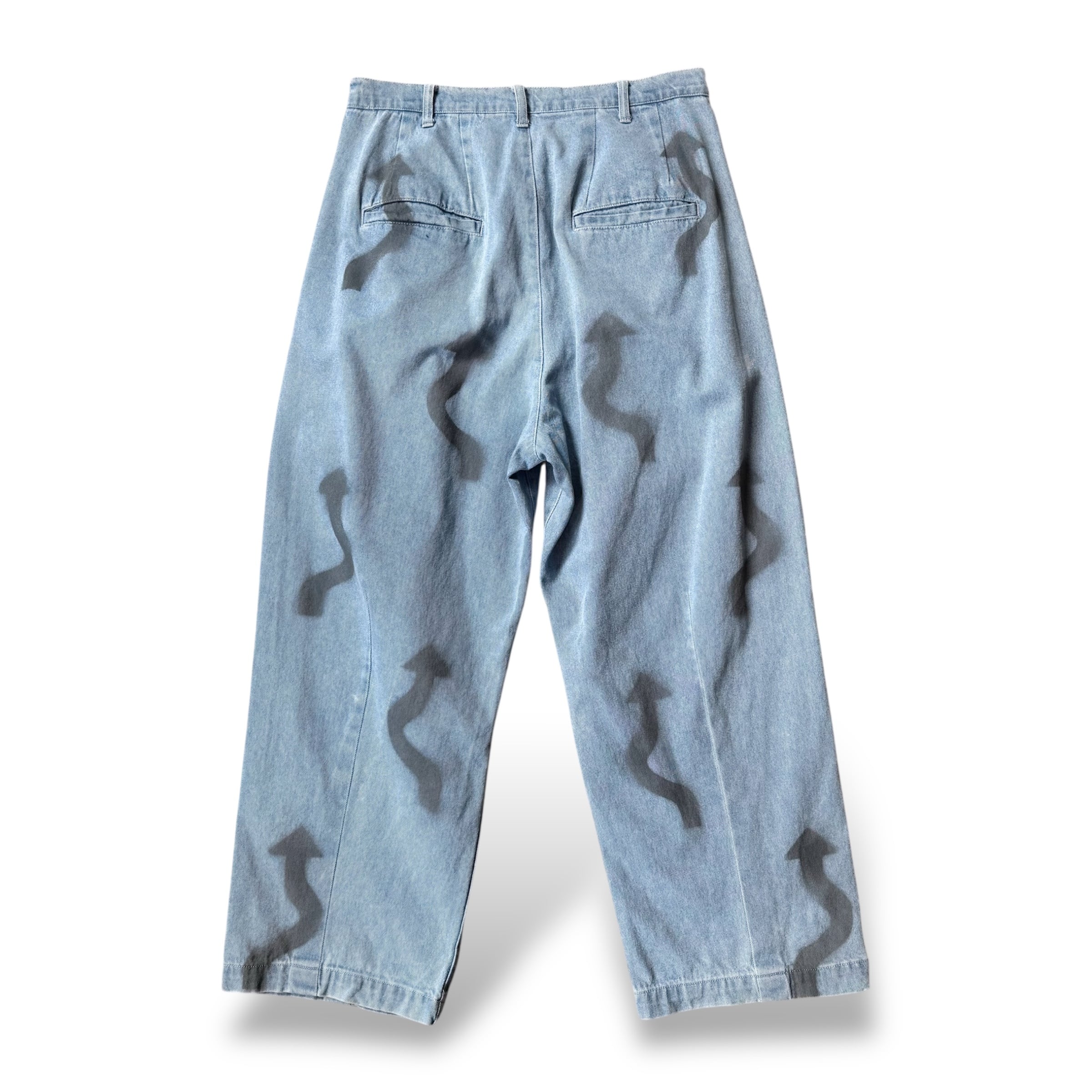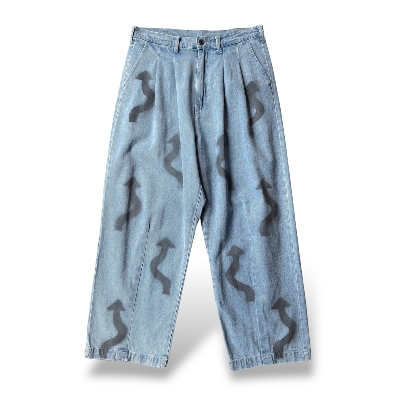 黒の矢印ステンシルが反復と濃淡を伴って配置され、視線を上へと誘導するワイドデニムパンツ。
