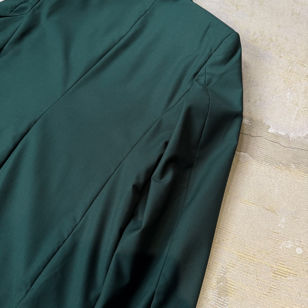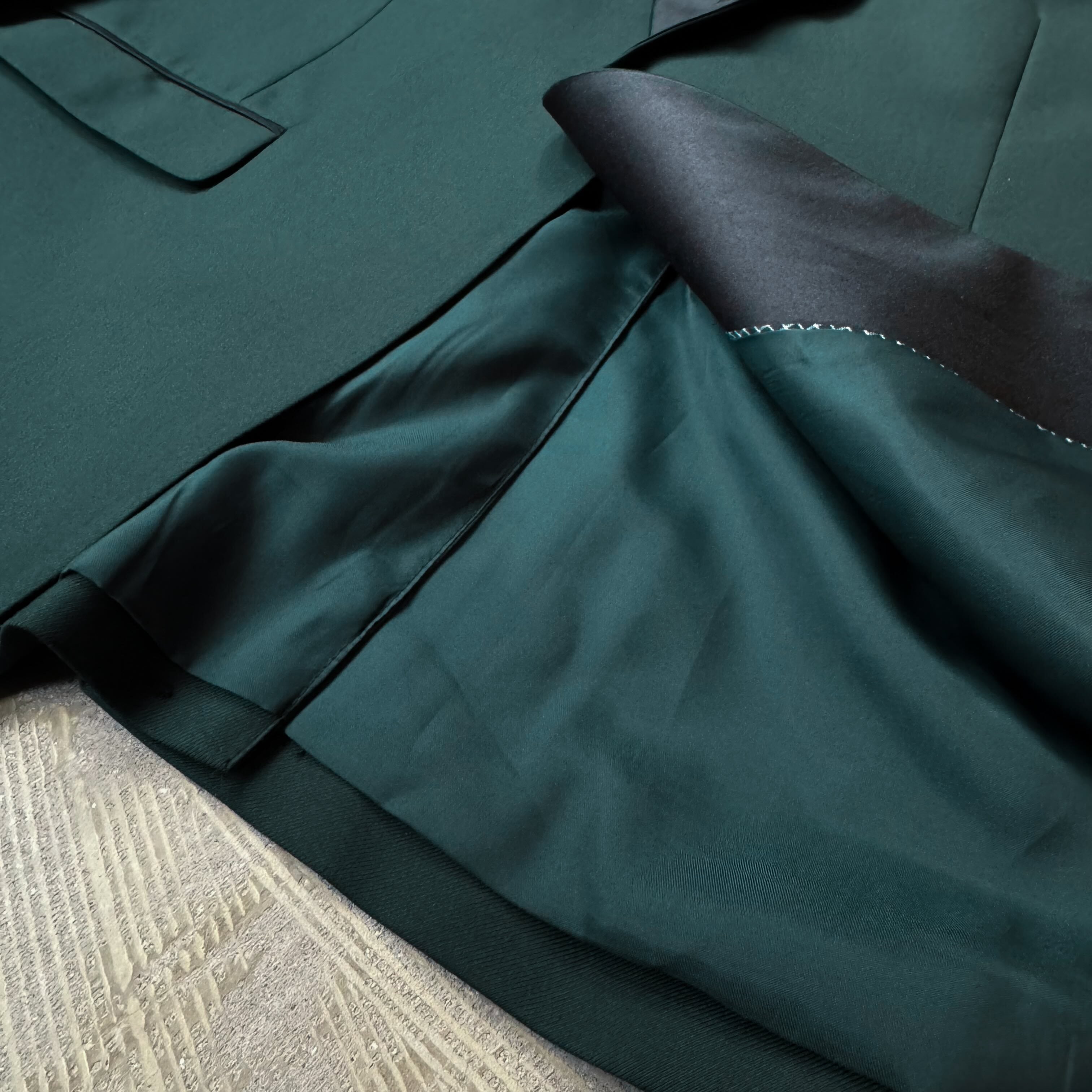 光沢のあるラペルが、マットなグリーンに柔らかい反射を与え、