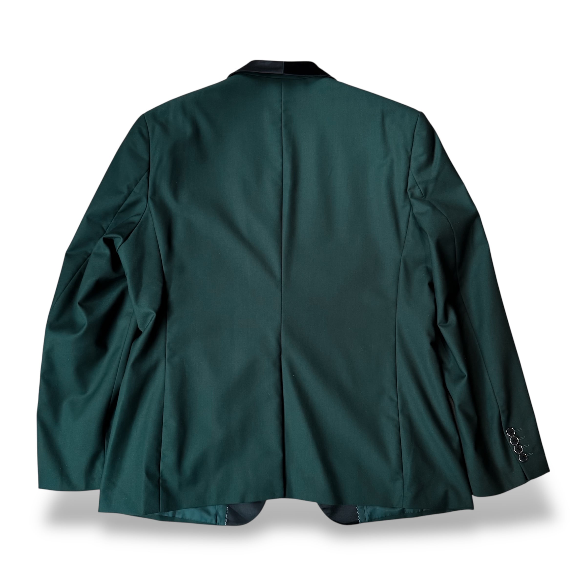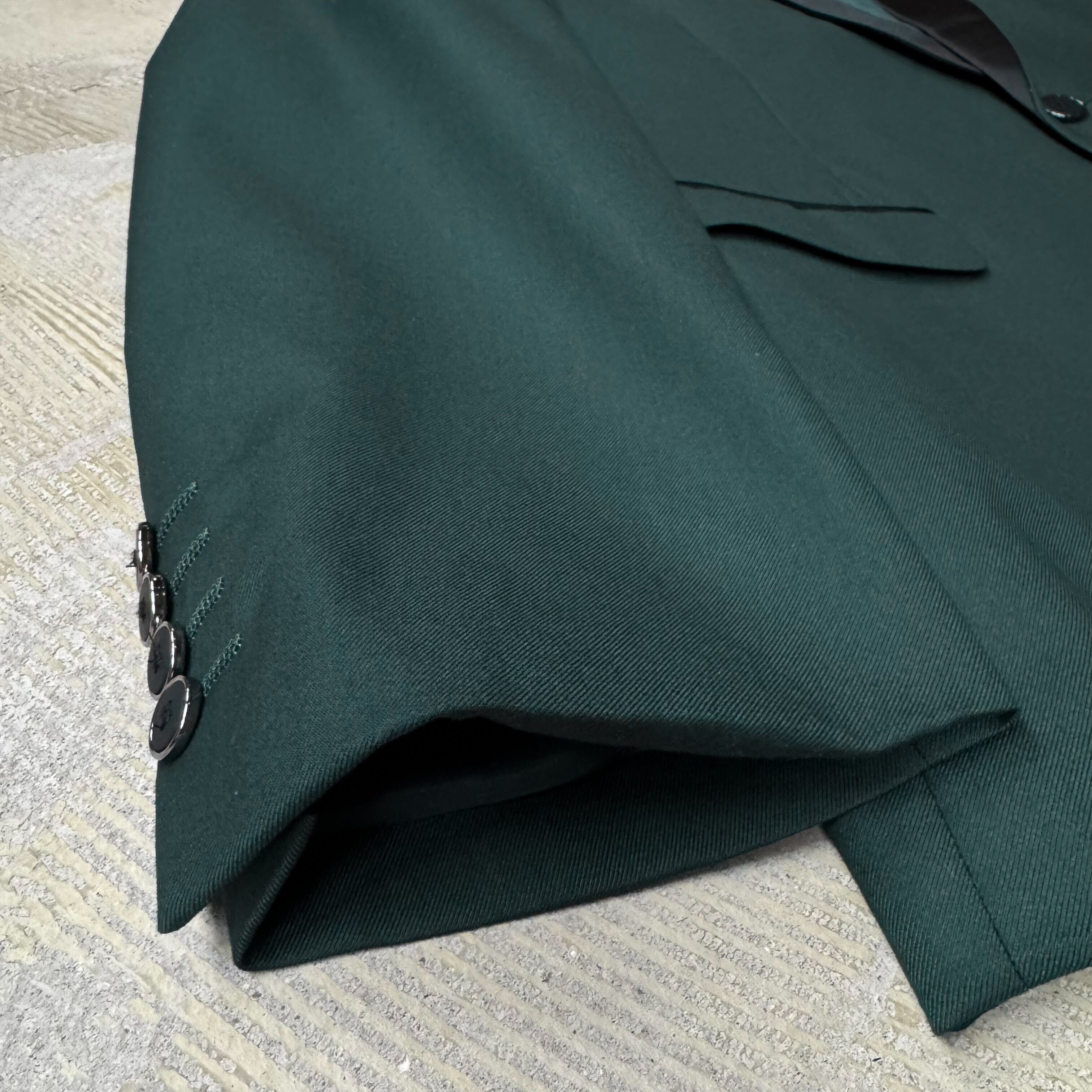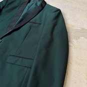 ・深いダークグリーンのボディに、ブラックのショールカラー