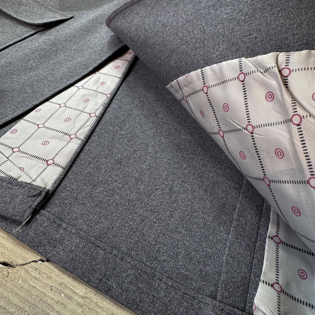 裏地には赤とグレーのパターンが走り、内側まで遊び心が続く仕立て。