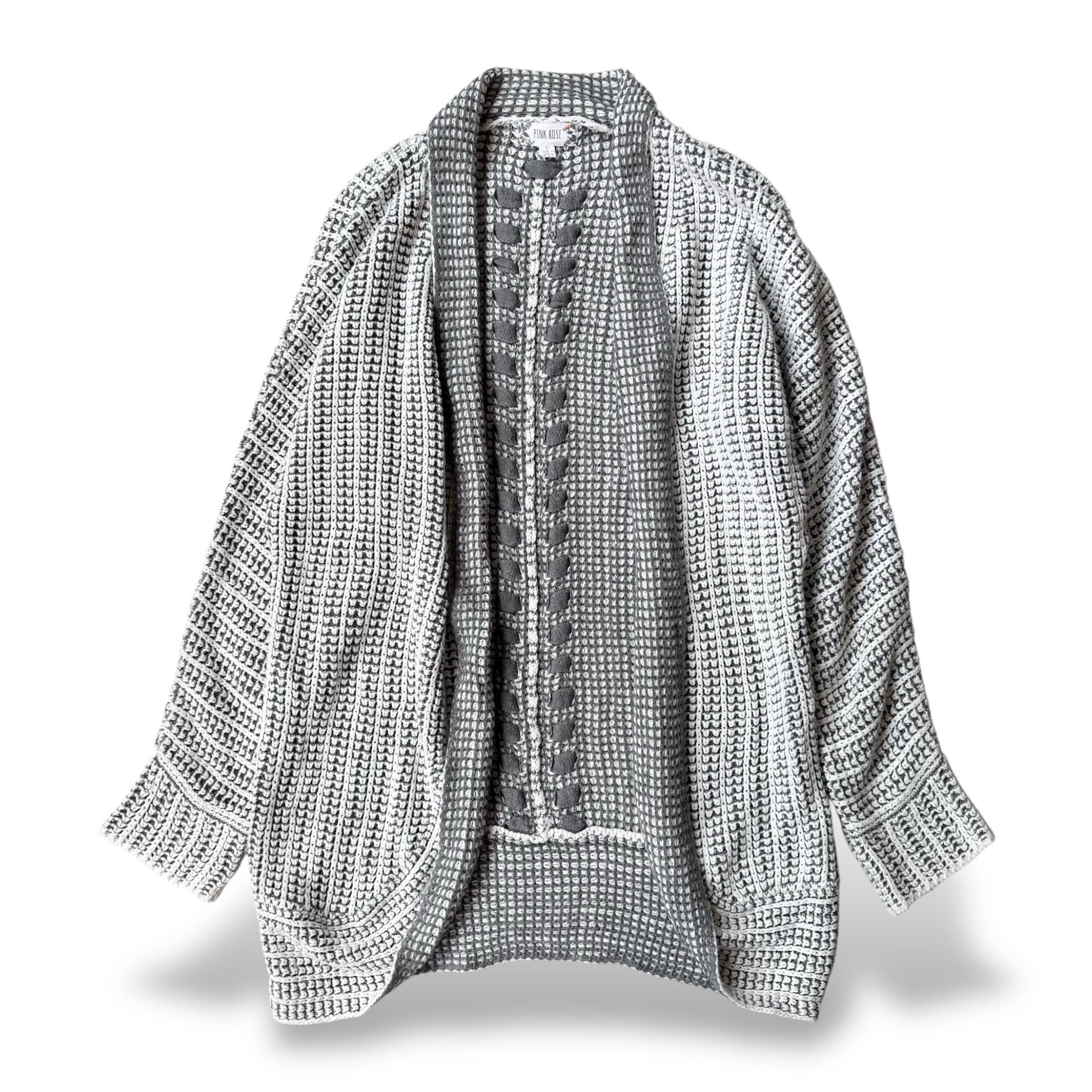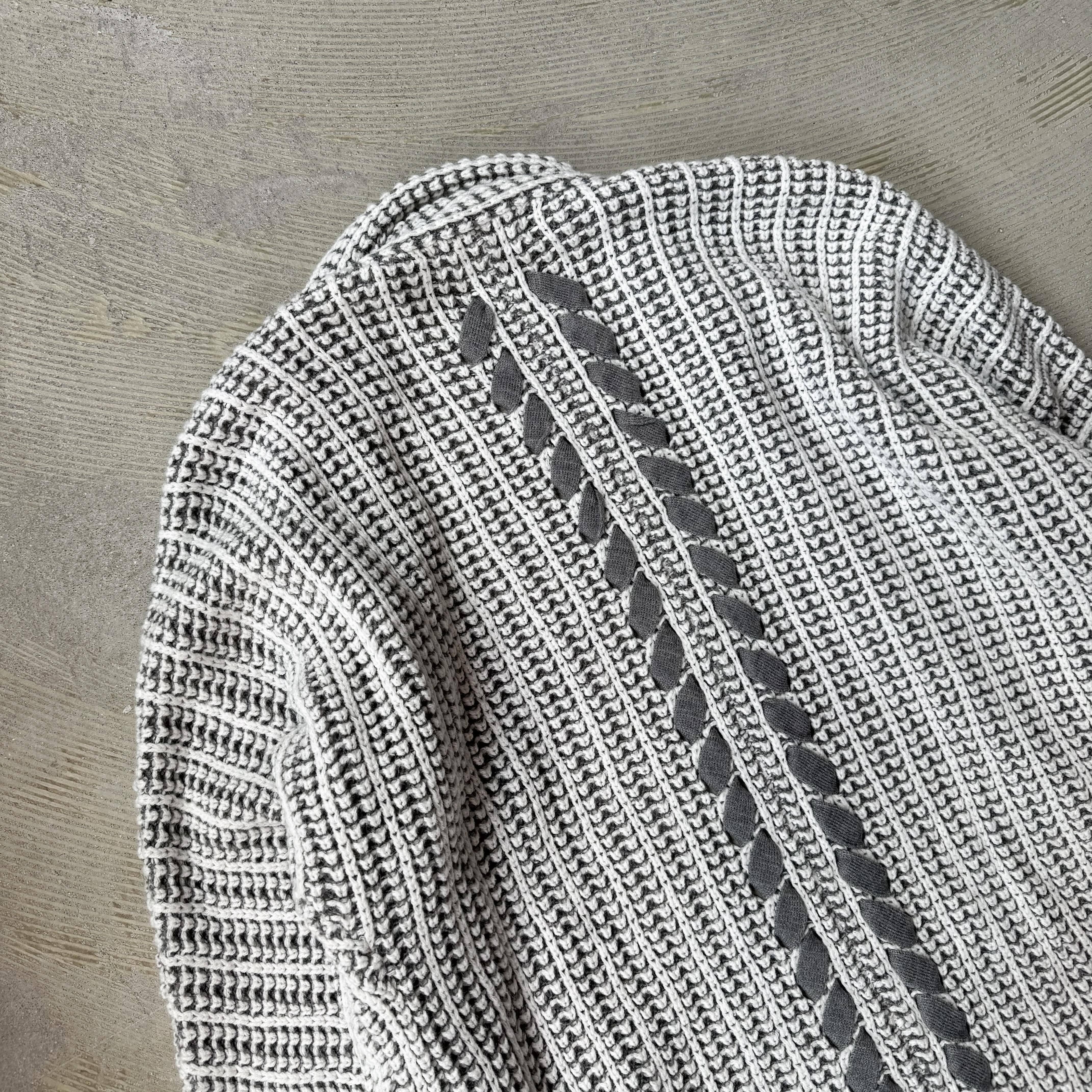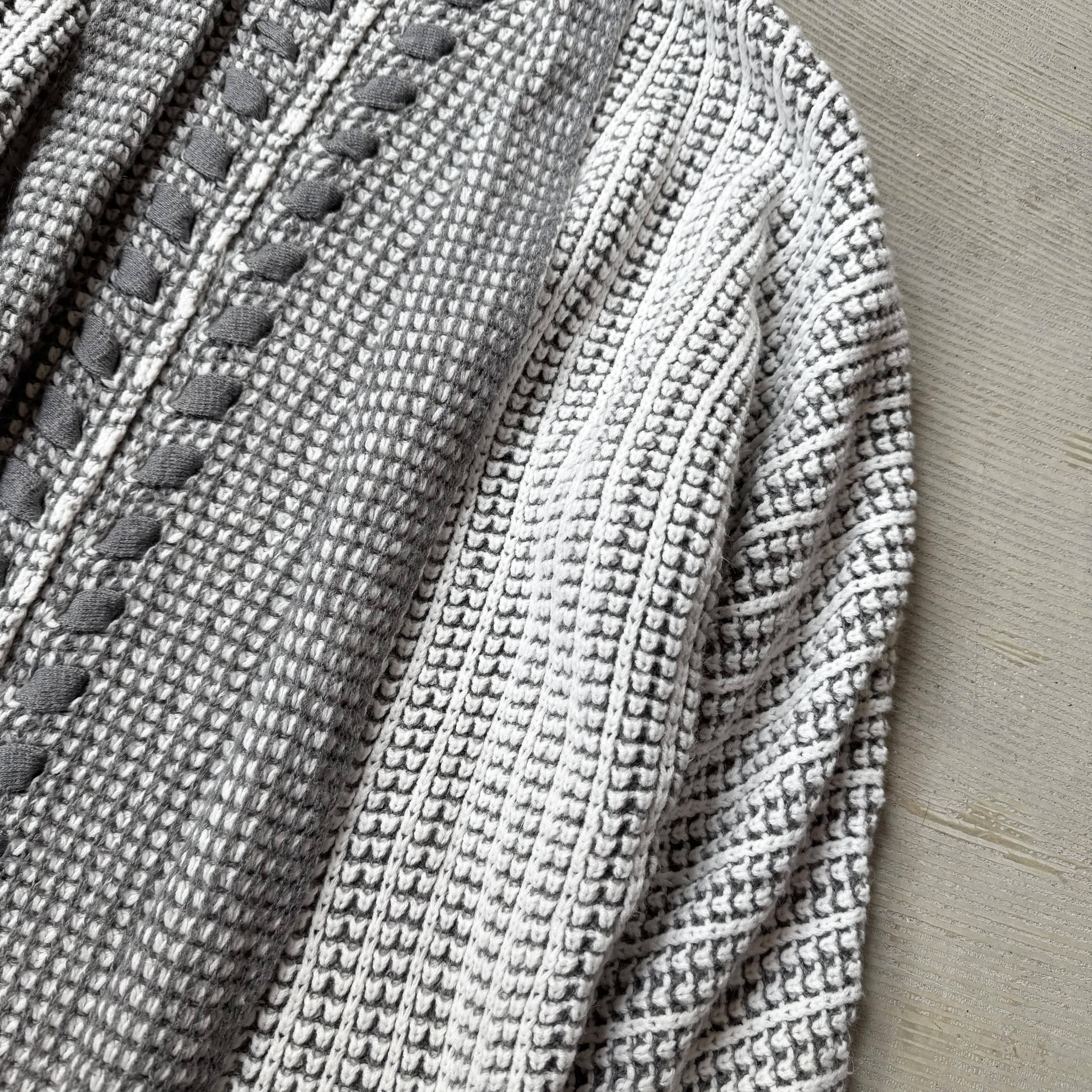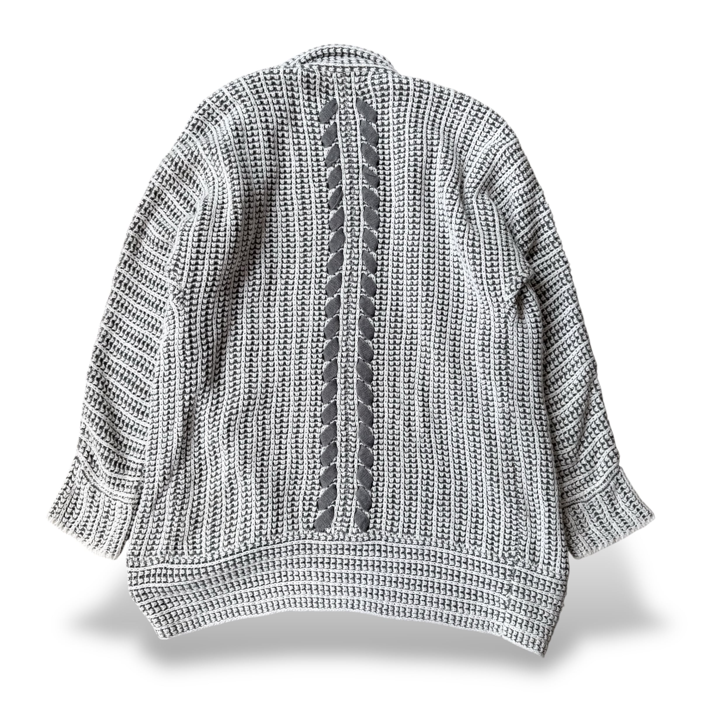 ・グレーを基調に、複雑で丁寧な編みを組み合わせたニットカーディガンで