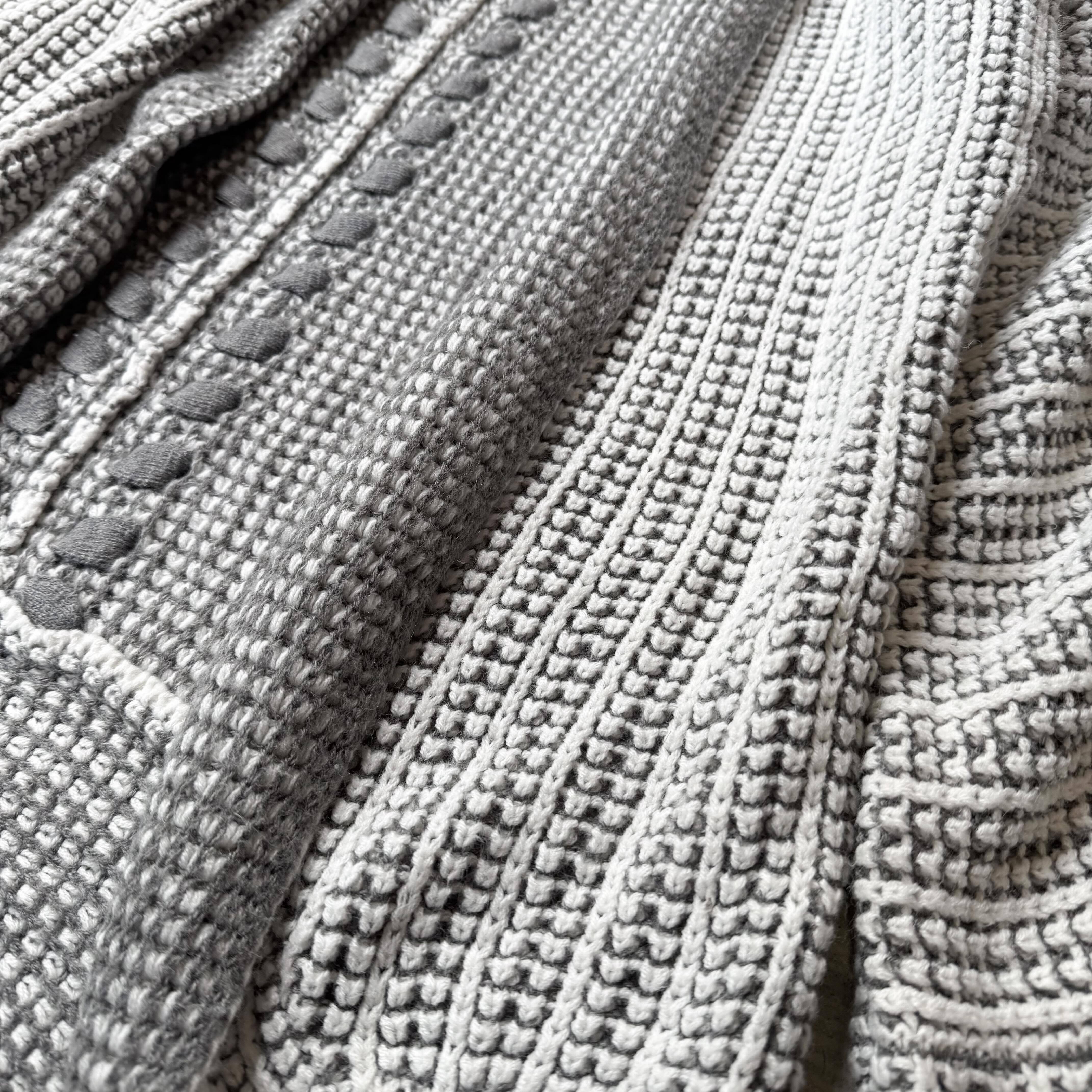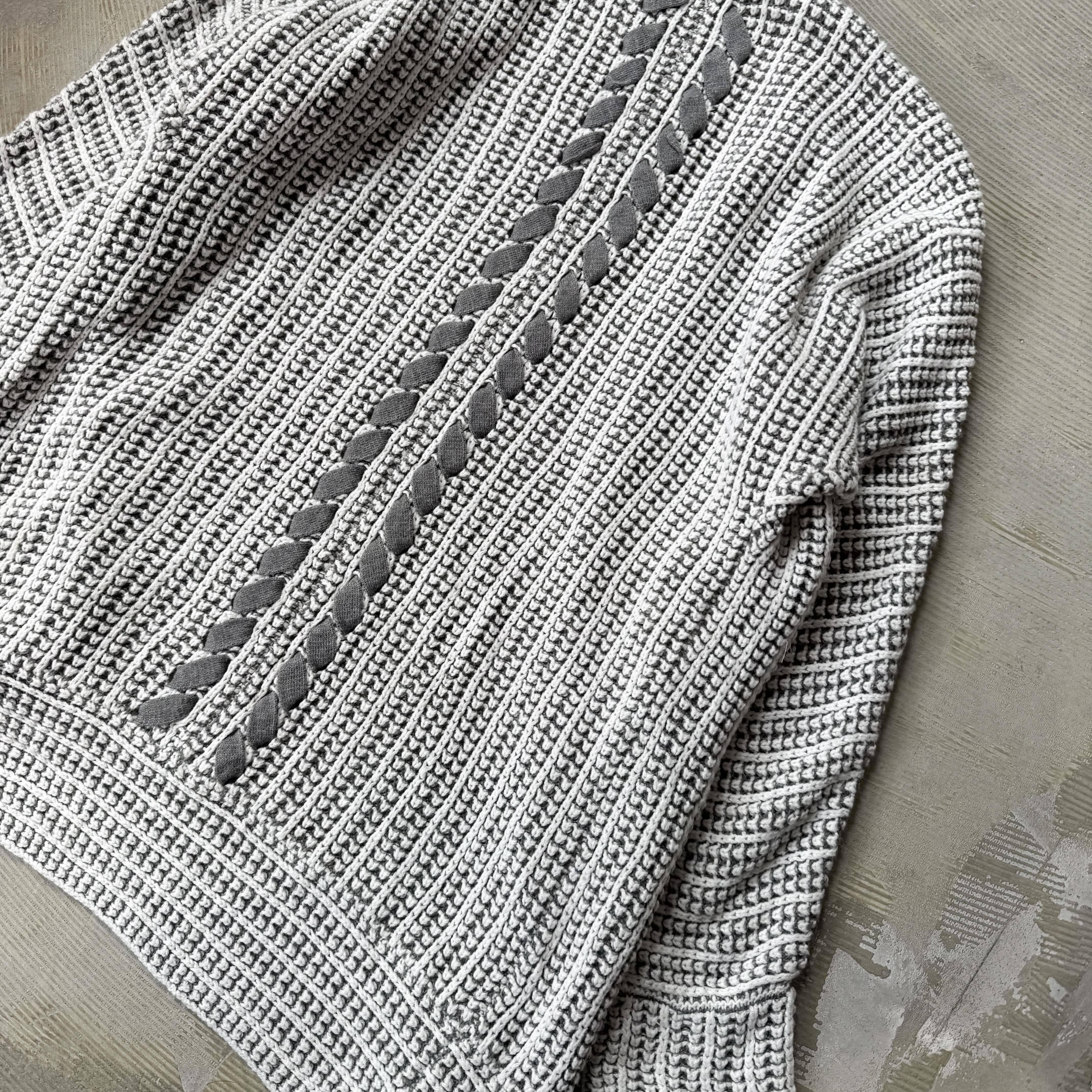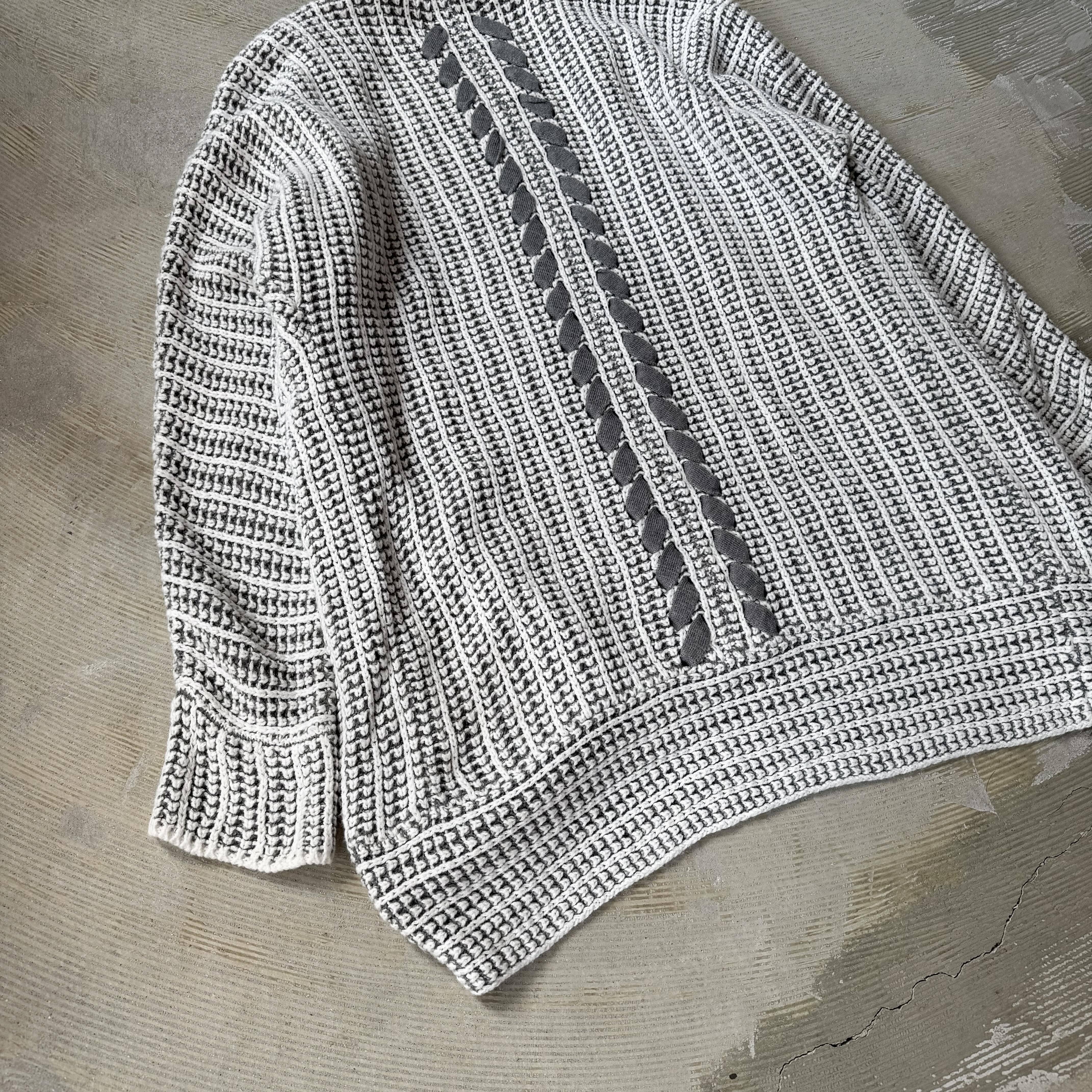 ・グレーを基調に、複雑で丁寧な編みを組み合わせたニットカーディガンで