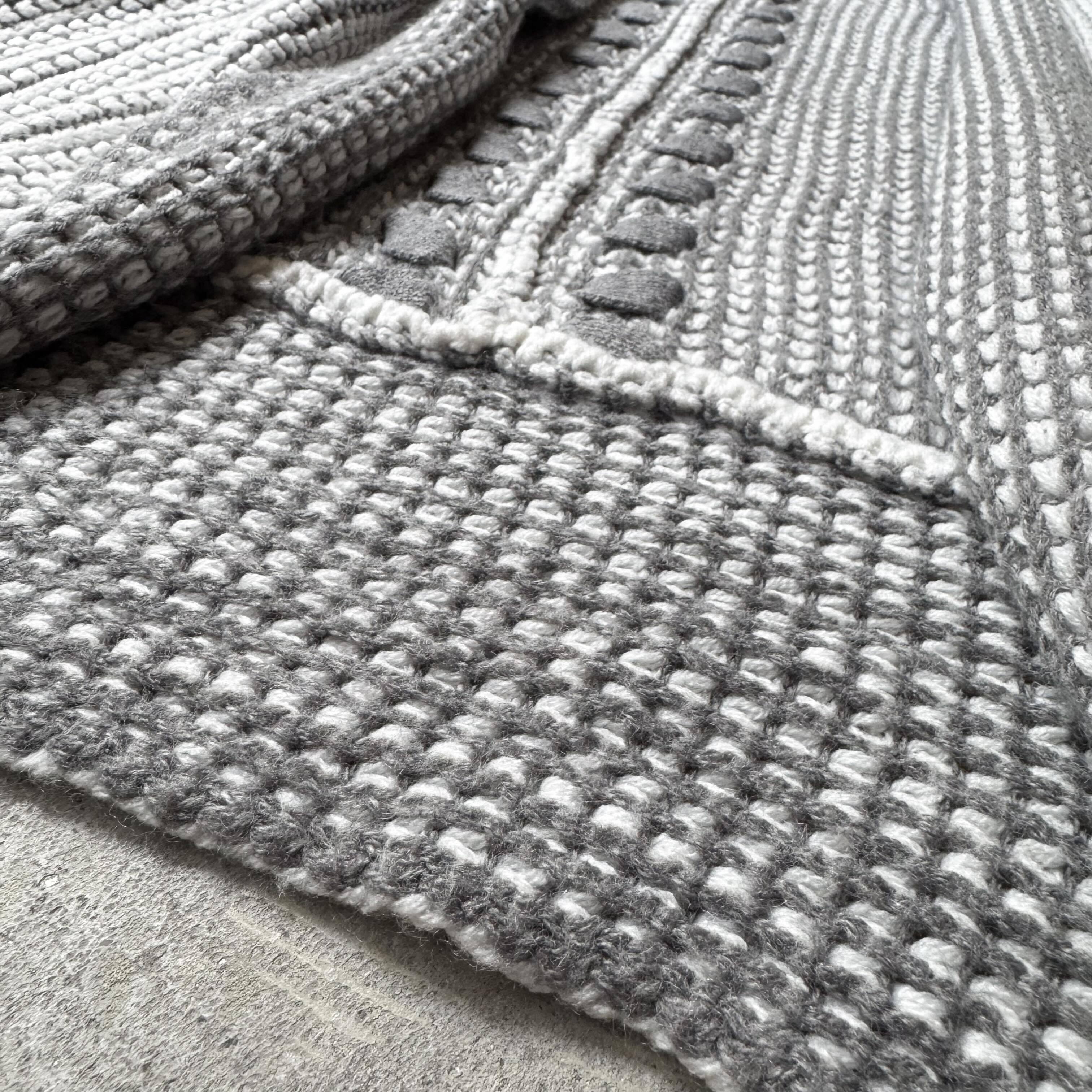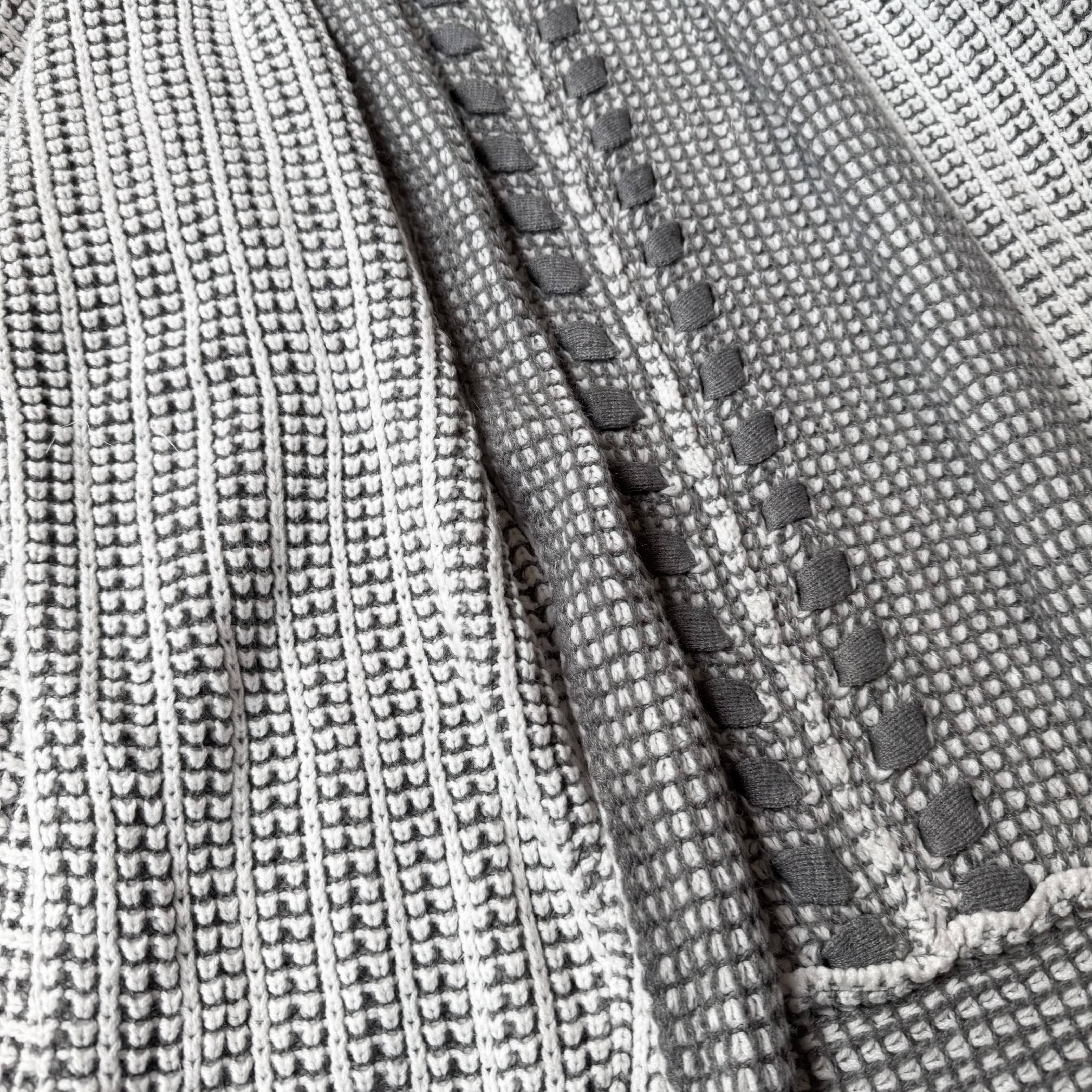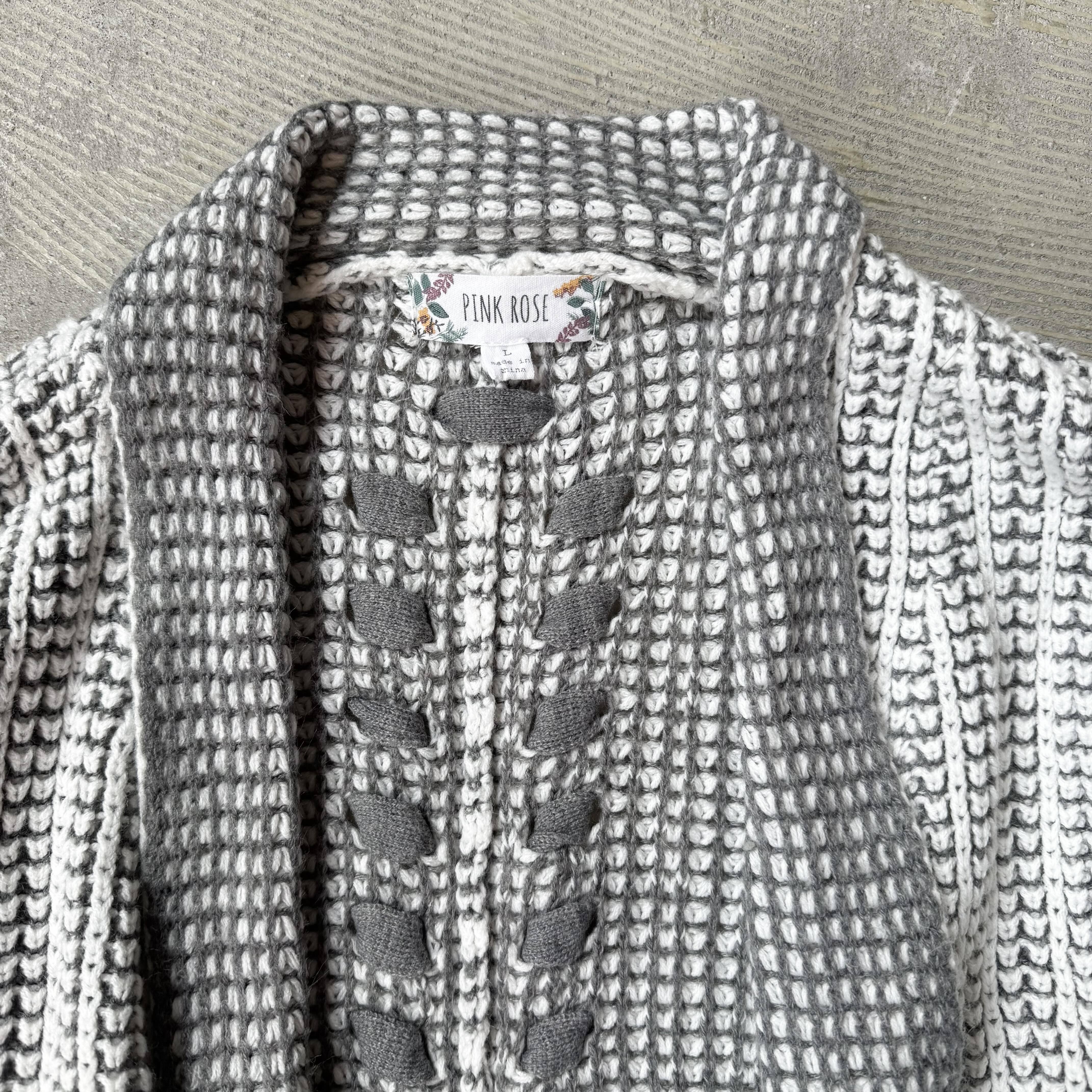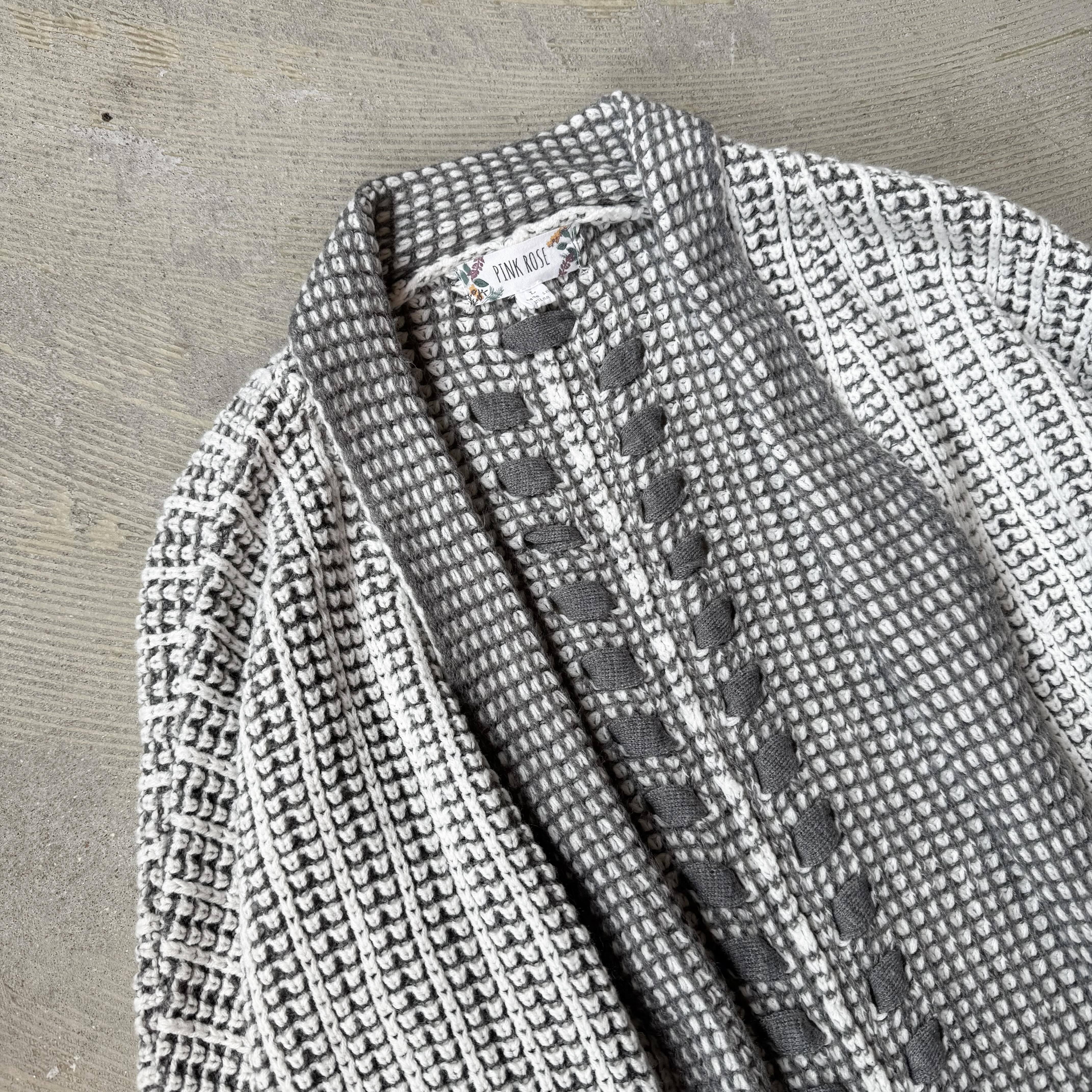 ・グレーを基調に、複雑で丁寧な編みを組み合わせたニットカーディガンで