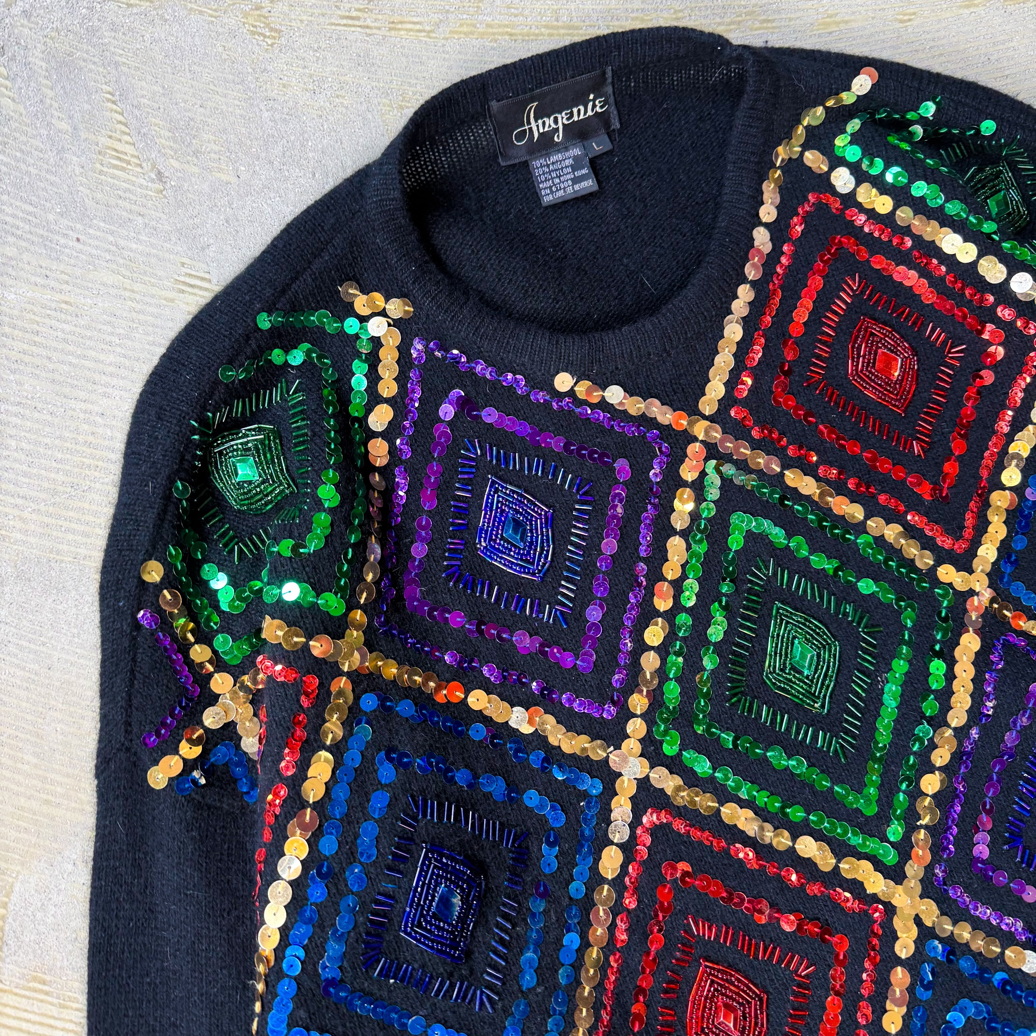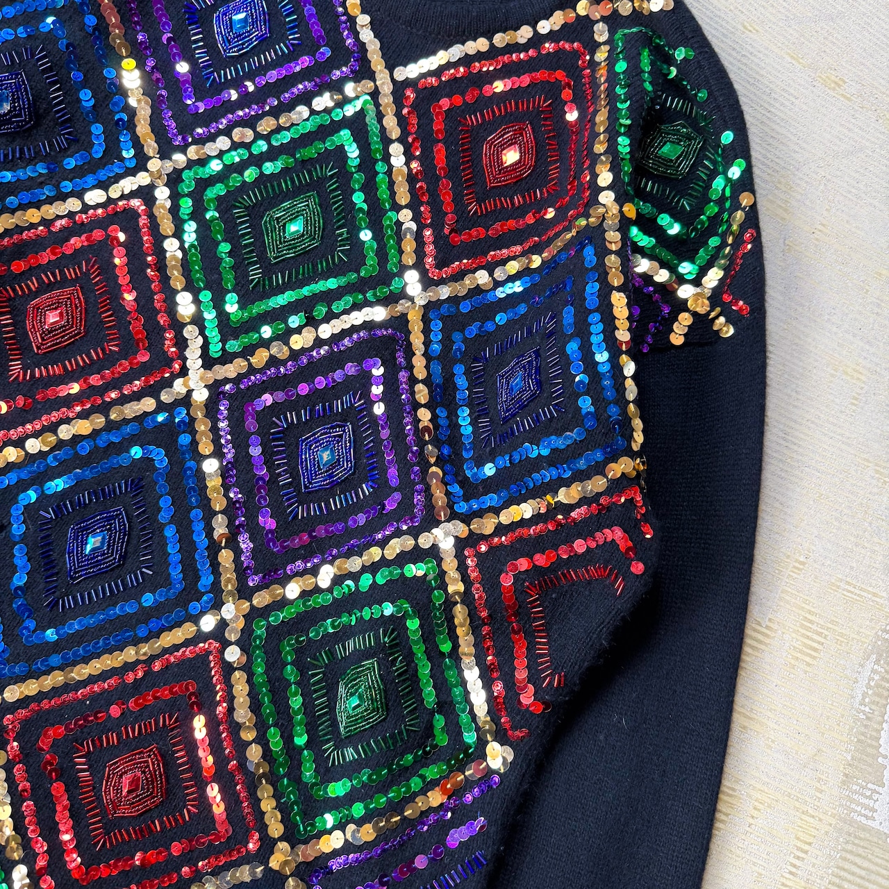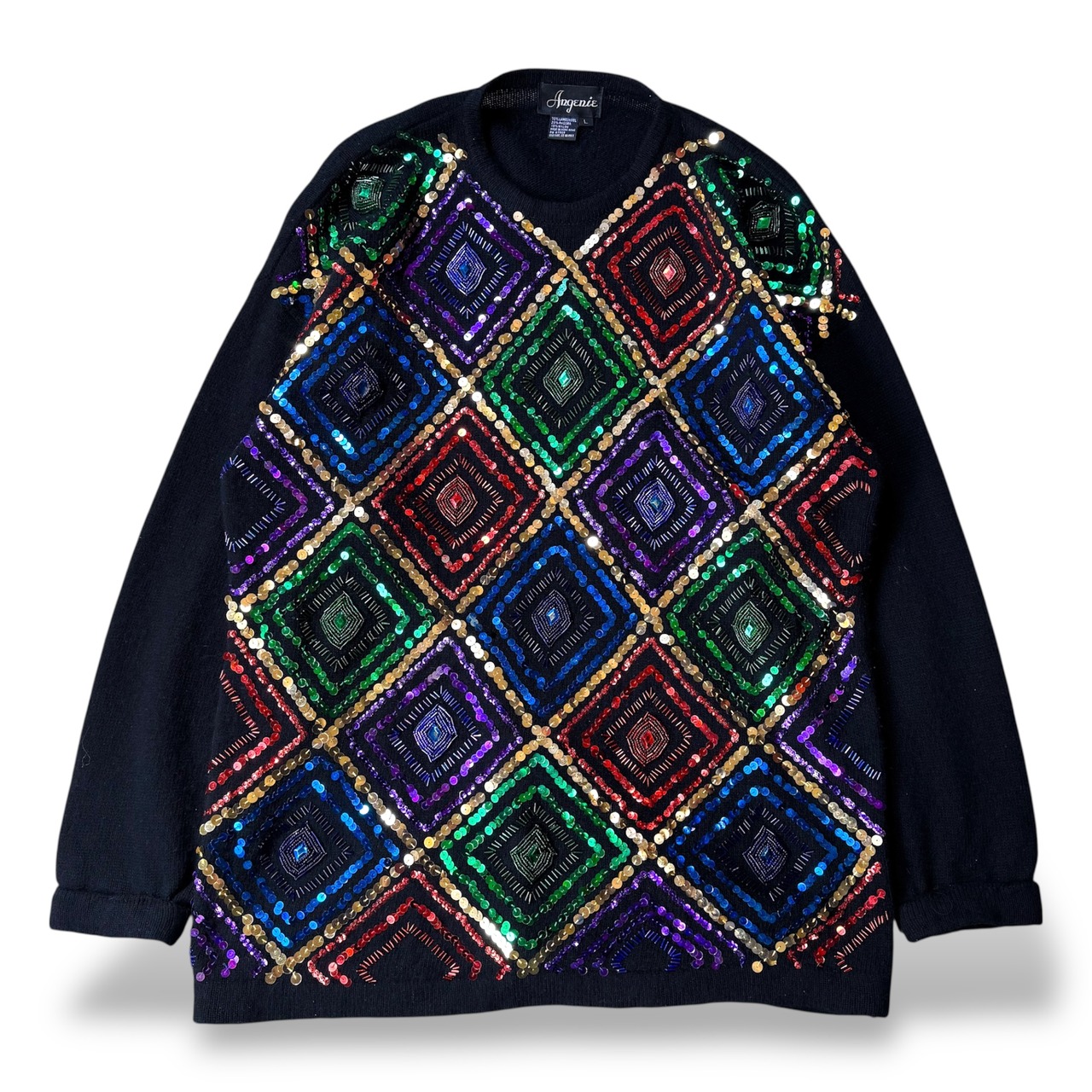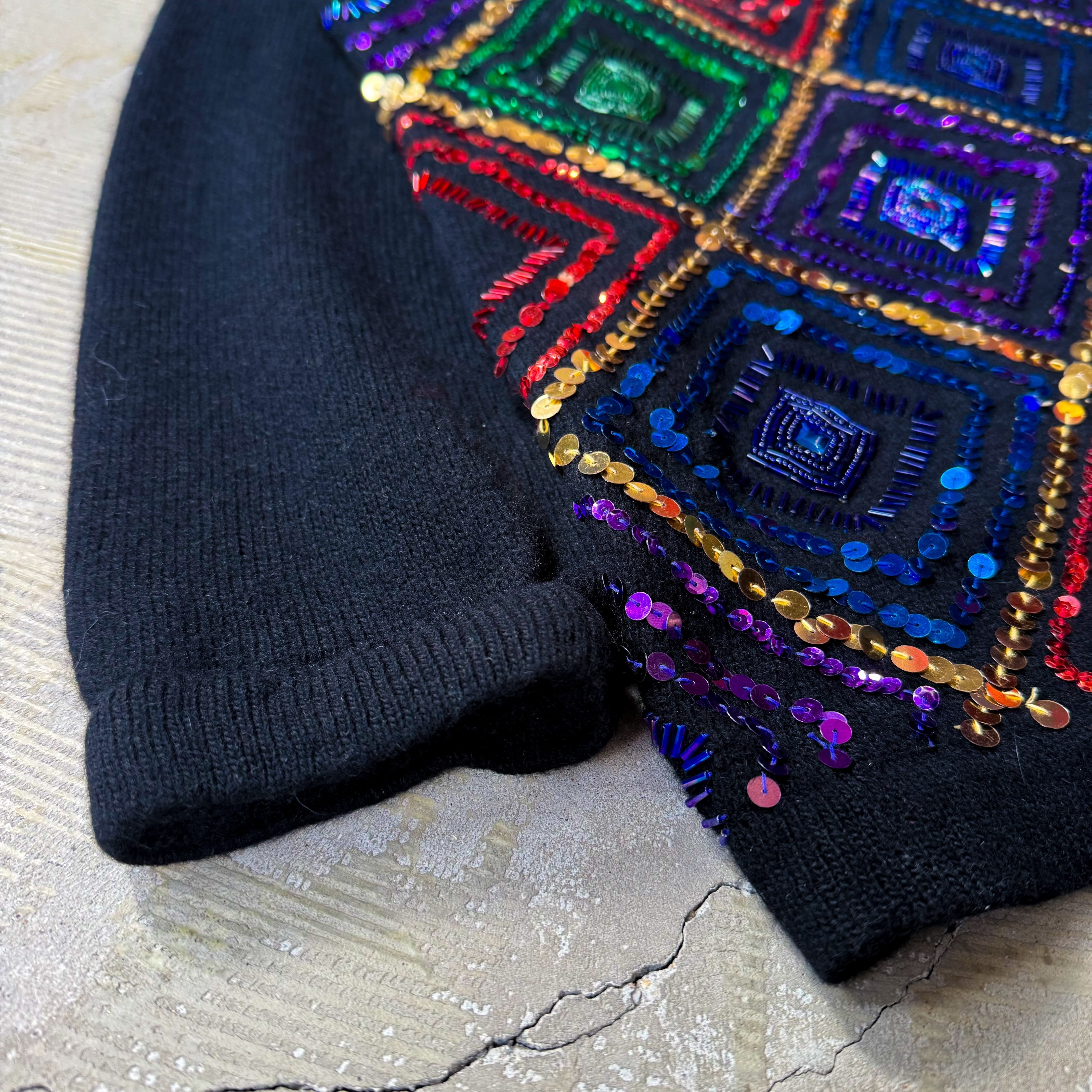 多色のスパンコールとビーズで幾何学模様を描いた80’sニット。