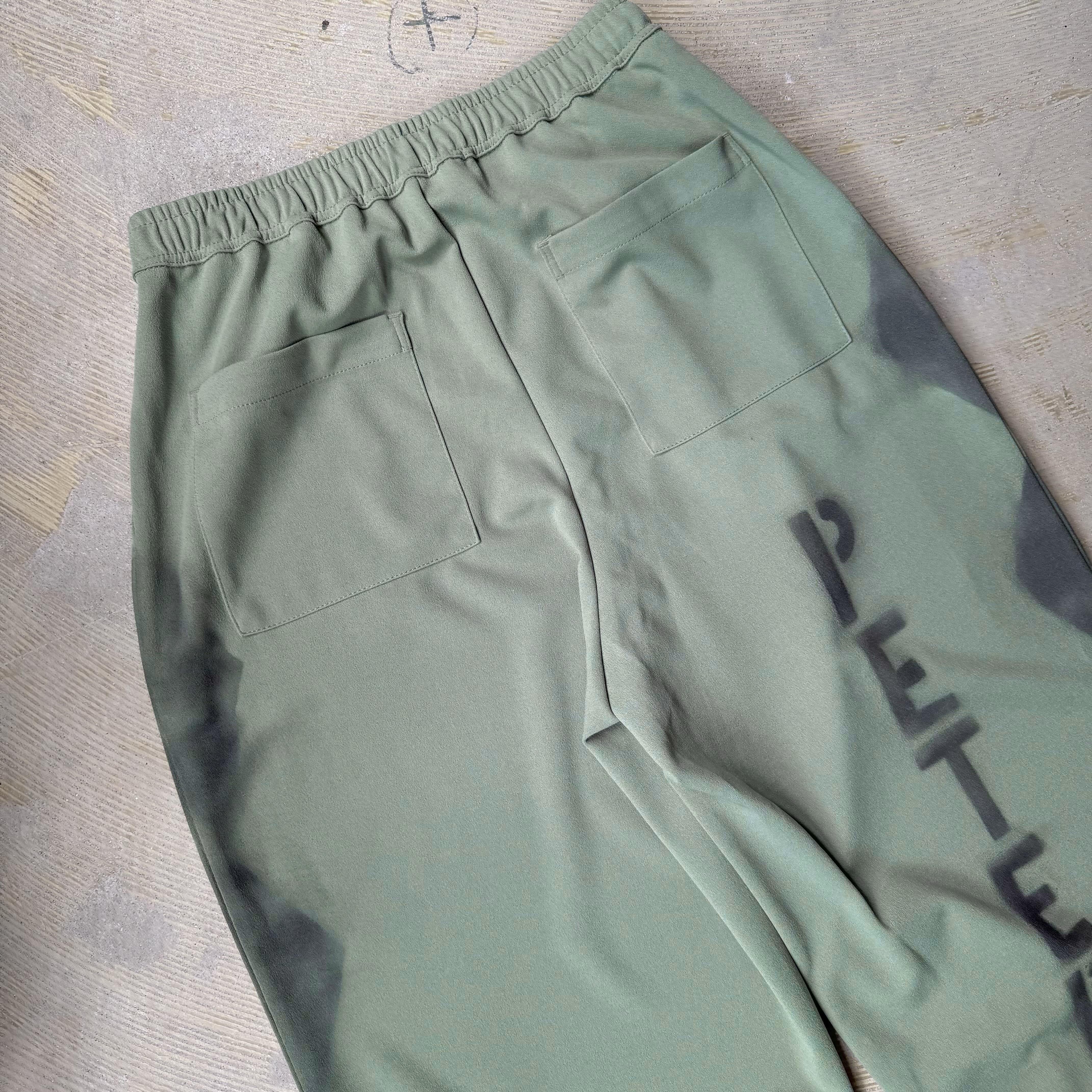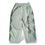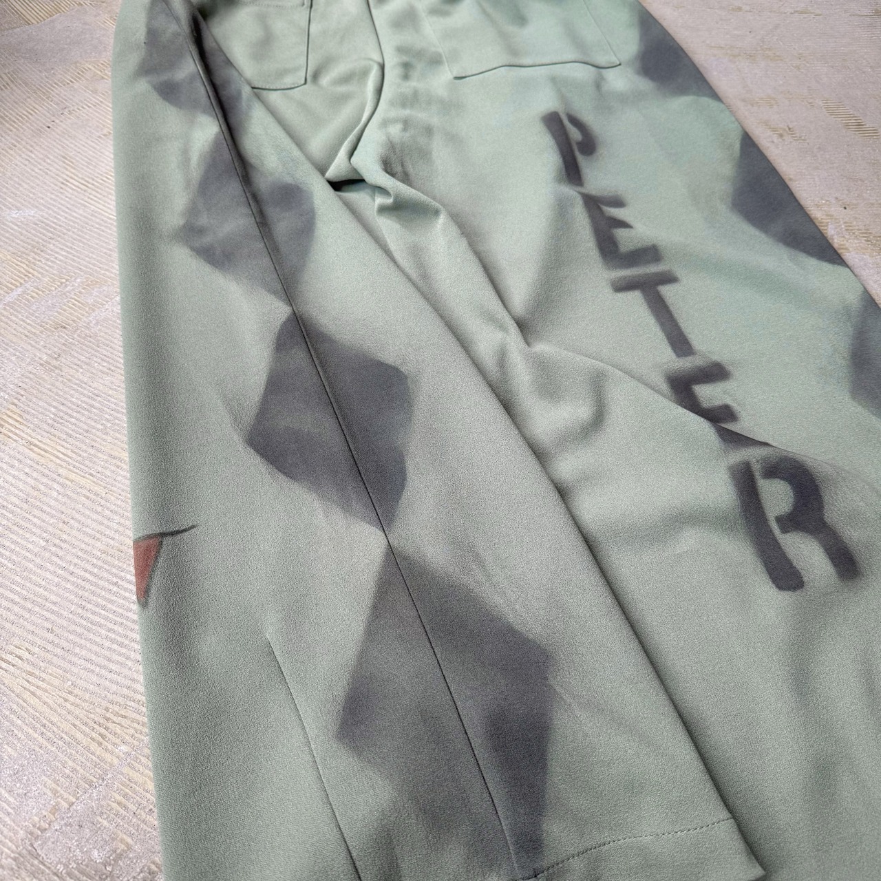 ゆるいステンシル文字を散りばめたワイドパンツ。