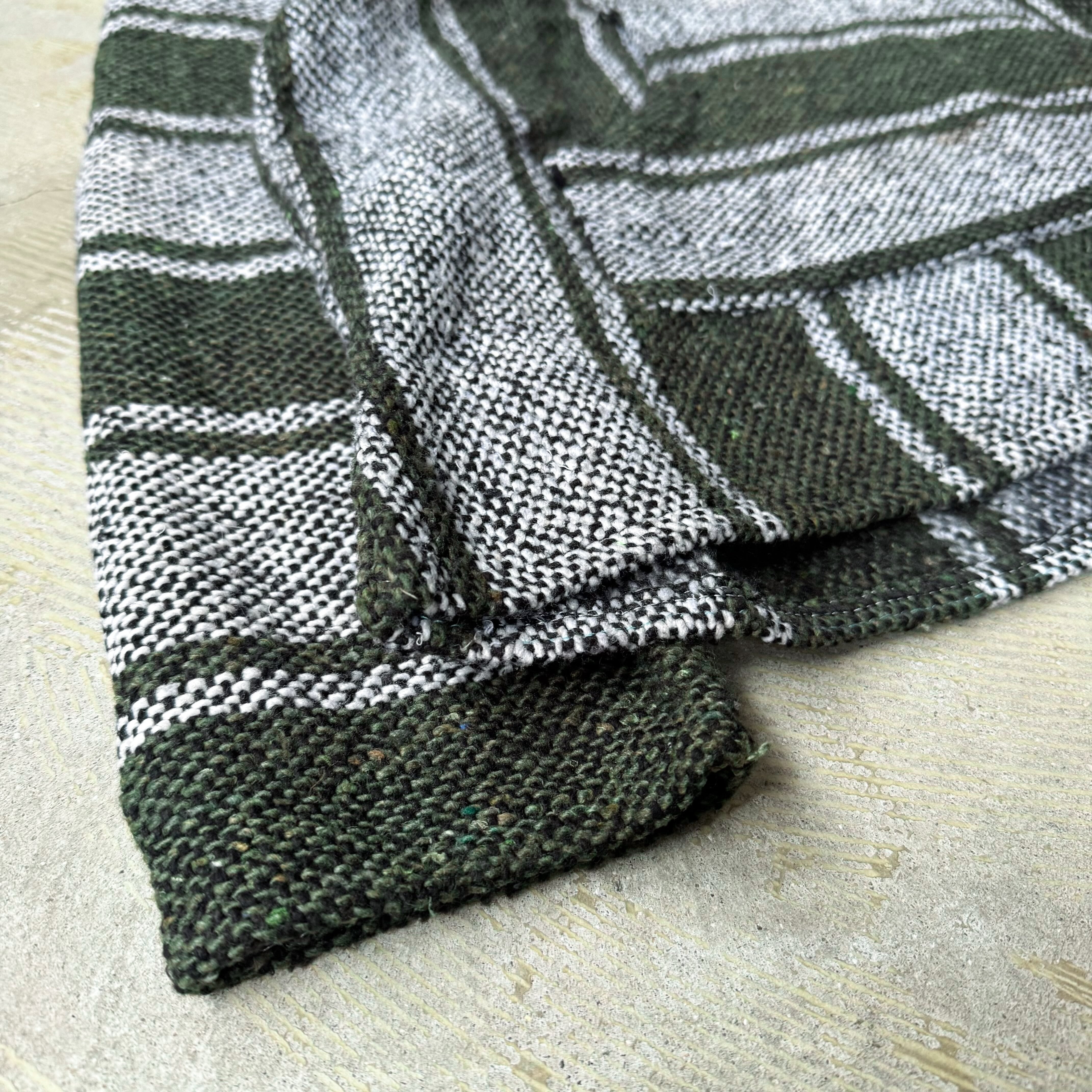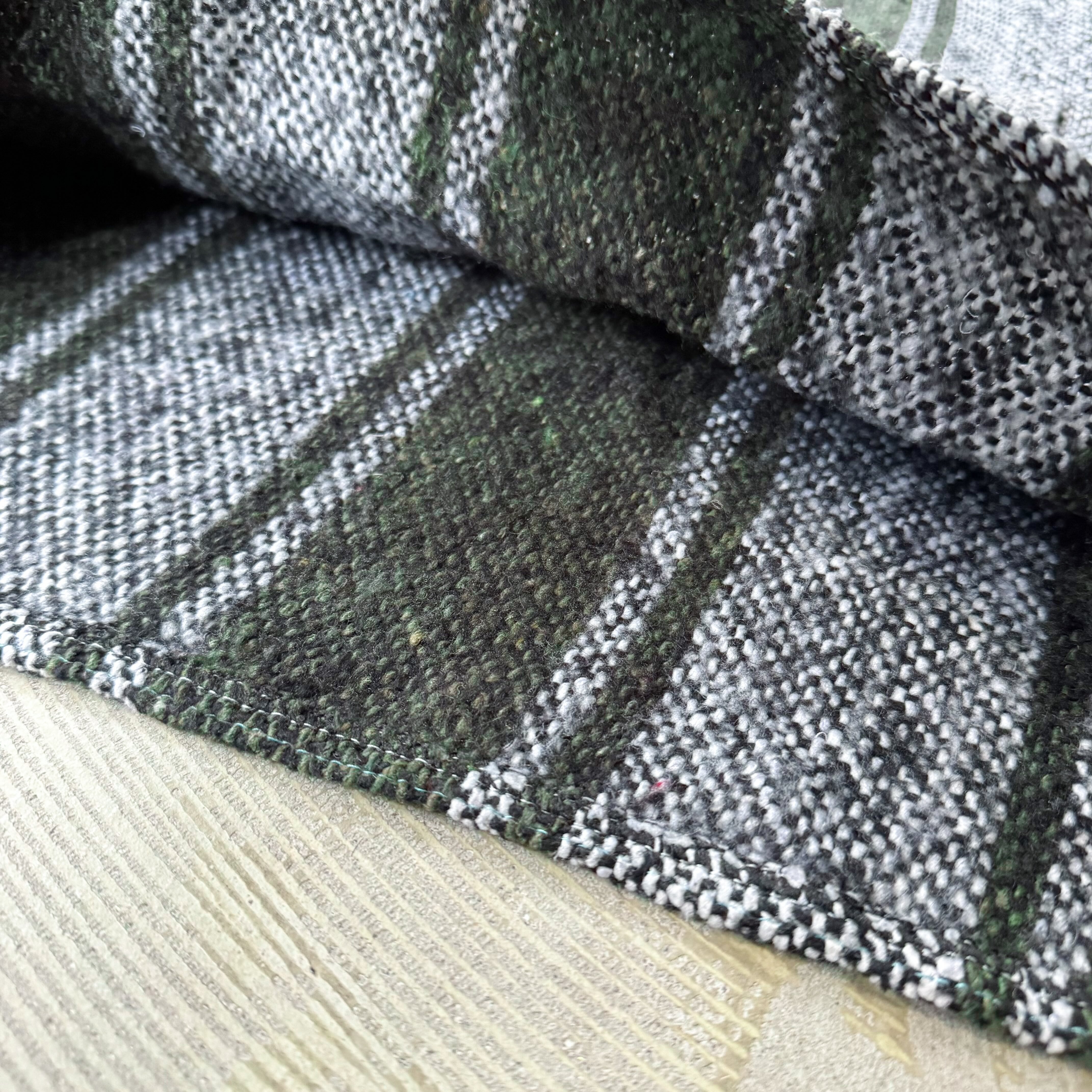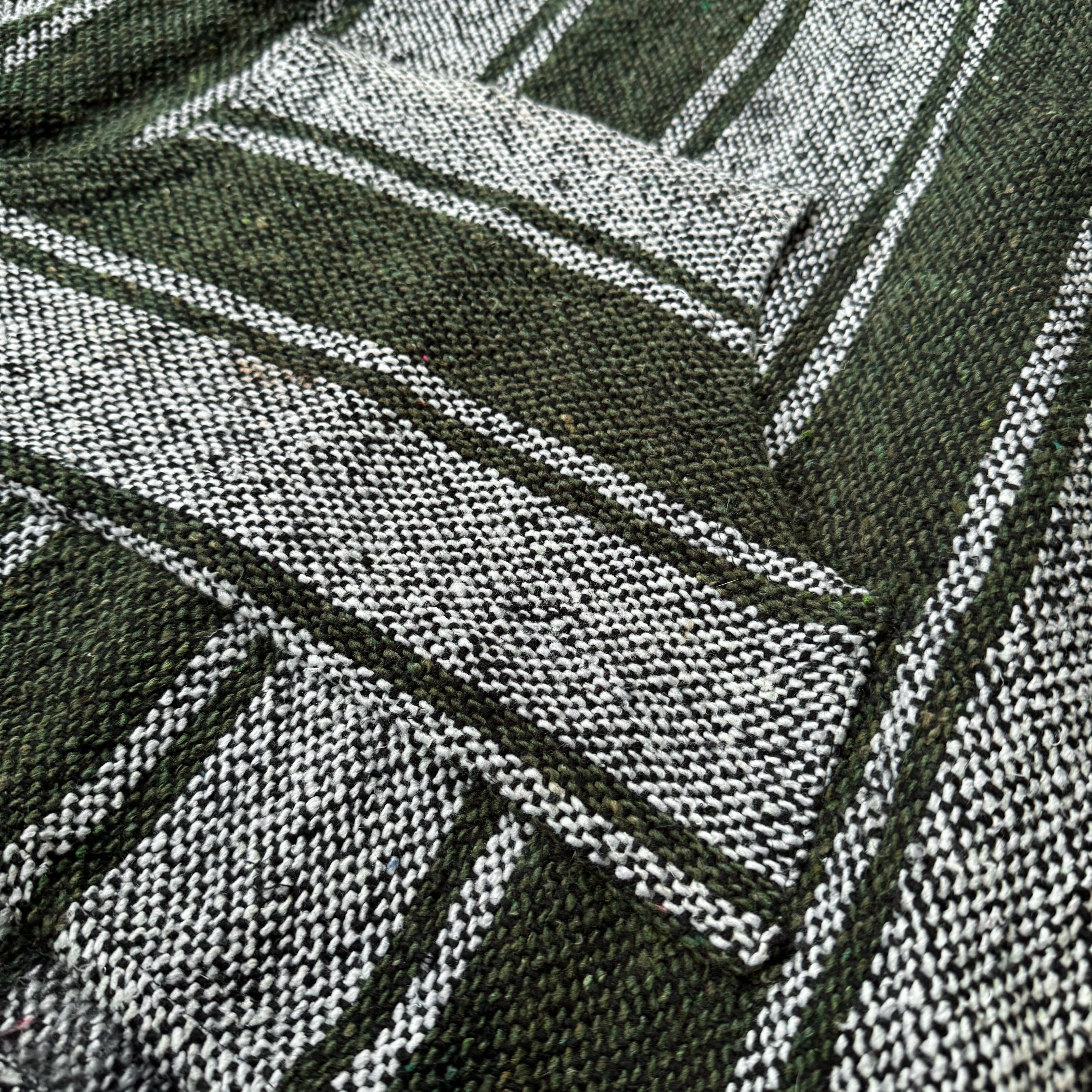 ・黒・白・オリーブのストライプとボーダー柄を織り込んだ