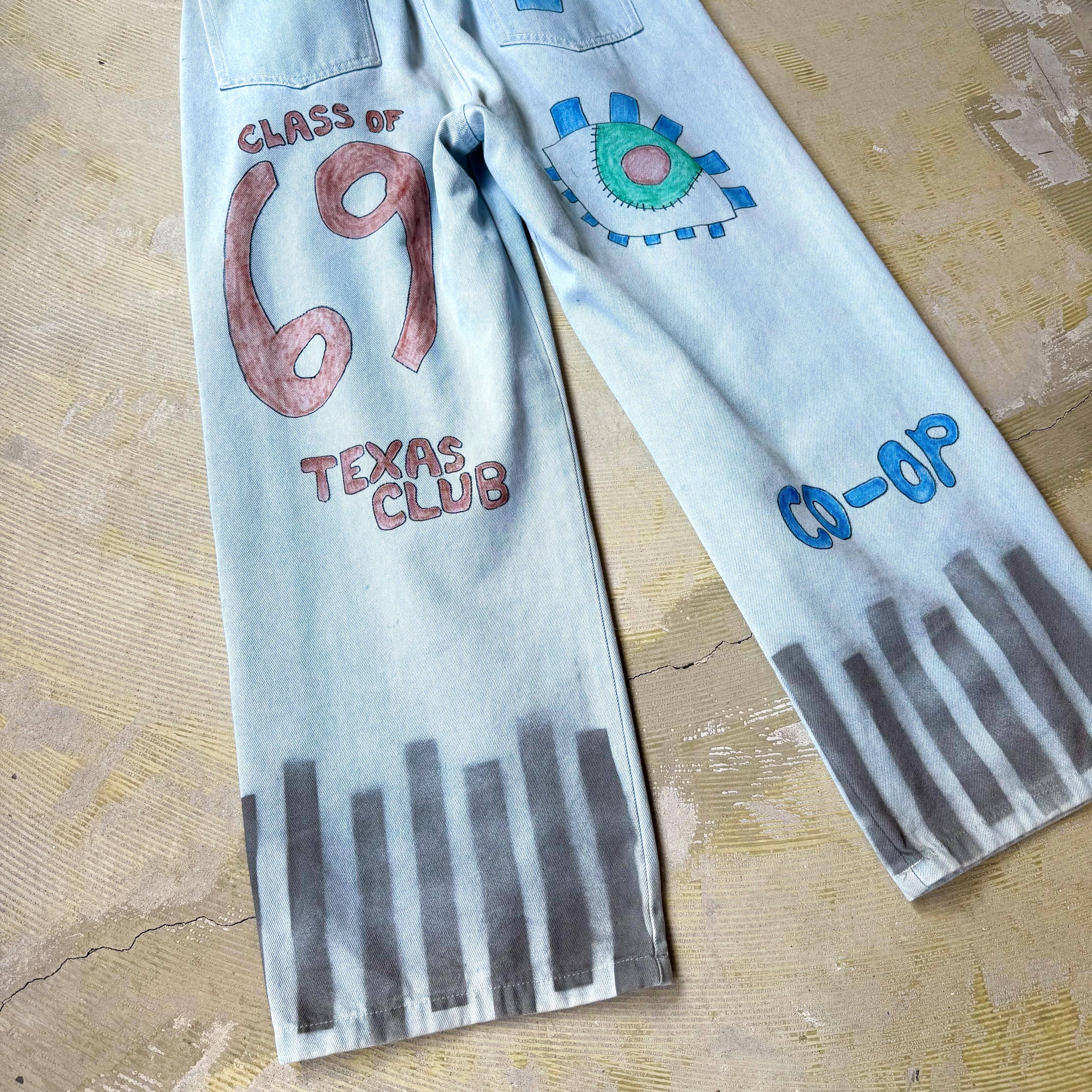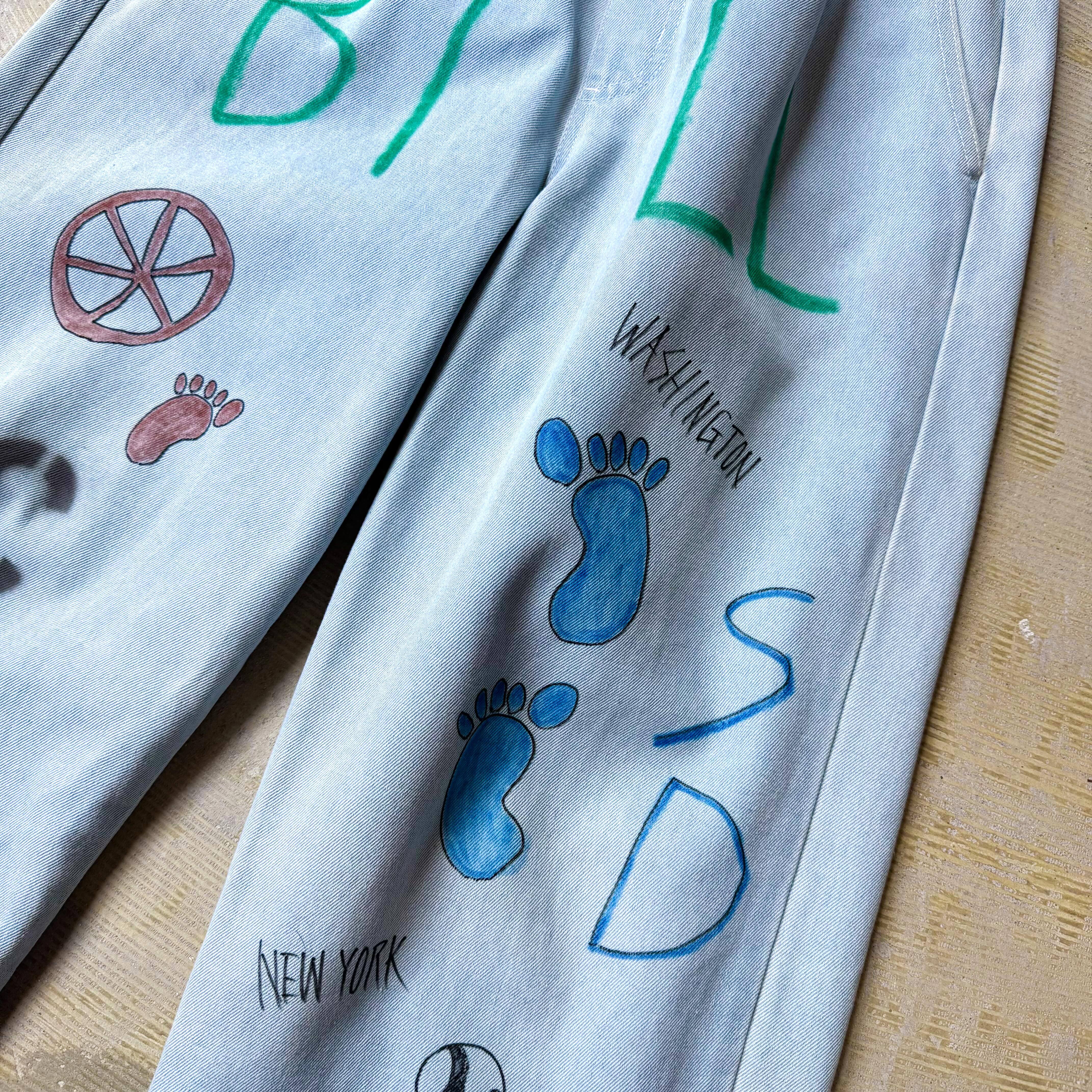 ハンドペイントとステンシルで散りばめた、ワイドシルエットのデニムパンツ。