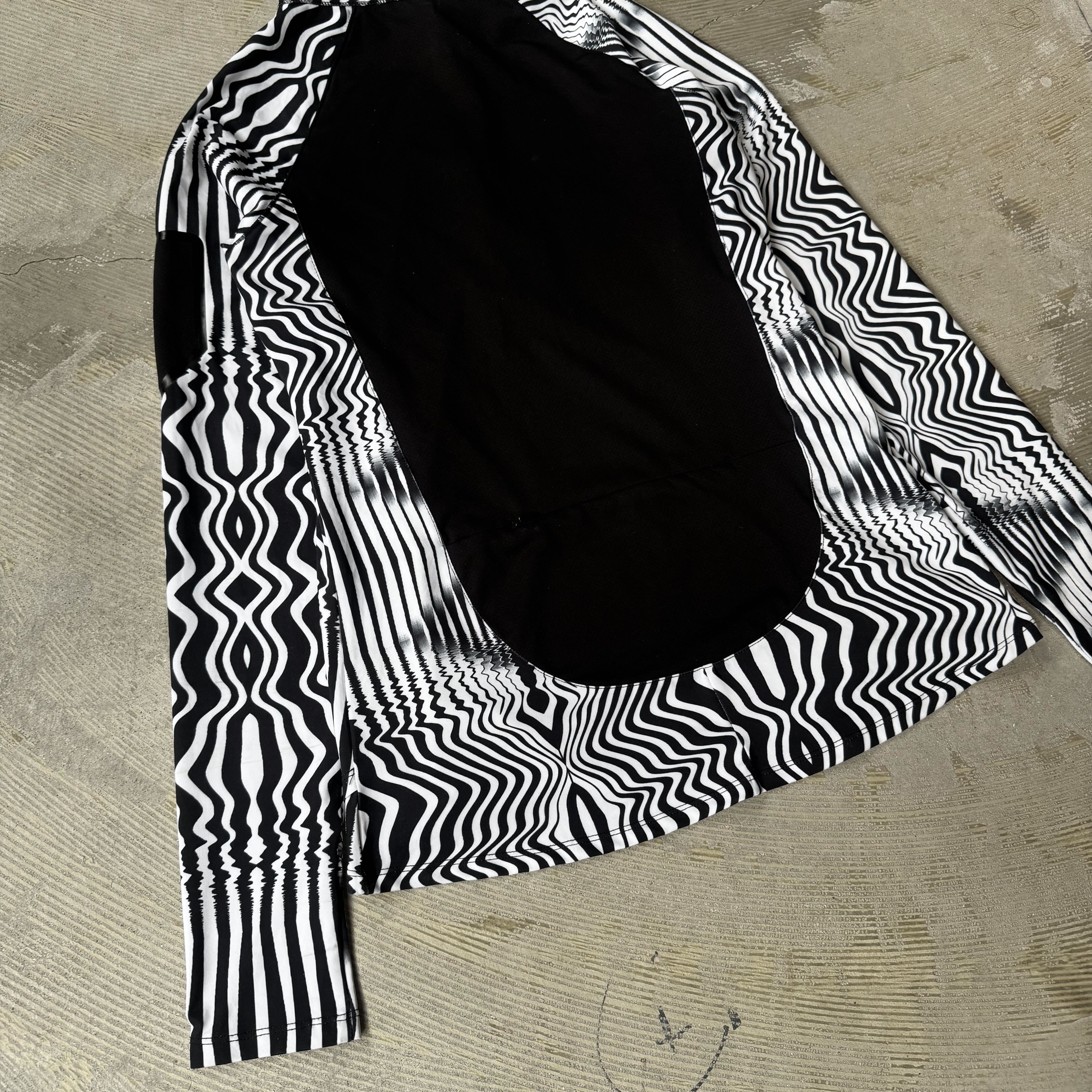 動くたびに模様が歪み、ただ着ているだけで“視覚のスピード”が生まれる一枚です。