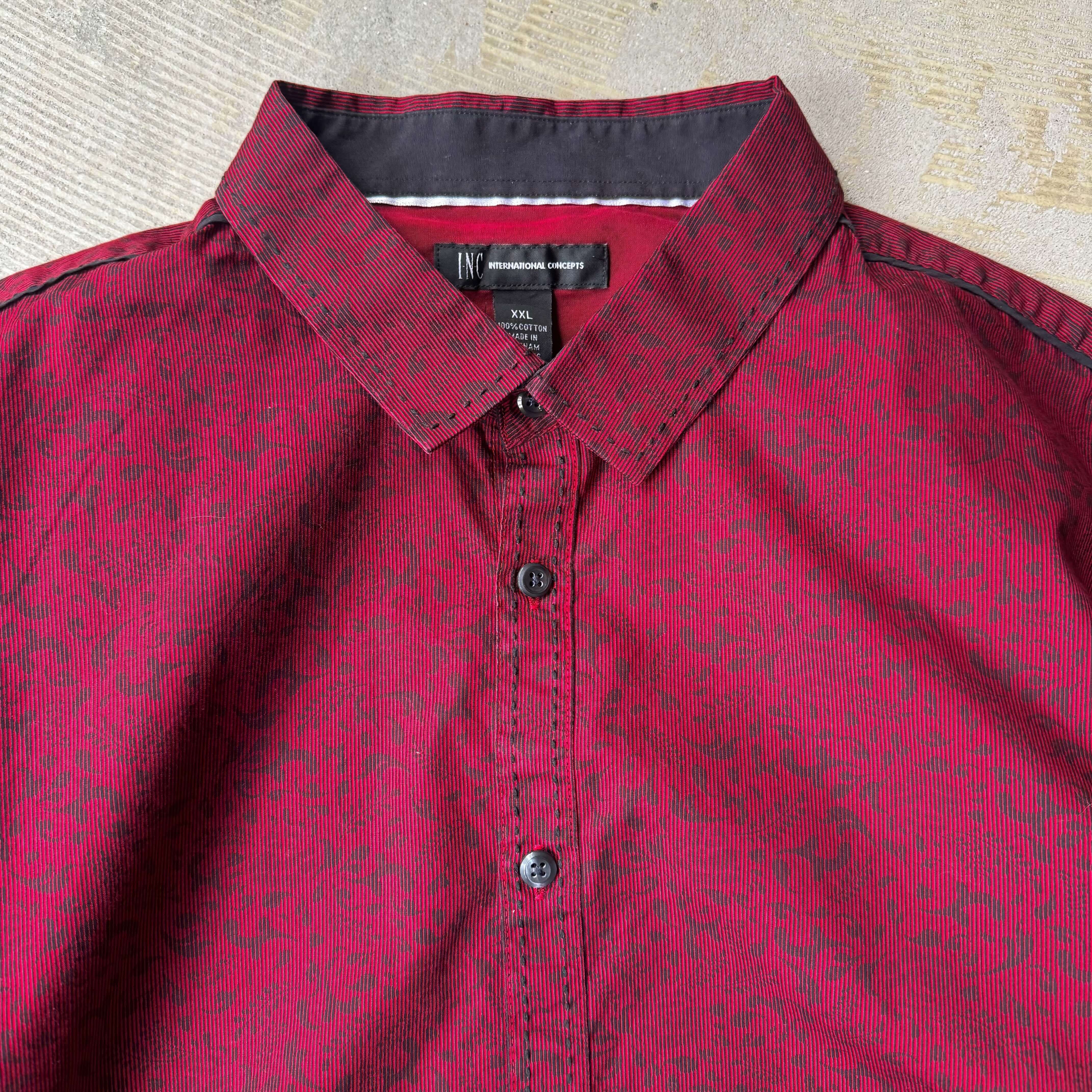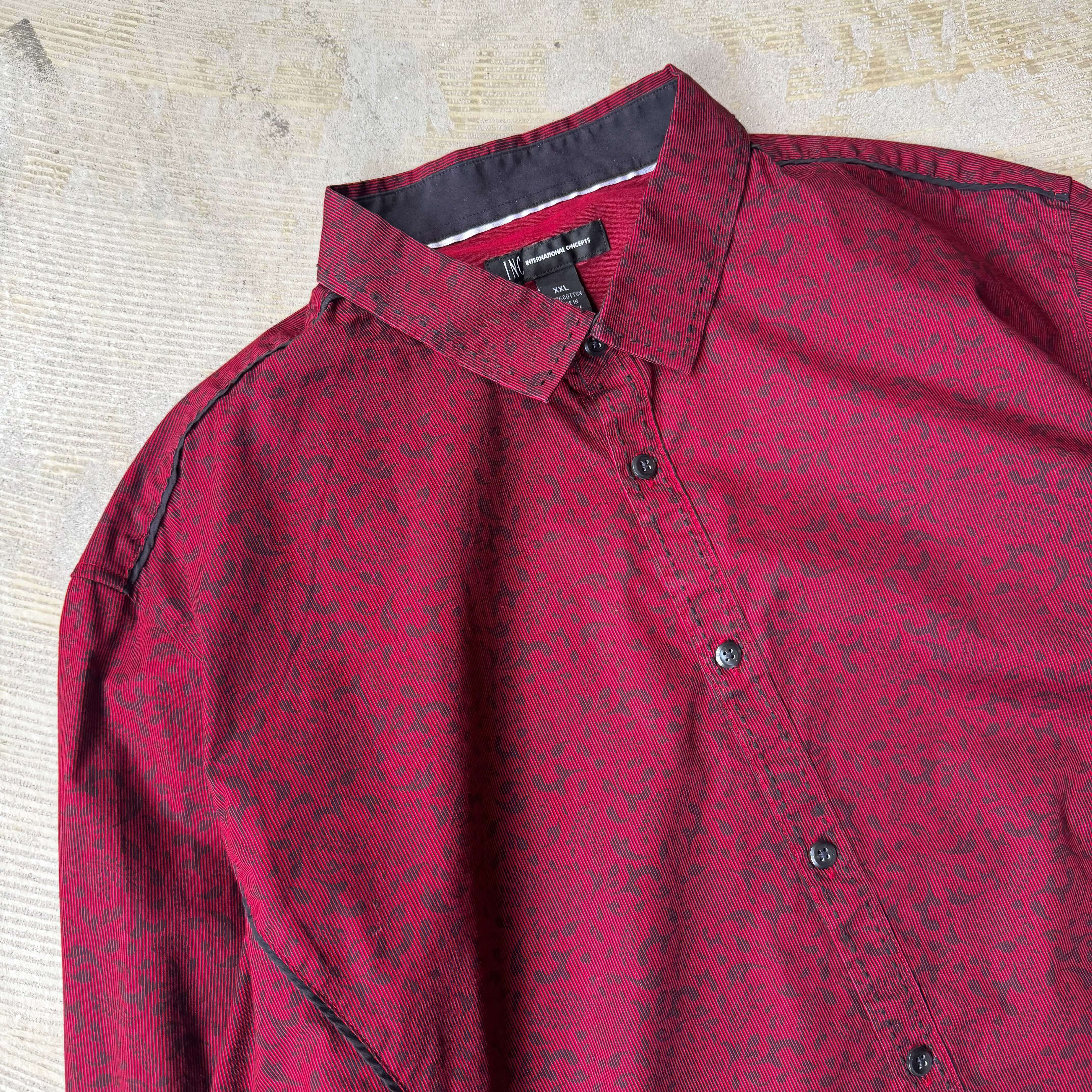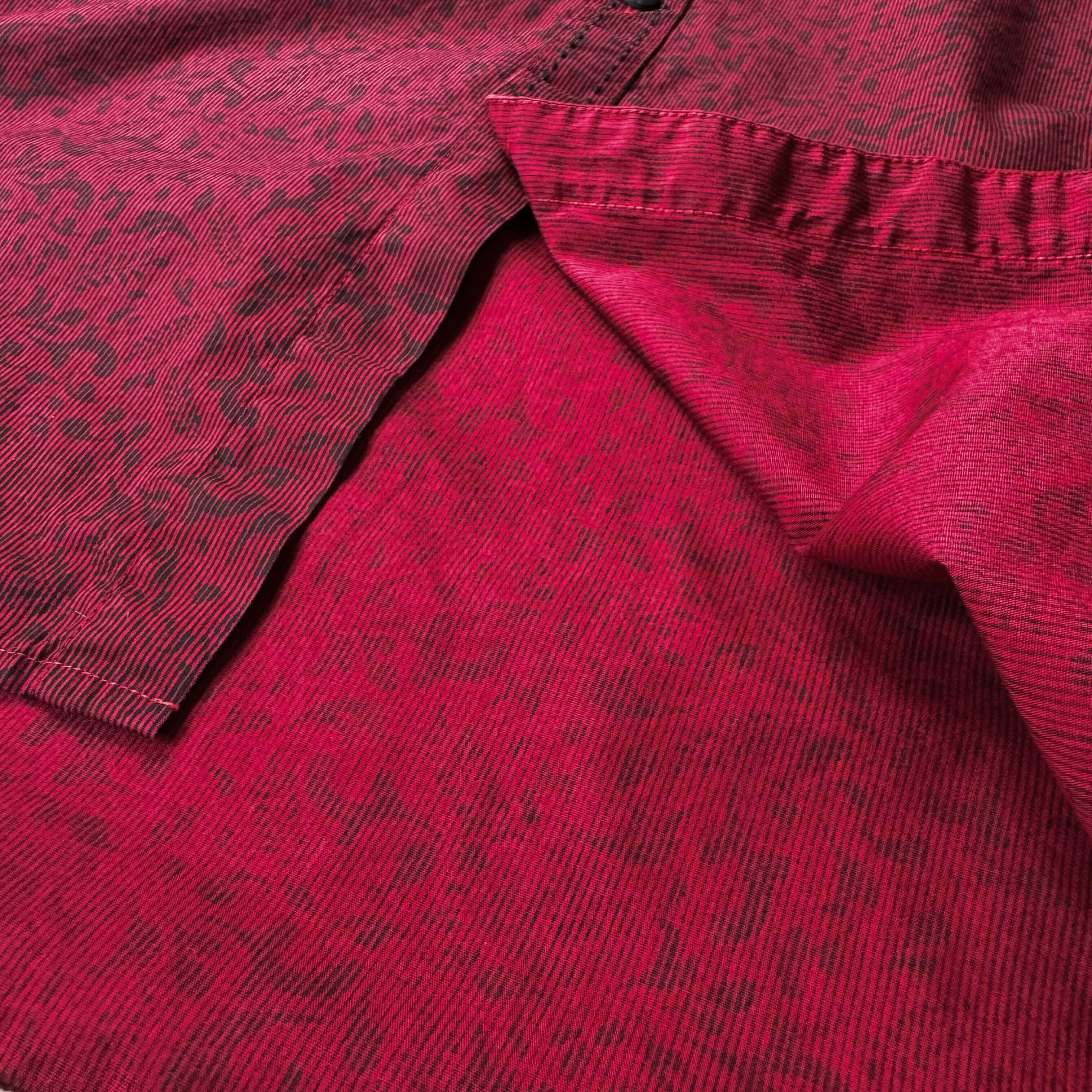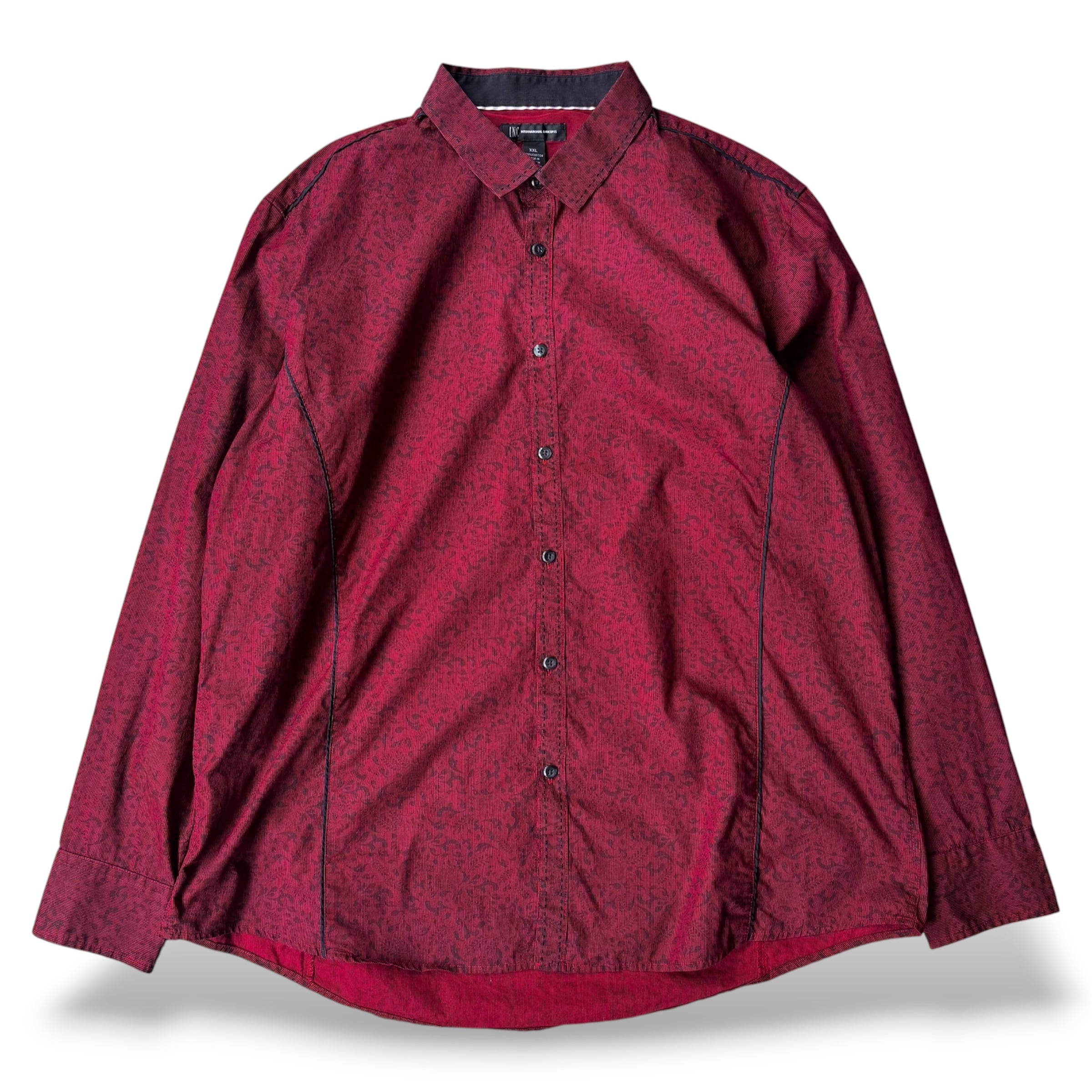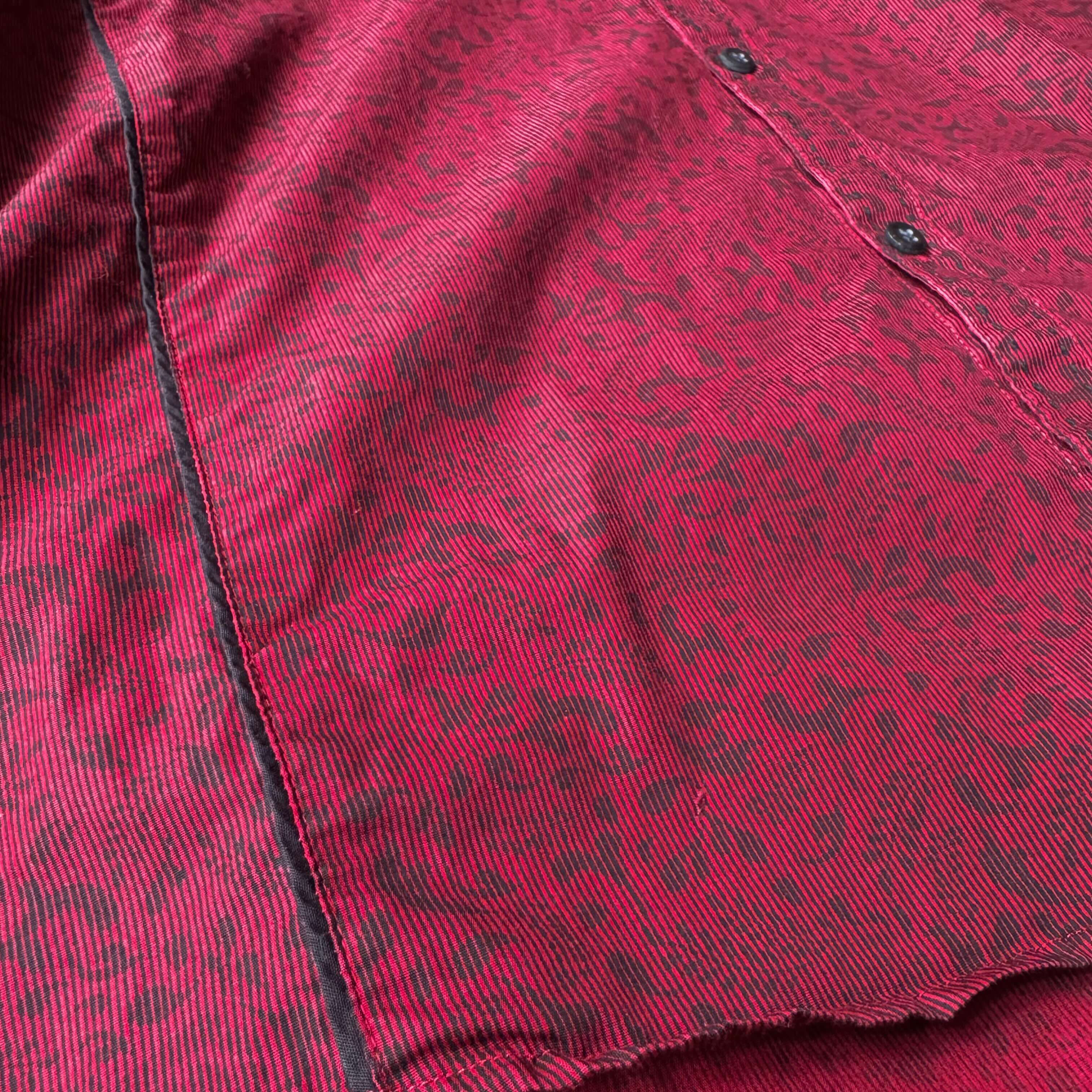 ・深い赤のコットン地に、ボタニカル柄と細いパイピングが静かに走るシャツ。