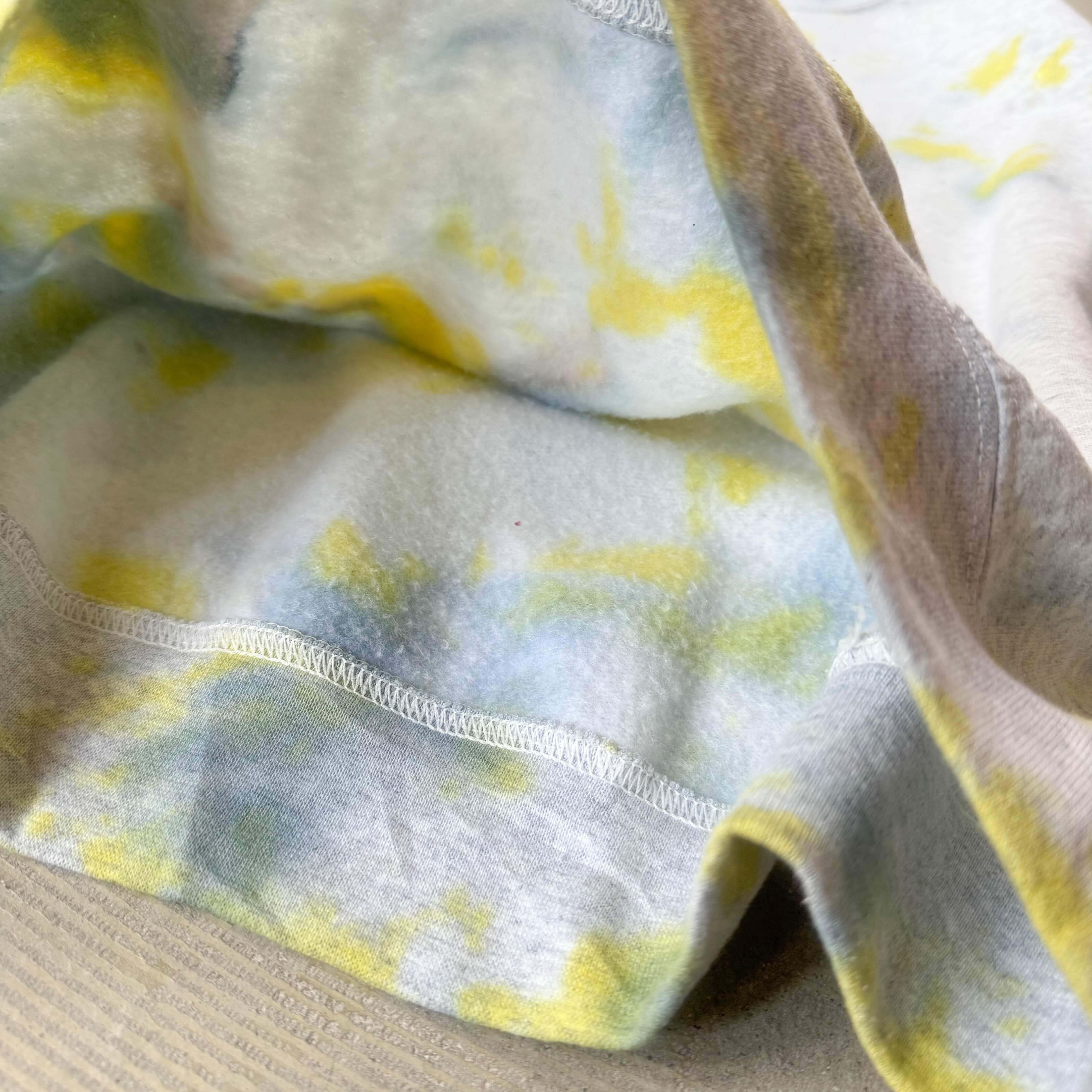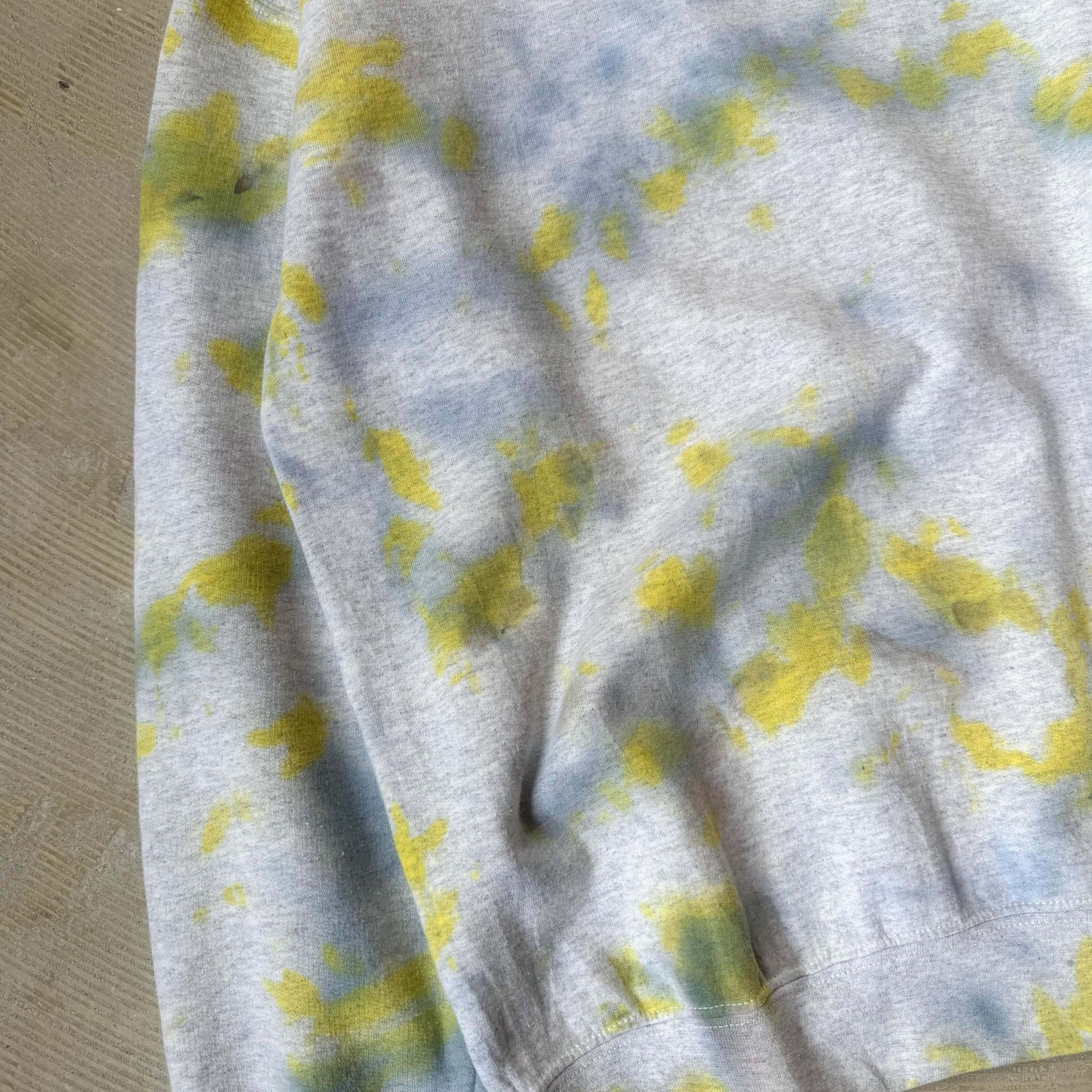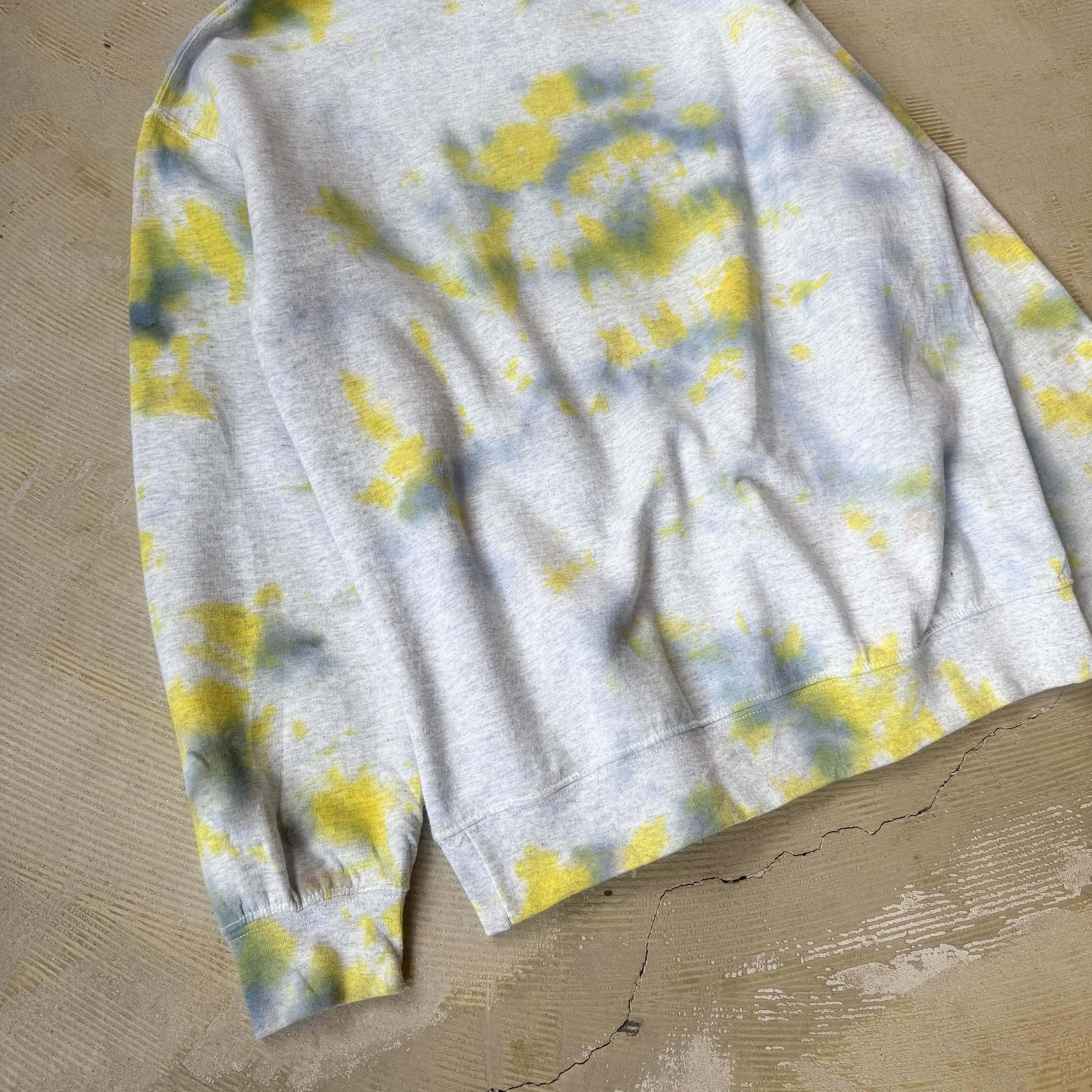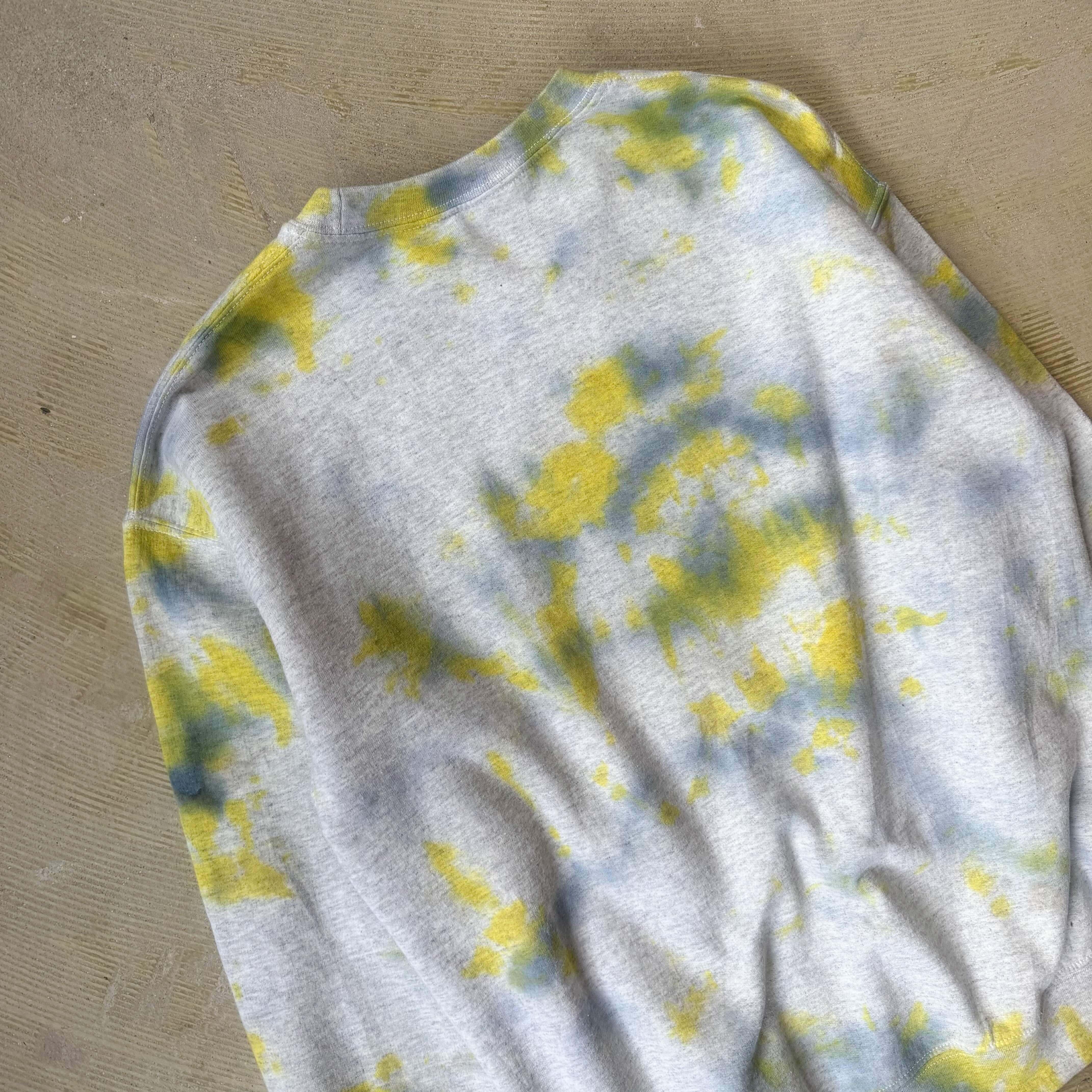 ・グレーのスウェットに、黄色と青のムラ染めがふっと広がる一枚。