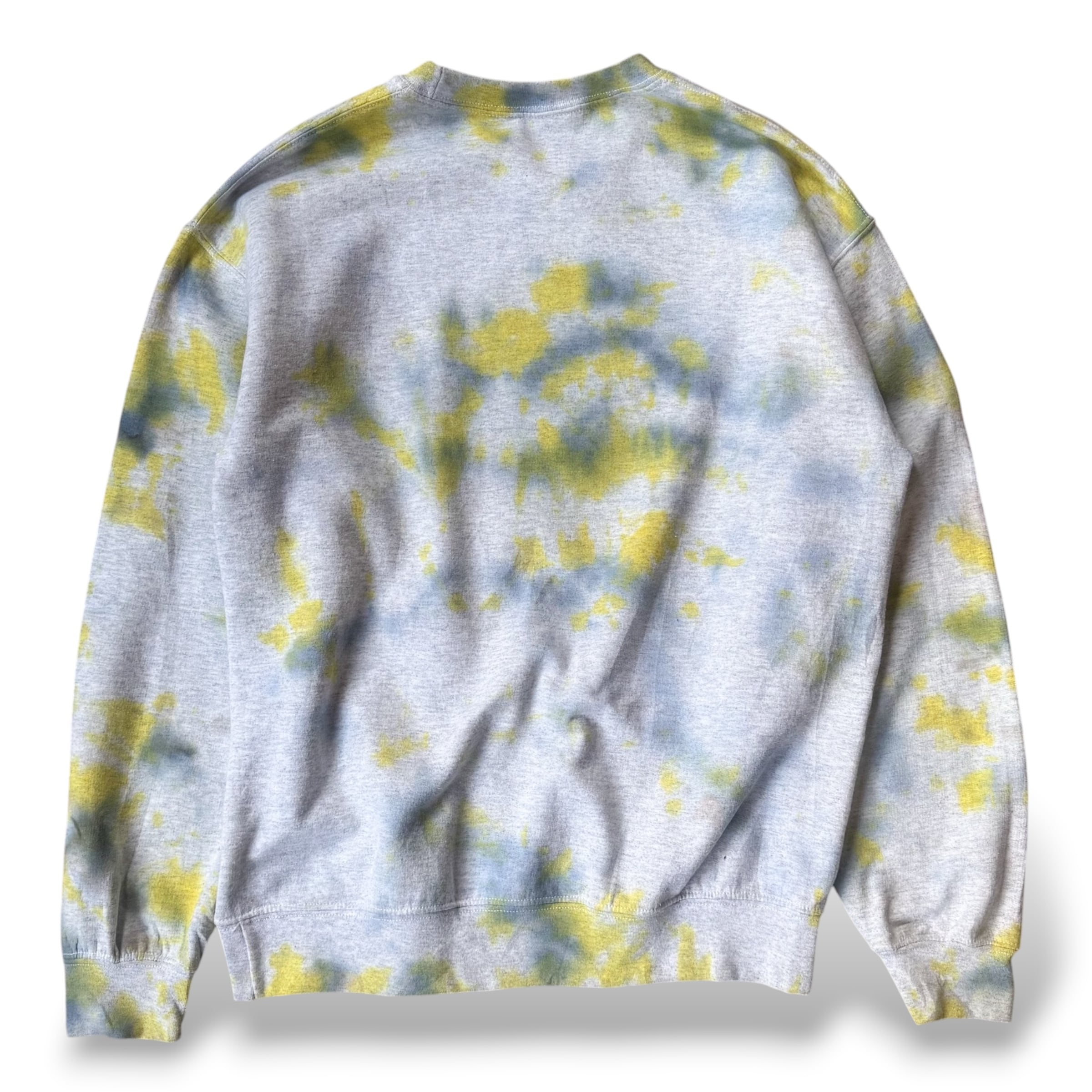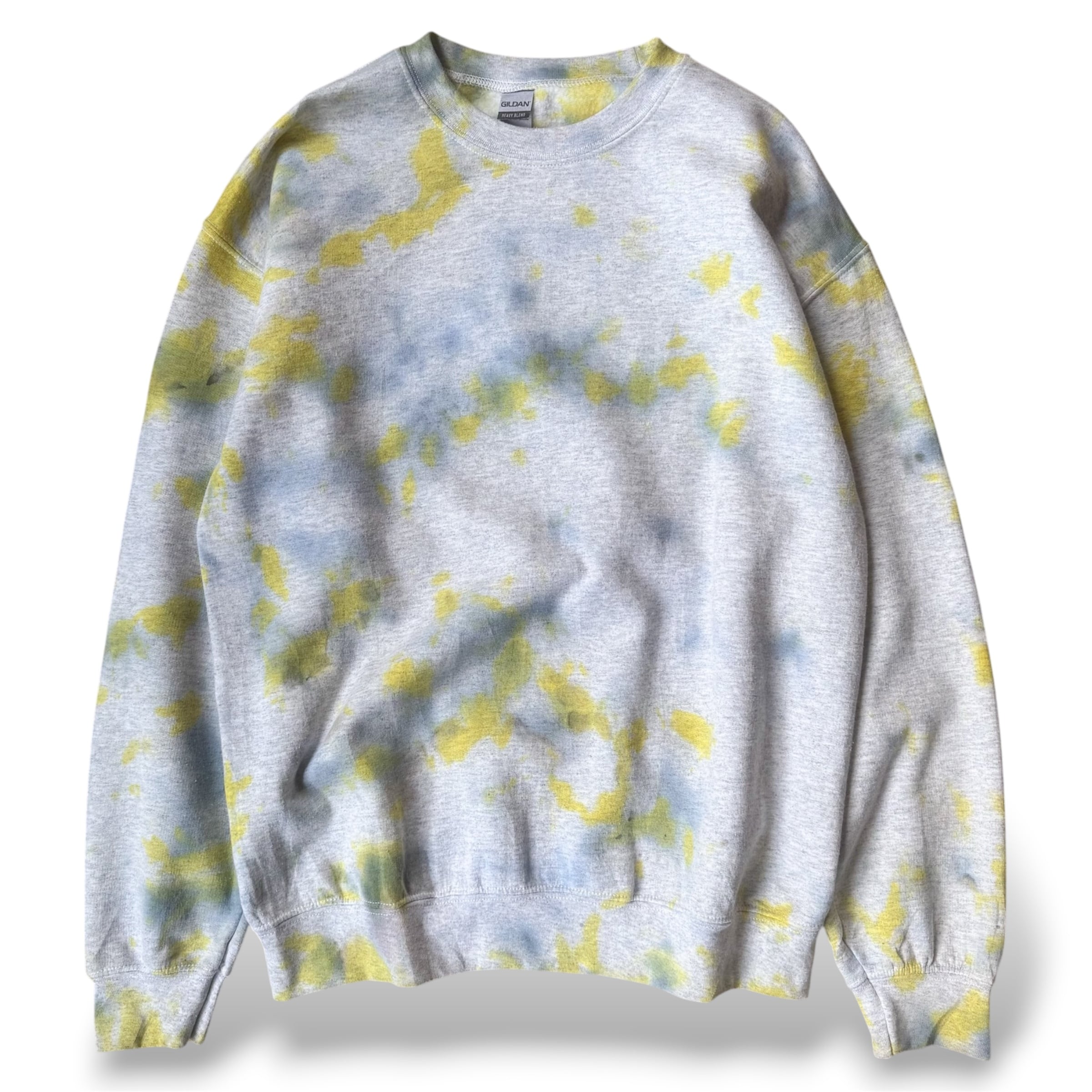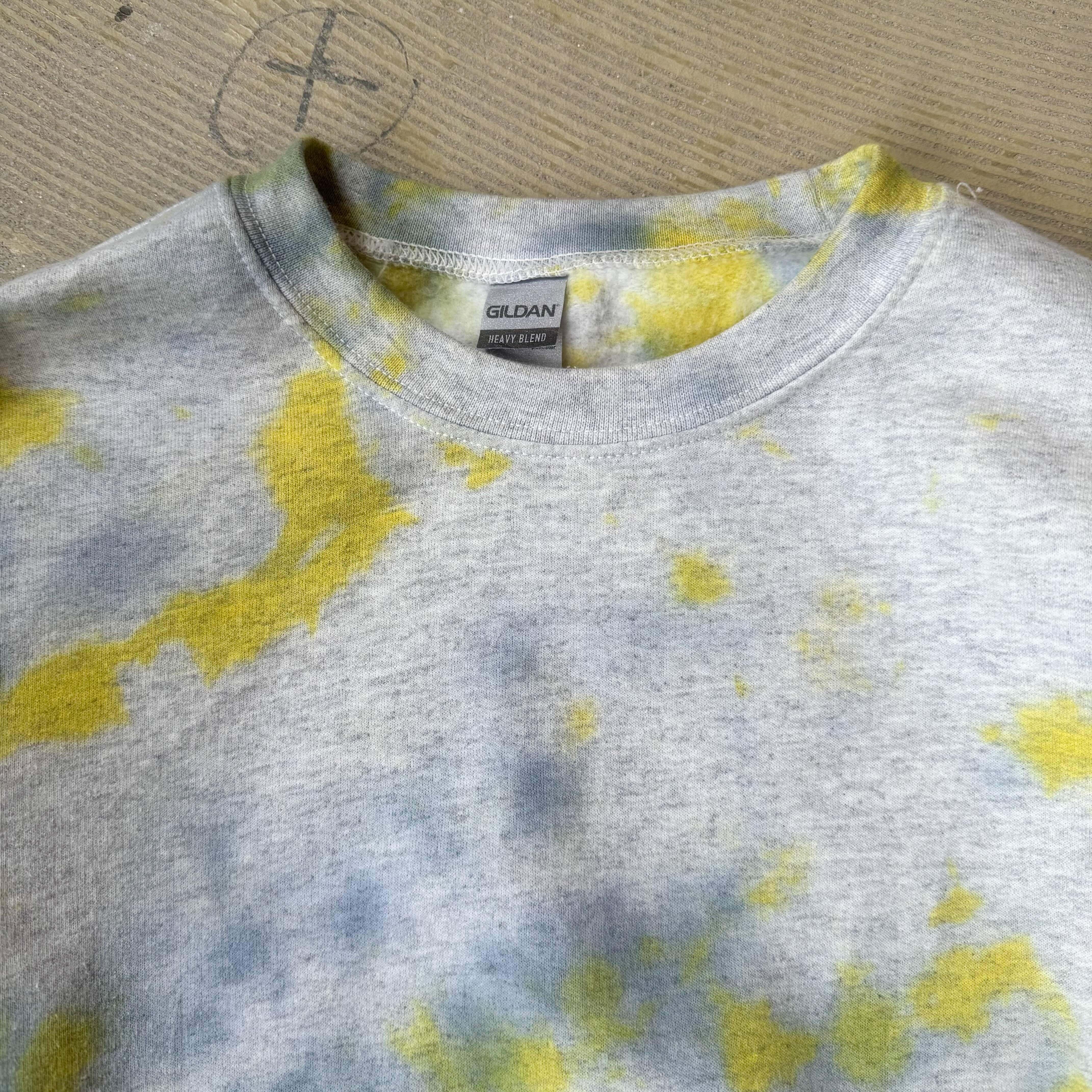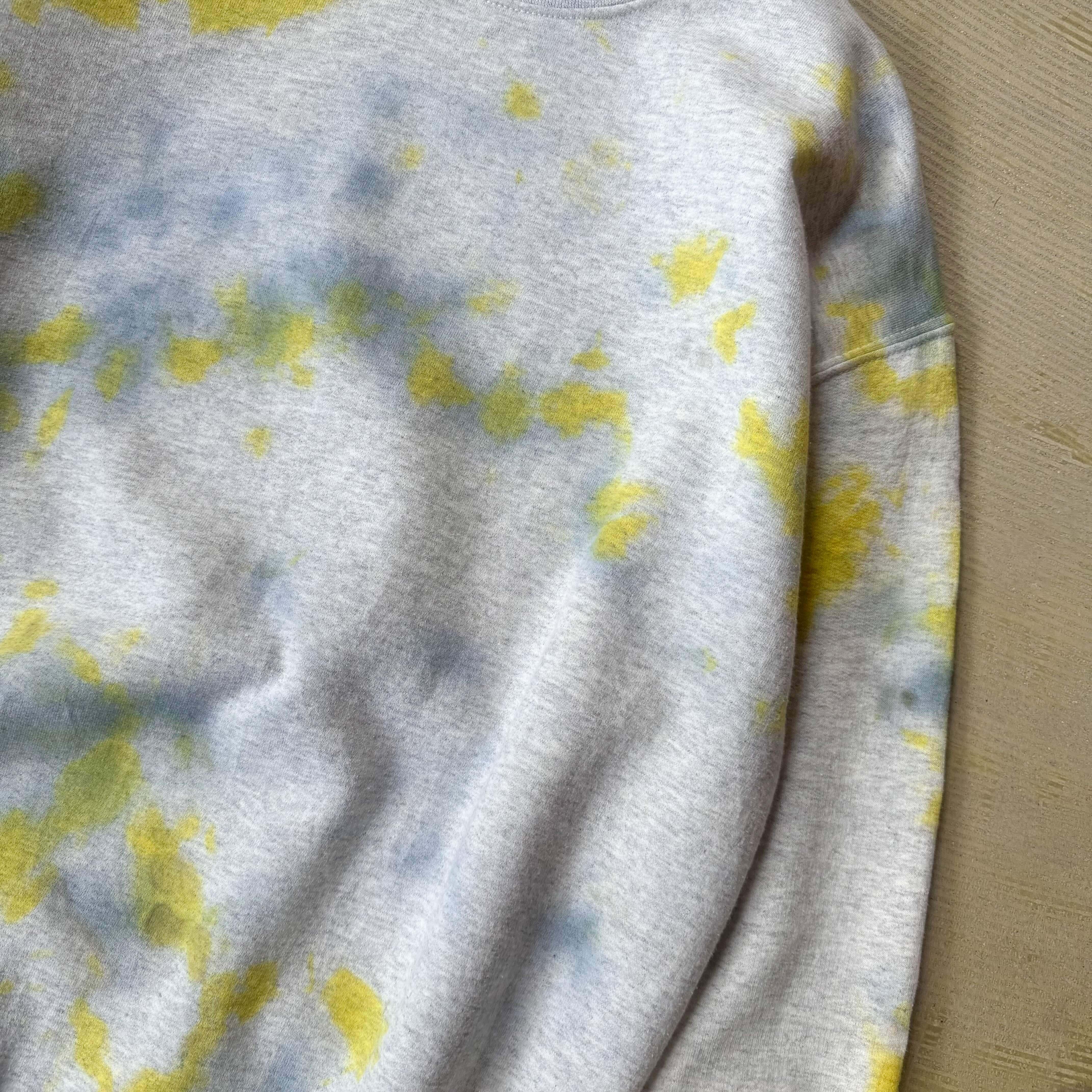 ・グレーのスウェットに、黄色と青のムラ染めがふっと広がる一枚。